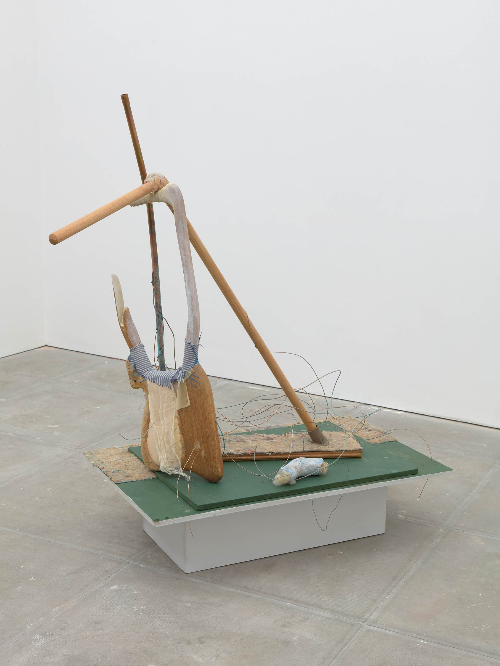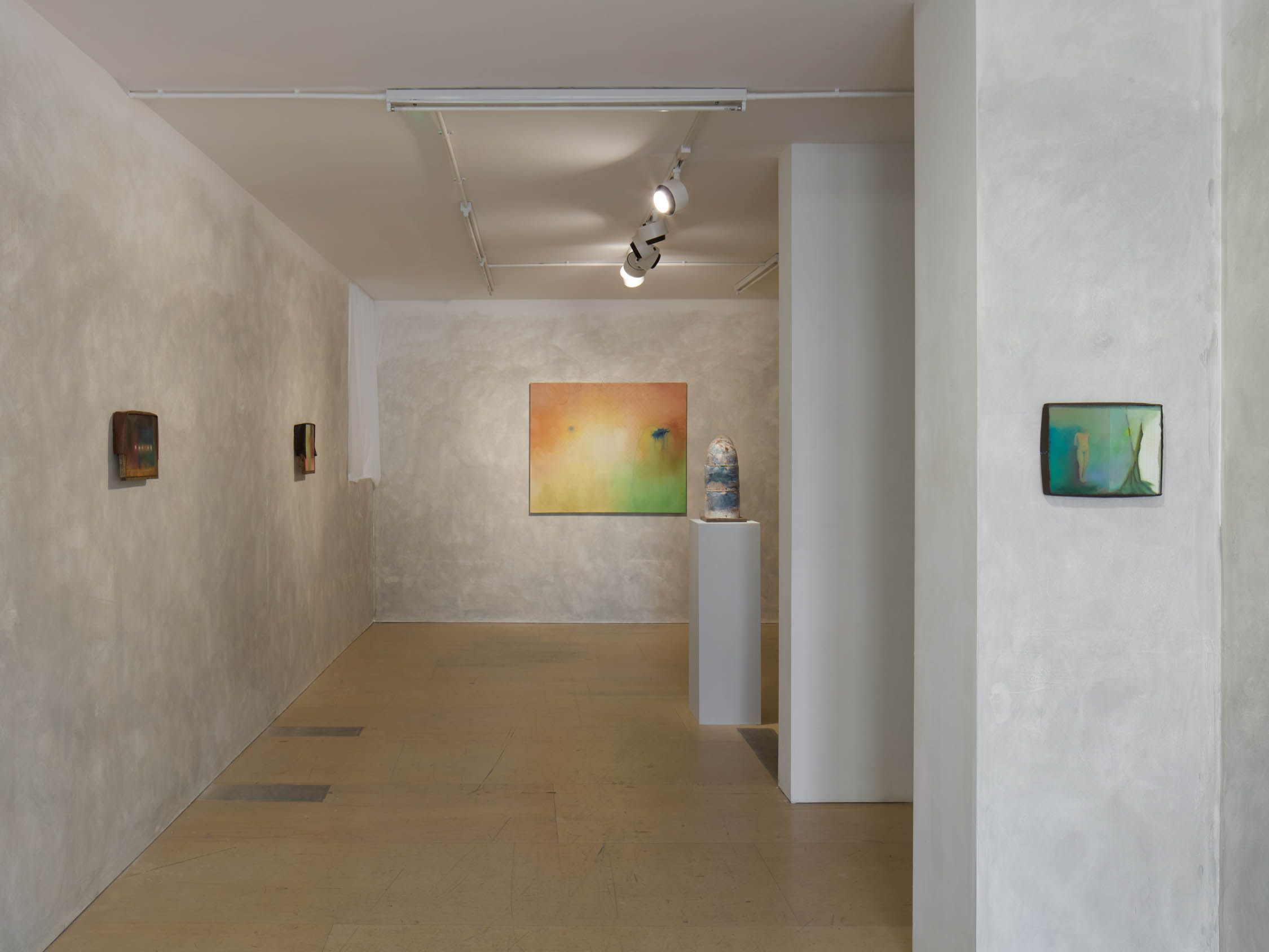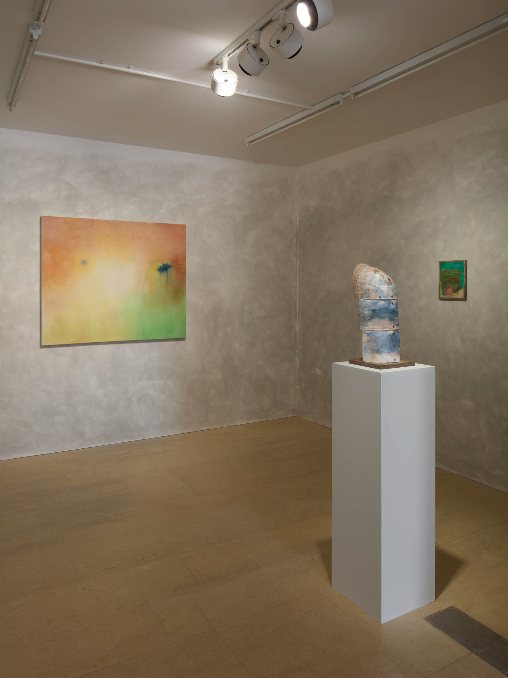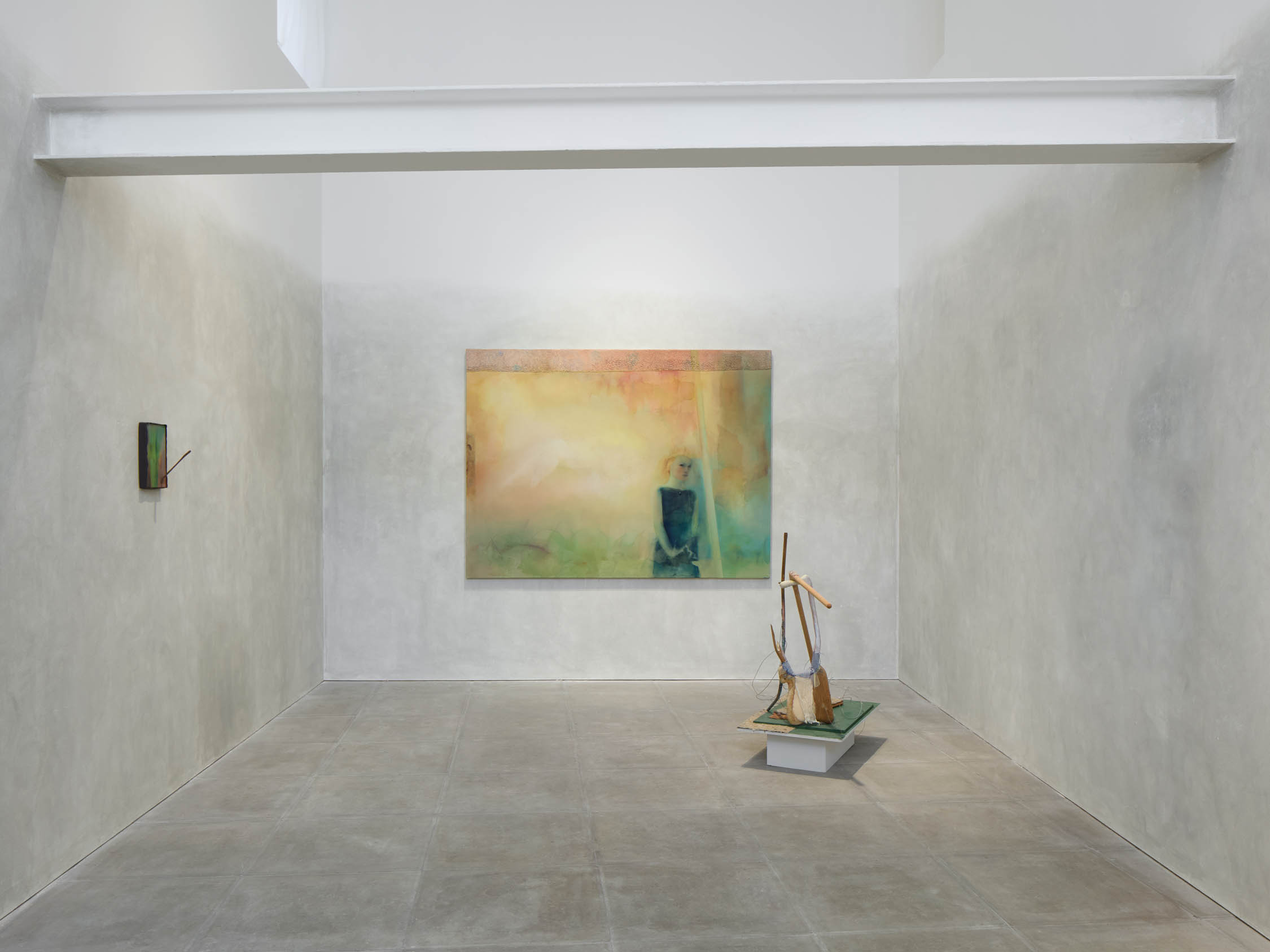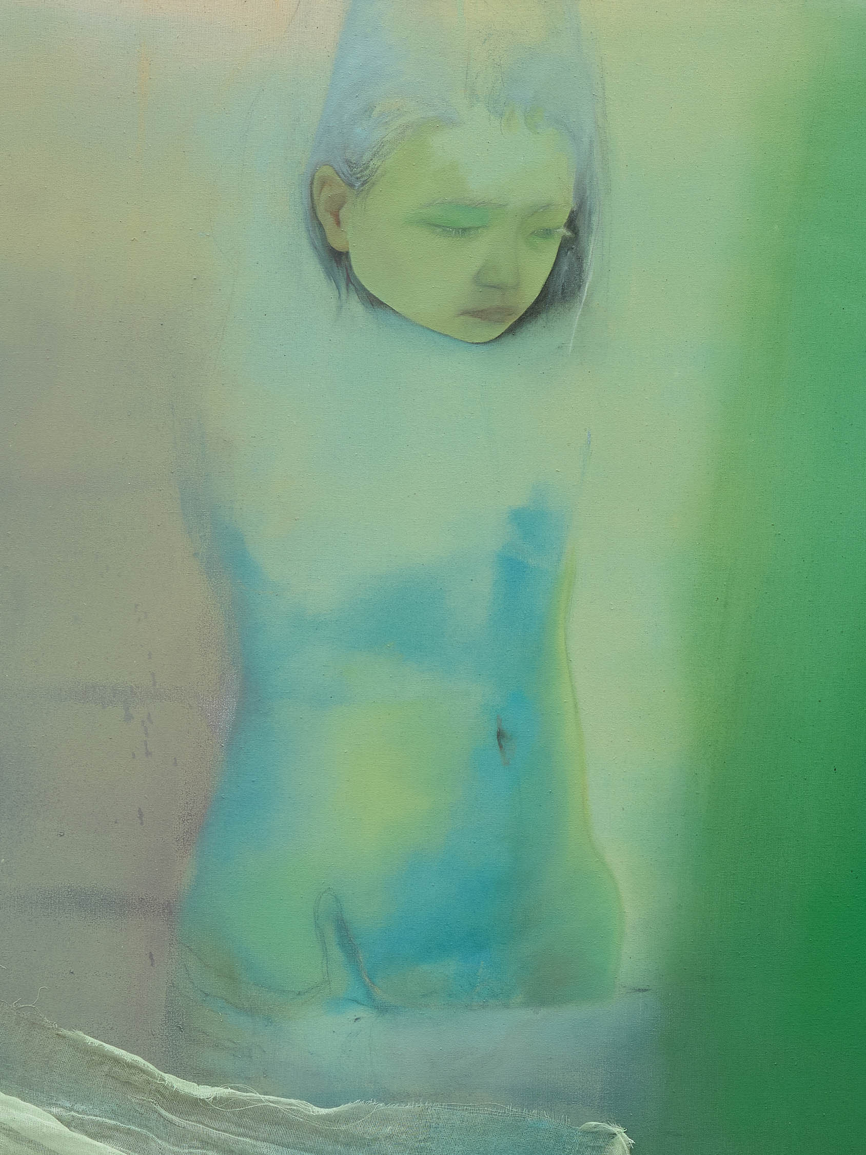The soft sound of the double ‘s’ follows the hard bracket of the ‘c,’ itself contained within the echoing form of the parentheses. Hooked forwards, the curved spine of the punctuation mark is supple and shy. Sibilance flows outward from the central digraph of the word, cosset, which is a title, a location, and a limit. Cool and wet, the paintings leak, and meaning passes from image to object to text—the symbol in migration. Fabric applied to the top of a frame mops up the excesses of feeling, like a soggy sock on the bathroom floor.