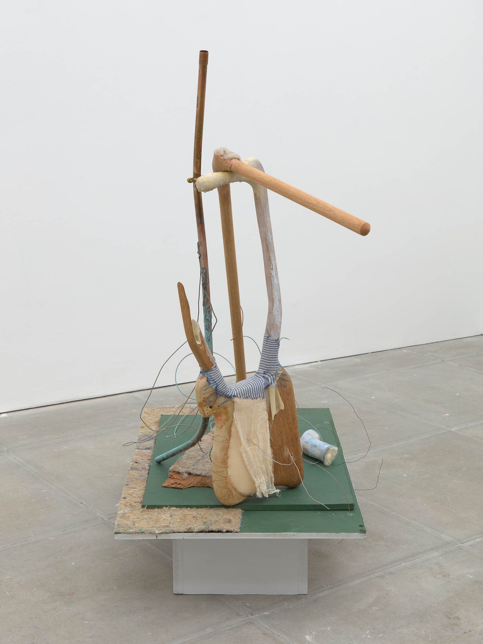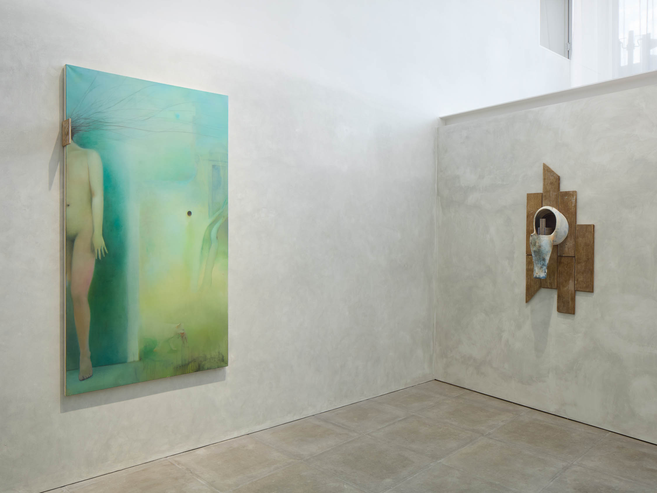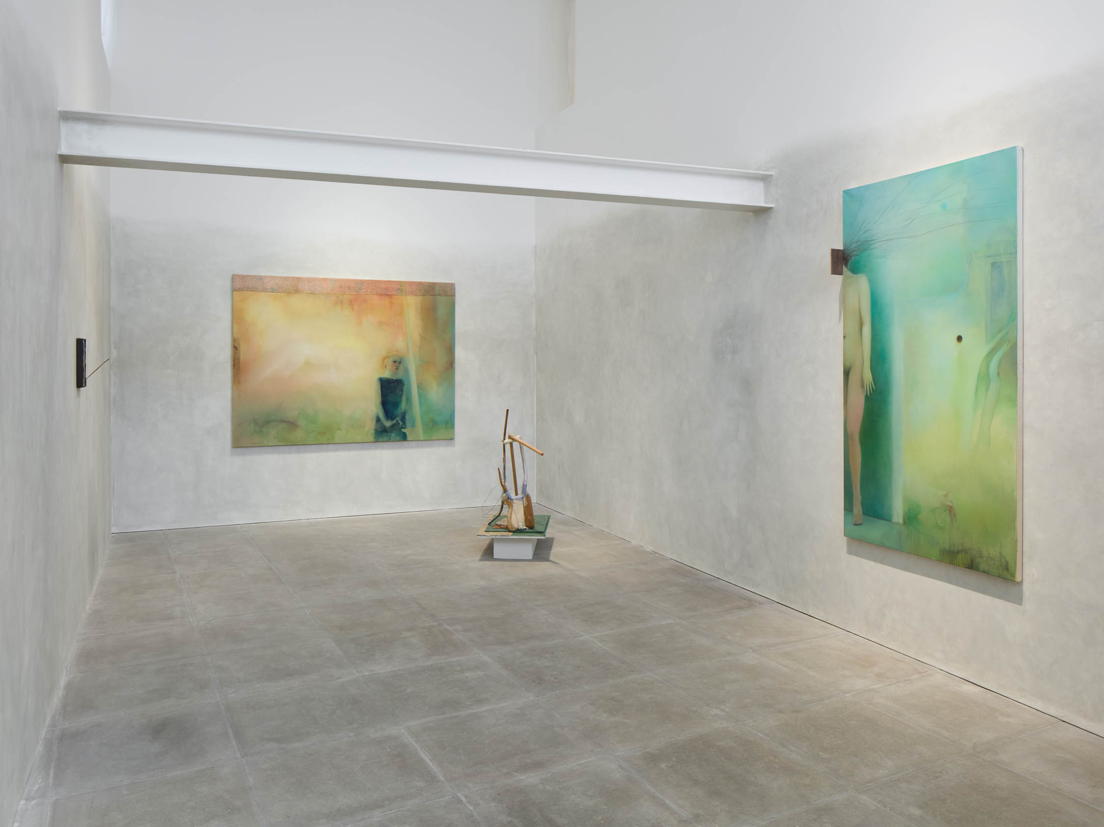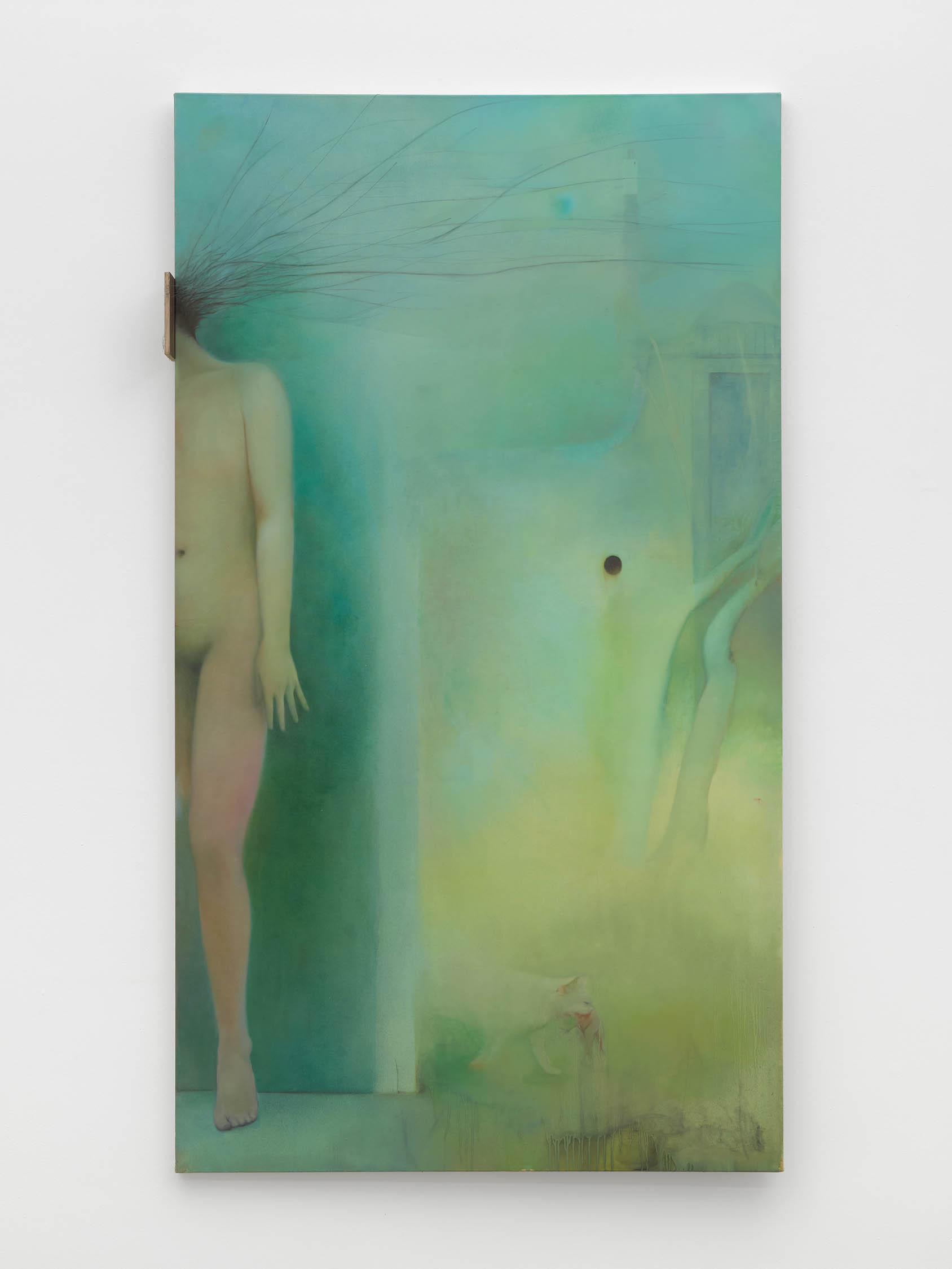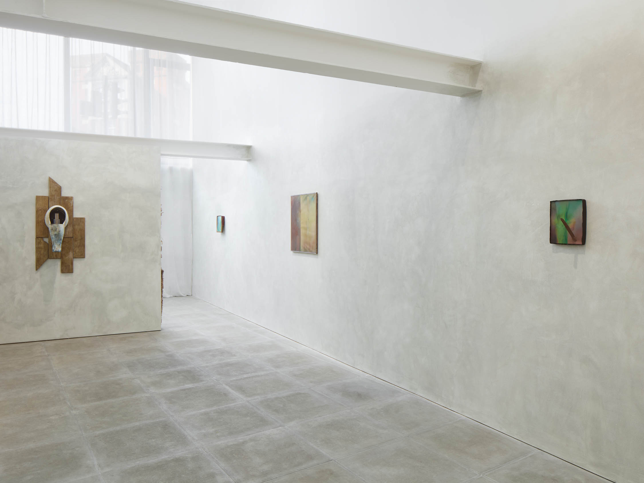 The soft sound of the double ‘s’ follows the hard bracket of the ‘c,’ itself contained within the echoing form of the parentheses. Hooked forwards, the curved spine of the punctuation mark is supple and shy. Sibilance flows outward from the central digraph of the word, cosset, which is a title, a location, and a limit. Cool and wet, the paintings leak, and meaning passes from image to object to text—the symbol in migration. Fabric applied to the top of a frame mops up the excesses of feeling, like a soggy sock on the bathroom floor.