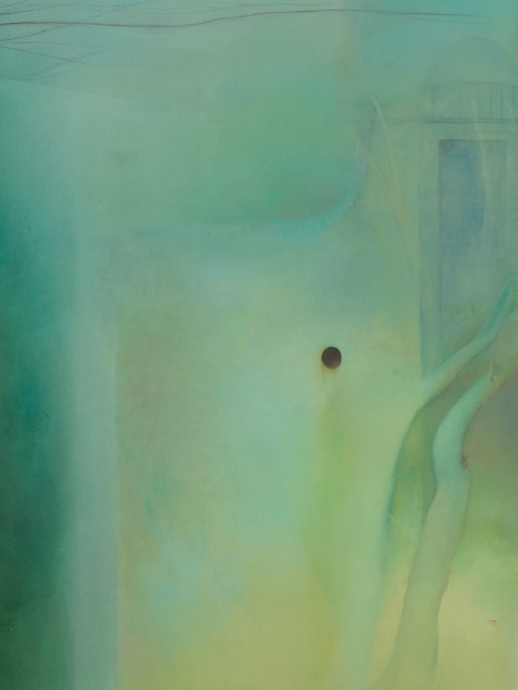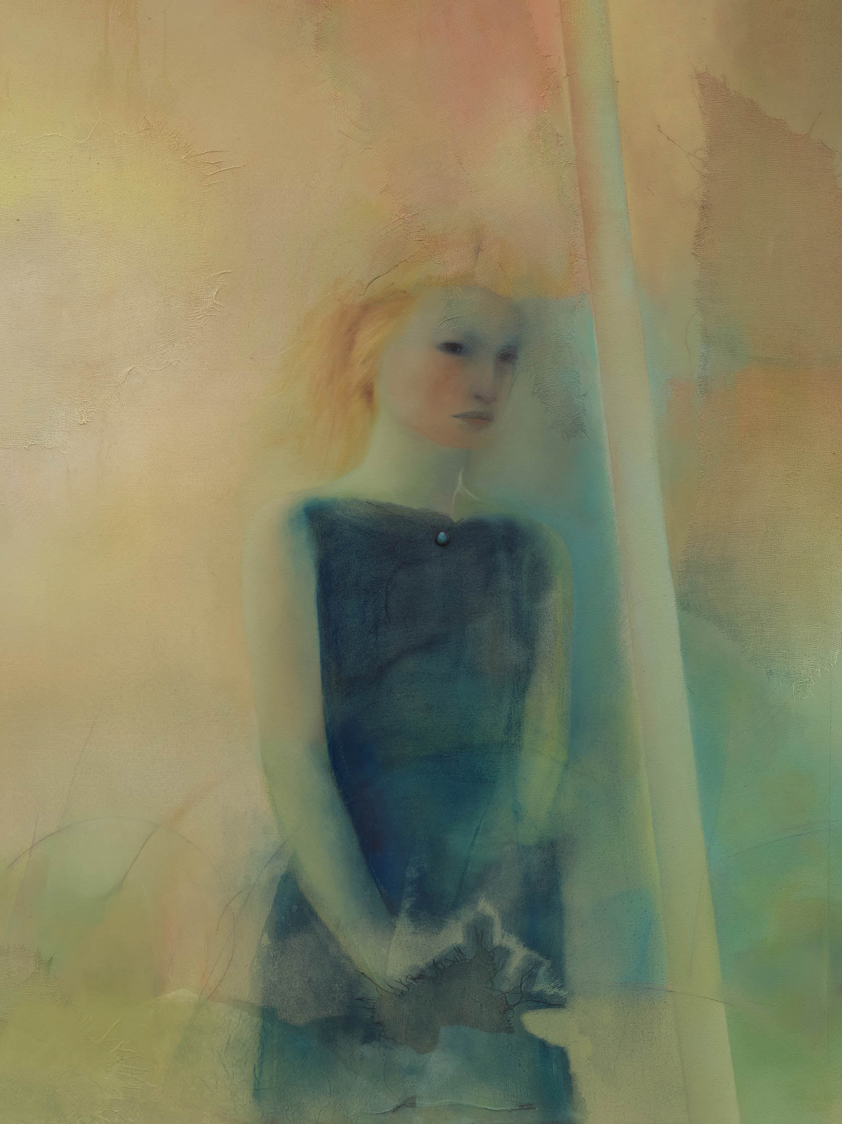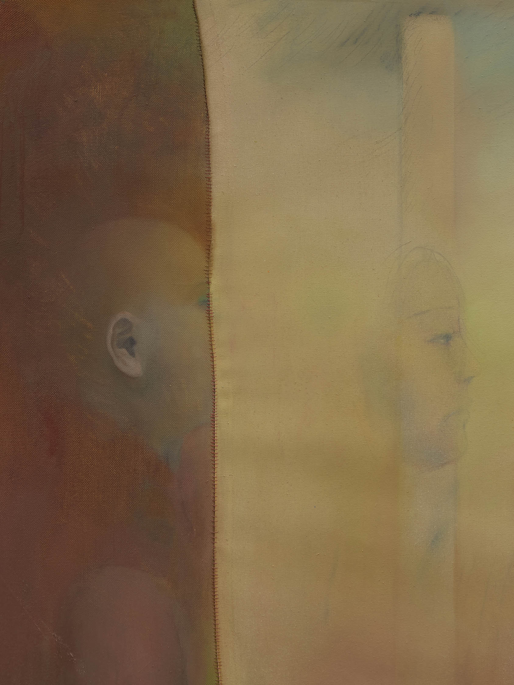 As the artist works, the eye of the painted girl looks straight at her. The painter has to turn away. Even metaphorical vision is too penetrating. The subject looks back through the point of entry, and voiceless, she seems to say: ‘Hide in me like I tried to hide in you, eye to eye—so no one else will see.’ Eye and then you, followed by the ‘o’ and the ‘e’—round and runny, like Bataille’s egg and saucer. Two cursive ‘a’s stitched at the seams of a canvas. Hollow vowels that hold conjoining voids. Communication is muffled, and I and ‘u’ become an impossibility.