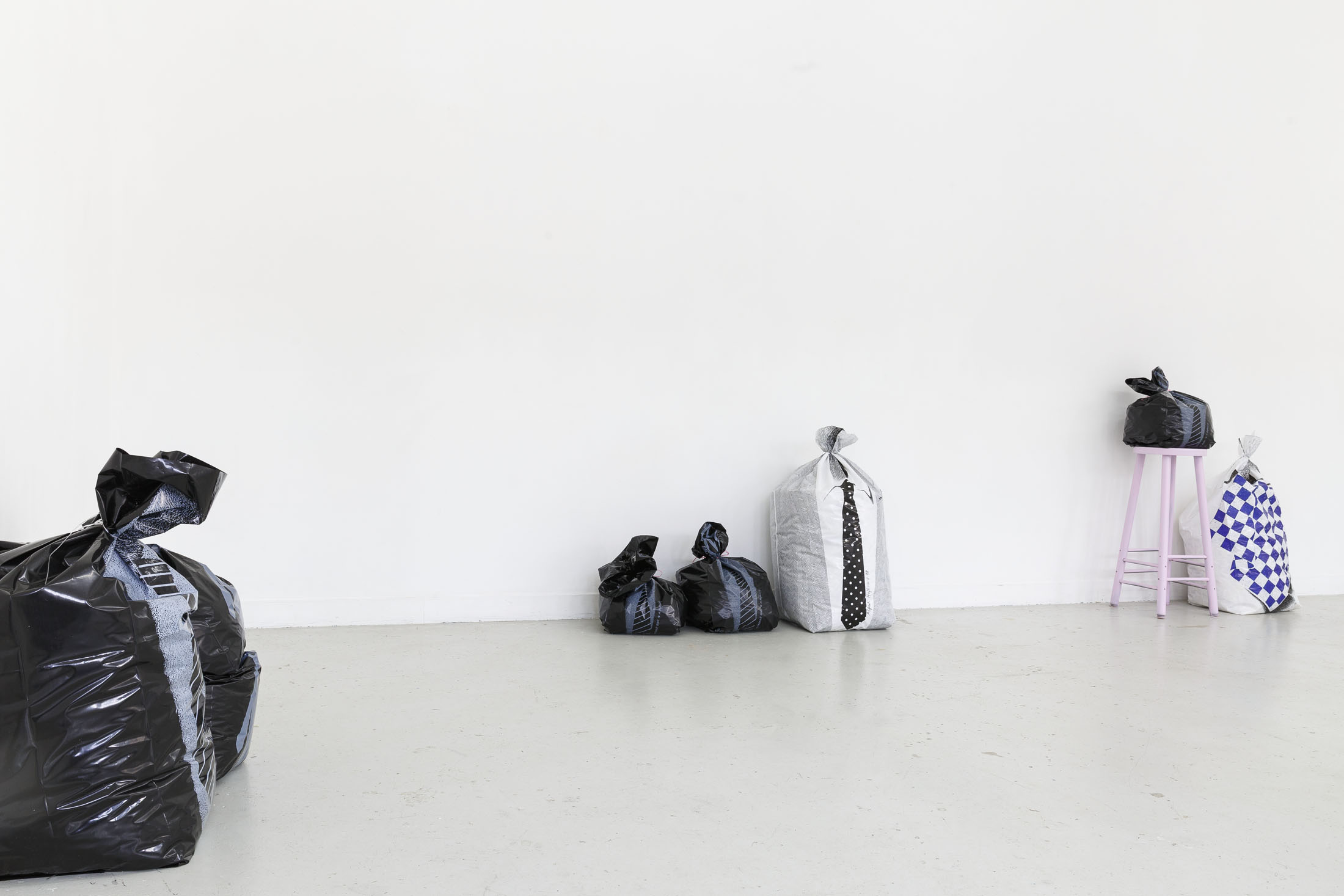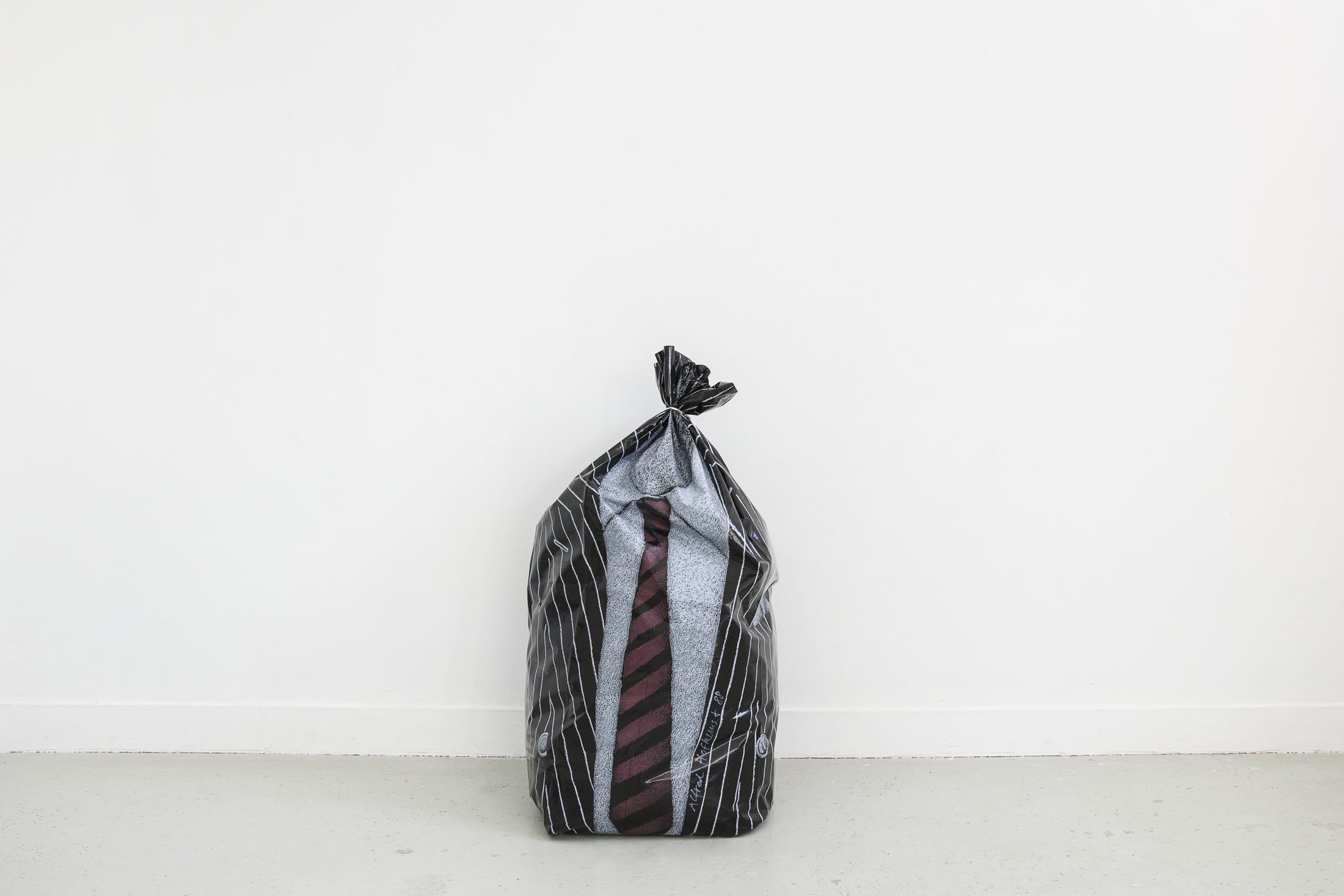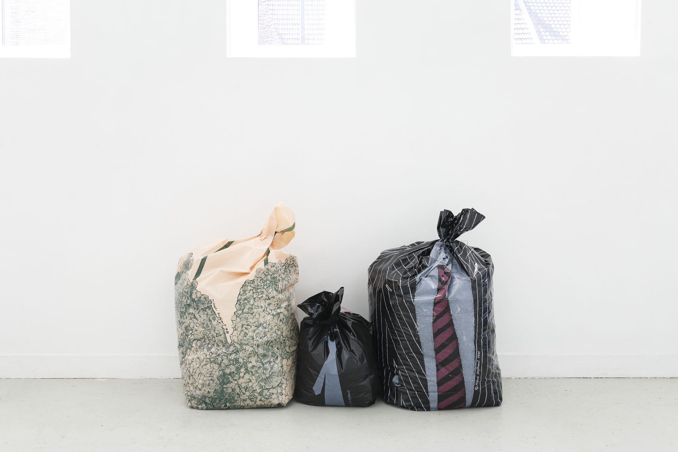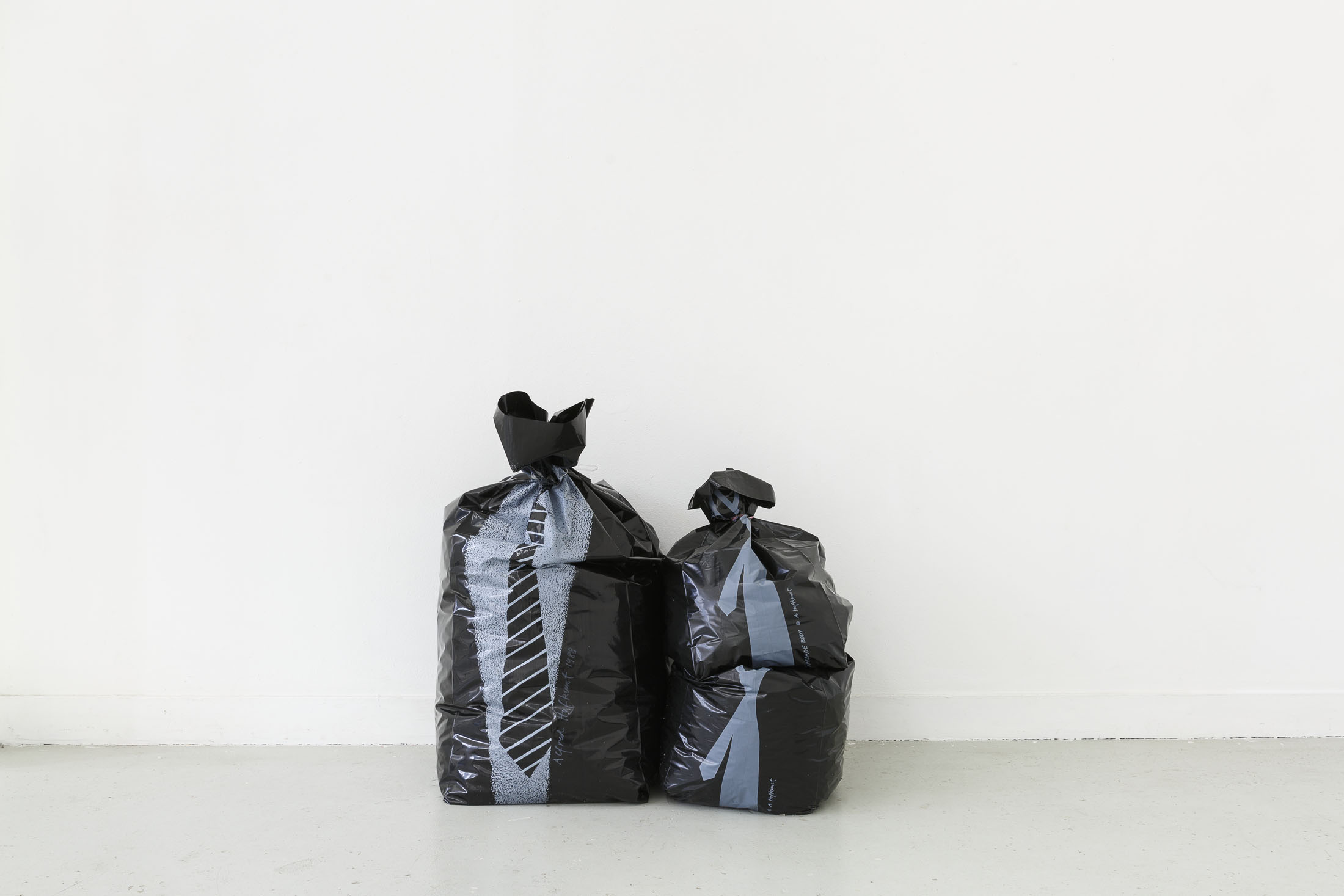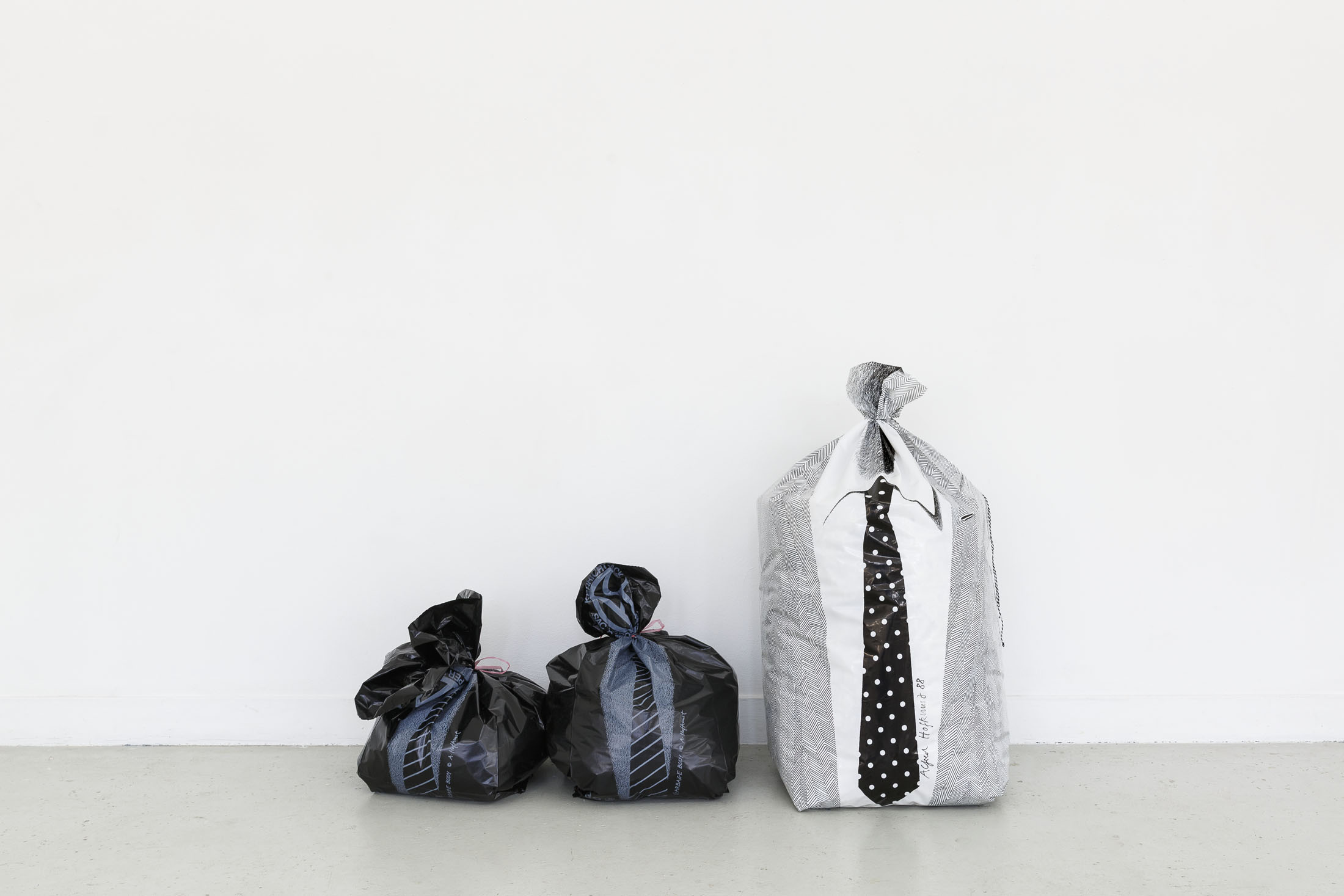 The exhibition Garbage Bodies presents a collection of editions by artist Alfred Hofkunst (1942, Austria – 2004, Switzerland), purchased online from private individuals since early 2024. These editions belong to the Garbage Bodies series — screen prints of garments or uniforms on garbage bags produced in the late 80s between Switzerland and New York. Primarily circulating in private contexts, these works can be filled like actual trash bags, transforming into sculptures that represent various social archetypes (the playboy, the worker, the boss…) or characters imagined by Hofkunst.