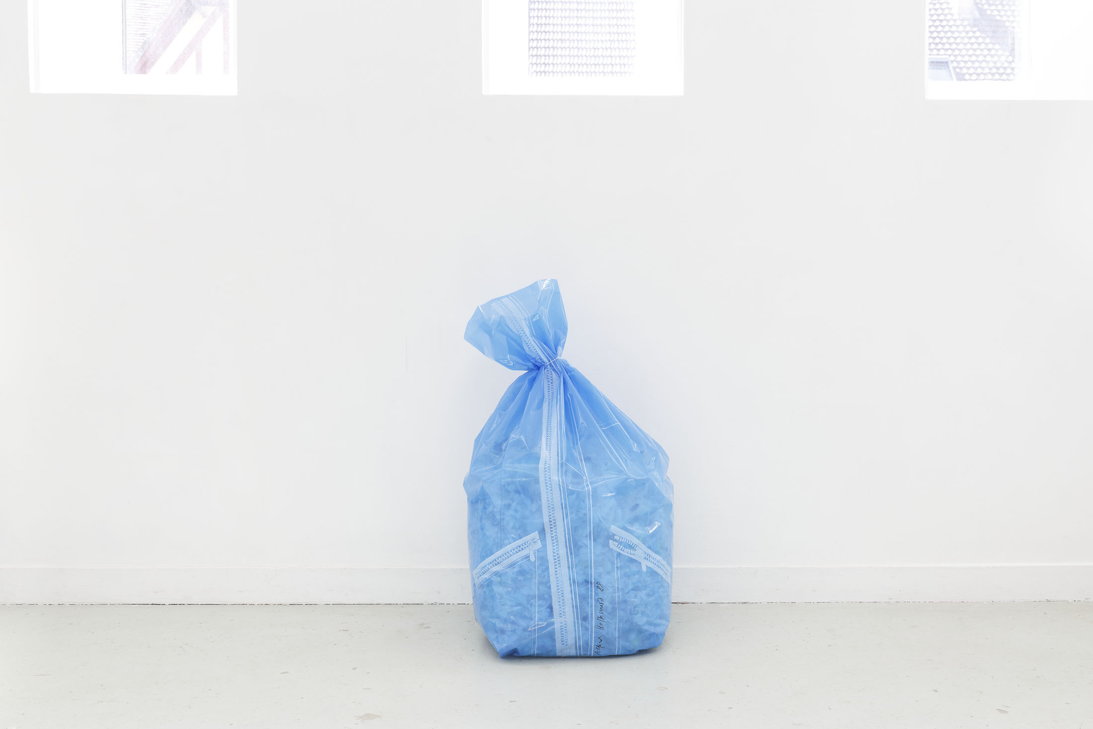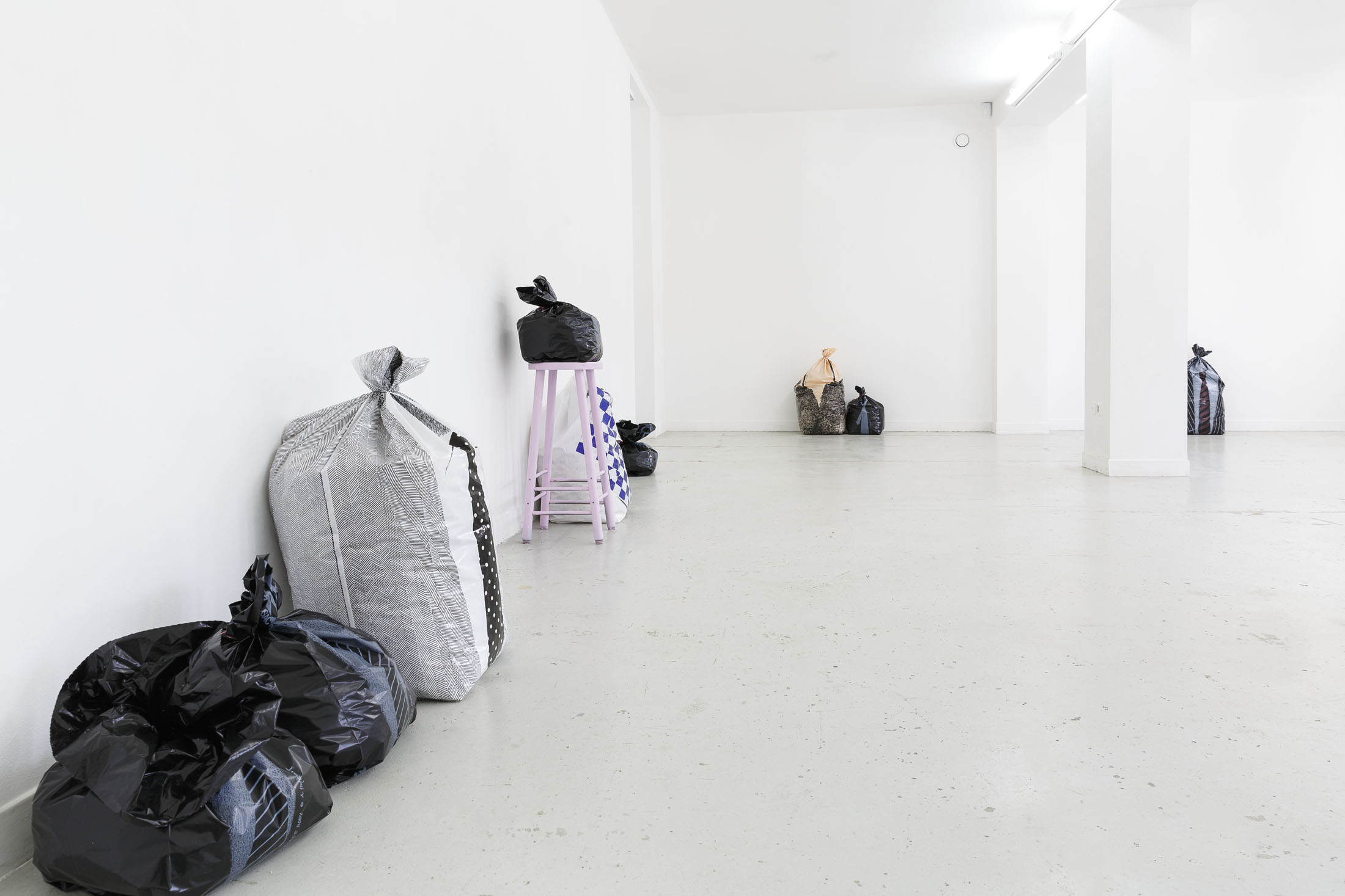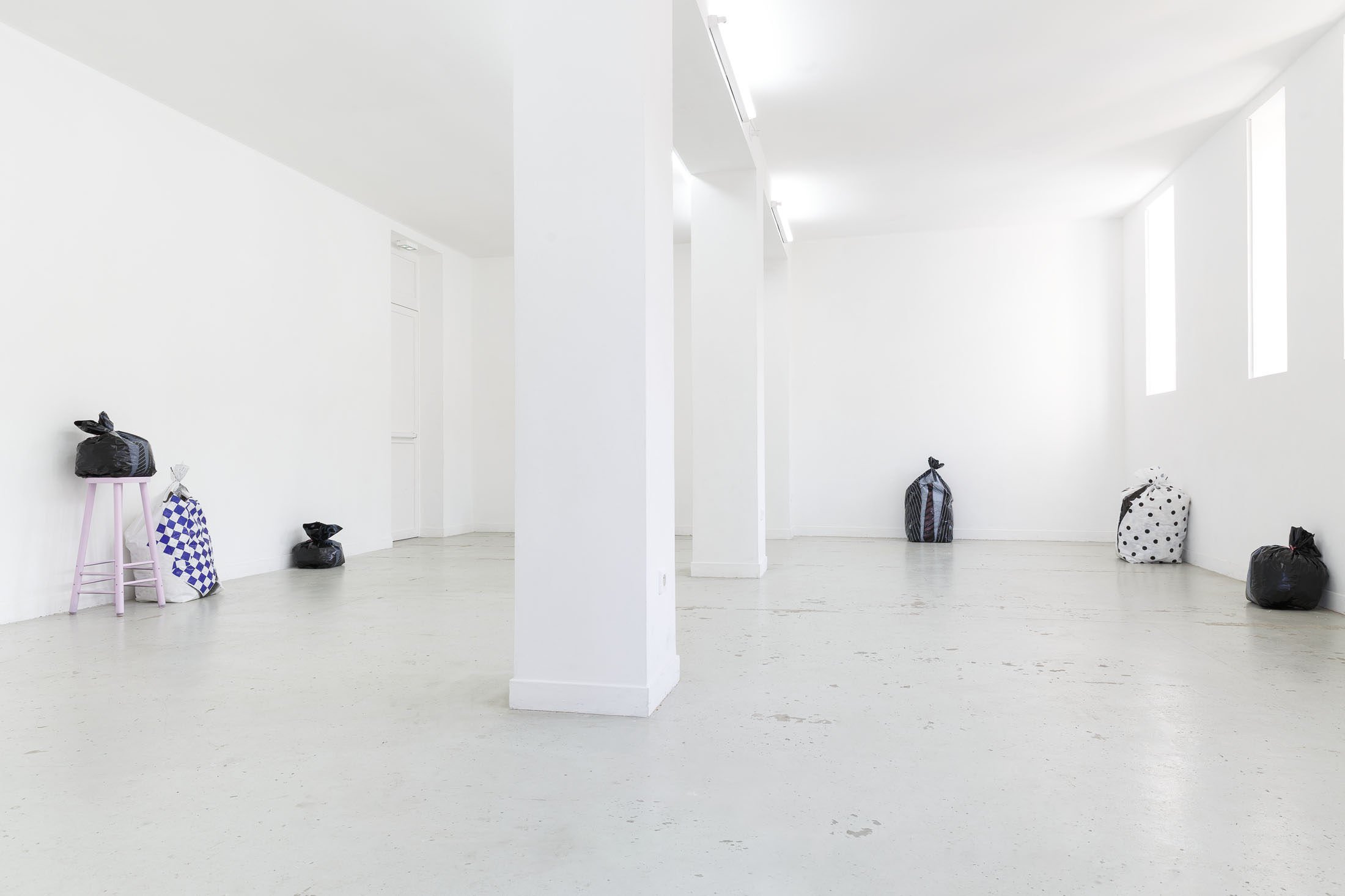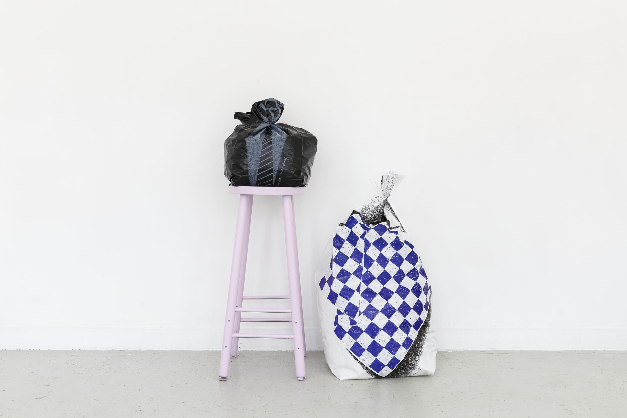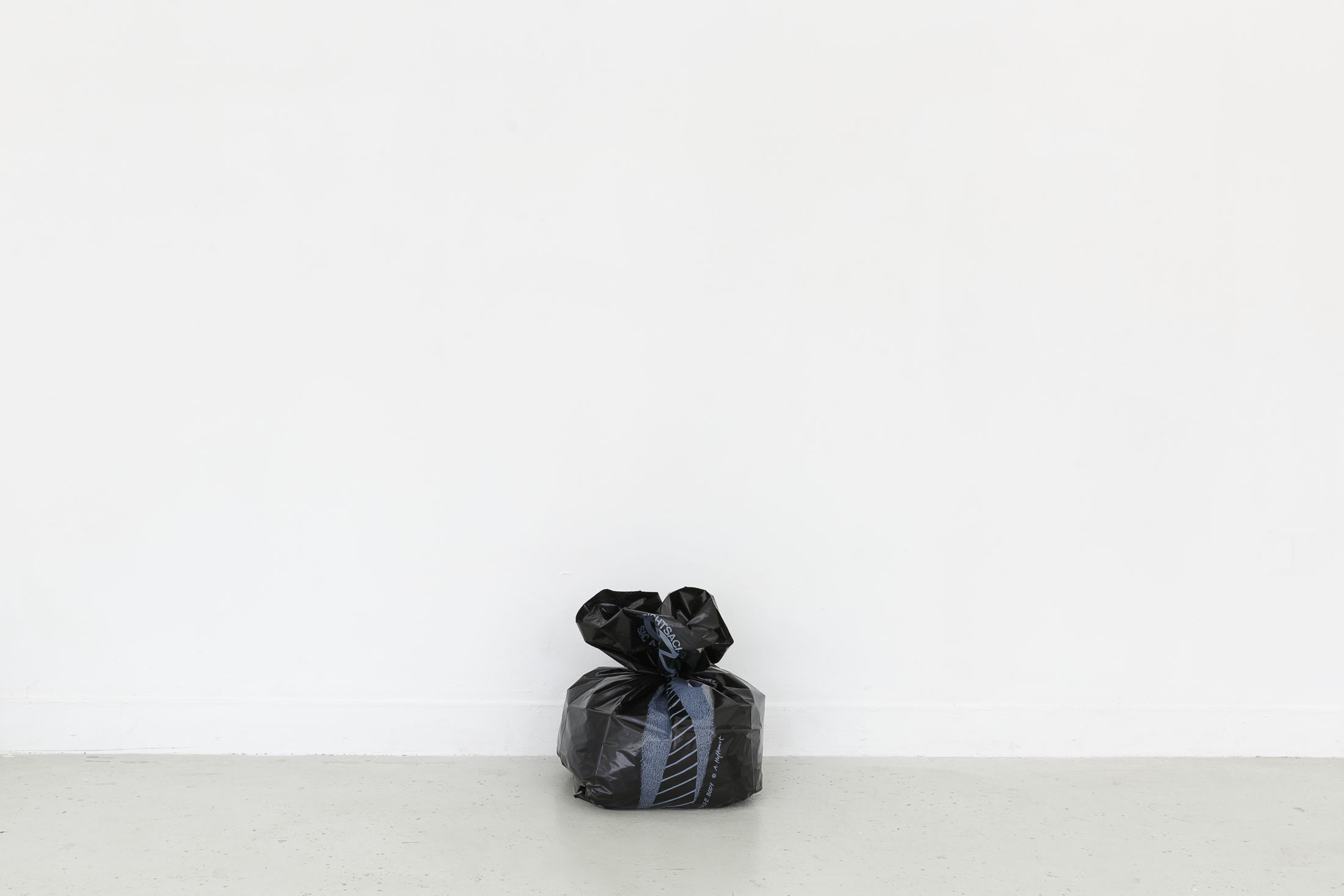 The exhibition Garbage Bodies presents a collection of editions by artist Alfred Hofkunst (1942, Austria – 2004, Switzerland), purchased online from private individuals since early 2024. These editions belong to the Garbage Bodies series — screen prints of garments or uniforms on garbage bags produced in the late 80s between Switzerland and New York. Primarily circulating in private contexts, these works can be filled like actual trash bags, transforming into sculptures that represent various social archetypes (the playboy, the worker, the boss…) or characters imagined by Hofkunst.