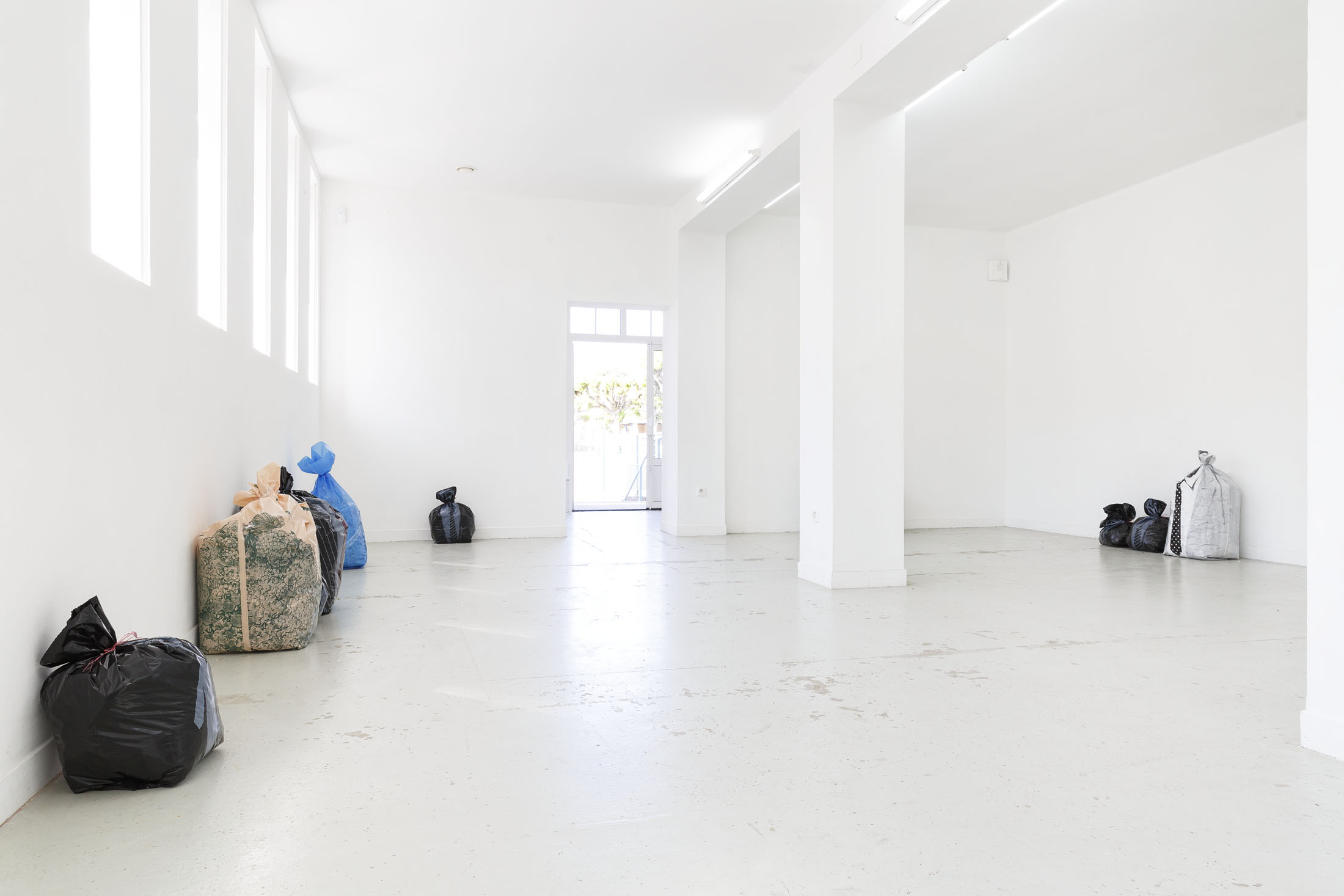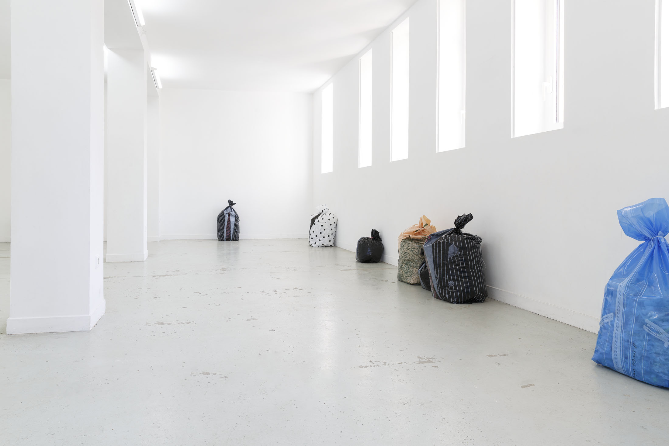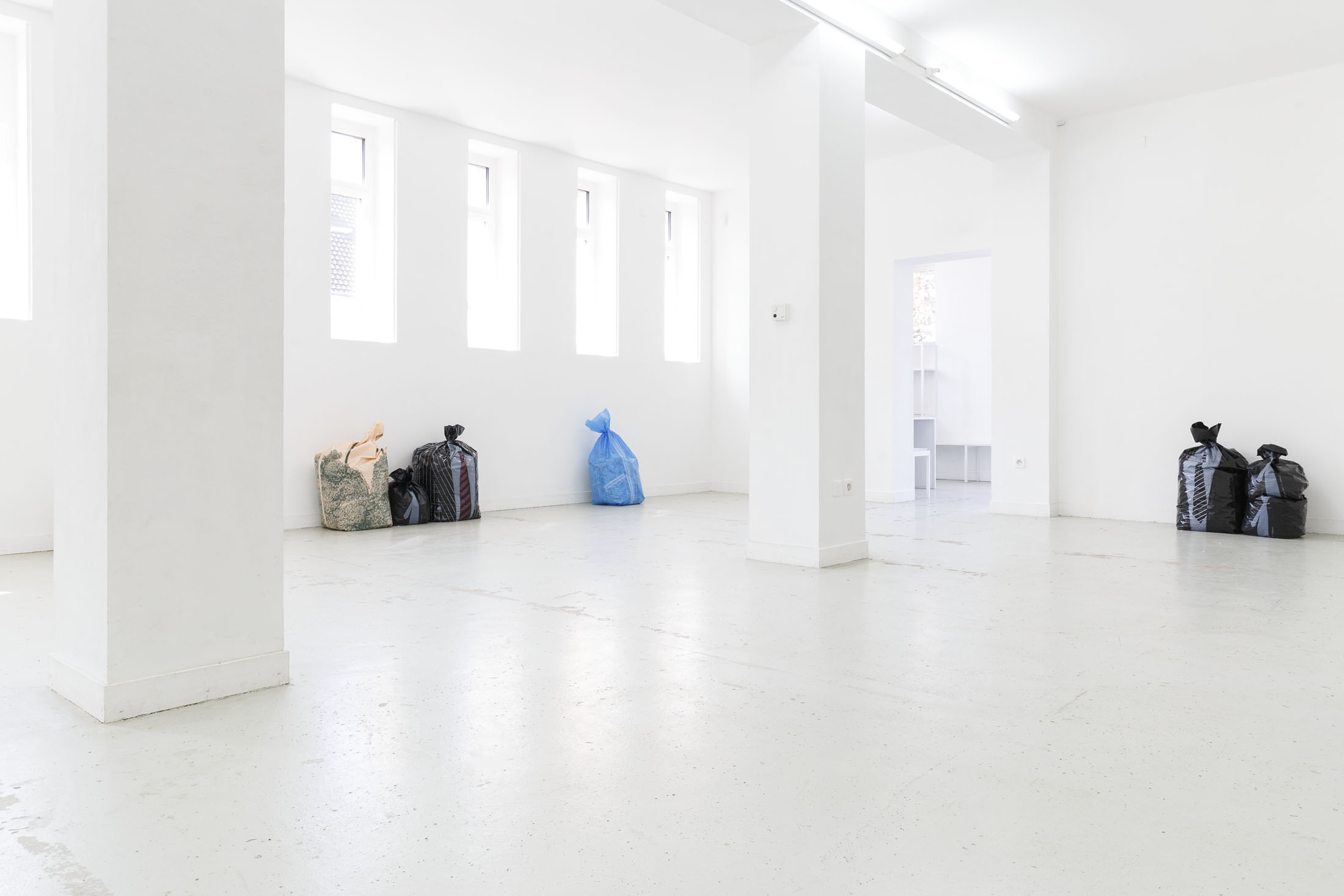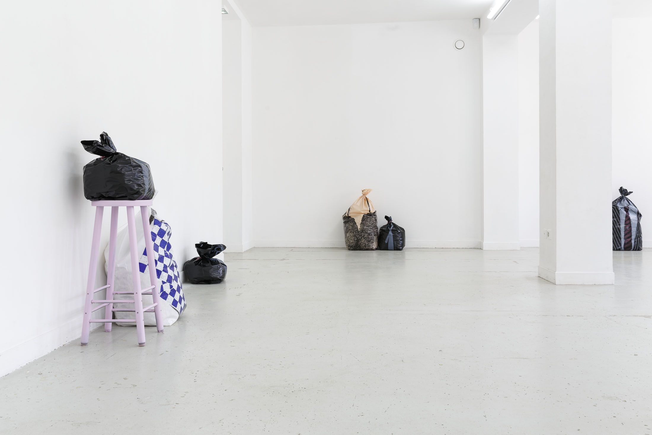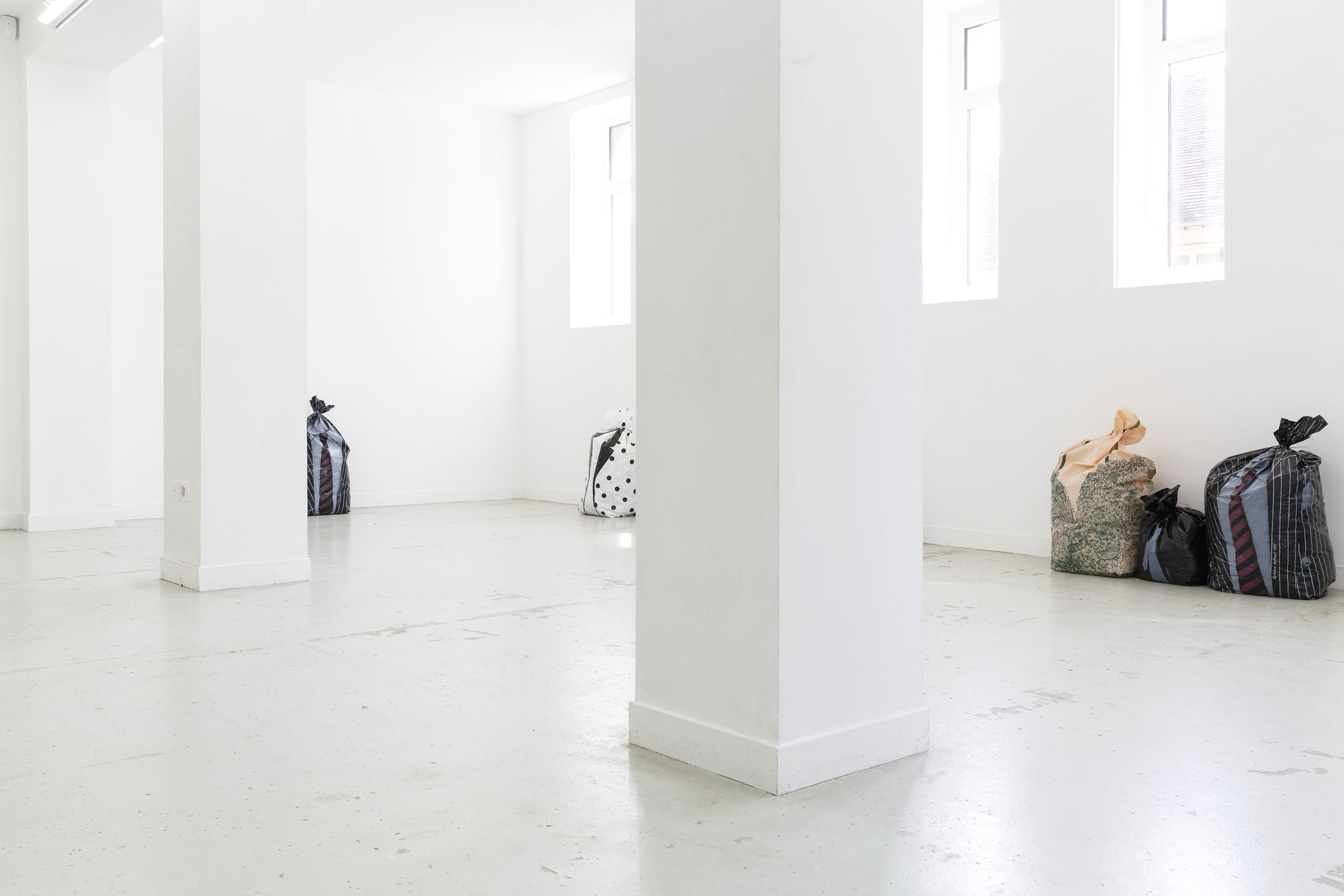 The exhibition Garbage Bodies presents a collection of editions by artist Alfred Hofkunst (1942, Austria – 2004, Switzerland), purchased online from private individuals since early 2024. These editions belong to the Garbage Bodies series — screen prints of garments or uniforms on garbage bags produced in the late 80s between Switzerland and New York. Primarily circulating in private contexts, these works can be filled like actual trash bags, transforming into sculptures that represent various social archetypes (the playboy, the worker, the boss…) or characters imagined by Hofkunst.