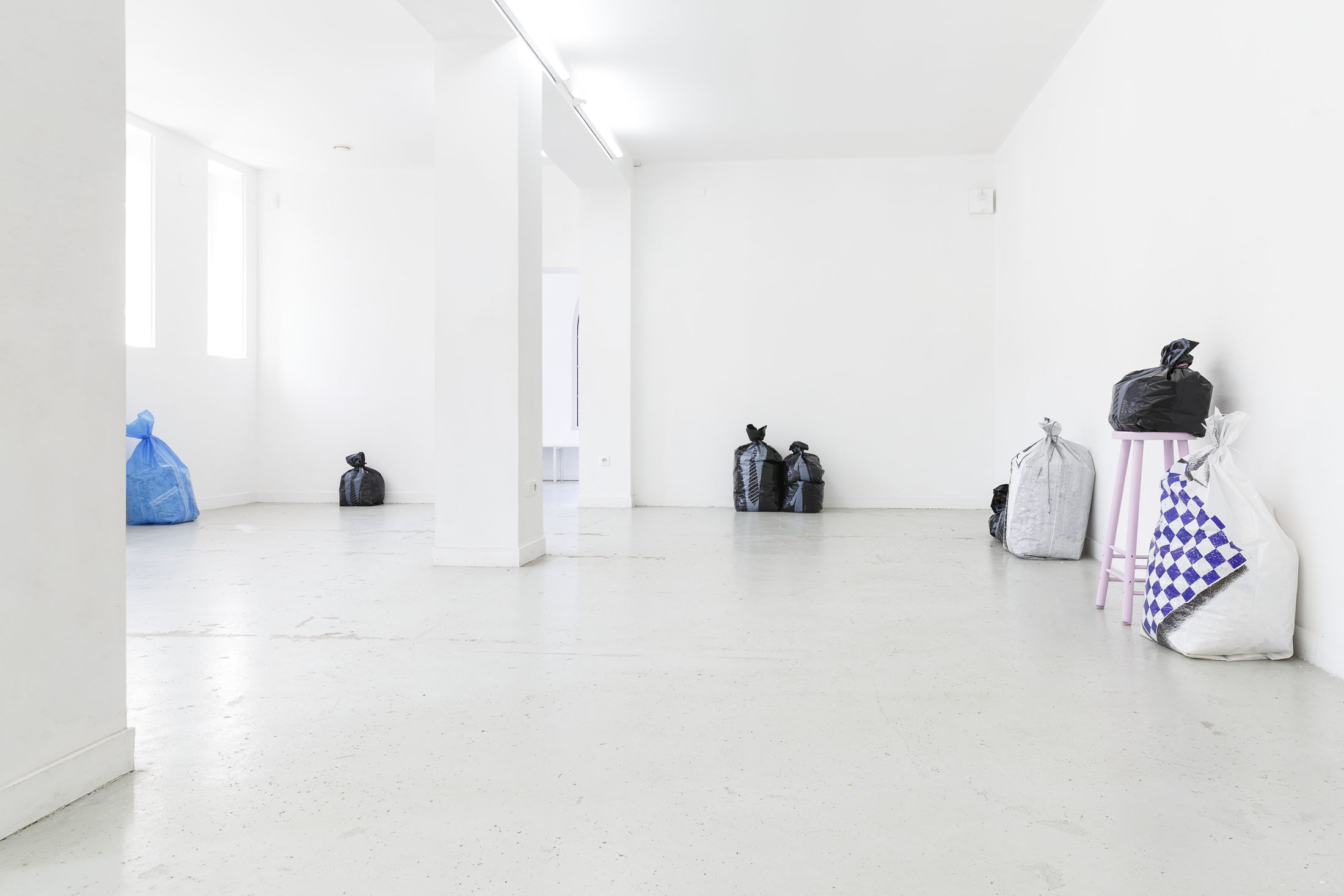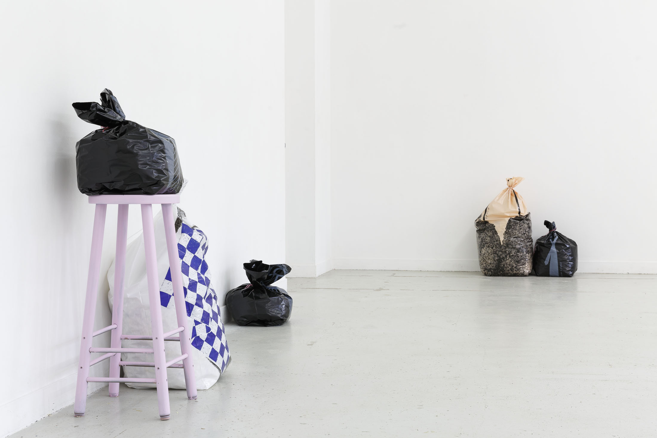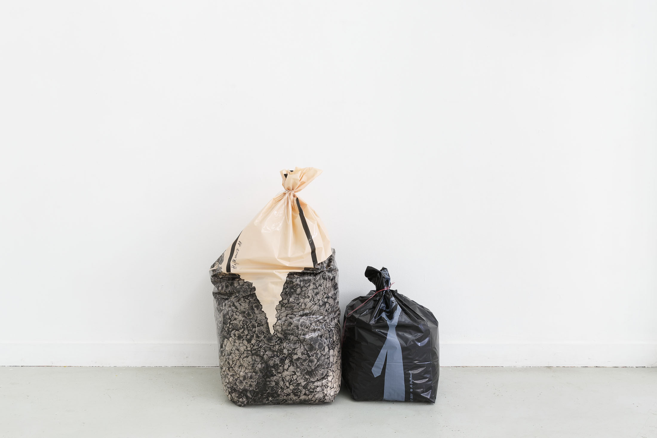 In 2023, K. Desbouis published in Suckcess 2 a selection of Garbage Bodies photographs dating from 1988. For the exhibition at Les Bains-Douches, he recontextualizes the bags in new social configurations, reproducing or updating the class dynamics and fantasies associated with Hofkunst’s original editions. Reflecting Garbage Bodies‘ transition from 2D to 3D, Desbouis transposes Suckcess‘ two-dimensional compositional work into the exhibition space, thus editorializing Hofkunst’s practice. The show will explore the connections between body politics and body horror, as well as the comedic and cinematic dimensions of Garbage Bodies.
