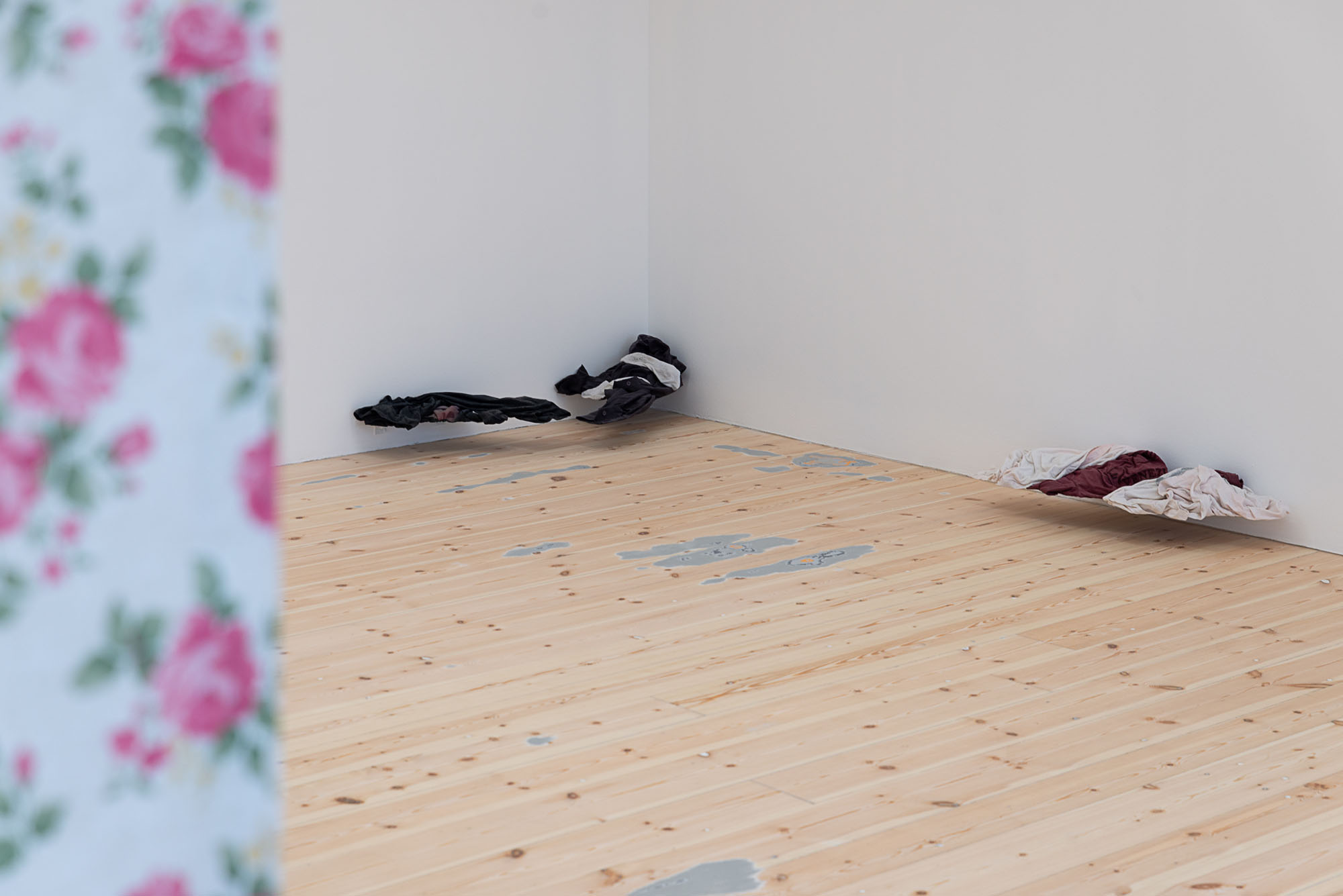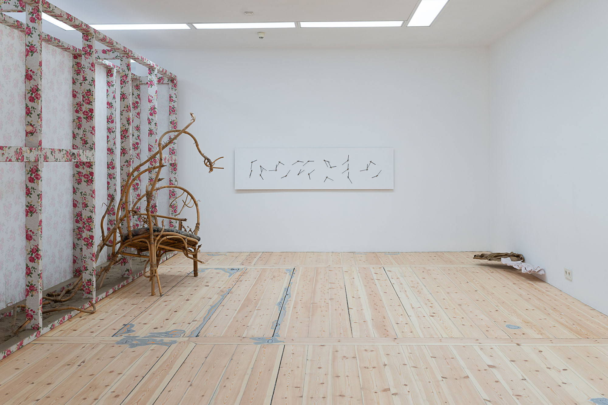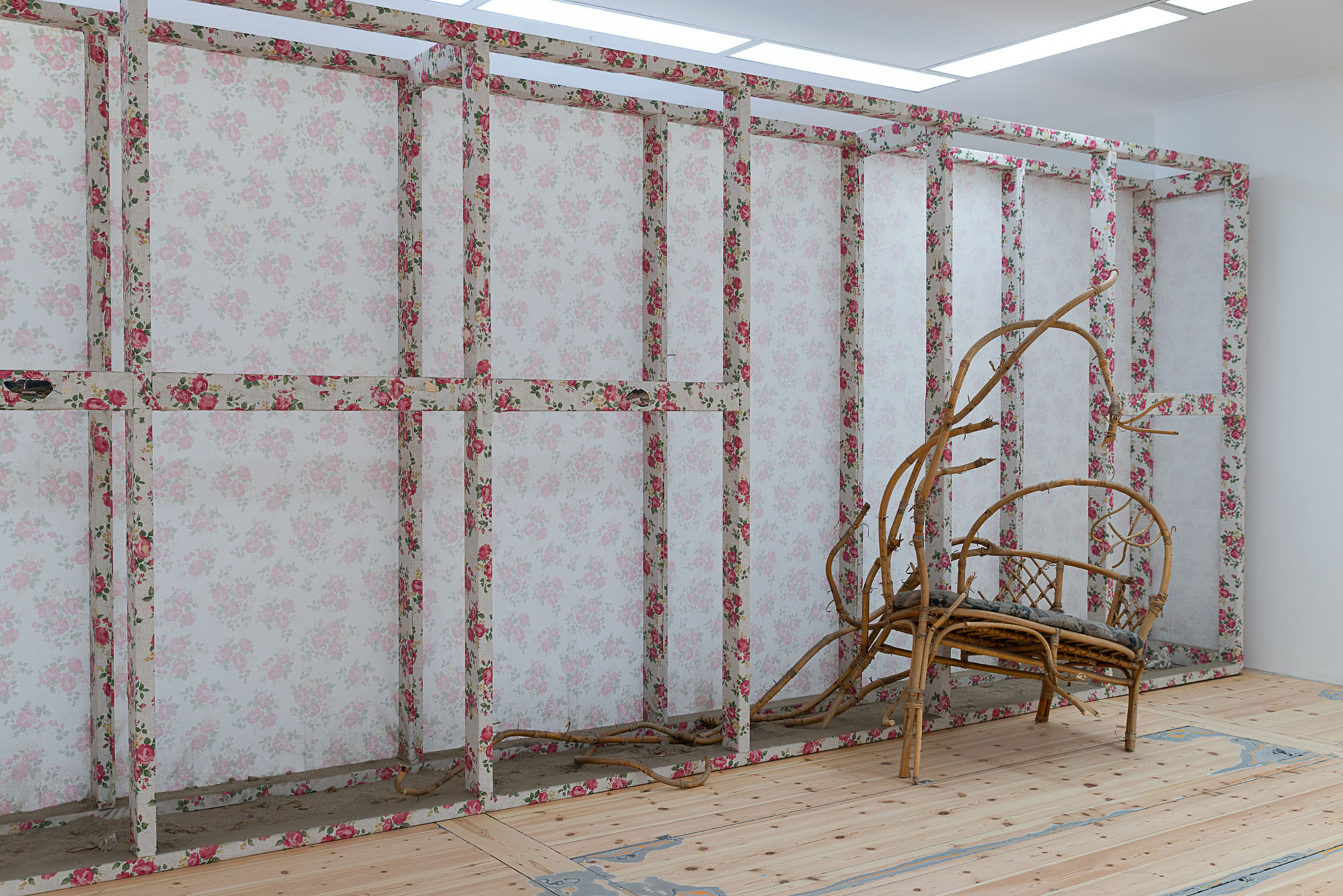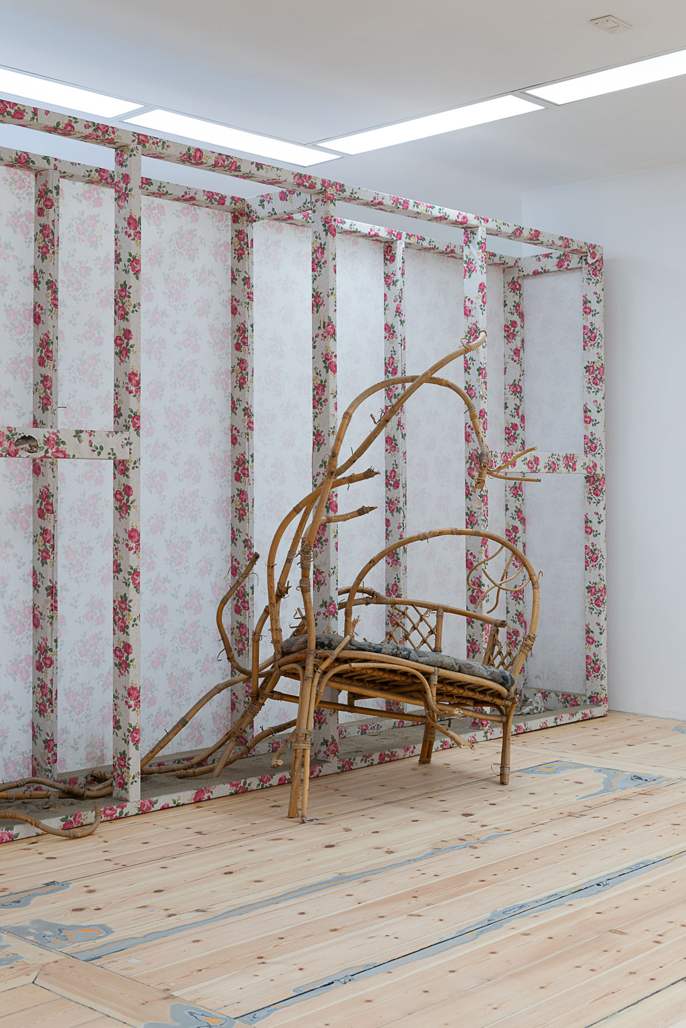 The exhibition partially builds from personal fragments, such as photographs of flooded landscapes, hazy conversations and domestic objects that appear almost as peculiar sketches come to life. A sofa that once occupied the family home seems to have developed plant-like qualities, sprouting and searching for nourishment. A long wall creates a passage into the exhibition space where domestic properties blend together; living room, kitchen and a closet. By recontextualising wax covers commonly used for dining tables, they adopt an almost skin-like texture, and together with the holes of the structure, become a makeshift metaphor for a human body. The exhibition operates between rhythmic cohesion and arrhythmic disruption. Many of the elements signify time, referencing to historical moments – yet their temporal coordinates remain obscured, without a date it’s tough to understand if this is the future or the past.