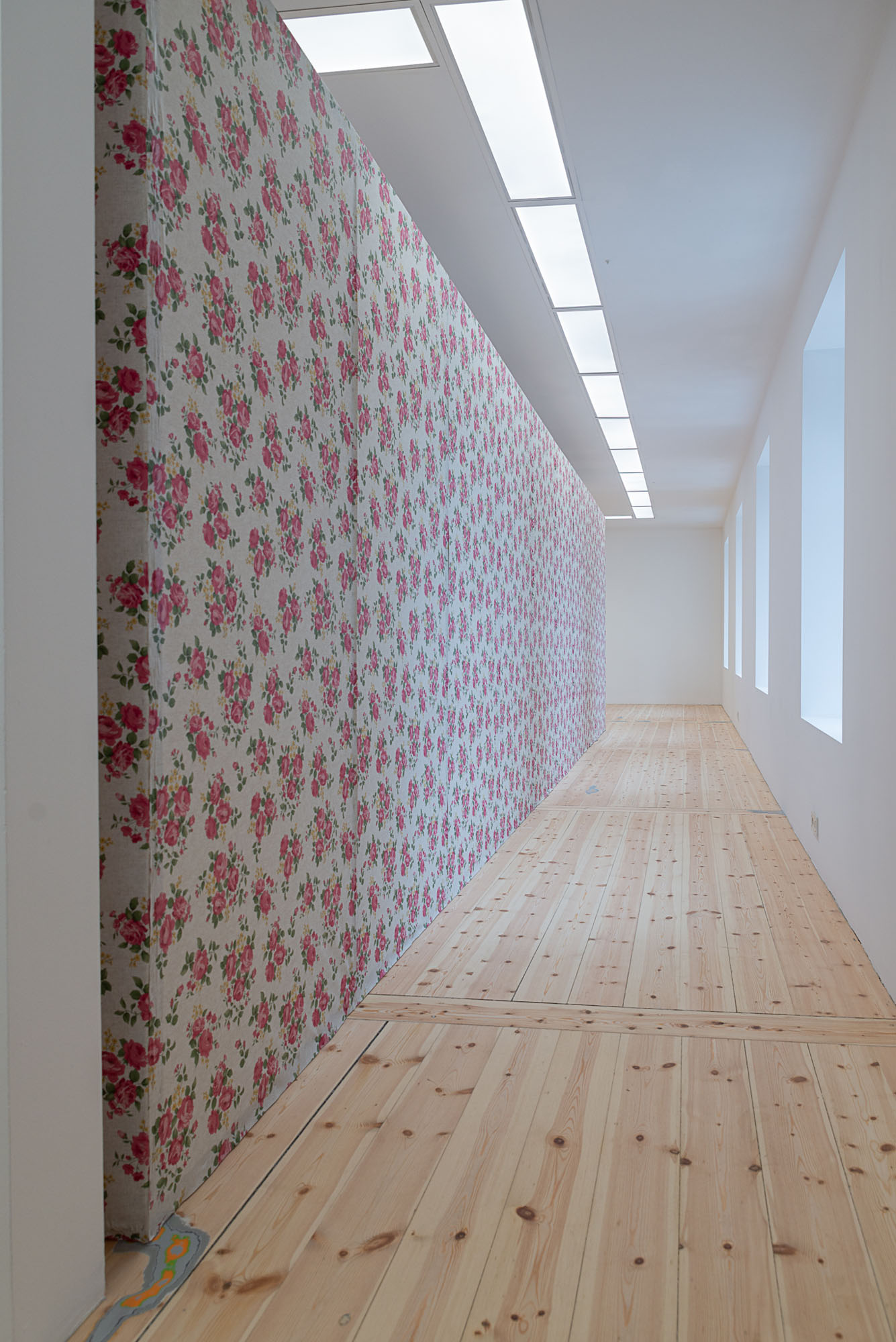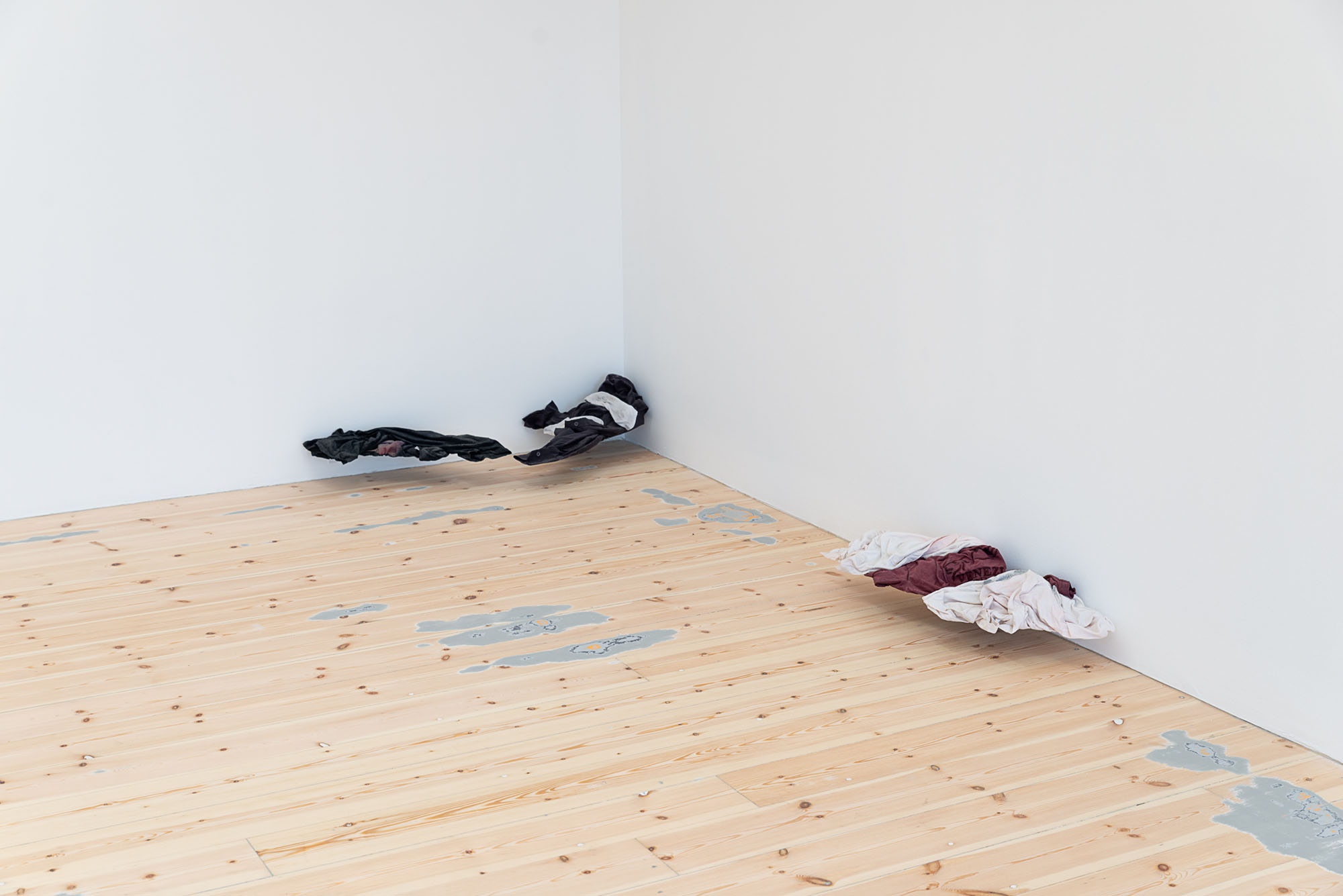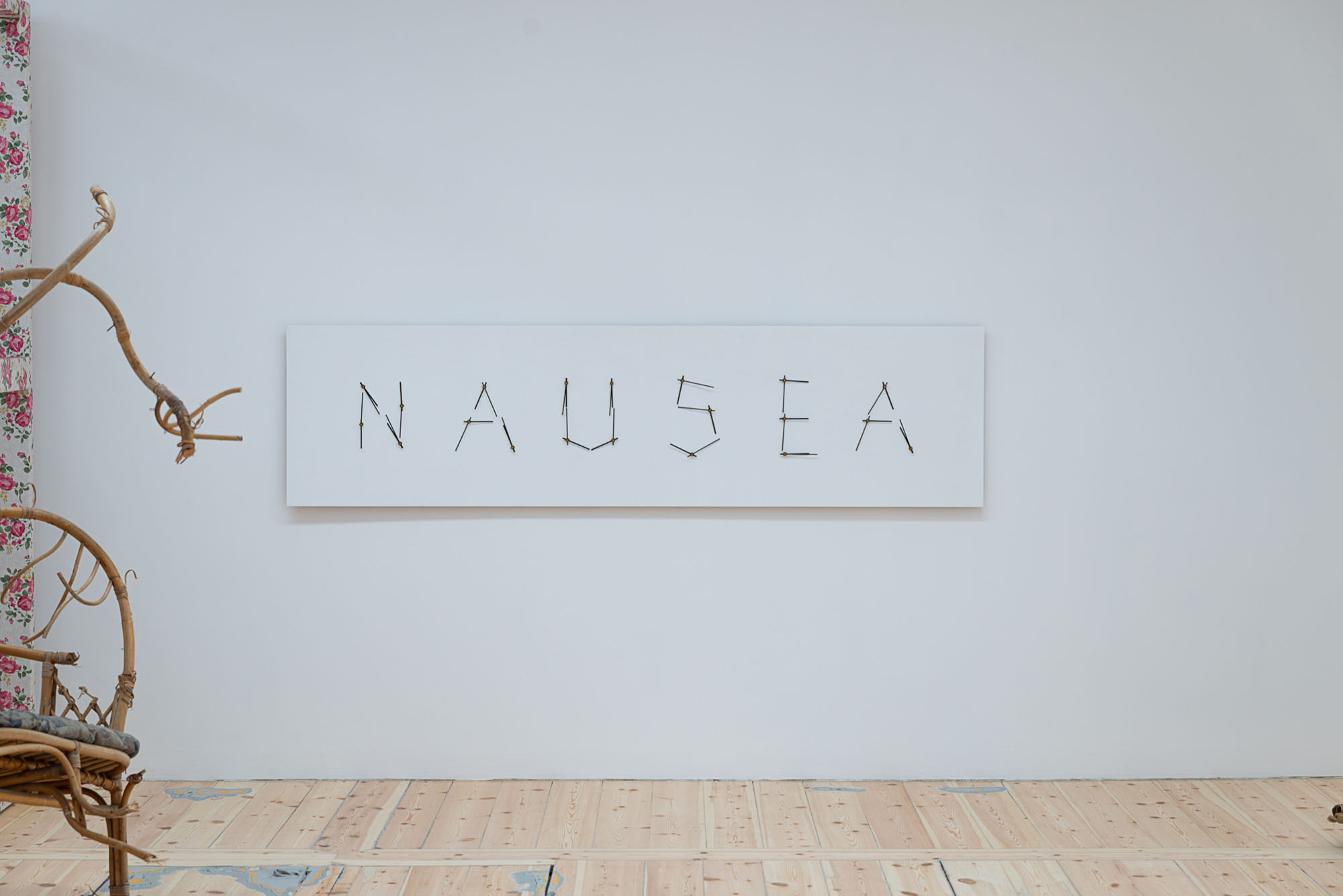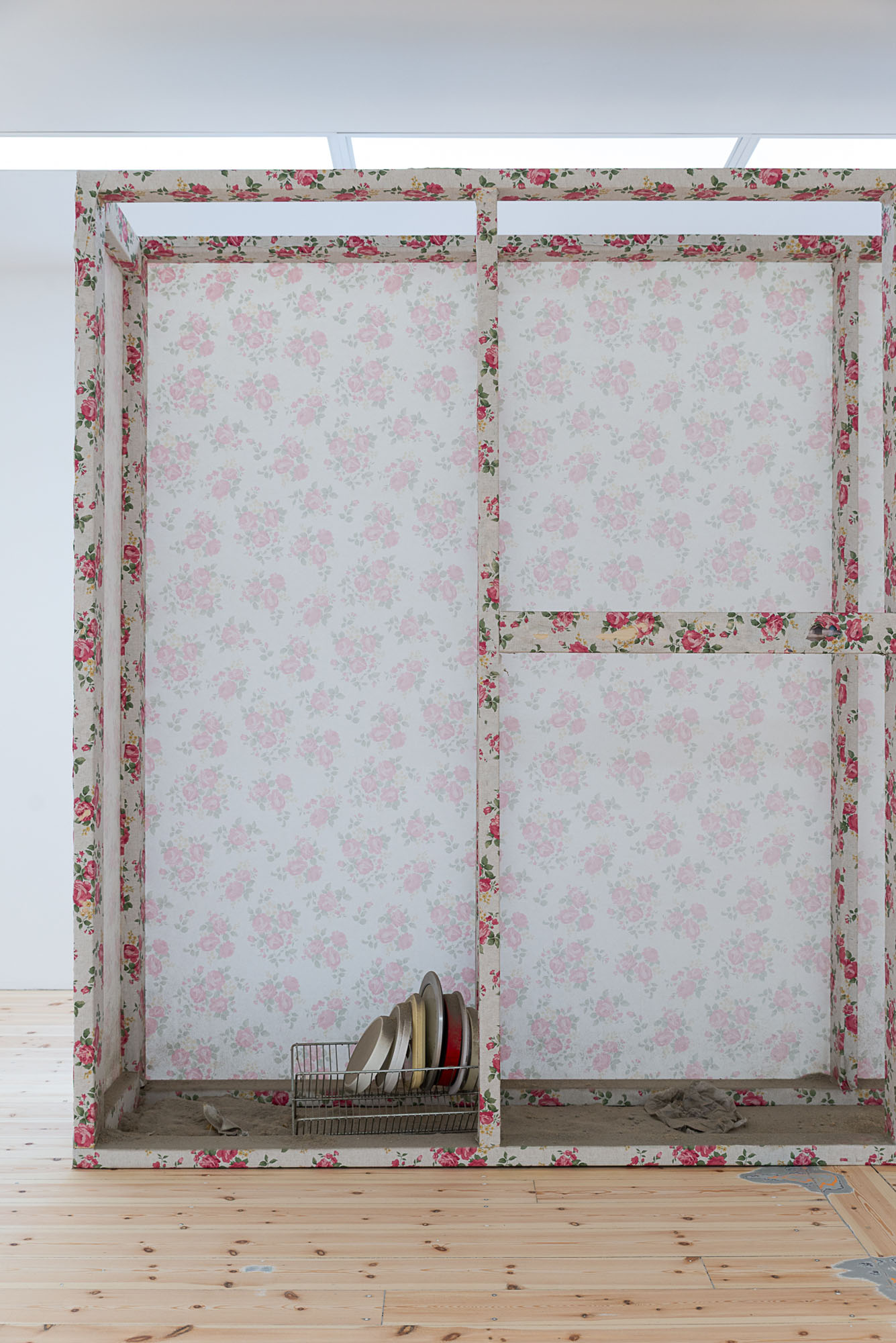 The exhibition partially builds from personal fragments, such as photographs of flooded landscapes, hazy conversations and domestic objects that appear almost as peculiar sketches come to life. A sofa that once occupied the family home seems to have developed plant-like qualities, sprouting and searching for nourishment. A long wall creates a passage into the exhibition space where domestic properties blend together; living room, kitchen and a closet. By recontextualising wax covers commonly used for dining tables, they adopt an almost skin-like texture, and together with the holes of the structure, become a makeshift metaphor for a human body. The exhibition operates between rhythmic cohesion and arrhythmic disruption. Many of the elements signify time, referencing to historical moments – yet their temporal coordinates remain obscured, without a date it’s tough to understand if this is the future or the past.