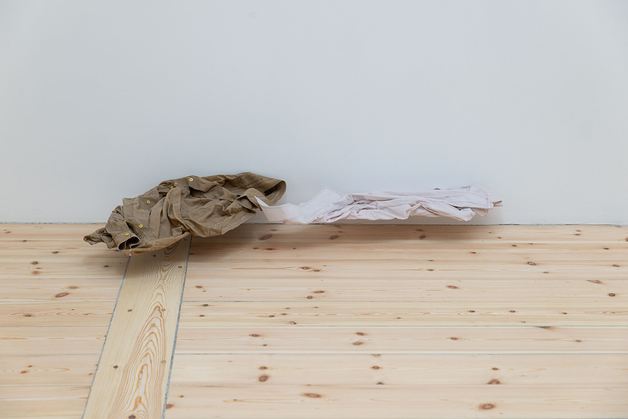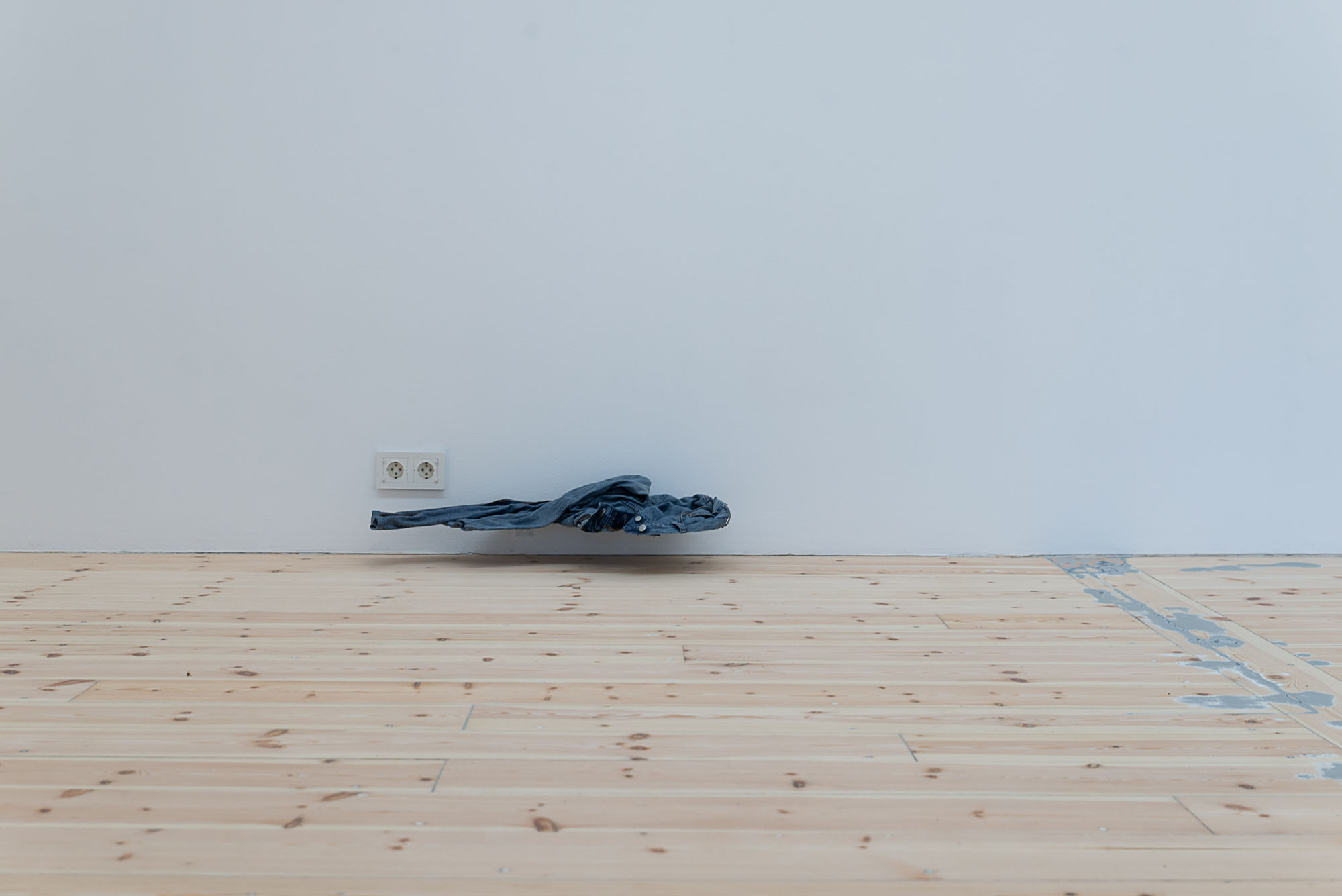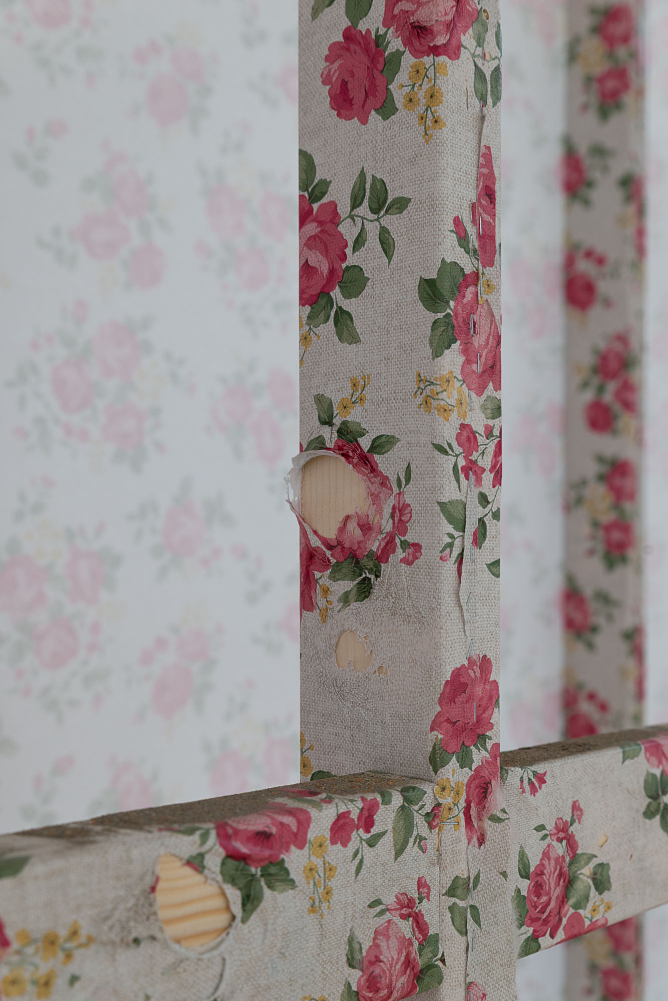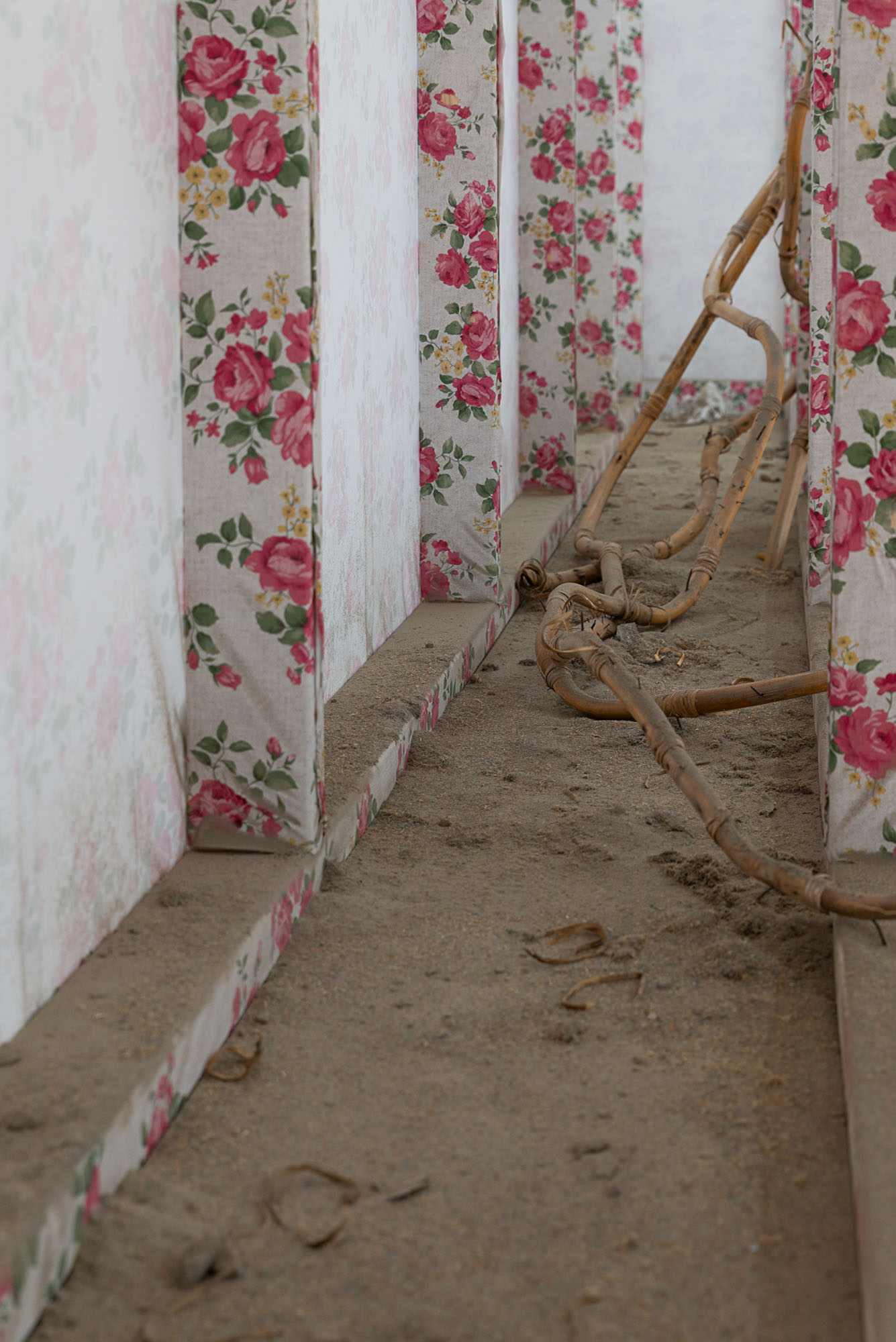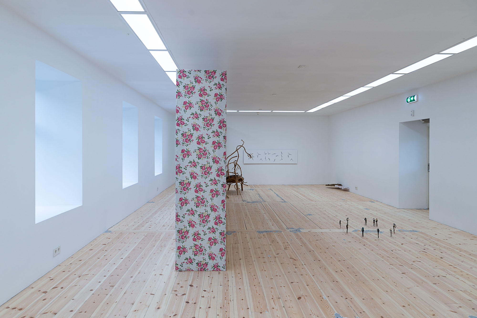The exhibition partially builds from personal fragments, such as photographs of flooded landscapes, hazy conversations and domestic objects that appear almost as peculiar sketches come to life. A sofa that once occupied the family home seems to have developed plant-like qualities, sprouting and searching for nourishment. A long wall creates a passage into the exhibition space where domestic properties blend together; living room, kitchen and a closet. By recontextualising wax covers commonly used for dining tables, they adopt an almost skin-like texture, and together with the holes of the structure, become a makeshift metaphor for a human body. The exhibition operates between rhythmic cohesion and arrhythmic disruption. Many of the elements signify time, referencing to historical moments – yet their temporal coordinates remain obscured, without a date it’s tough to understand if this is the future or the past.