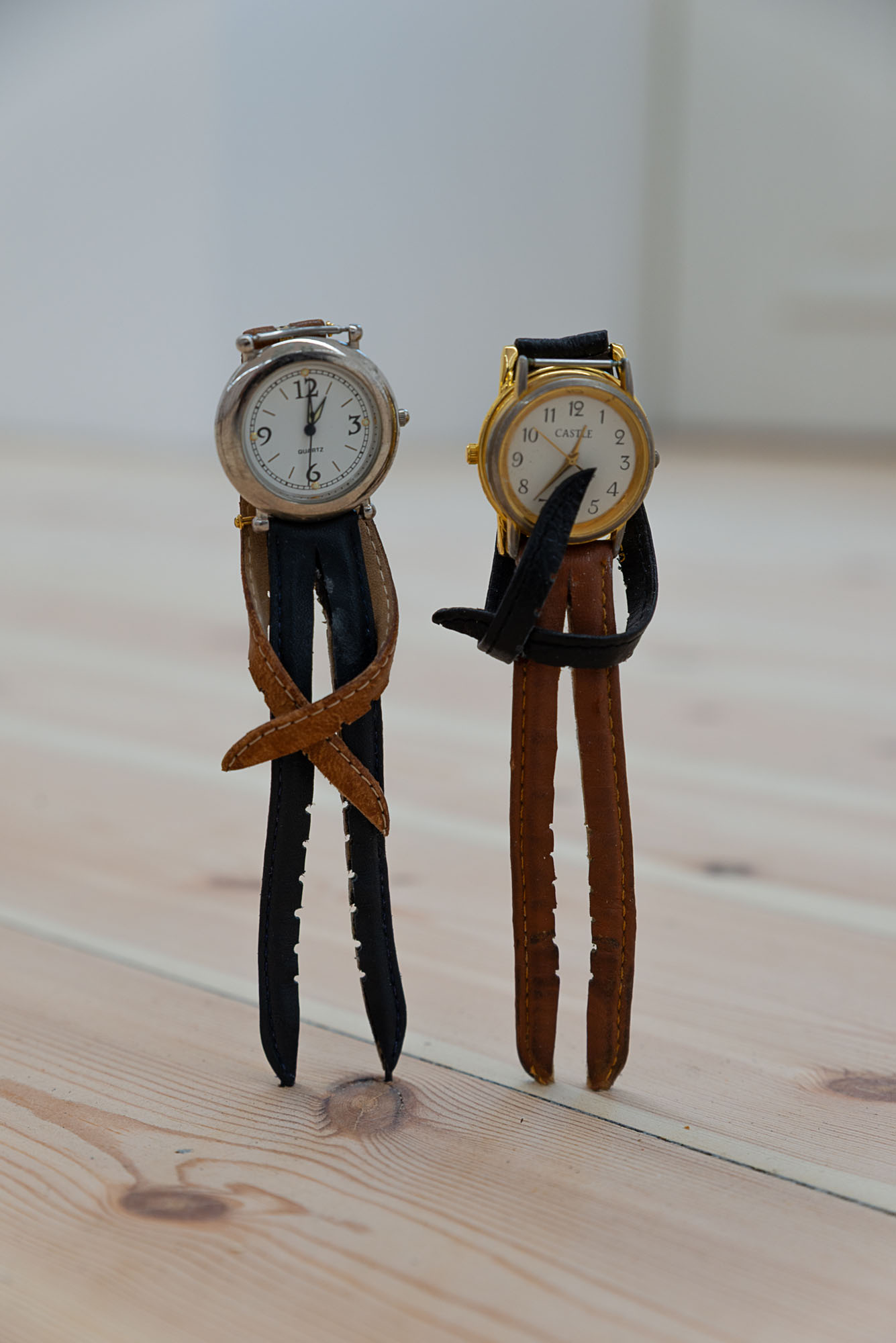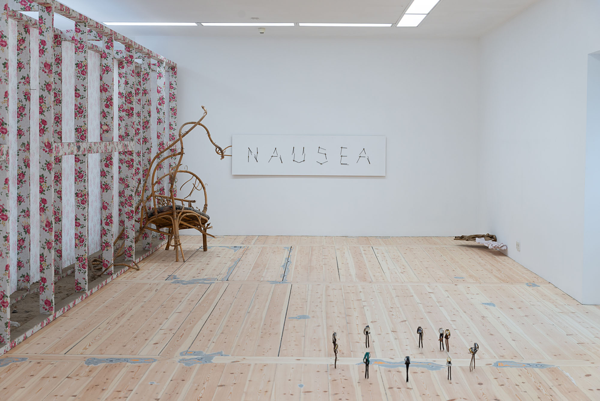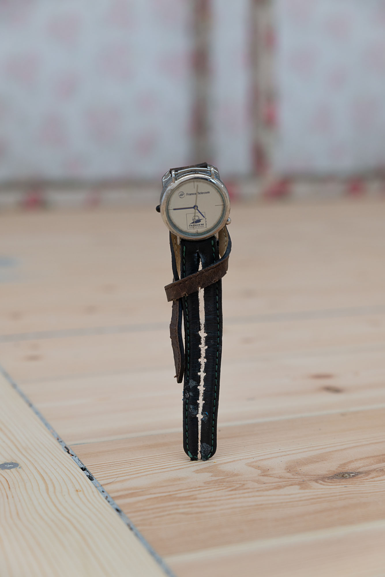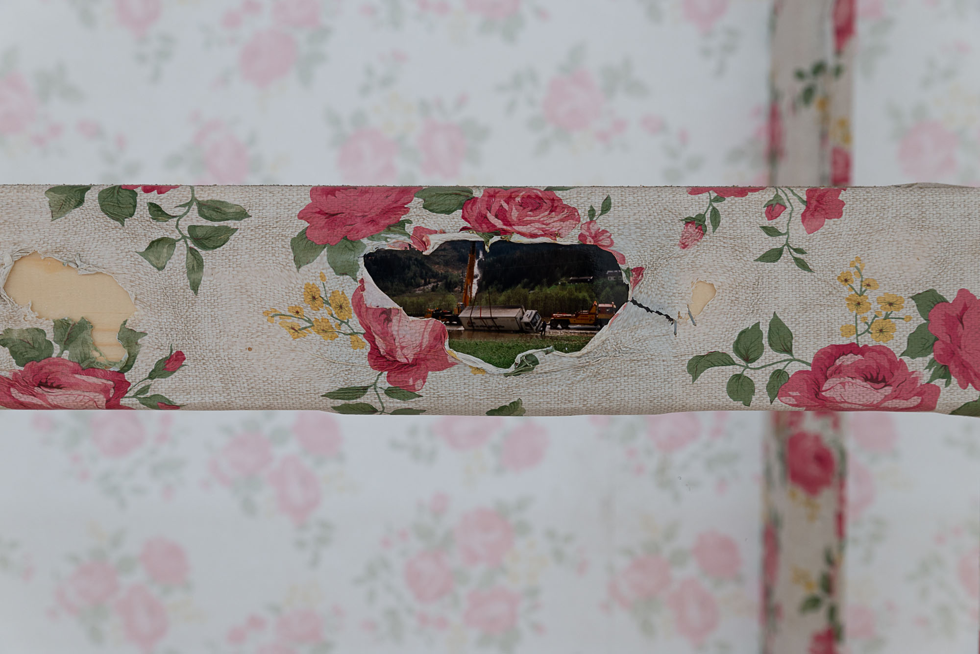 The exhibition partially builds from personal fragments, such as photographs of flooded landscapes, hazy conversations and domestic objects that appear almost as peculiar sketches come to life. A sofa that once occupied the family home seems to have developed plant-like qualities, sprouting and searching for nourishment. A long wall creates a passage into the exhibition space where domestic properties blend together; living room, kitchen and a closet. By recontextualising wax covers commonly used for dining tables, they adopt an almost skin-like texture, and together with the holes of the structure, become a makeshift metaphor for a human body. The exhibition operates between rhythmic cohesion and arrhythmic disruption. Many of the elements signify time, referencing to historical moments – yet their temporal coordinates remain obscured, without a date it’s tough to understand if this is the future or the past.
