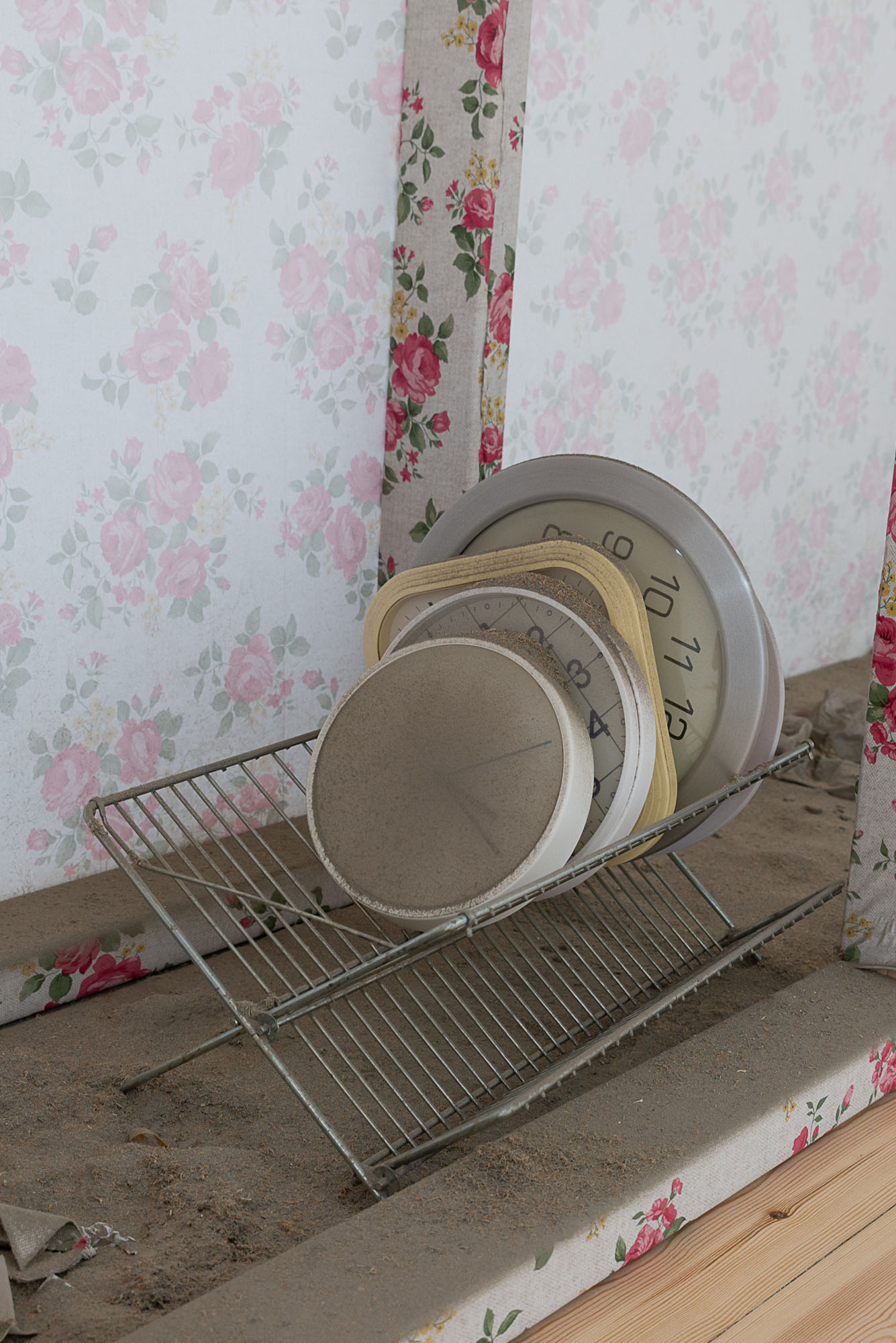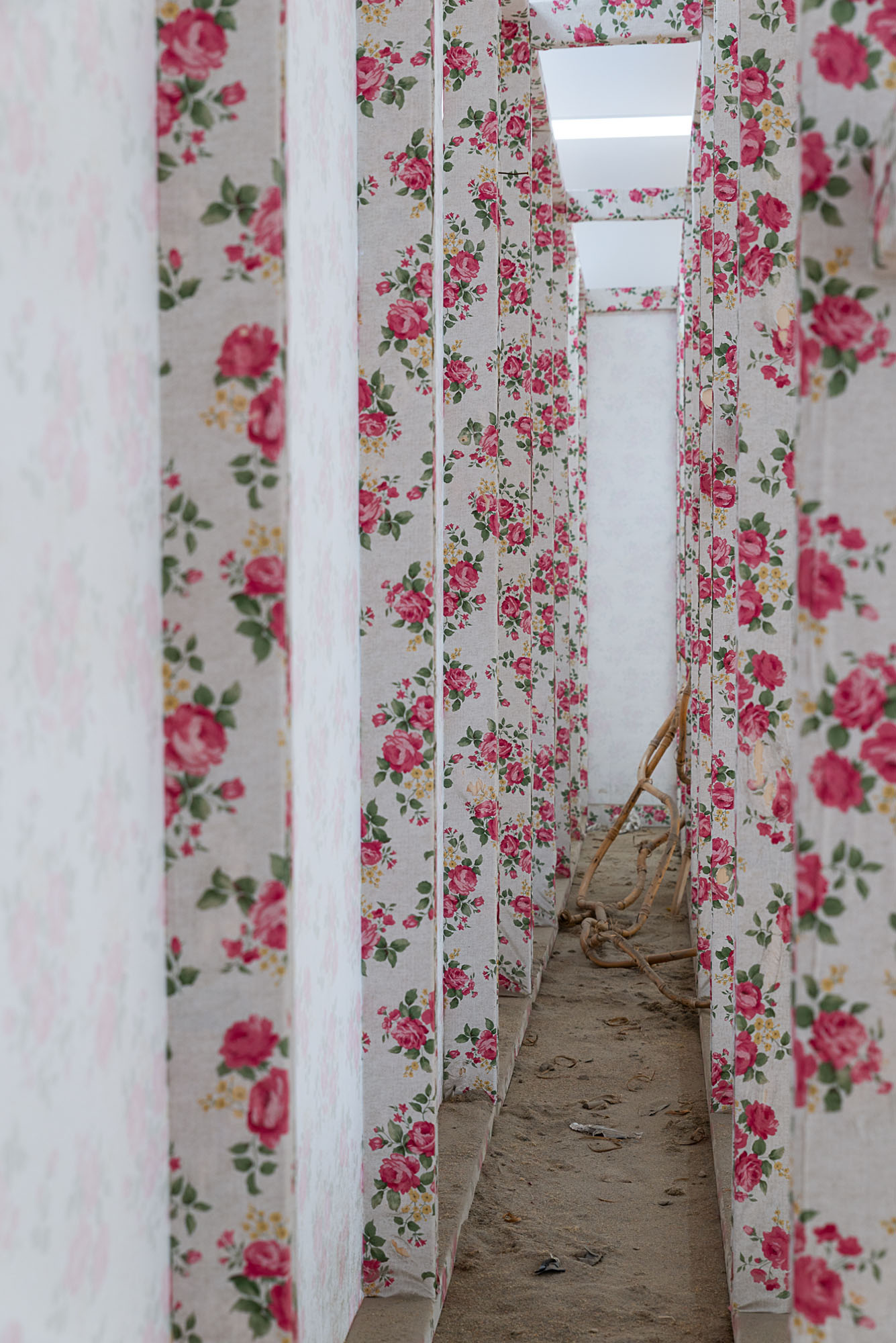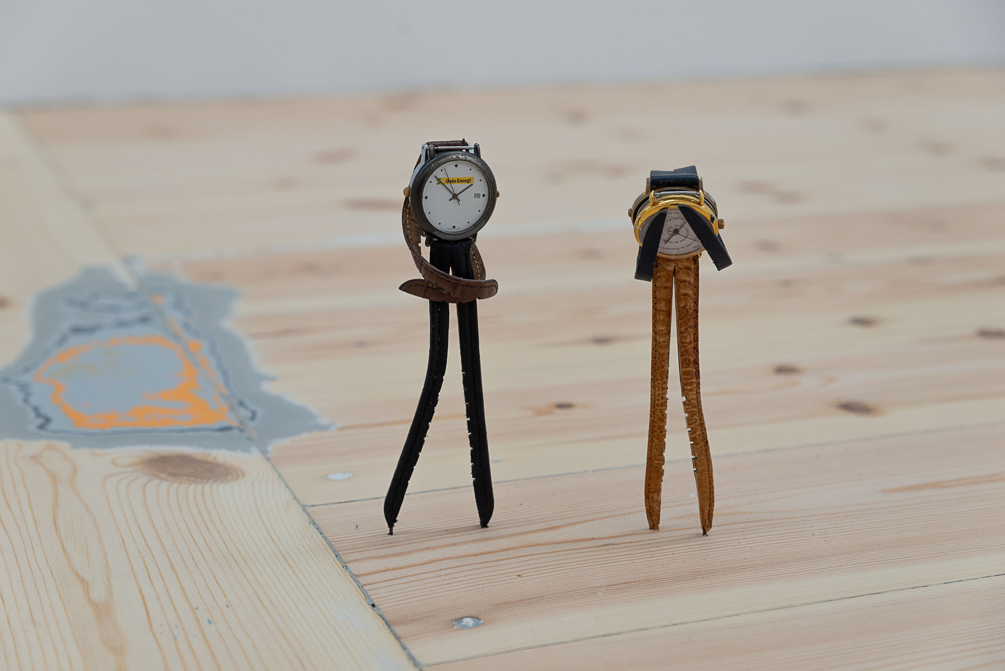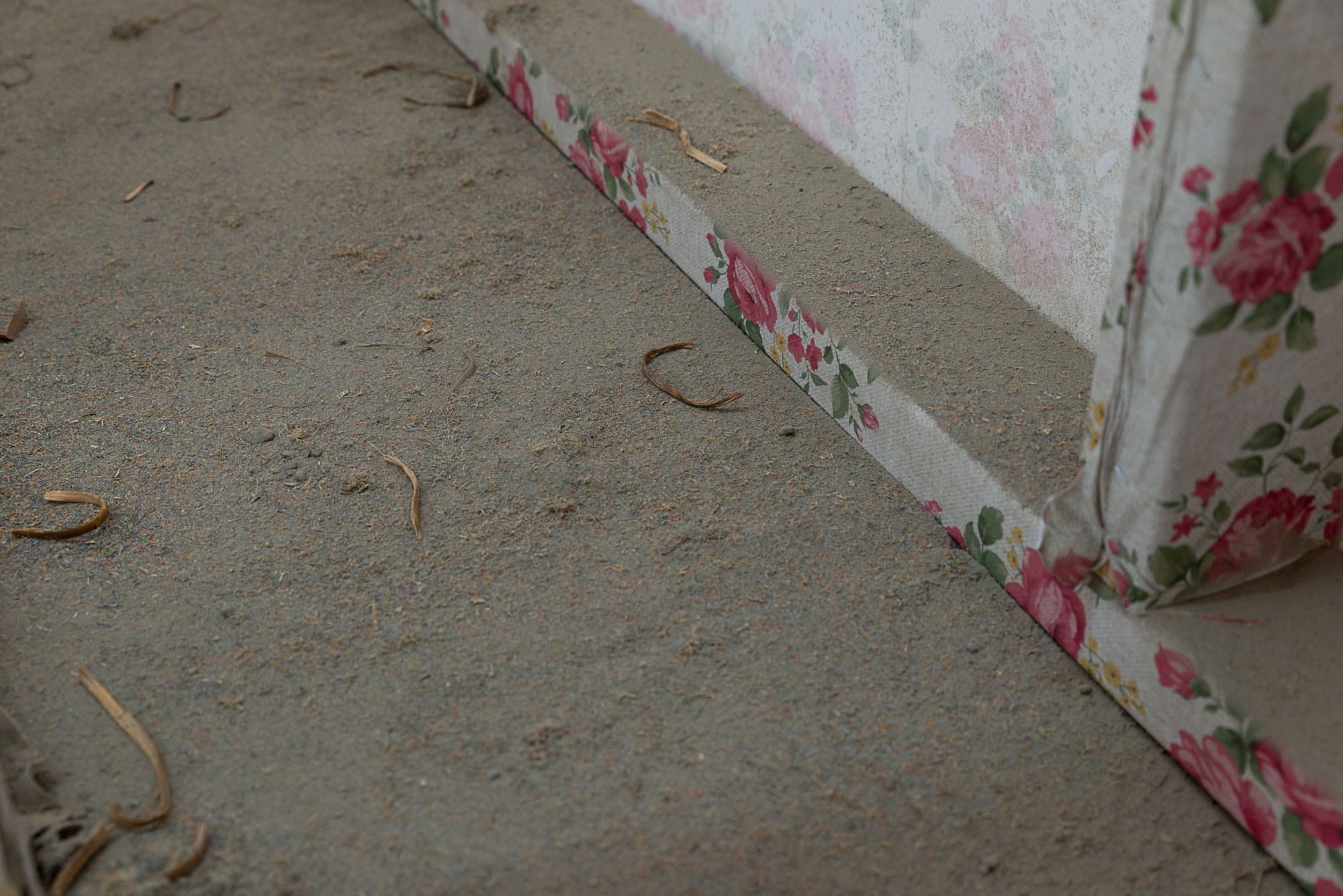The exhibition partially builds from personal fragments, such as photographs of flooded landscapes, hazy conversations and domestic objects that appear almost as peculiar sketches come to life. A sofa that once occupied the family home seems to have developed plant-like qualities, sprouting and searching for nourishment. A long wall creates a passage into the exhibition space where domestic properties blend together; living room, kitchen and a closet. By recontextualising wax covers commonly used for dining tables, they adopt an almost skin-like texture, and together with the holes of the structure, become a makeshift metaphor for a human body. The exhibition operates between rhythmic cohesion and arrhythmic disruption. Many of the elements signify time, referencing to historical moments – yet their temporal coordinates remain obscured, without a date it’s tough to understand if this is the future or the past.
