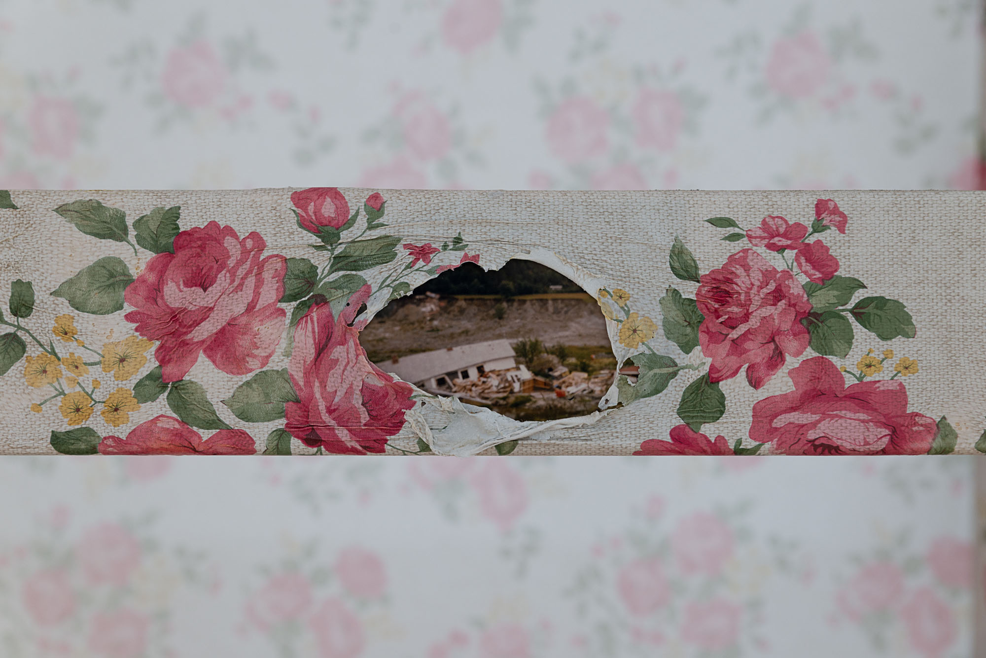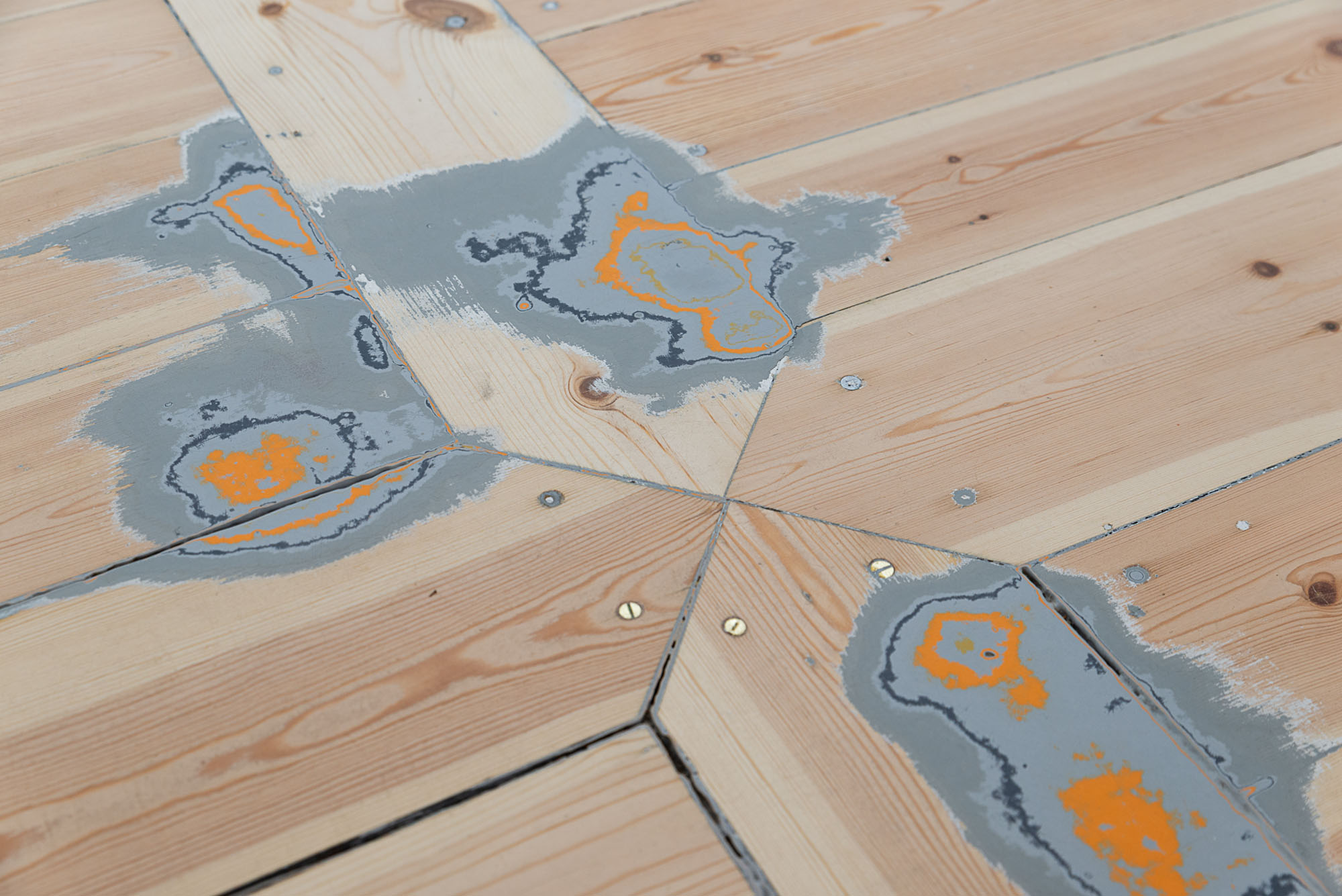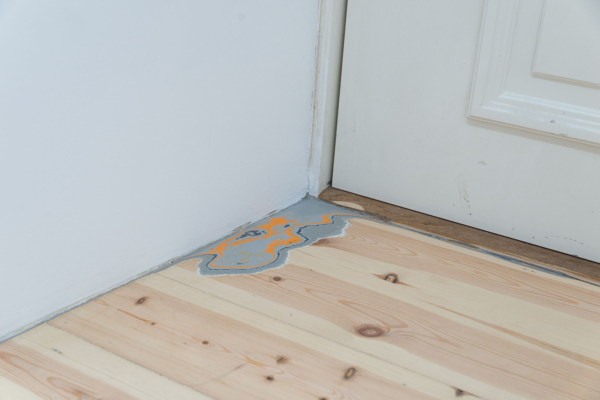 During Ruud’s childhood, his father would bring him along to experience and photograph landscapes altered by extreme weather. Floodwaters and the damage left in their wake became a shared spectacle, imbuing a sense of fear as well as closeness, drawing their attention away from the rhythms of daily life and toward something awe-inspiring. Ruud didn’t know it at the time, but as a child his father had experienced having his home washed away in a flood. The artist’s investigation of memory, disruption and transformation manifests in the exhibition through both the removal of some of the structural layers of the gallery as well as the inclusion of new, unstable structural elements.