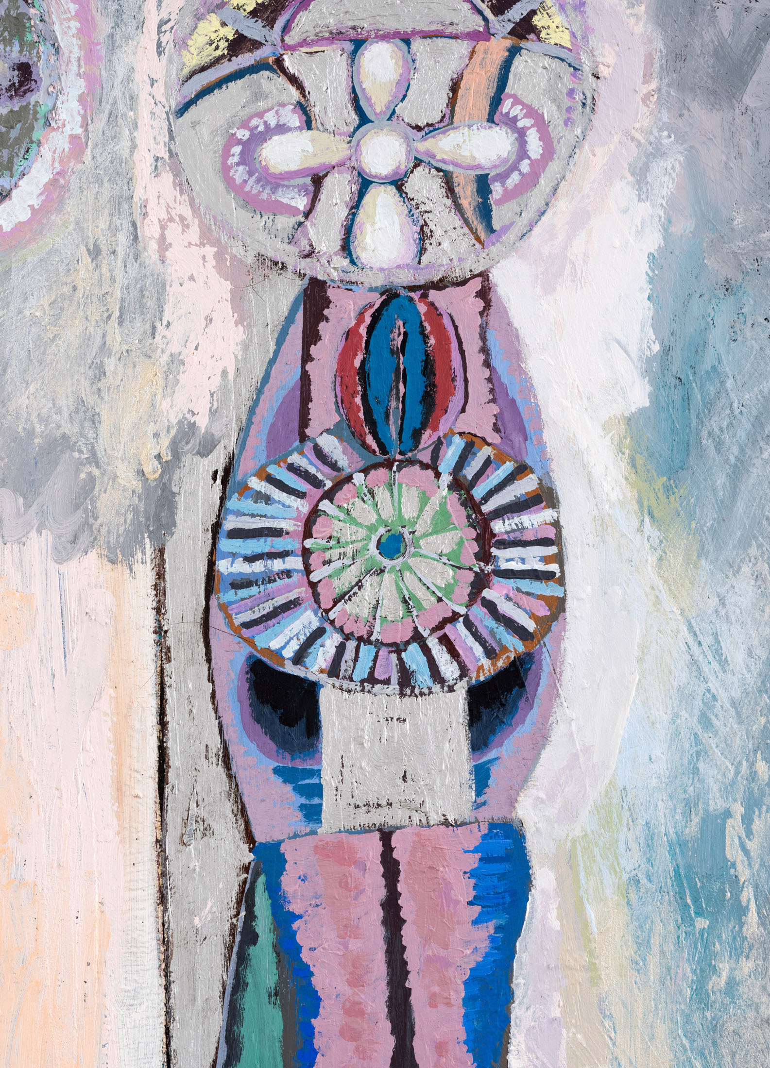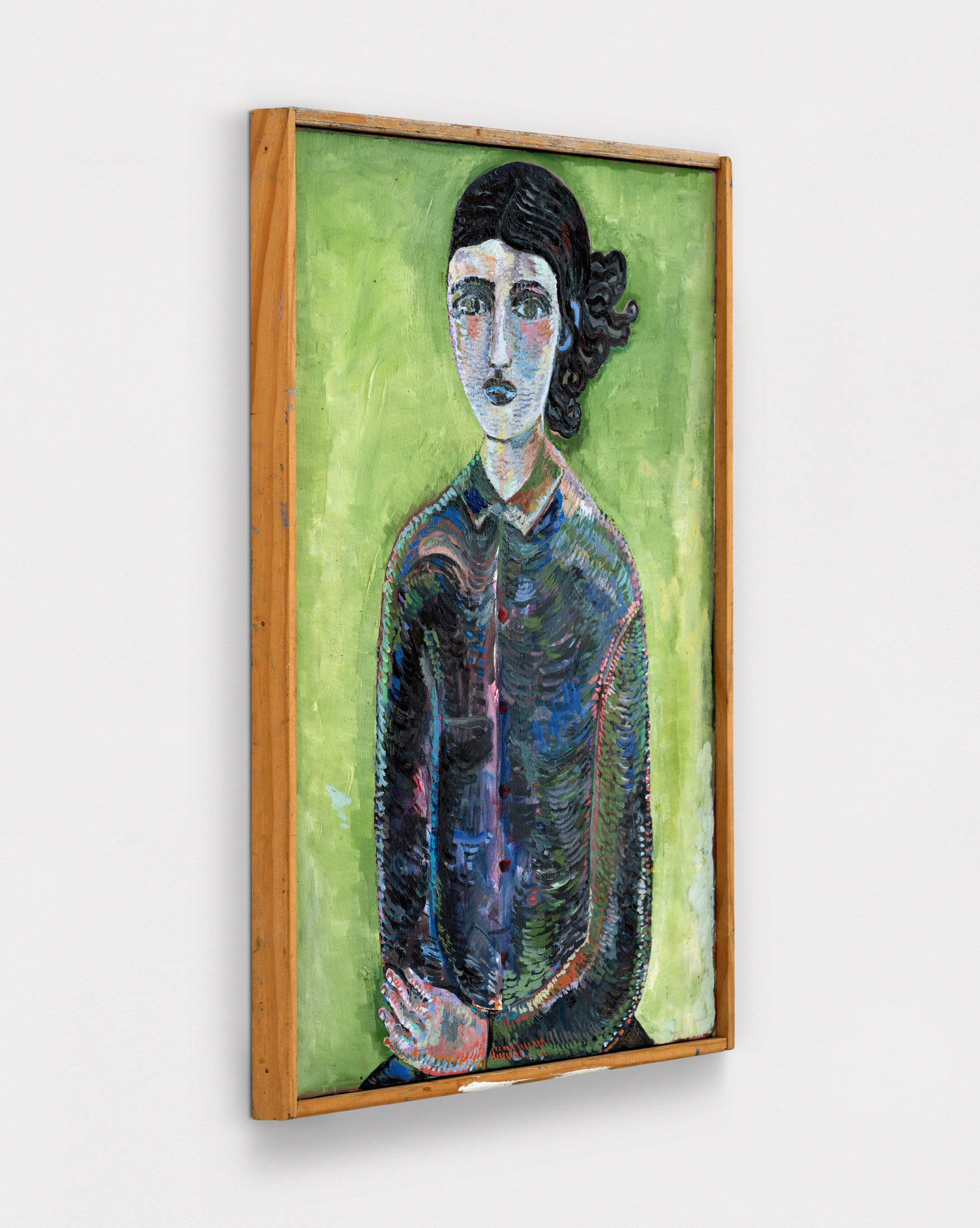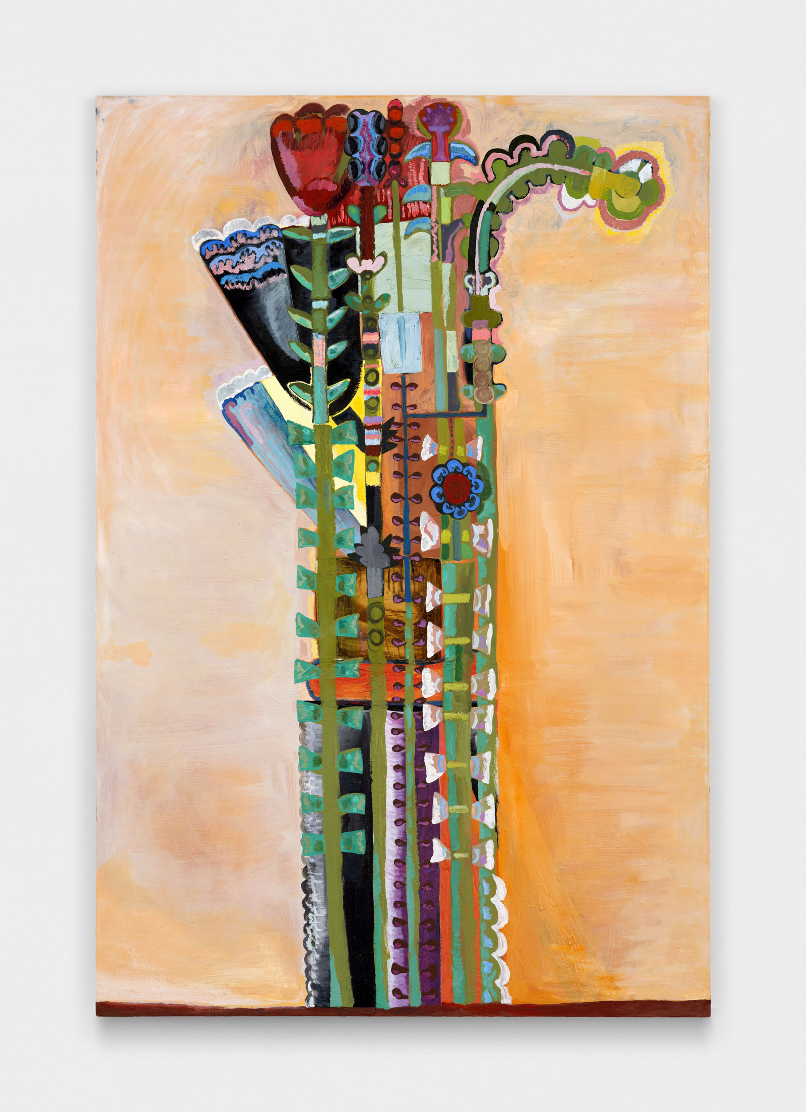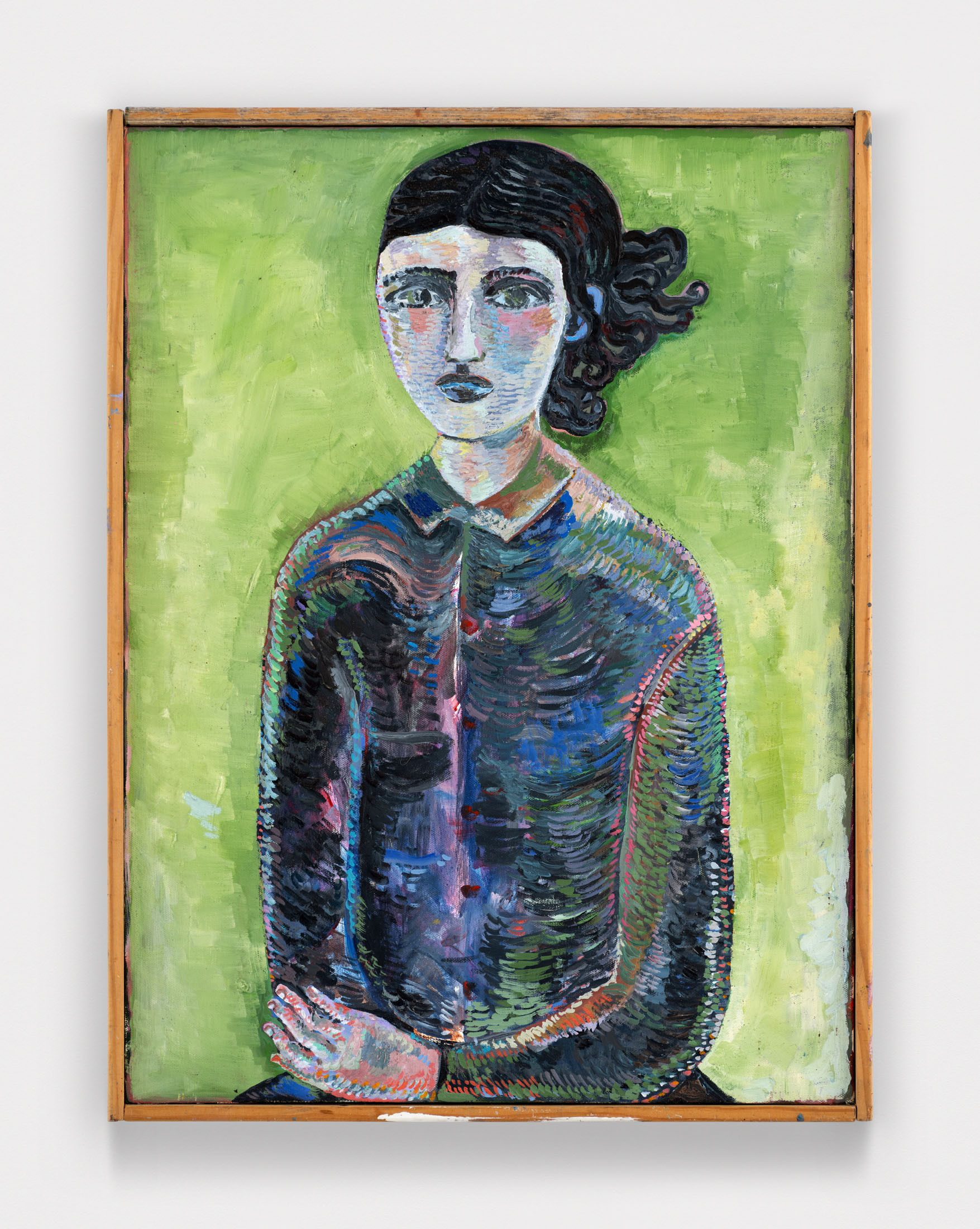 Blue Heart Flower is grounded by a thin strip of burgundy and lodged in a sherbet chamber that seems to thrust its towering central corolla at the viewer. Its volume and dissonant industrial quality result from a kind of circumnavigation, as though each frond is seen from a different angle, then overlayed to create a vertiginous efflorescent amalgamation. Derangements and Daisy both address the tendency for girls’ hair to become unruly, the former depicting a rough and callous grooming, and the latter suggesting an empathic caregiver whose comb is, at least sometimes, left in the box. Daisy’s arm converts her torso into a kind of ouroboros, and the sharp hatchmarks used to give it volume underscore an uphill battle against chaos and neglect. The exhibition’s lone humble artist’s frame hugs the canvas, as if this one work needs a little extra tenderness to land.