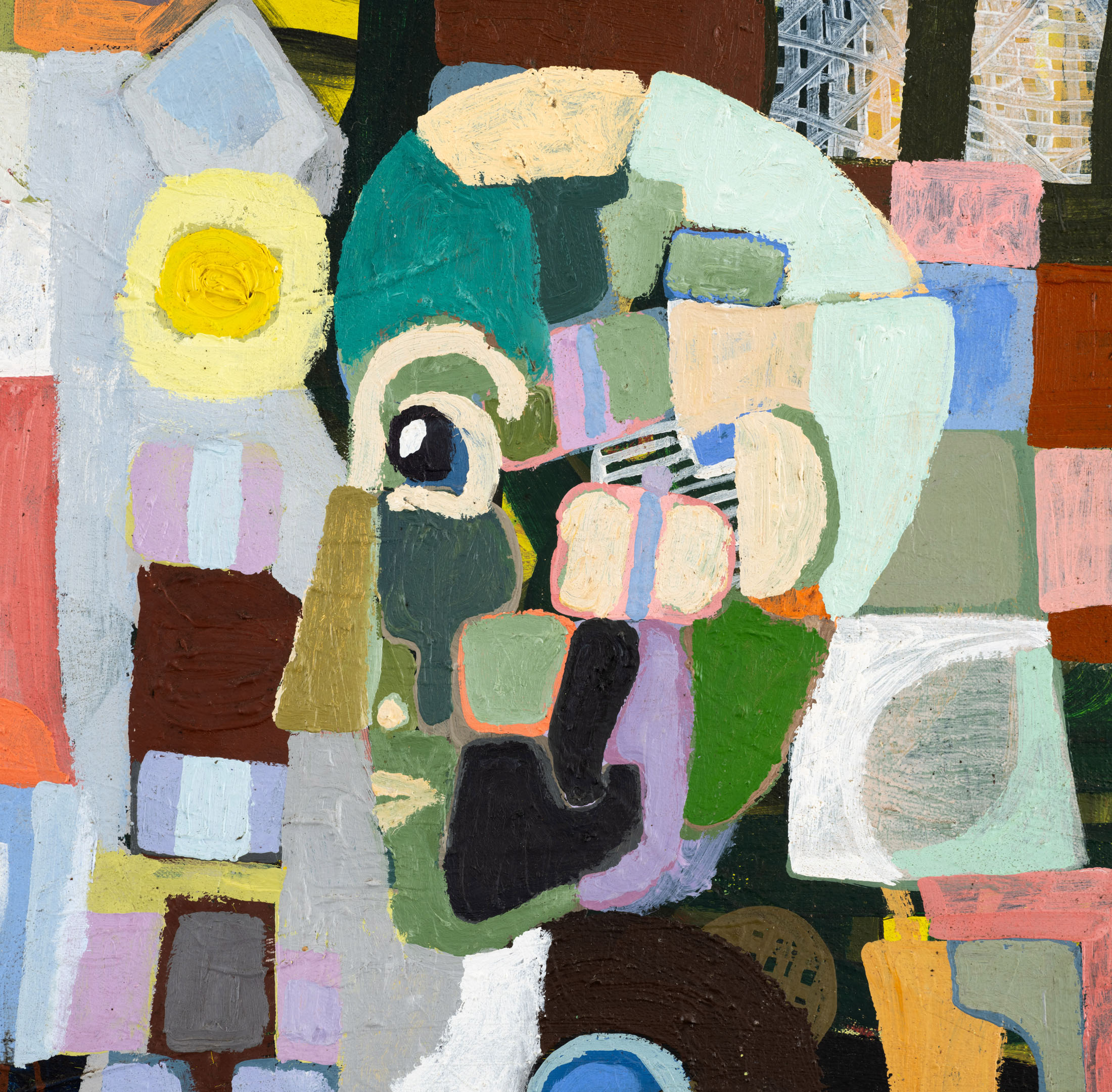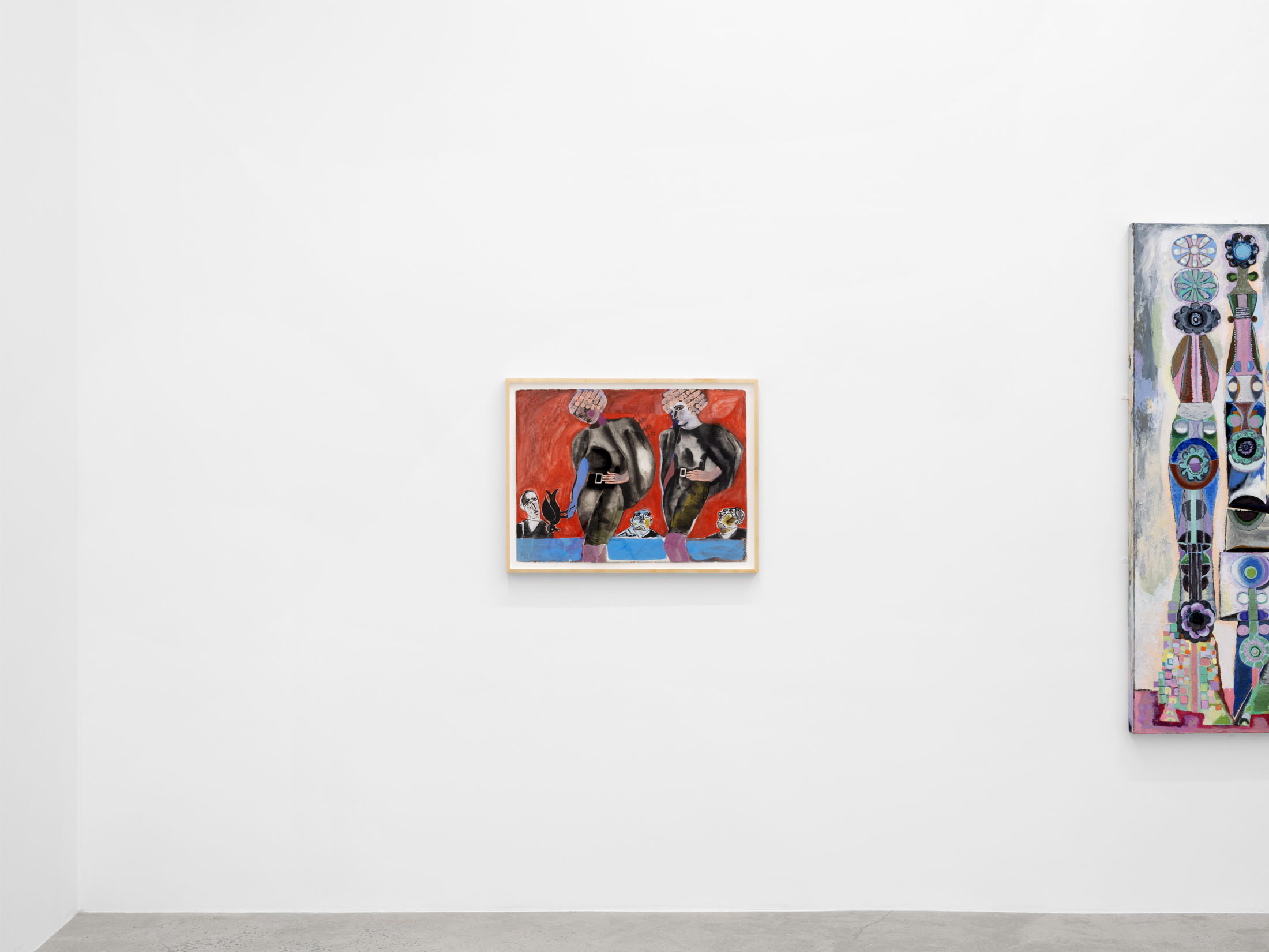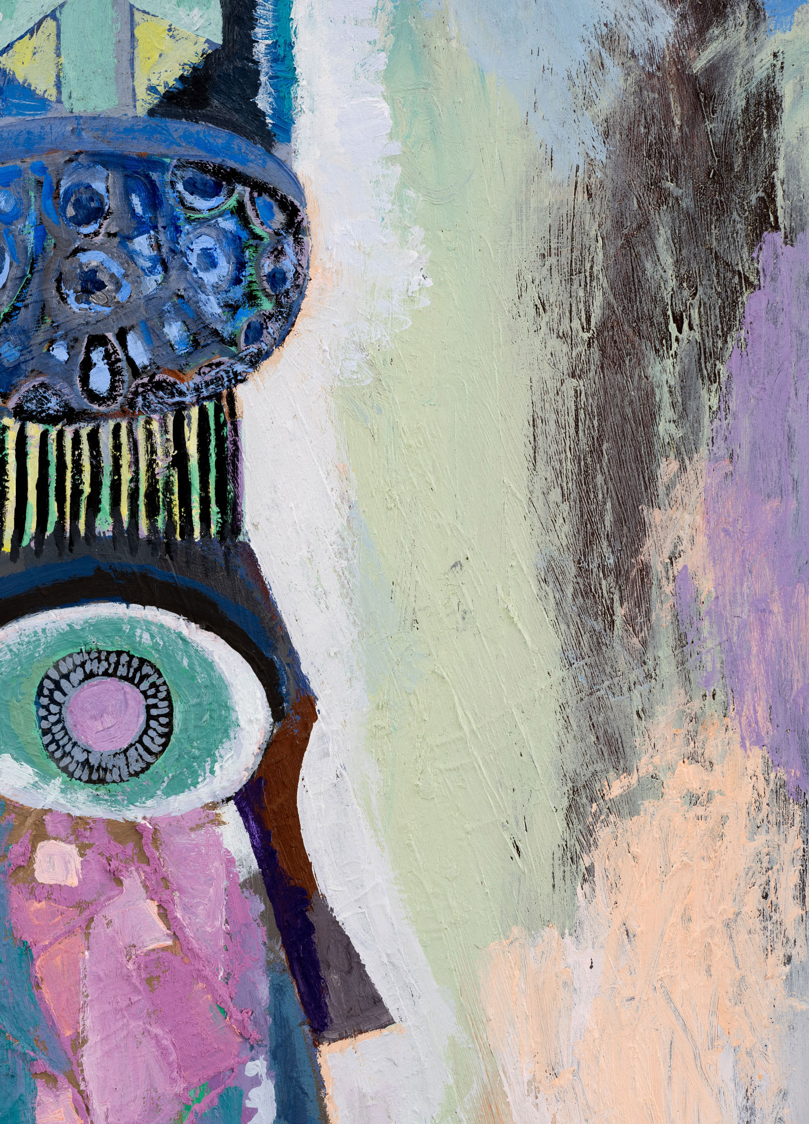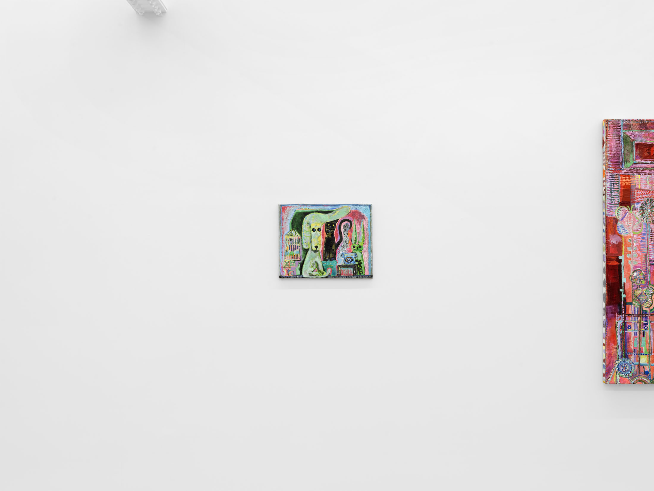 Blue Heart Flower is grounded by a thin strip of burgundy and lodged in a sherbet chamber that seems to thrust its towering central corolla at the viewer. Its volume and dissonant industrial quality result from a kind of circumnavigation, as though each frond is seen from a different angle, then overlayed to create a vertiginous efflorescent amalgamation. Derangements and Daisy both address the tendency for girls’ hair to become unruly, the former depicting a rough and callous grooming, and the latter suggesting an empathic caregiver whose comb is, at least sometimes, left in the box. Daisy’s arm converts her torso into a kind of ouroboros, and the sharp hatchmarks used to give it volume underscore an uphill battle against chaos and neglect. The exhibition’s lone humble artist’s frame hugs the canvas, as if this one work needs a little extra tenderness to land.