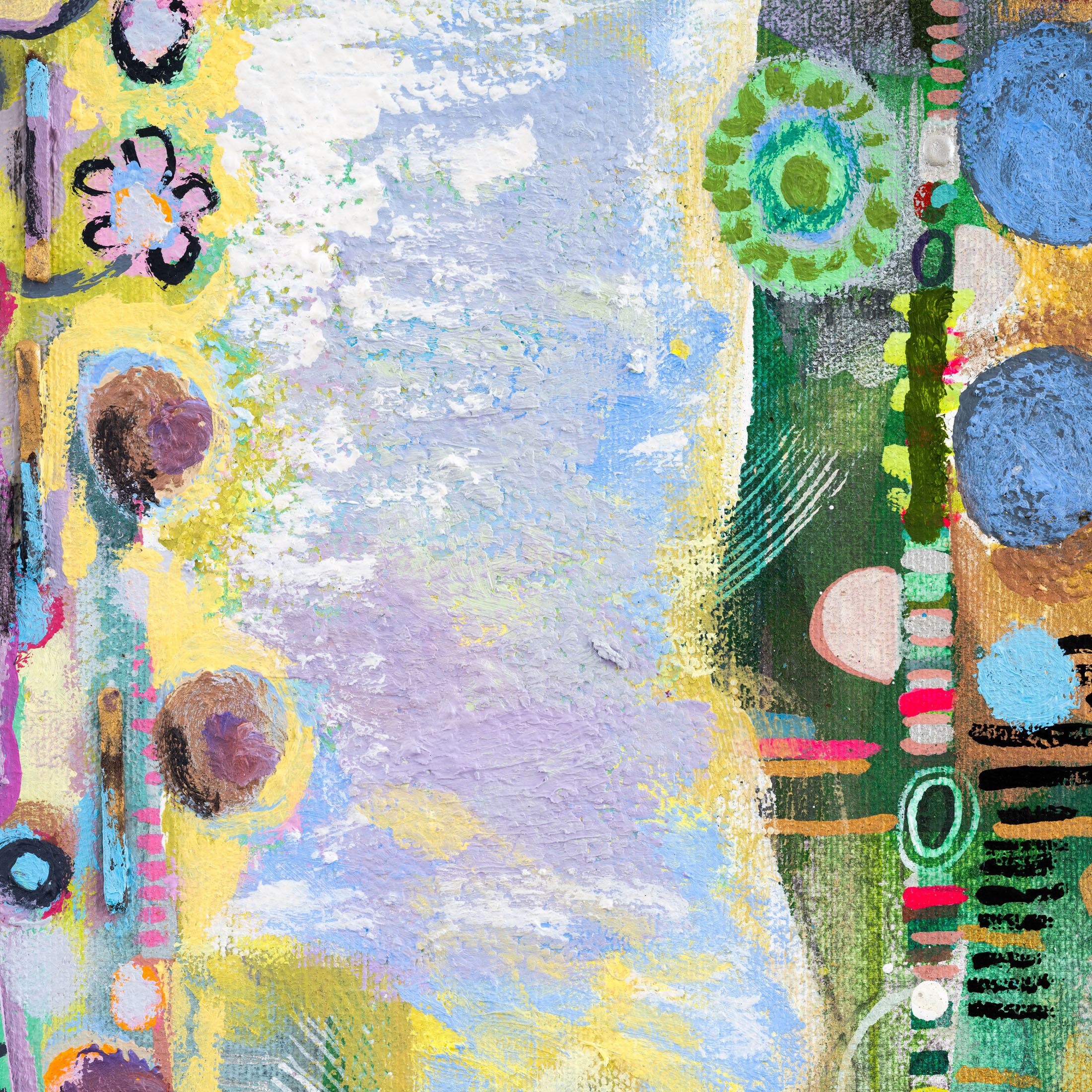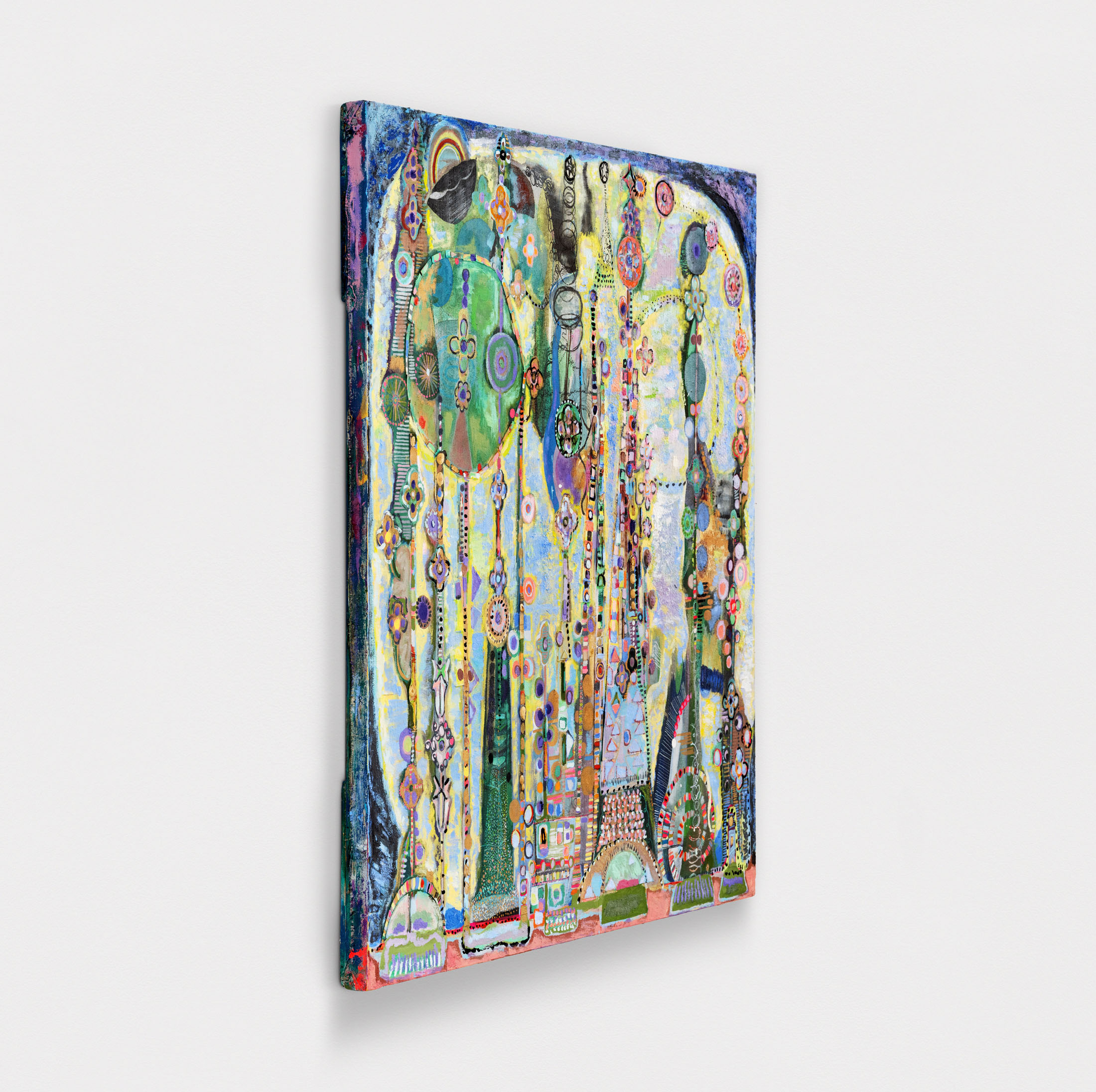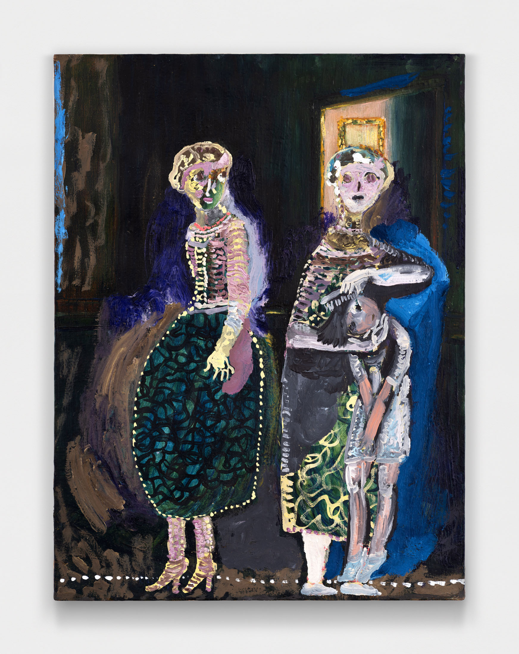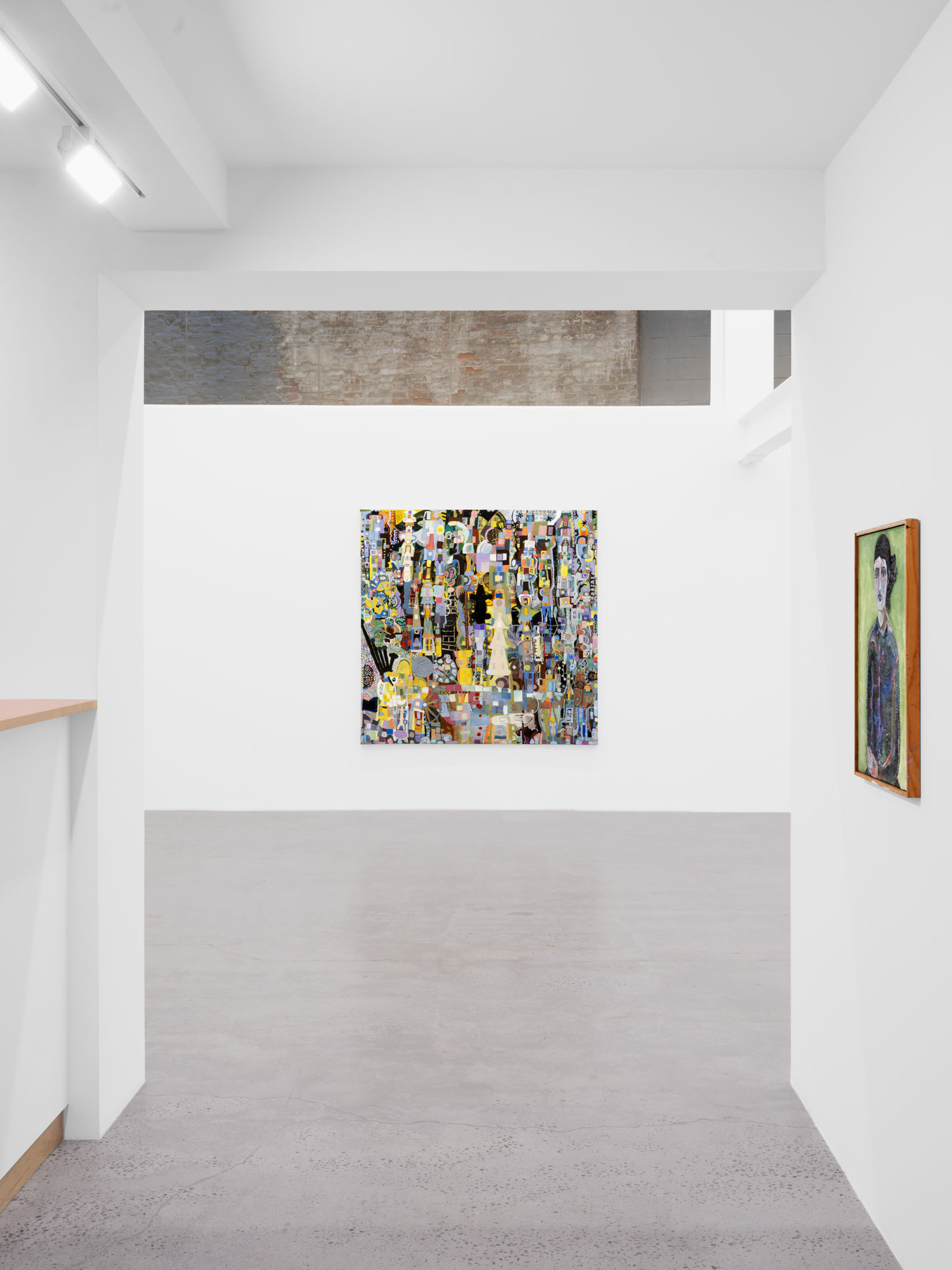 Blue Heart Flower is grounded by a thin strip of burgundy and lodged in a sherbet chamber that seems to thrust its towering central corolla at the viewer. Its volume and dissonant industrial quality result from a kind of circumnavigation, as though each frond is seen from a different angle, then overlayed to create a vertiginous efflorescent amalgamation. Derangements and Daisy both address the tendency for girls’ hair to become unruly, the former depicting a rough and callous grooming, and the latter suggesting an empathic caregiver whose comb is, at least sometimes, left in the box. Daisy’s arm converts her torso into a kind of ouroboros, and the sharp hatchmarks used to give it volume underscore an uphill battle against chaos and neglect. The exhibition’s lone humble artist’s frame hugs the canvas, as if this one work needs a little extra tenderness to land.