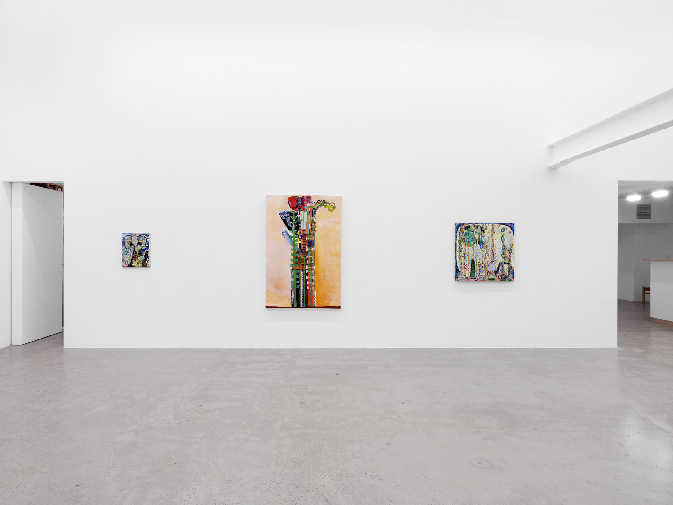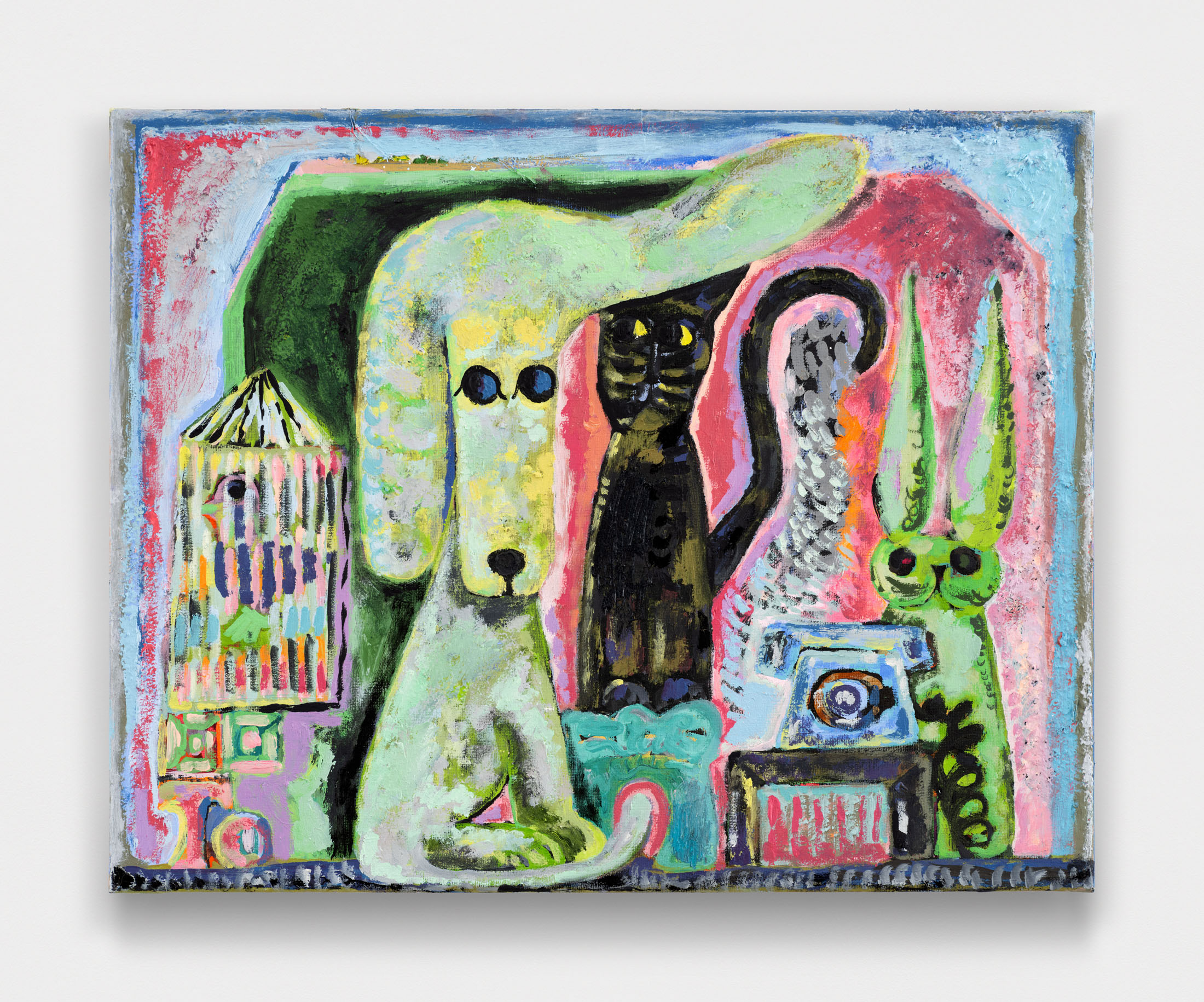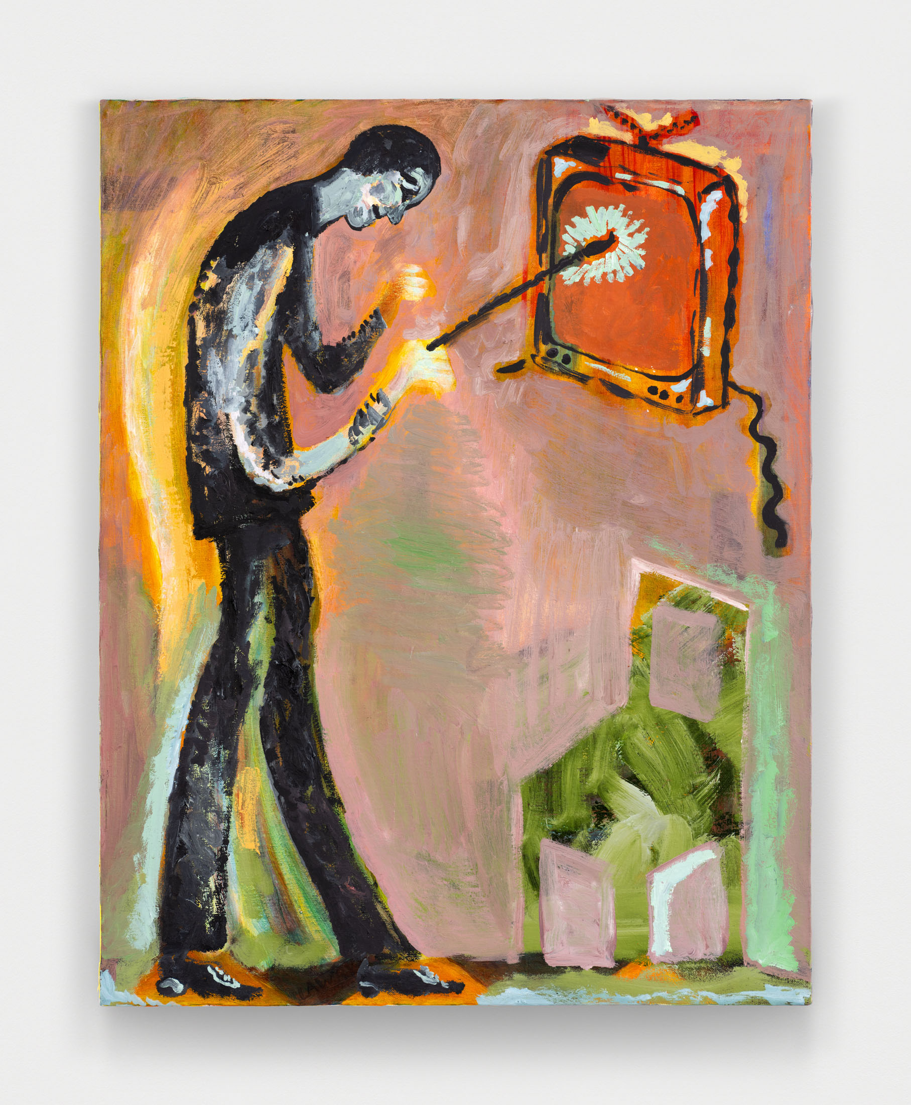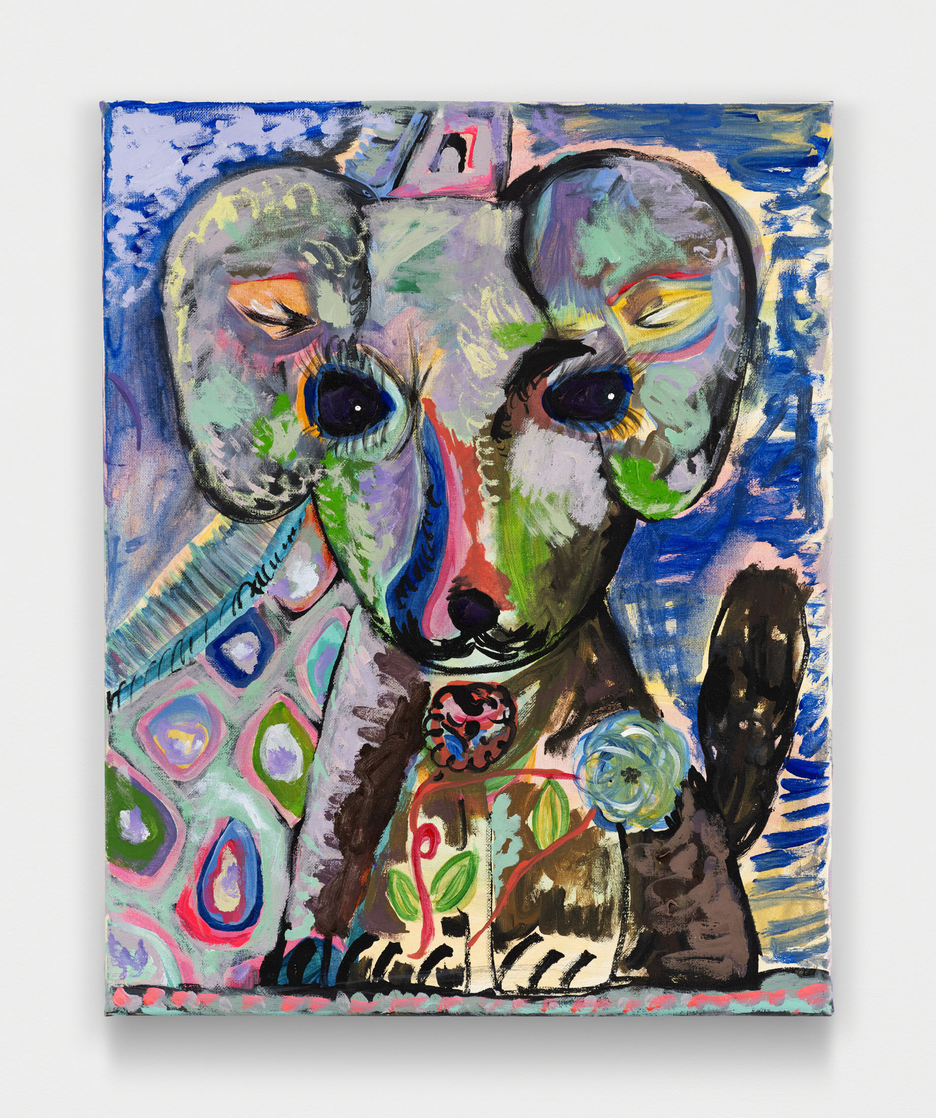 Two of Barbour’s early life memories might inform our understanding of works like Electrically Charged Super Spaniel and Donald C. Barbour. One is an exercise from kindergarten, in which her teacher would scribble on a sheet of paper and pass it to her students to flesh out, and the other is her late father’s obsession with maps of California. These paintings take divergent approaches to addressing a kind of infrastructure of the mind—solar flares of understanding, compassion, and memories we trust will be waiting faithfully whenever it is we choose to rummage for them. Time spent with Barbour is rewarded by discoveries; first of a figure lying in the soil, as we all will someday, and later, of text that seems to emerge from him like speech booming in from the afterlife, falling like wet leaves, or flickering on and off like a Hollywood marquee reflected in misty eyes. HELLO, HELLO, HELLO, HELLO, HELLO!