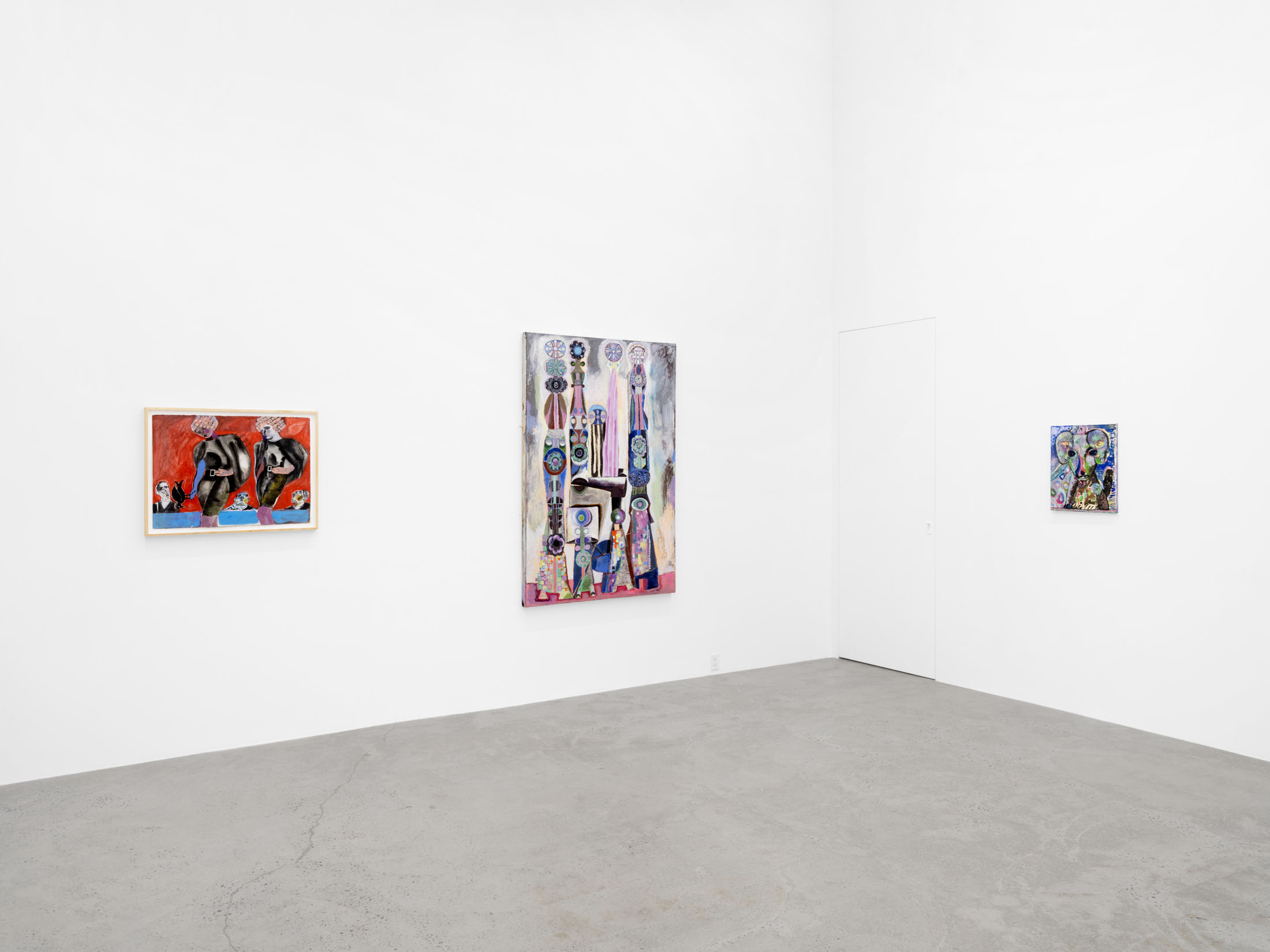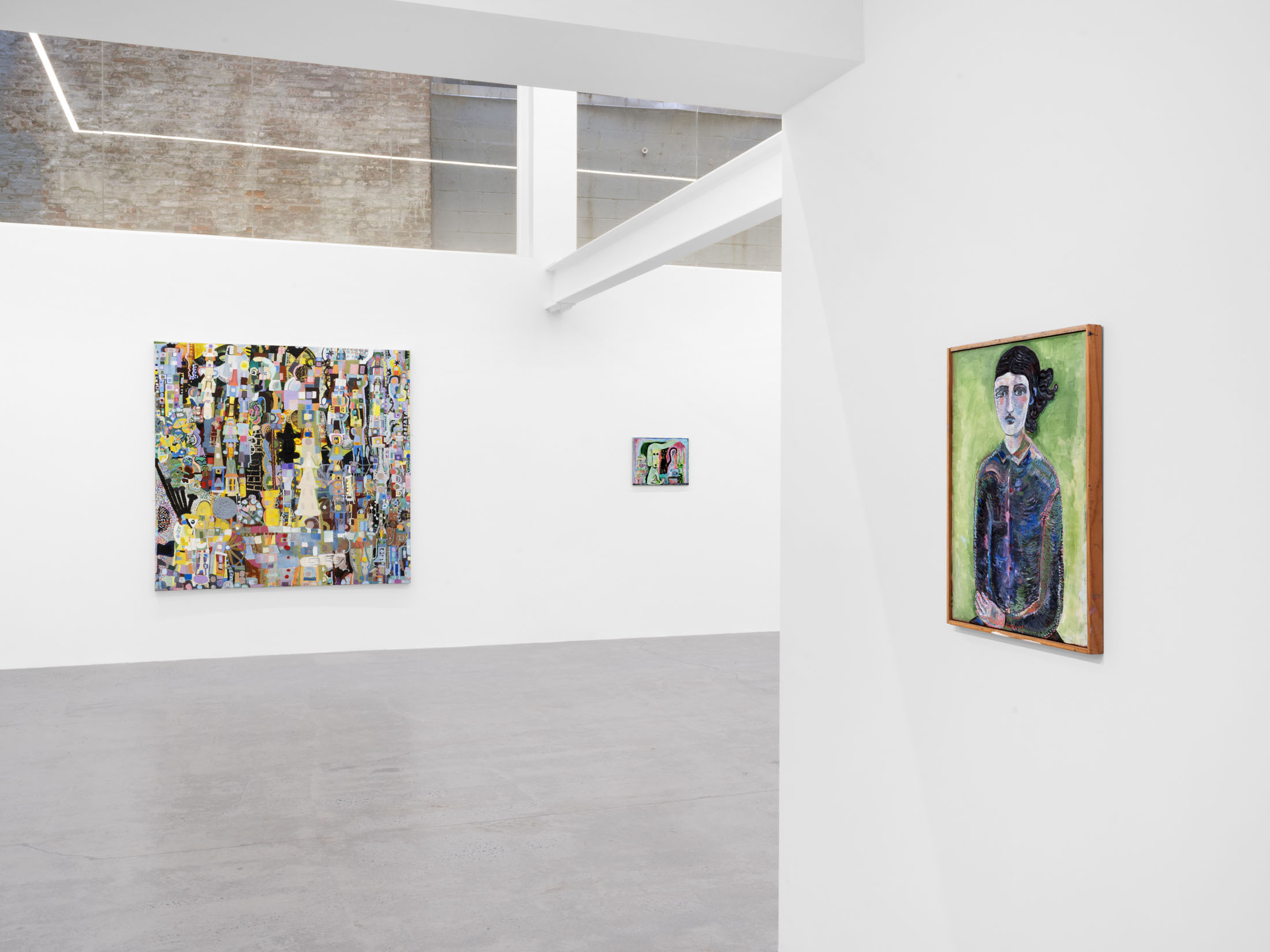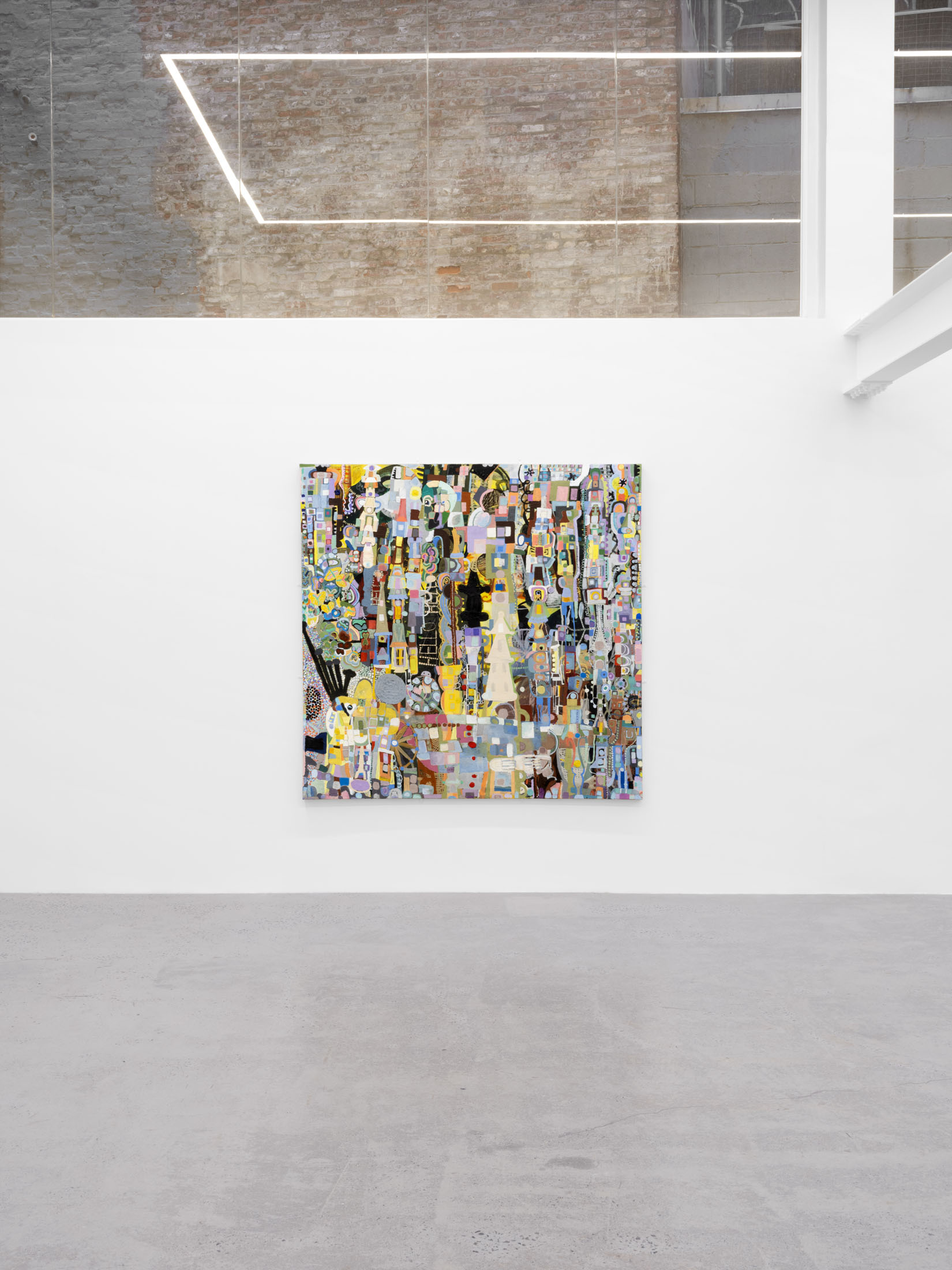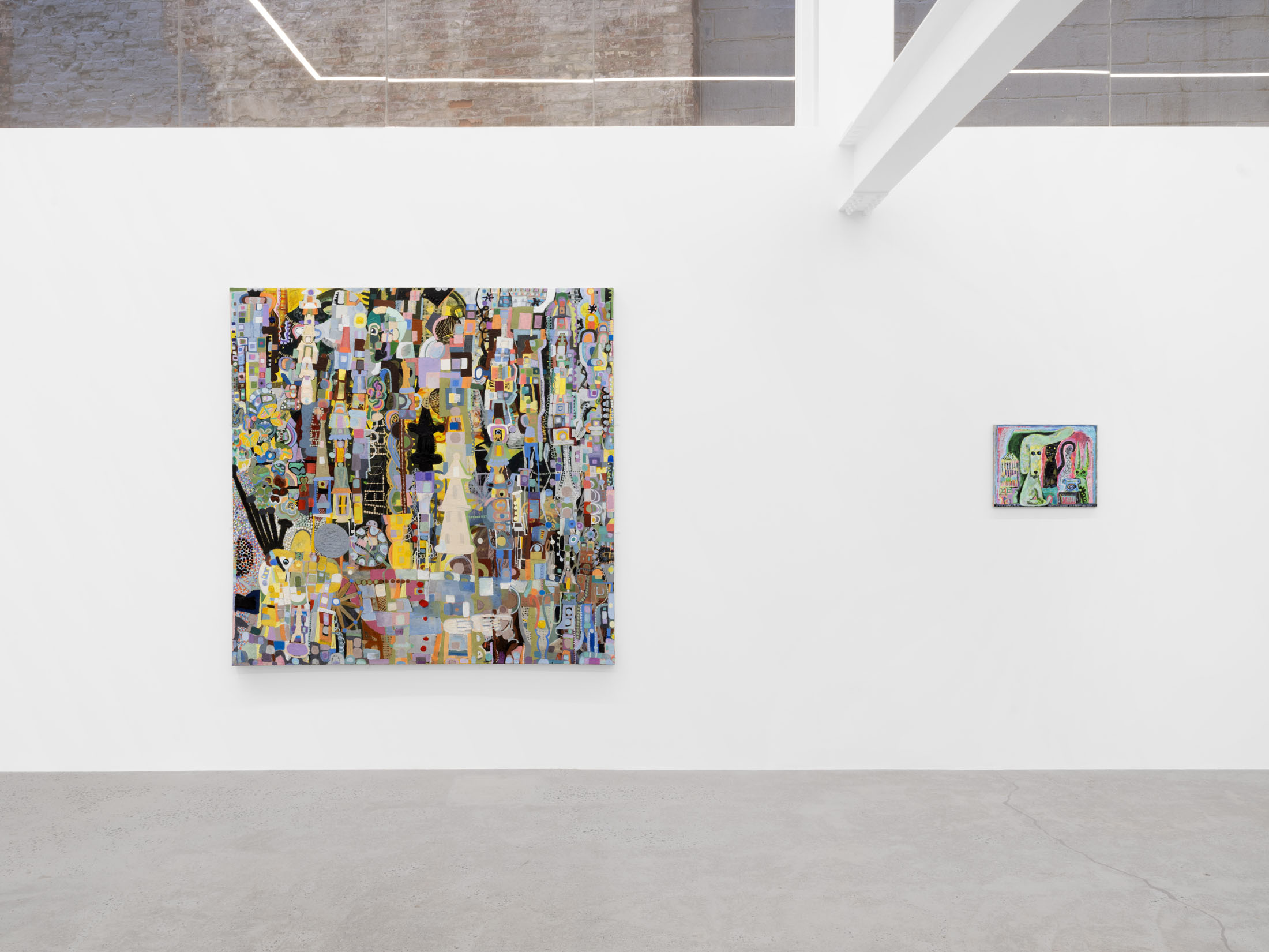 Two of Barbour’s early life memories might inform our understanding of works like Electrically Charged Super Spaniel and Donald C. Barbour. One is an exercise from kindergarten, in which her teacher would scribble on a sheet of paper and pass it to her students to flesh out, and the other is her late father’s obsession with maps of California. These paintings take divergent approaches to addressing a kind of infrastructure of the mind—solar flares of understanding, compassion, and memories we trust will be waiting faithfully whenever it is we choose to rummage for them. Time spent with Barbour is rewarded by discoveries; first of a figure lying in the soil, as we all will someday, and later, of text that seems to emerge from him like speech booming in from the afterlife, falling like wet leaves, or flickering on and off like a Hollywood marquee reflected in misty eyes. HELLO, HELLO, HELLO, HELLO, HELLO!
