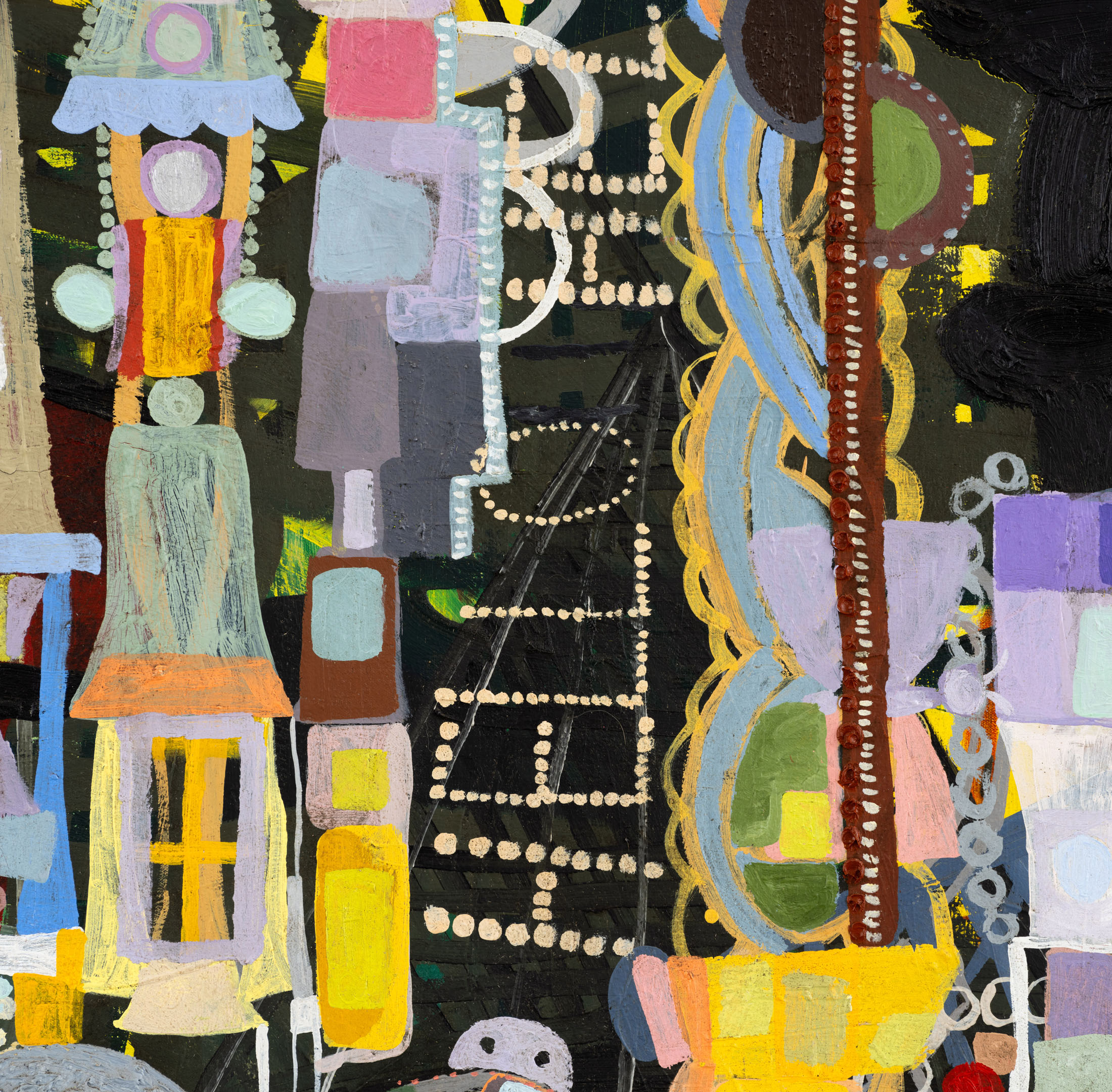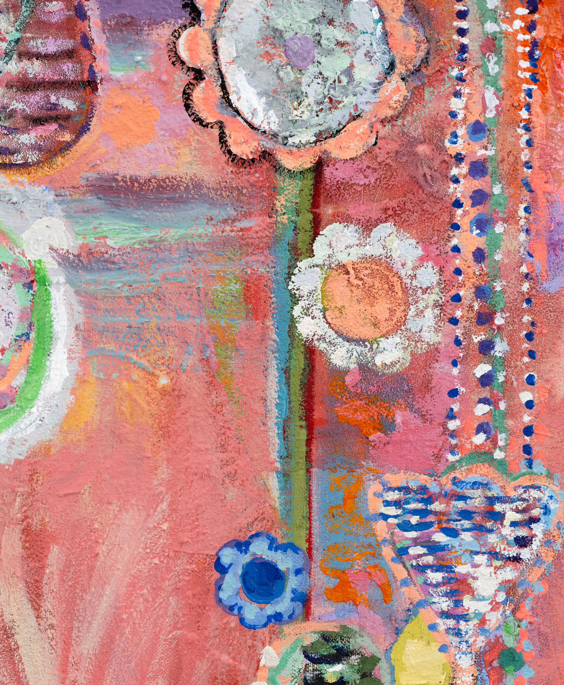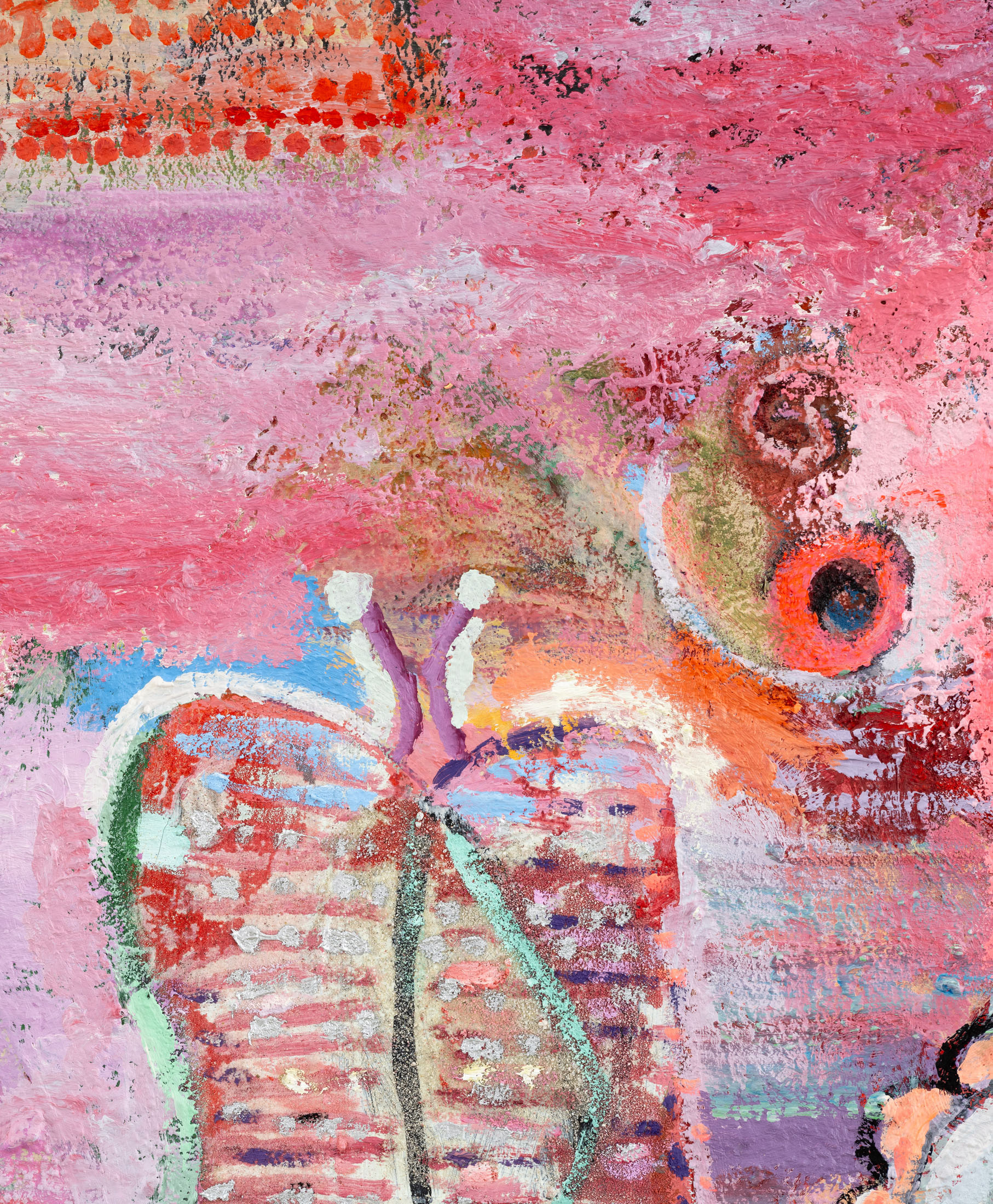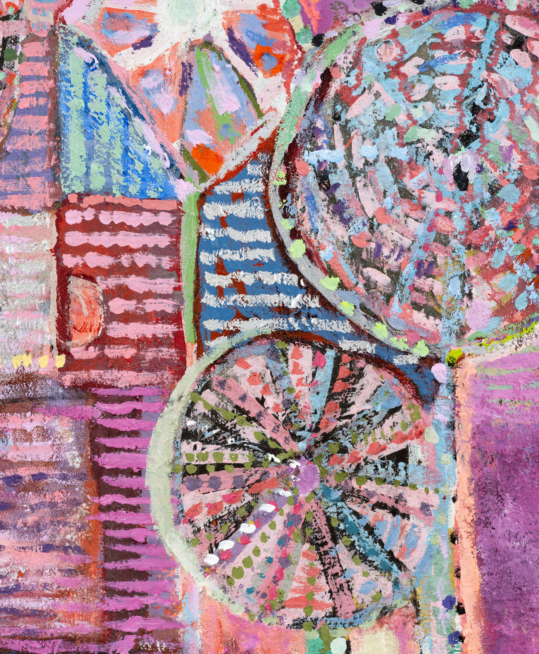 Secrets in the Flower Tower exists where a superabundance of decorative forms meet large swabs of pastel that we encounter as a kind of thoughtful absence—a looming, ramshackle, left-of center comportment. According to Barbour, this painting began as “scaffolding” for the various body parts needed to make a human, and while it still clearly contains limbs, whether or not they add up to a person is, thankfully, not a question the painter seems troubled to answer. It suggests a ragged theater troupe, or band of merry partygoers, overdressed and unaware, standing on shoulders, expectant and haplessly ignorant of the collective absurdity of their countenance. We see them illuminated by porchlight, and we’re really not sure whether or not they should be invited in. Stray Voltage Leaping is a work that offers helpful clues into the successive layers that lend these paintings their remarkable depth and material complexity; a chair is made from the chaos lurking beneath something that might be the spark of inspiration.