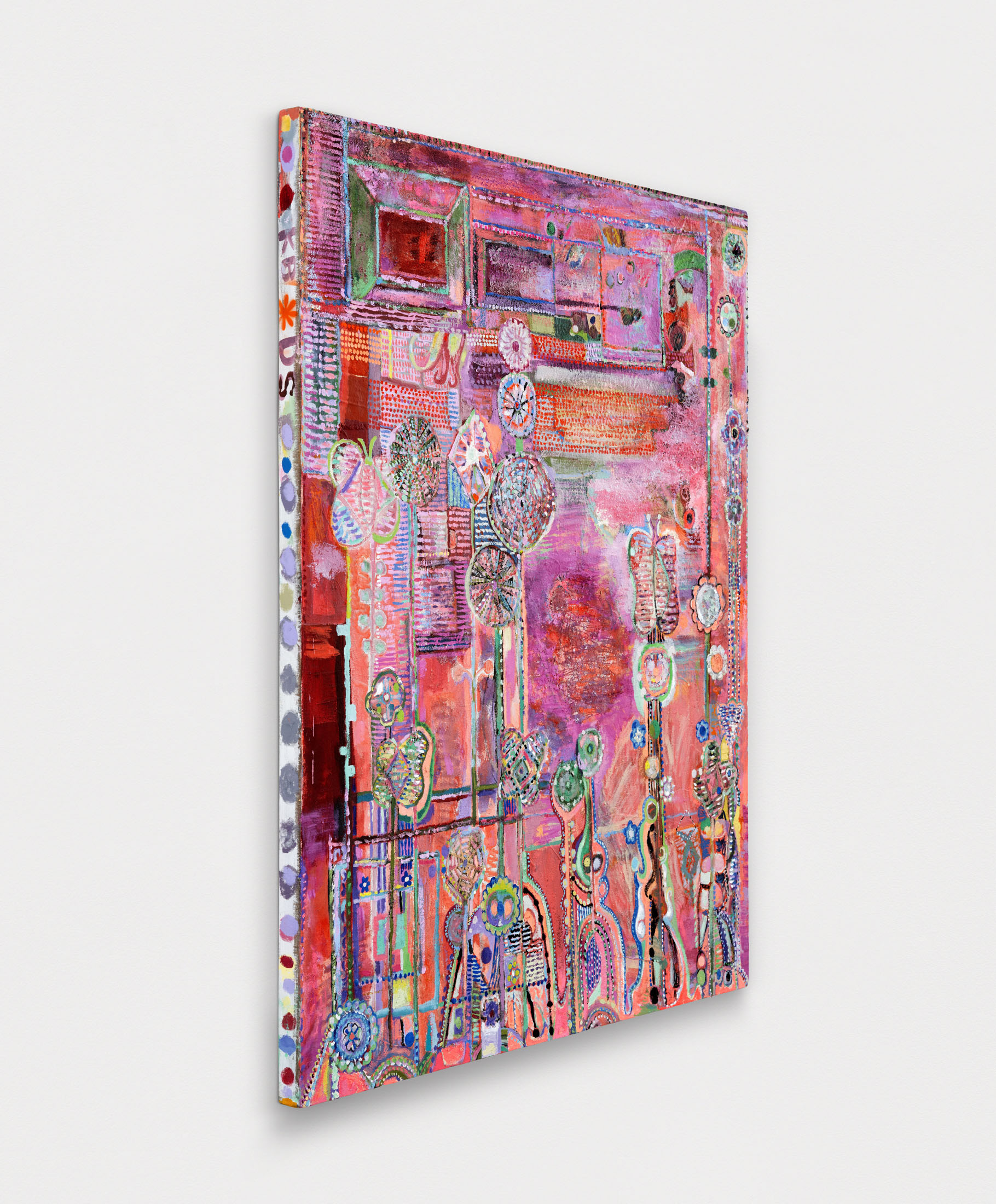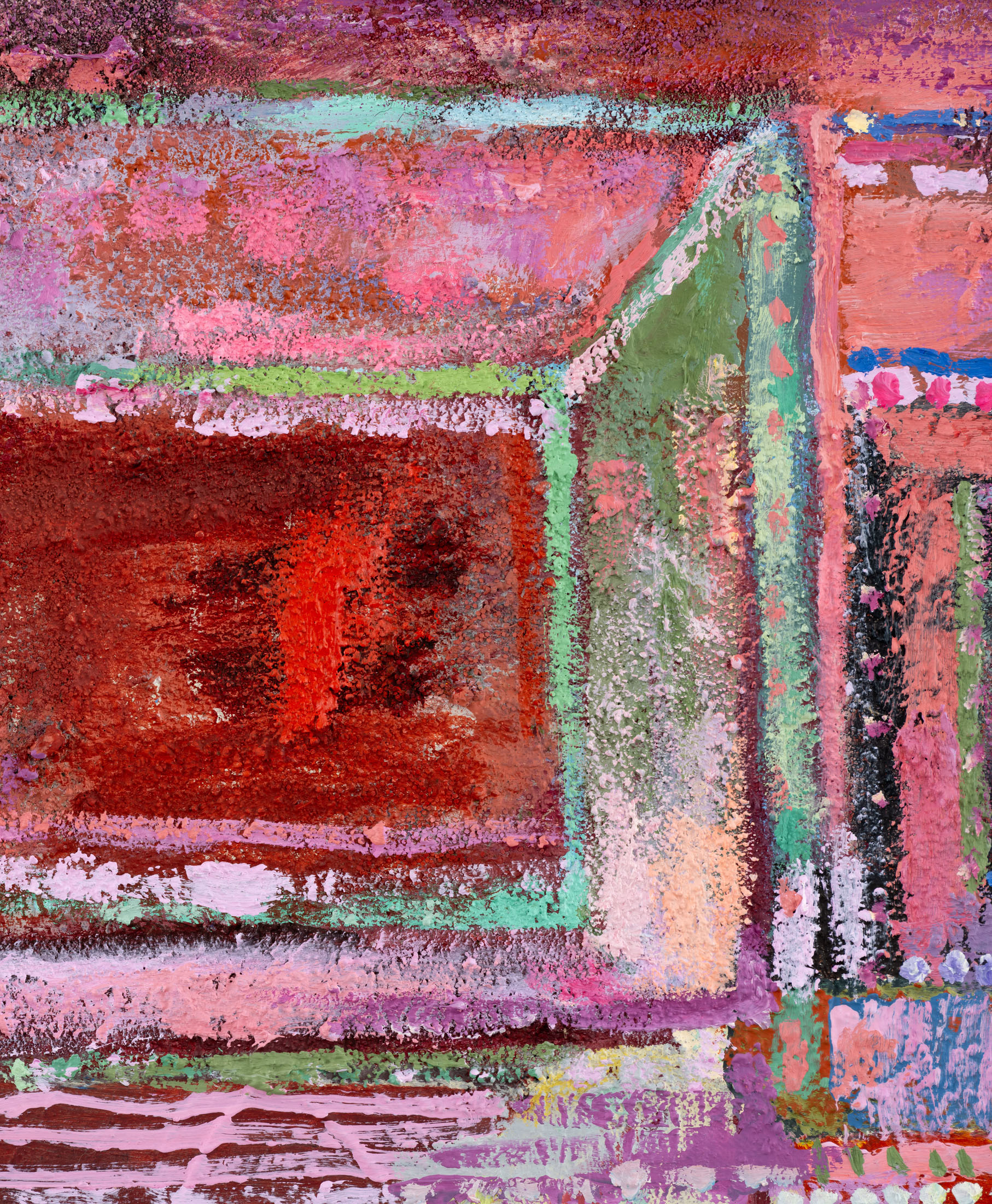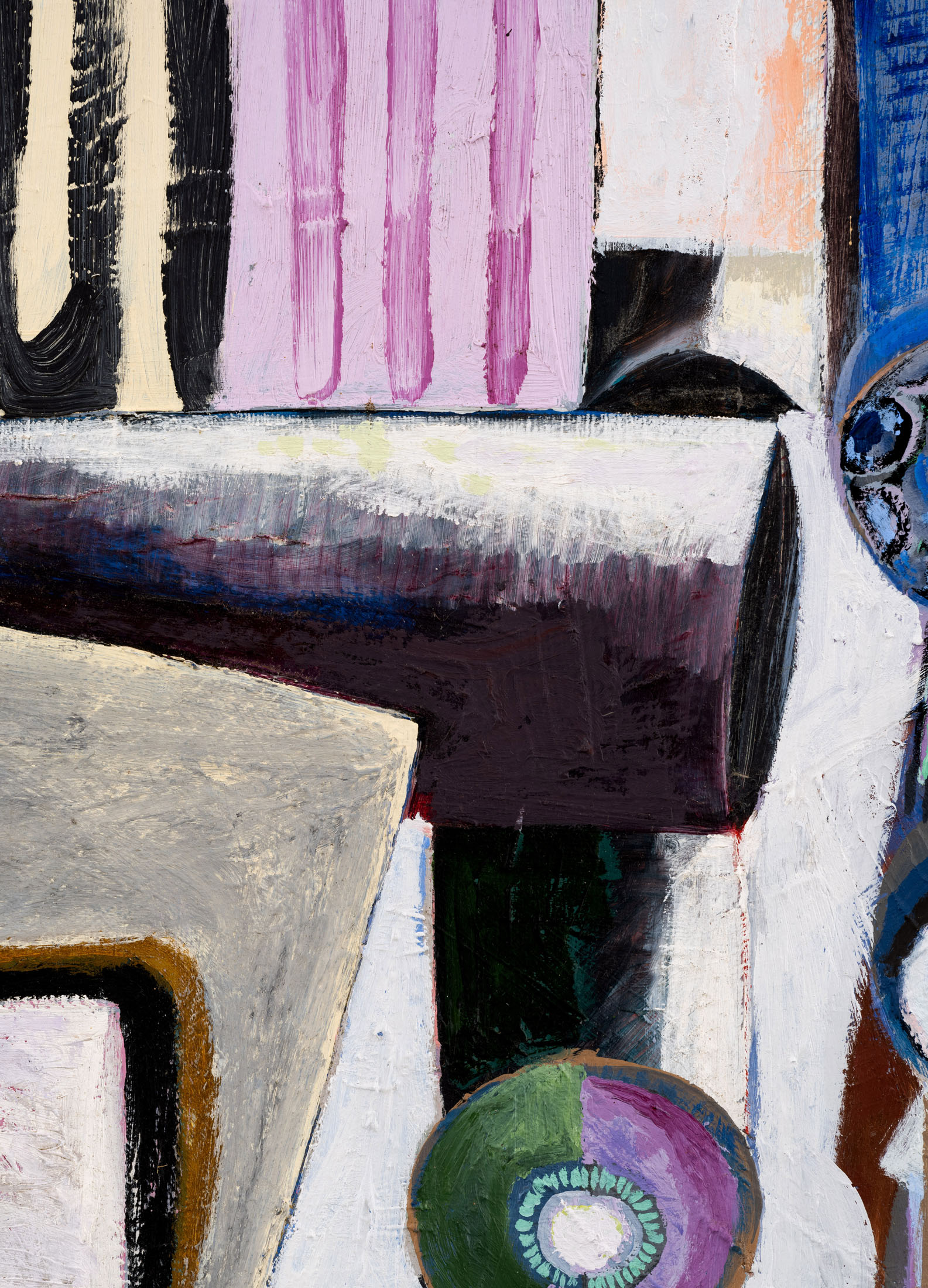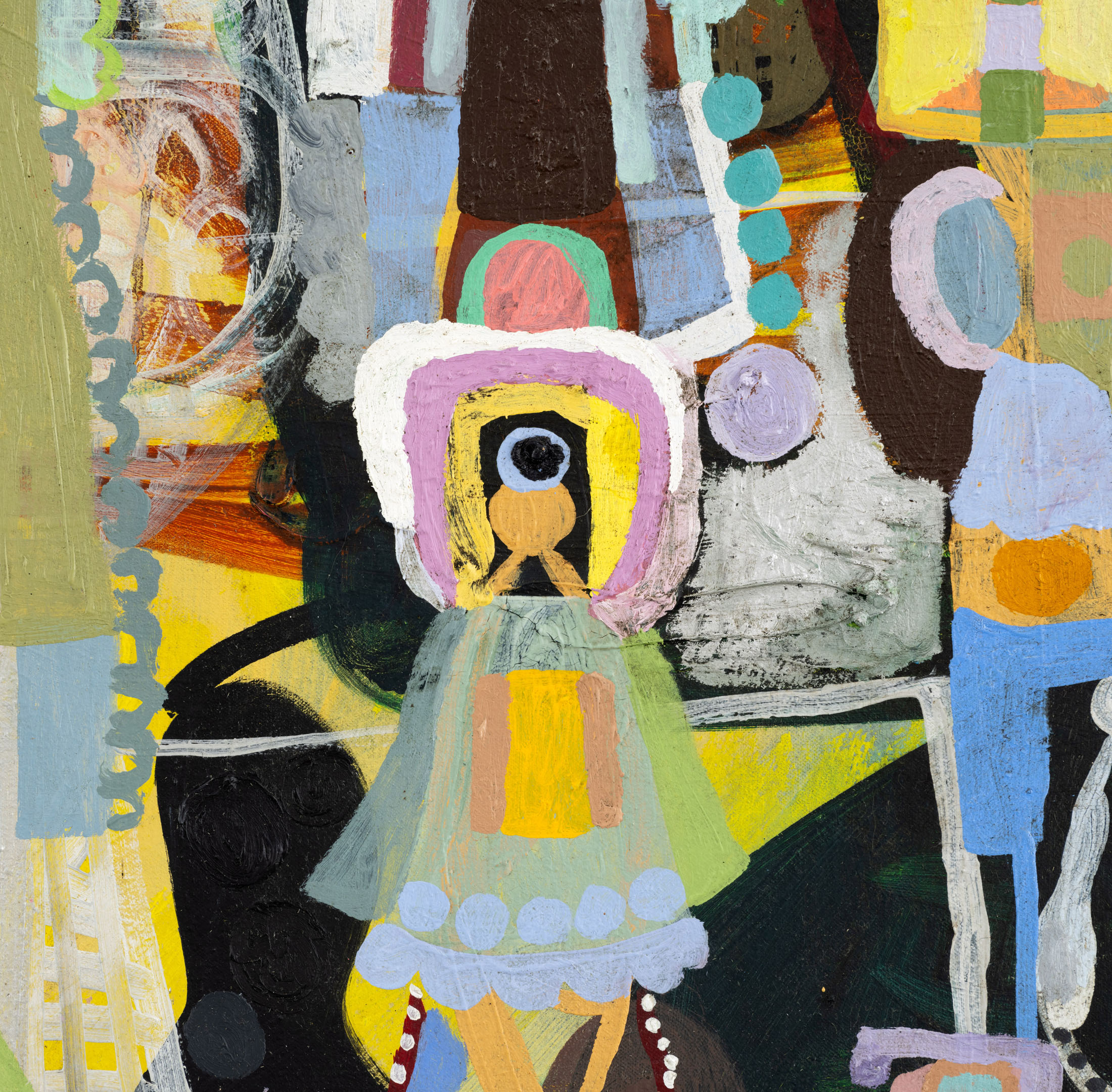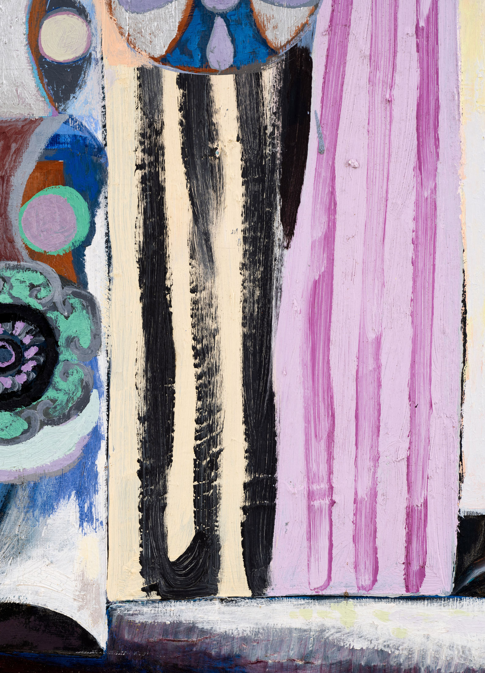 Secrets in the Flower Tower exists where a superabundance of decorative forms meet large swabs of pastel that we encounter as a kind of thoughtful absence—a looming, ramshackle, left-of center comportment. According to Barbour, this painting began as “scaffolding” for the various body parts needed to make a human, and while it still clearly contains limbs, whether or not they add up to a person is, thankfully, not a question the painter seems troubled to answer. It suggests a ragged theater troupe, or band of merry partygoers, overdressed and unaware, standing on shoulders, expectant and haplessly ignorant of the collective absurdity of their countenance. We see them illuminated by porchlight, and we’re really not sure whether or not they should be invited in. Stray Voltage Leaping is a work that offers helpful clues into the successive layers that lend these paintings their remarkable depth and material complexity; a chair is made from the chaos lurking beneath something that might be the spark of inspiration.