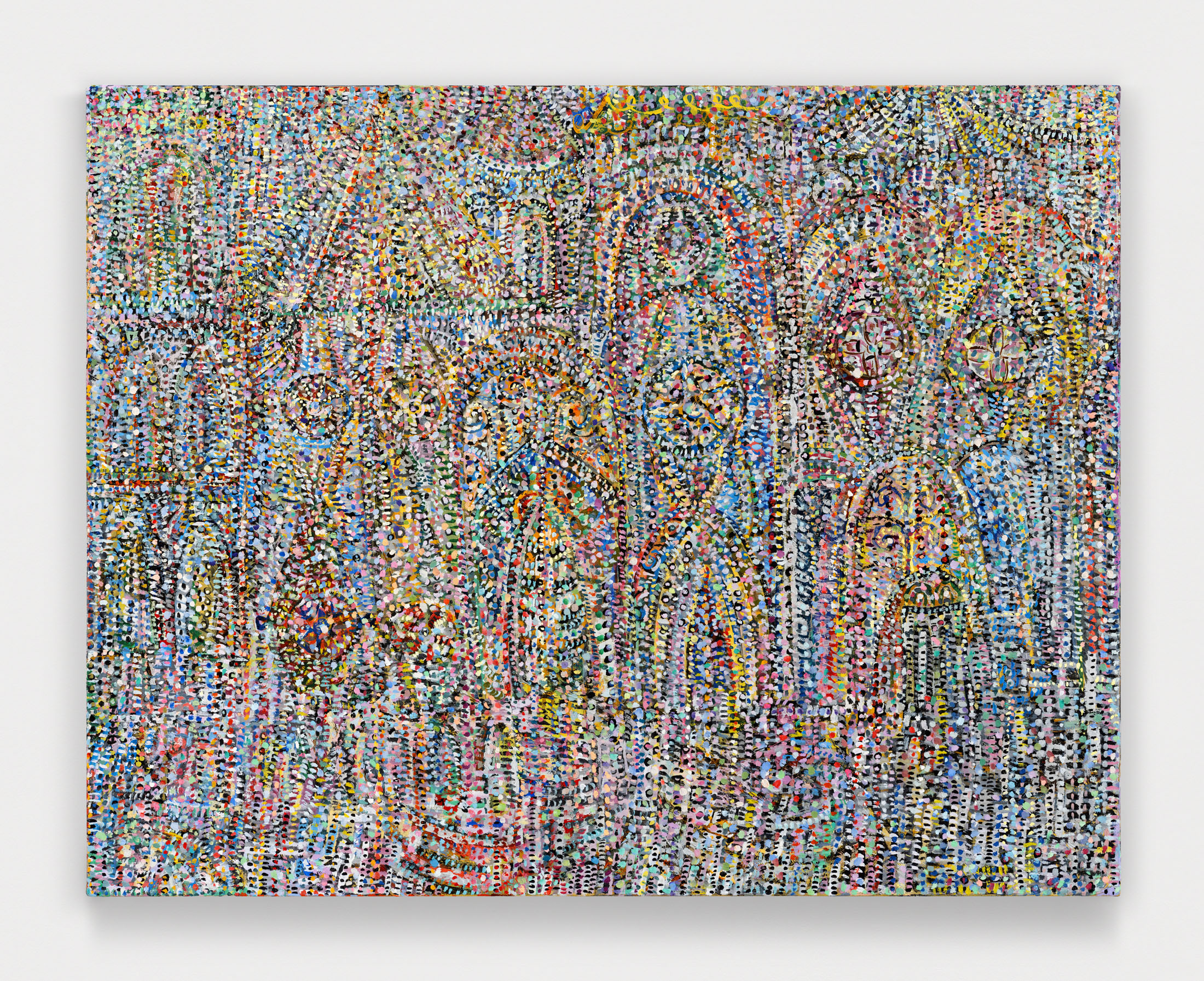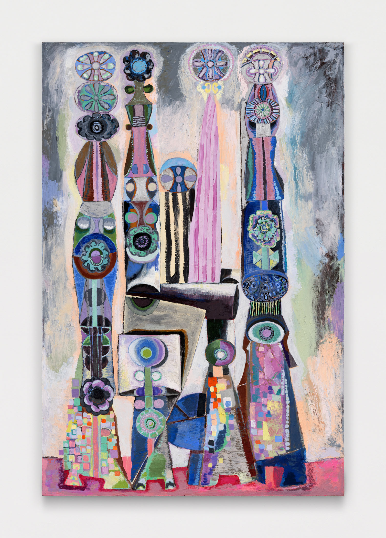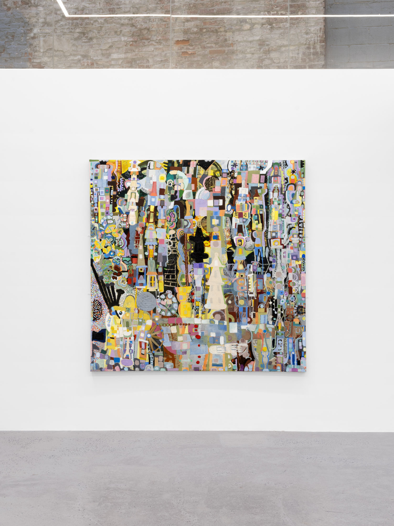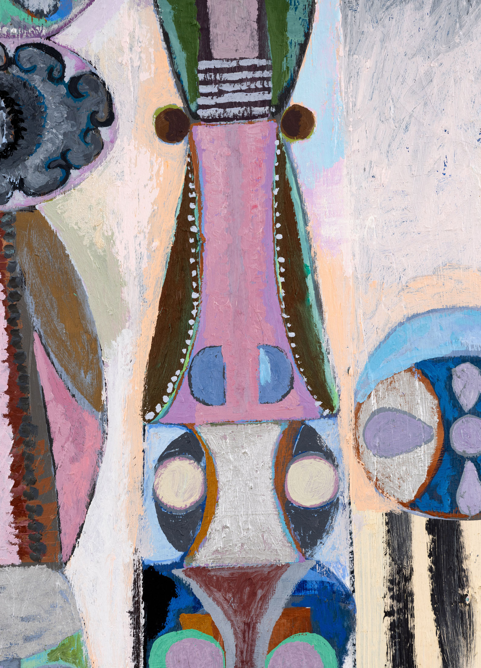 Secrets in the Flower Tower exists where a superabundance of decorative forms meet large swabs of pastel that we encounter as a kind of thoughtful absence—a looming, ramshackle, left-of center comportment. According to Barbour, this painting began as “scaffolding” for the various body parts needed to make a human, and while it still clearly contains limbs, whether or not they add up to a person is, thankfully, not a question the painter seems troubled to answer. It suggests a ragged theater troupe, or band of merry partygoers, overdressed and unaware, standing on shoulders, expectant and haplessly ignorant of the collective absurdity of their countenance. We see them illuminated by porchlight, and we’re really not sure whether or not they should be invited in. Stray Voltage Leaping is a work that offers helpful clues into the successive layers that lend these paintings their remarkable depth and material complexity; a chair is made from the chaos lurking beneath something that might be the spark of inspiration.