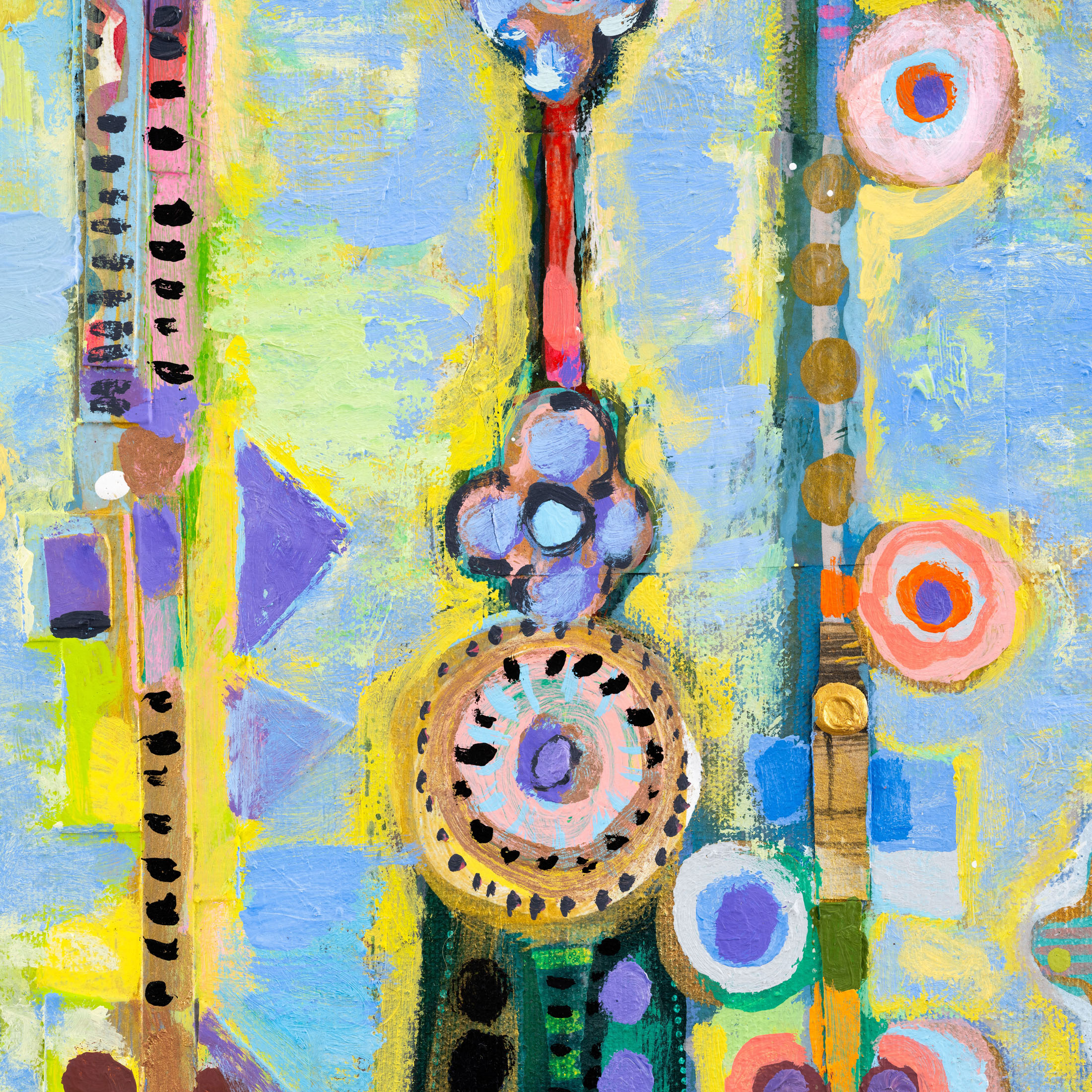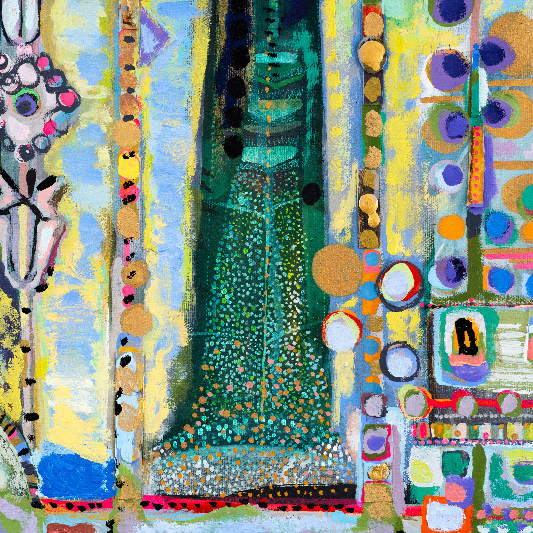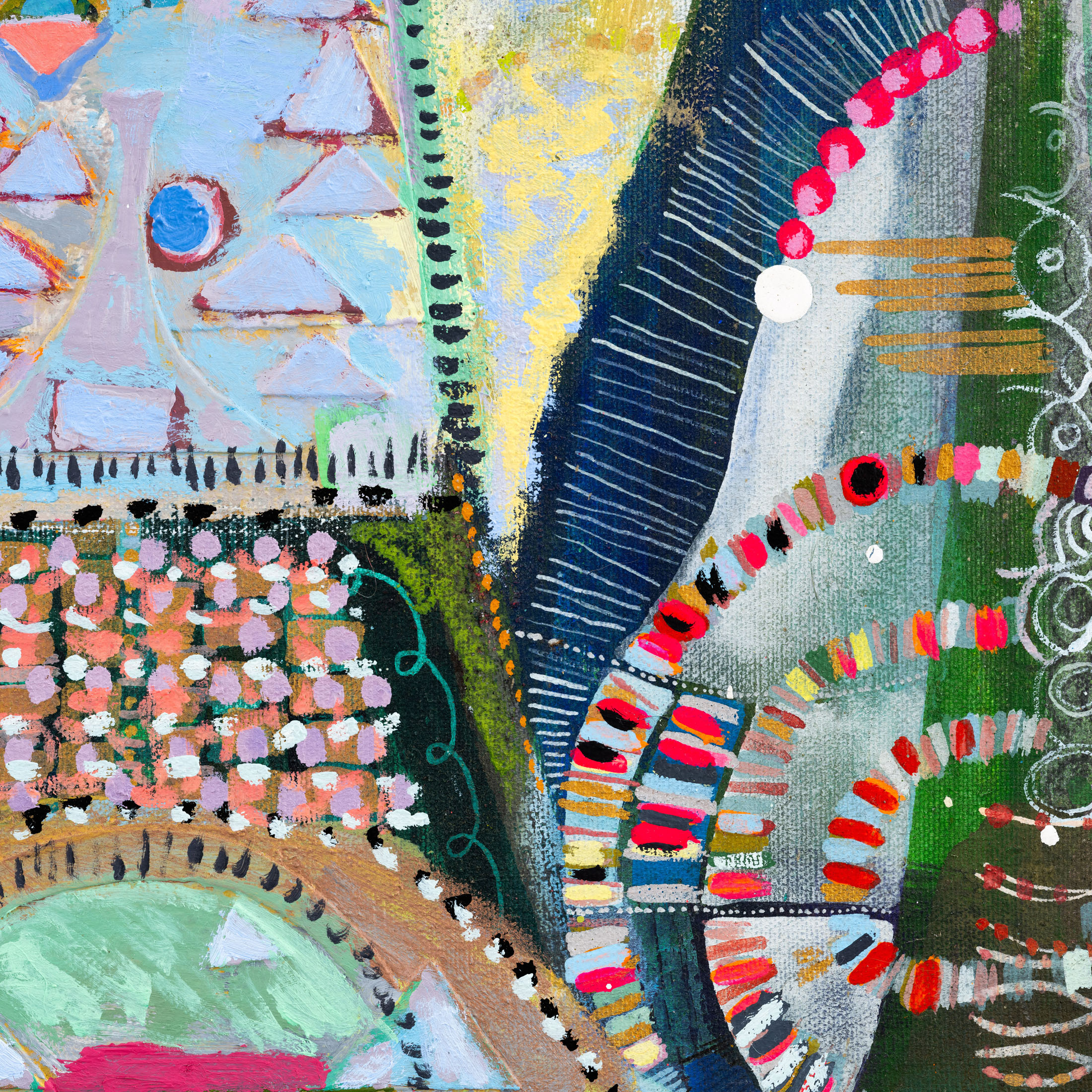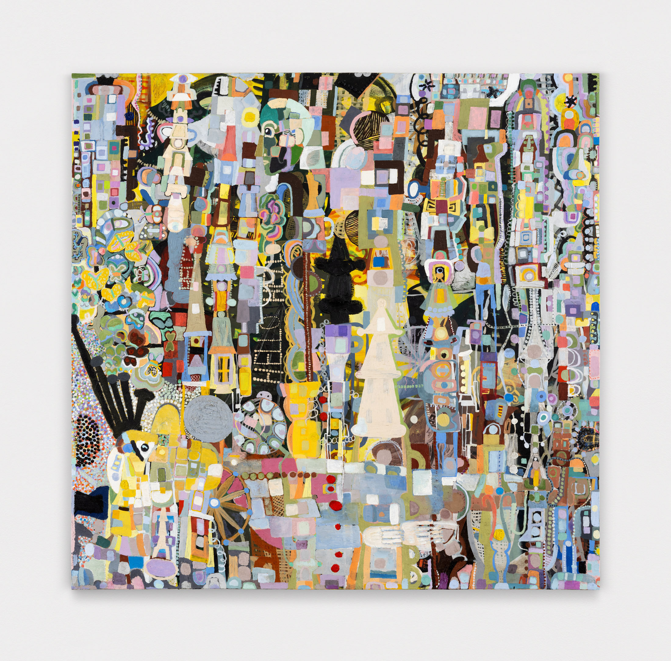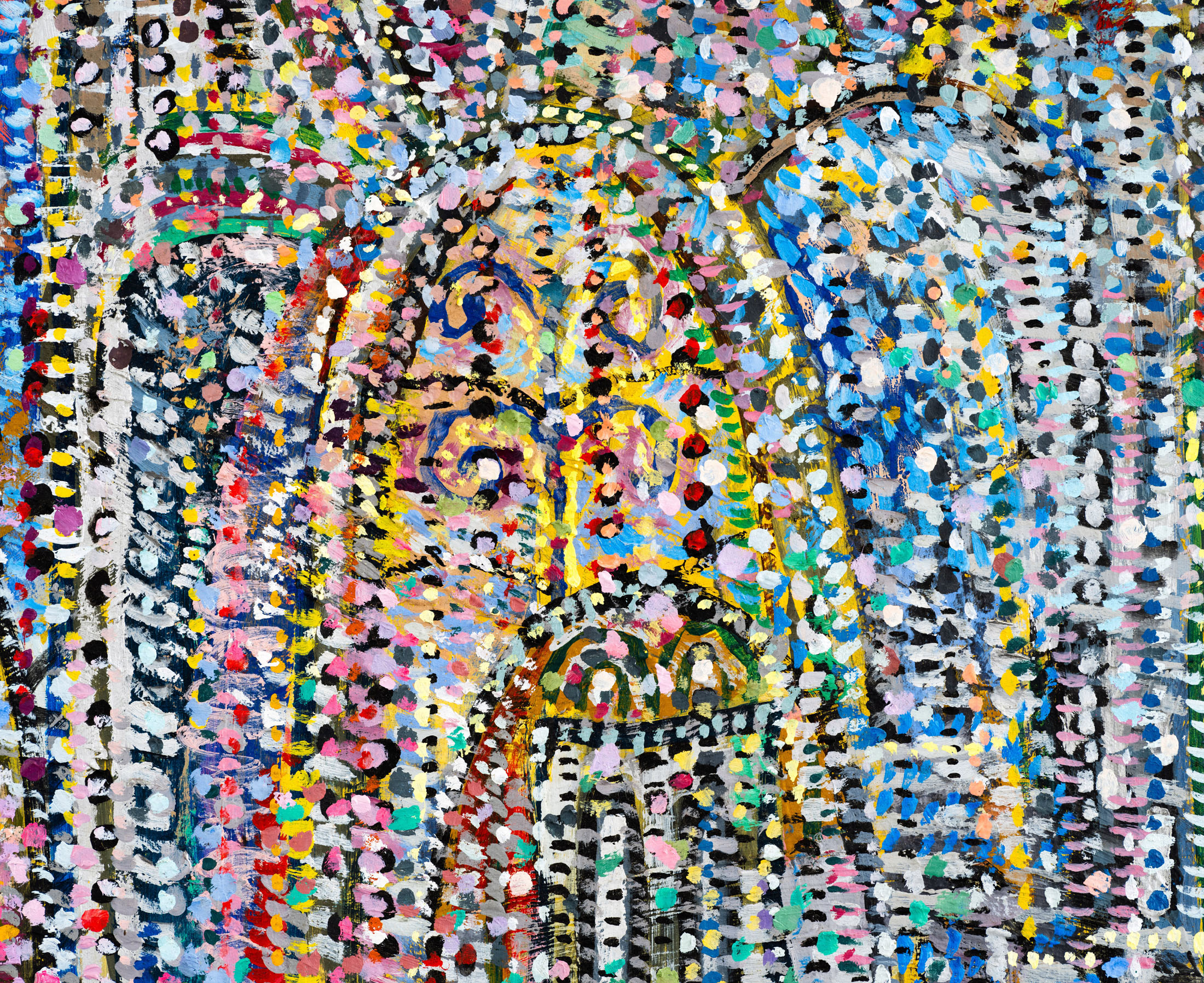 Secrets in the Flower Tower exists where a superabundance of decorative forms meet large swabs of pastel that we encounter as a kind of thoughtful absence—a looming, ramshackle, left-of center comportment. According to Barbour, this painting began as “scaffolding” for the various body parts needed to make a human, and while it still clearly contains limbs, whether or not they add up to a person is, thankfully, not a question the painter seems troubled to answer. It suggests a ragged theater troupe, or band of merry partygoers, overdressed and unaware, standing on shoulders, expectant and haplessly ignorant of the collective absurdity of their countenance. We see them illuminated by porchlight, and we’re really not sure whether or not they should be invited in. Stray Voltage Leaping is a work that offers helpful clues into the successive layers that lend these paintings their remarkable depth and material complexity; a chair is made from the chaos lurking beneath something that might be the spark of inspiration.