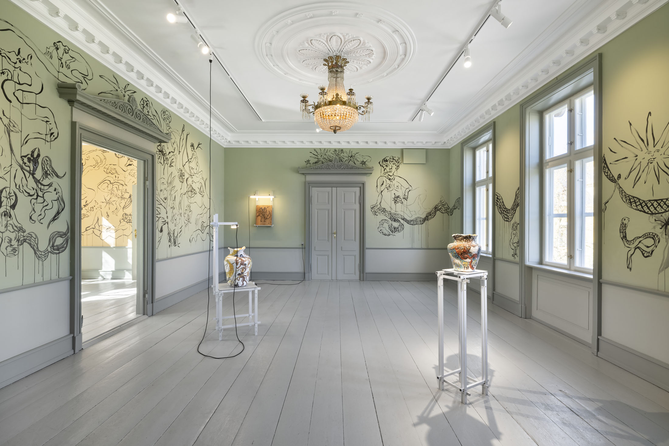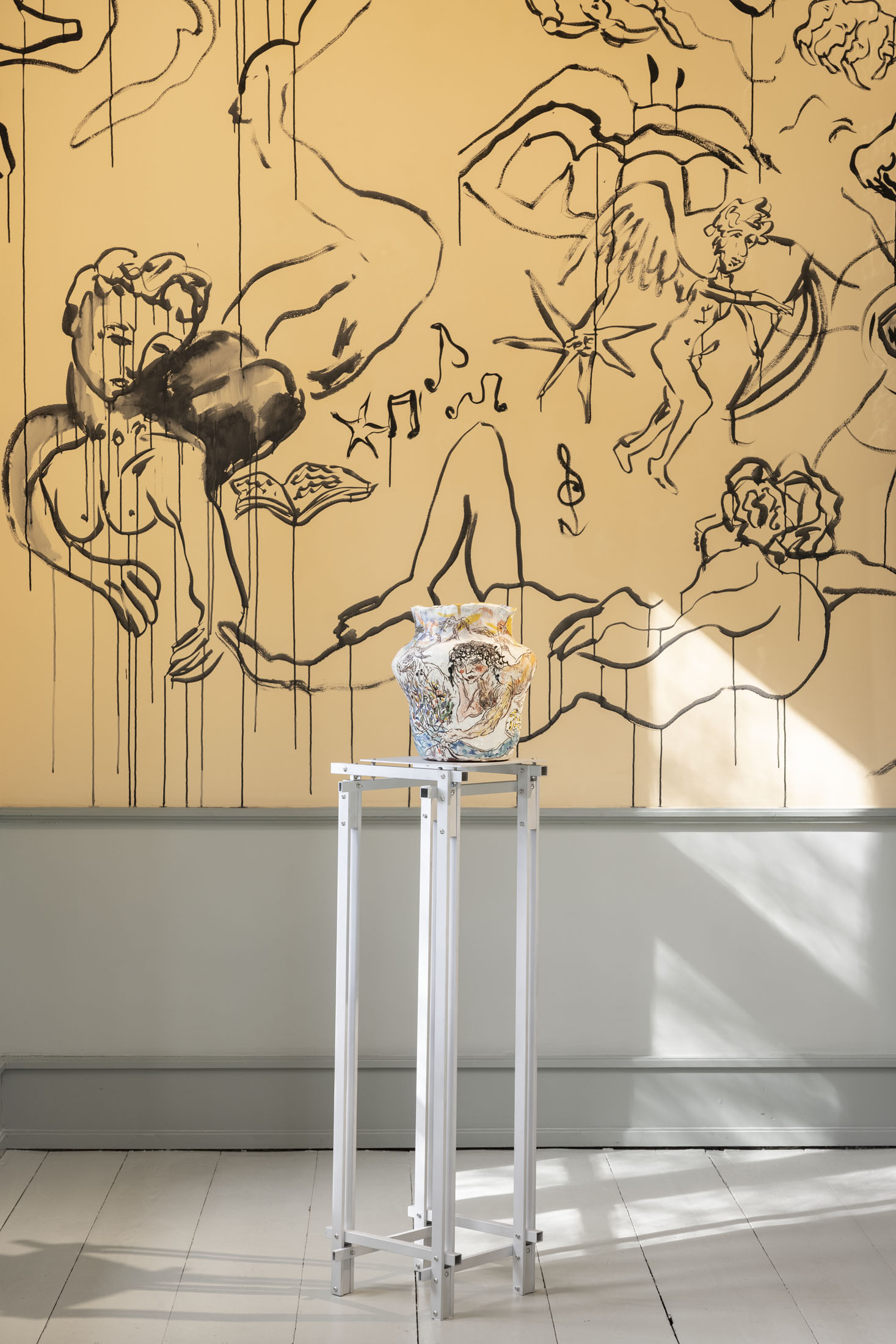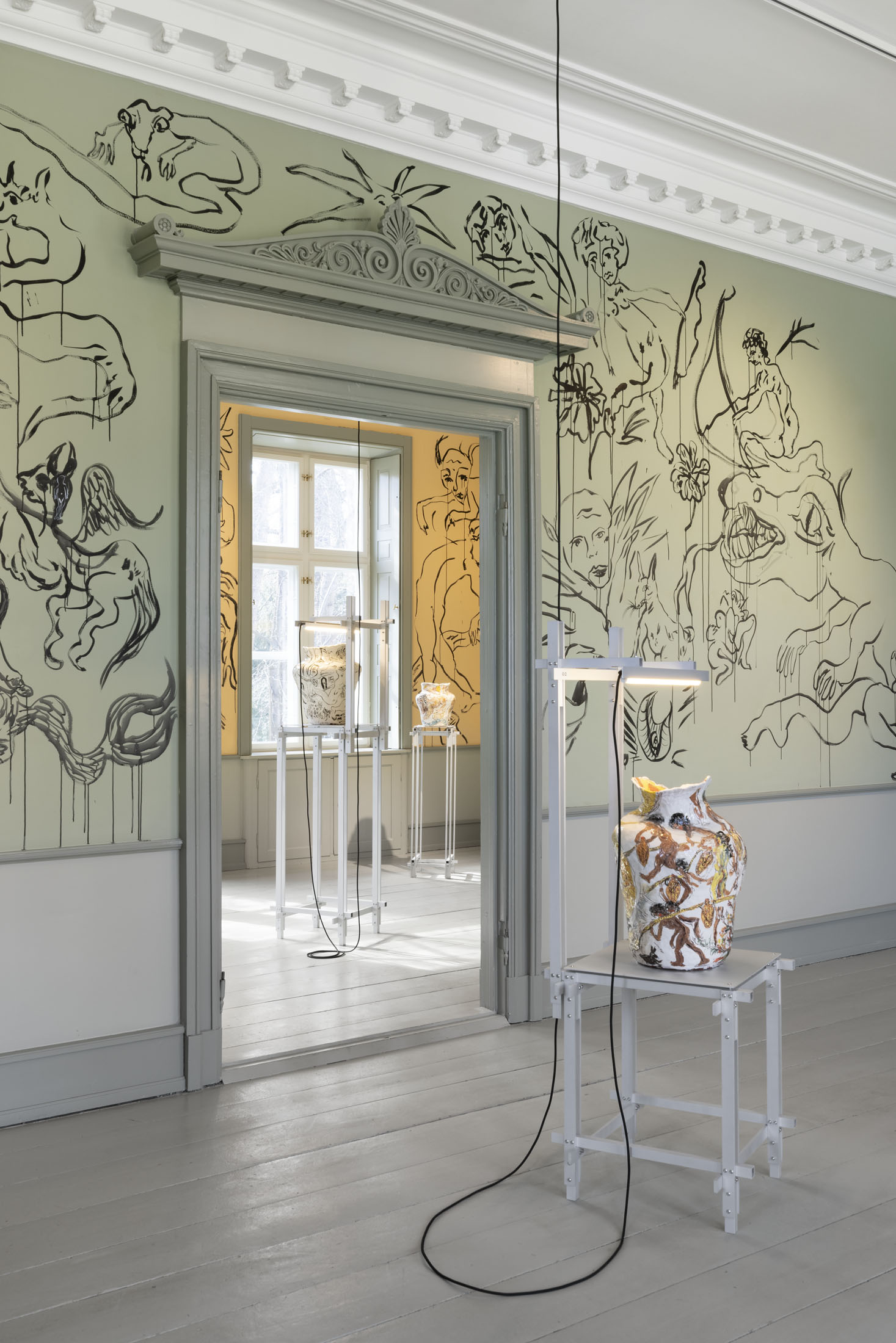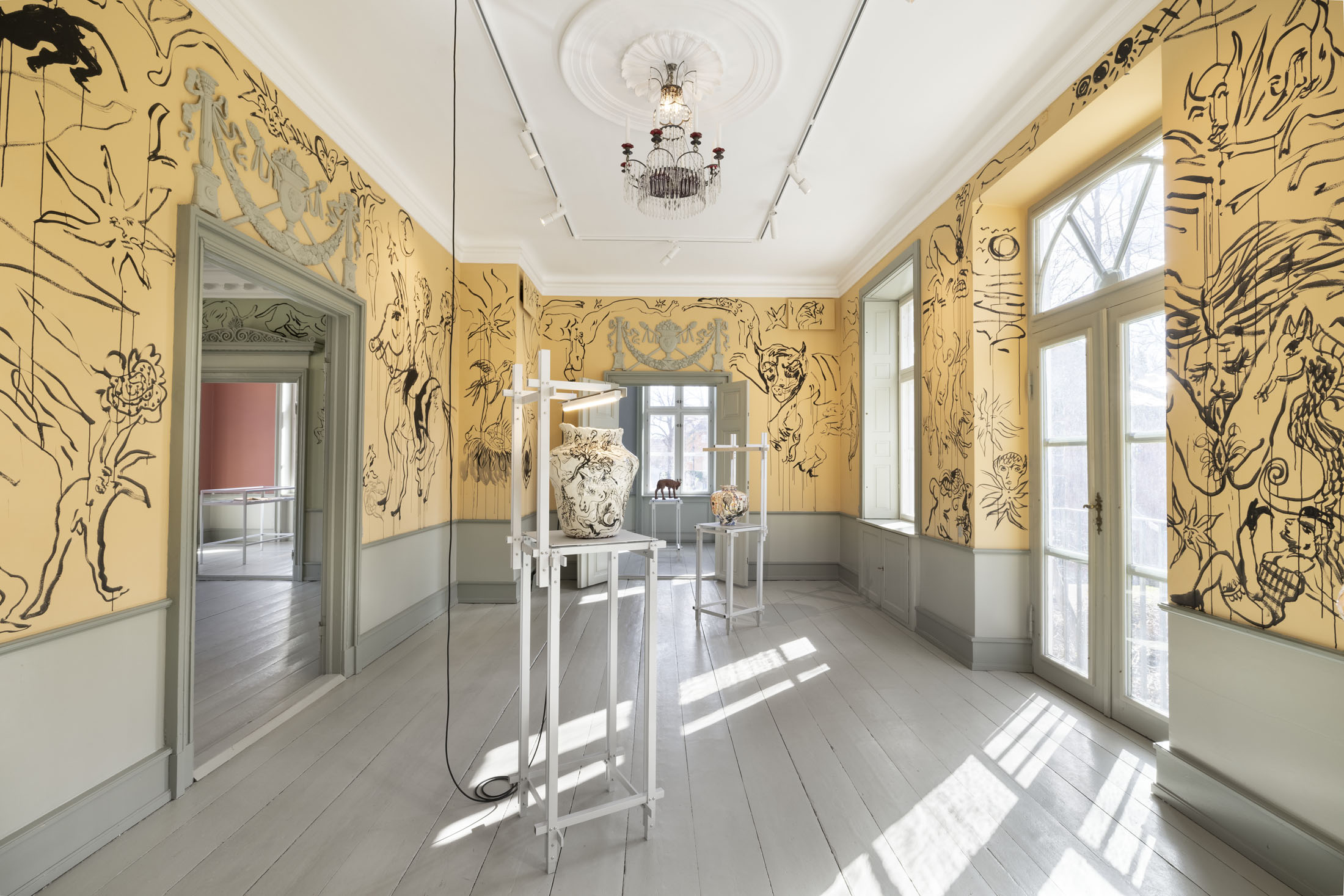 In Boumjimar’s works–here comprised of wall paintings, sculpture, ceramics, and silver casts of bodily fluids–the human being is not at the centre, but one organism among many, shaped, worn down, and decomposed by the same forces that are changing the ecosystems around it. Thus, the exhibition evokes an understanding of the body in which the boundary between the human and the nonhuman is porous and negotiable.