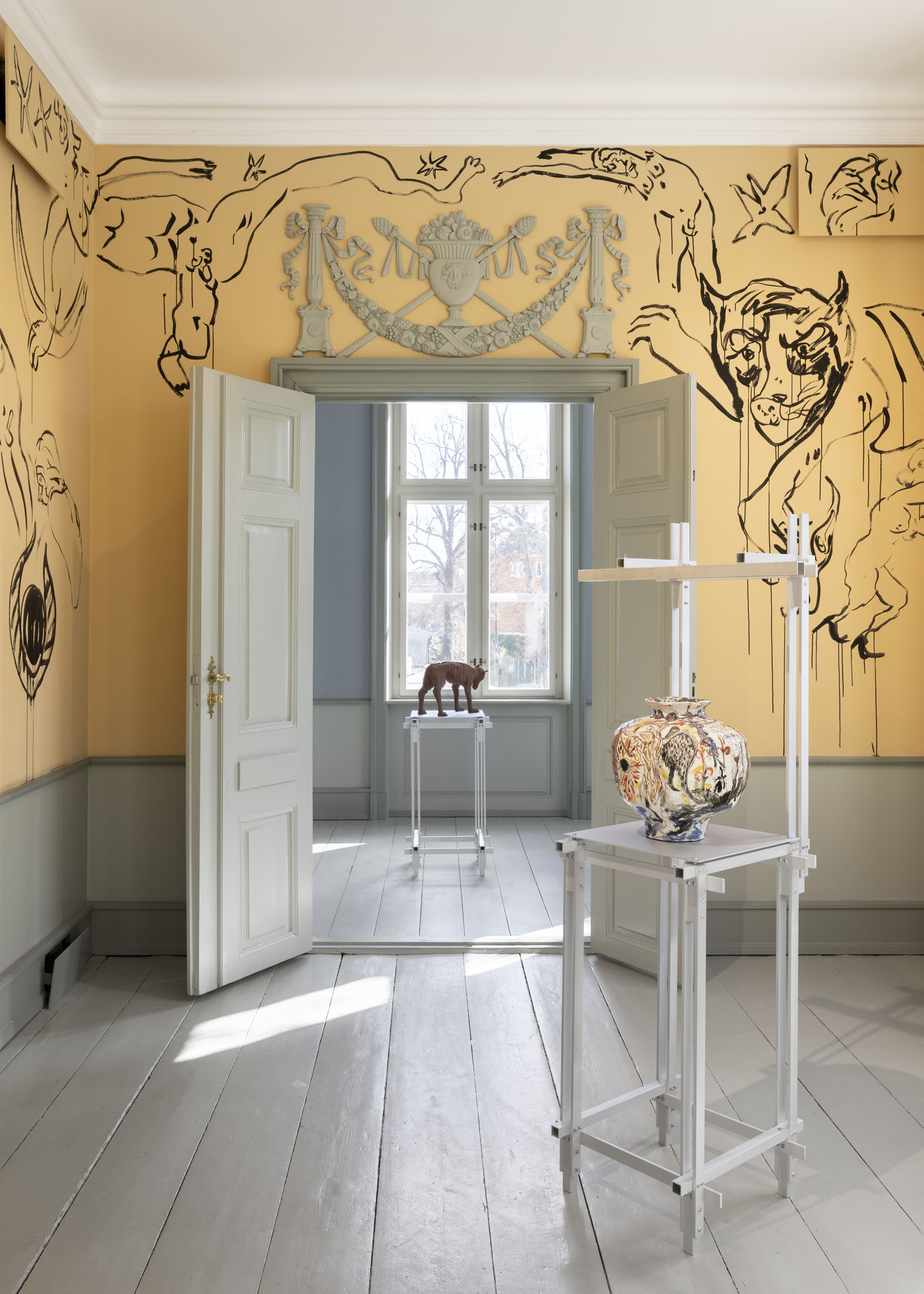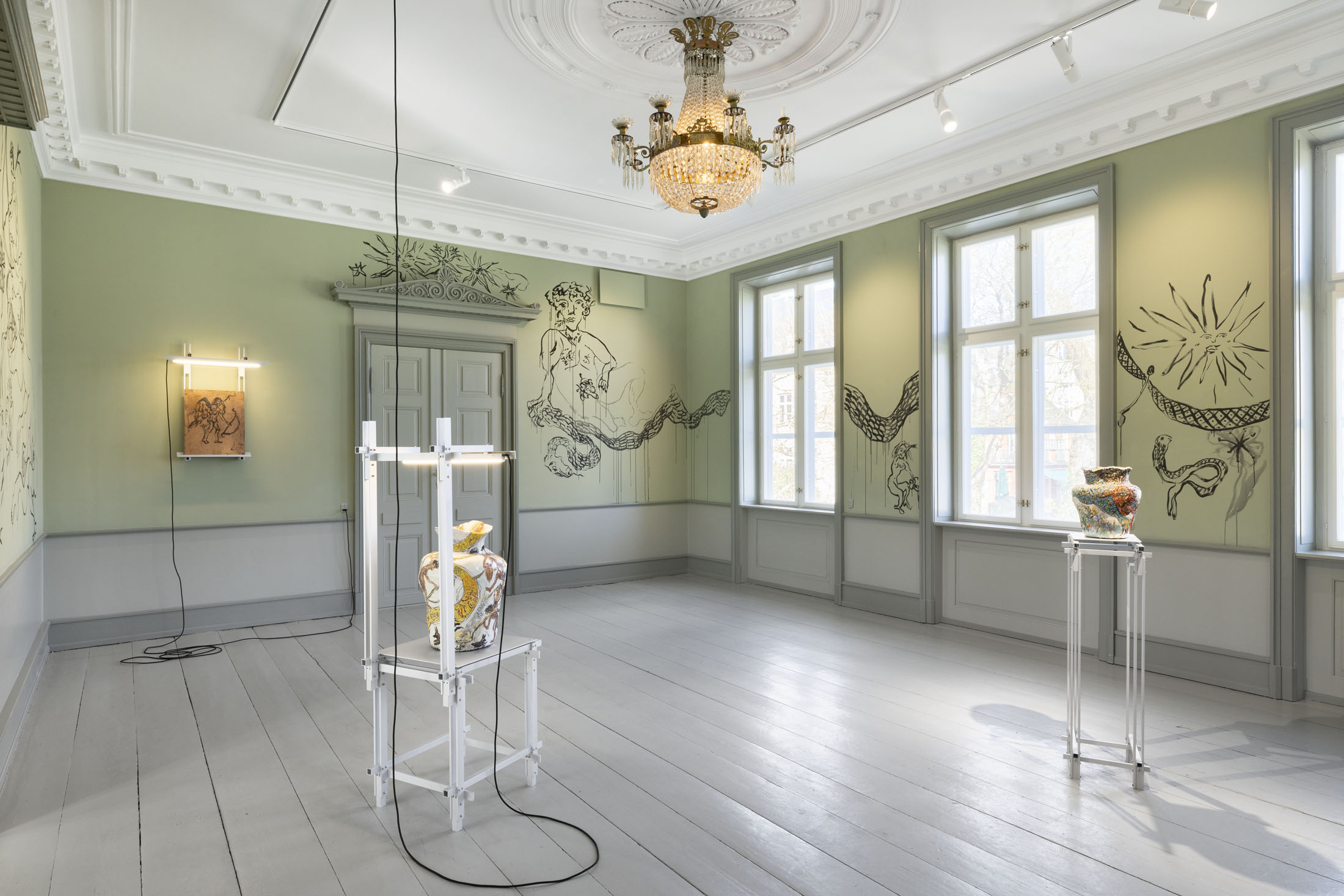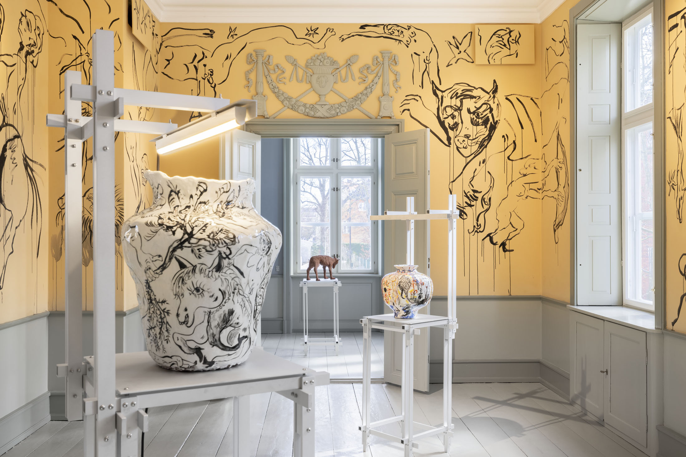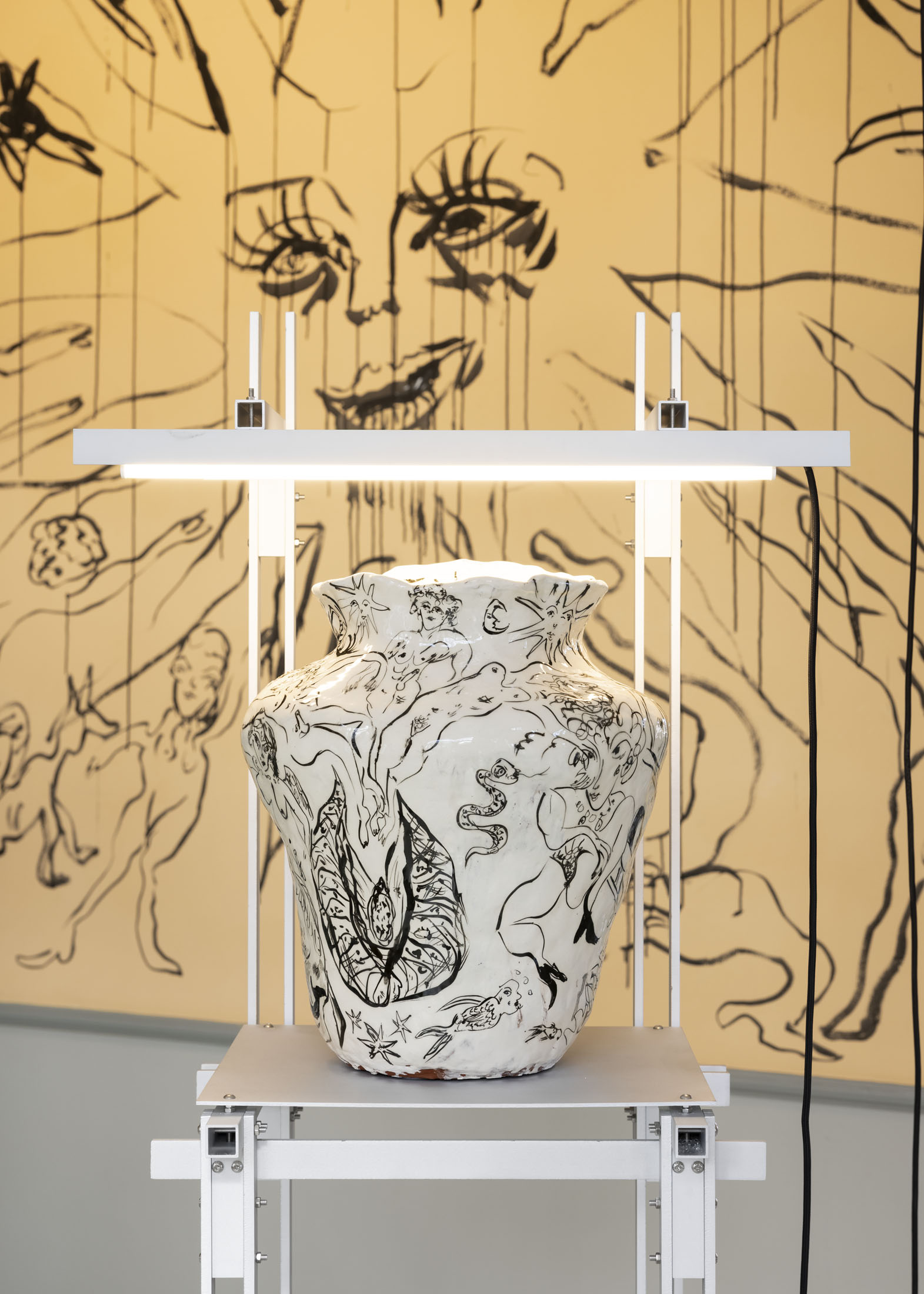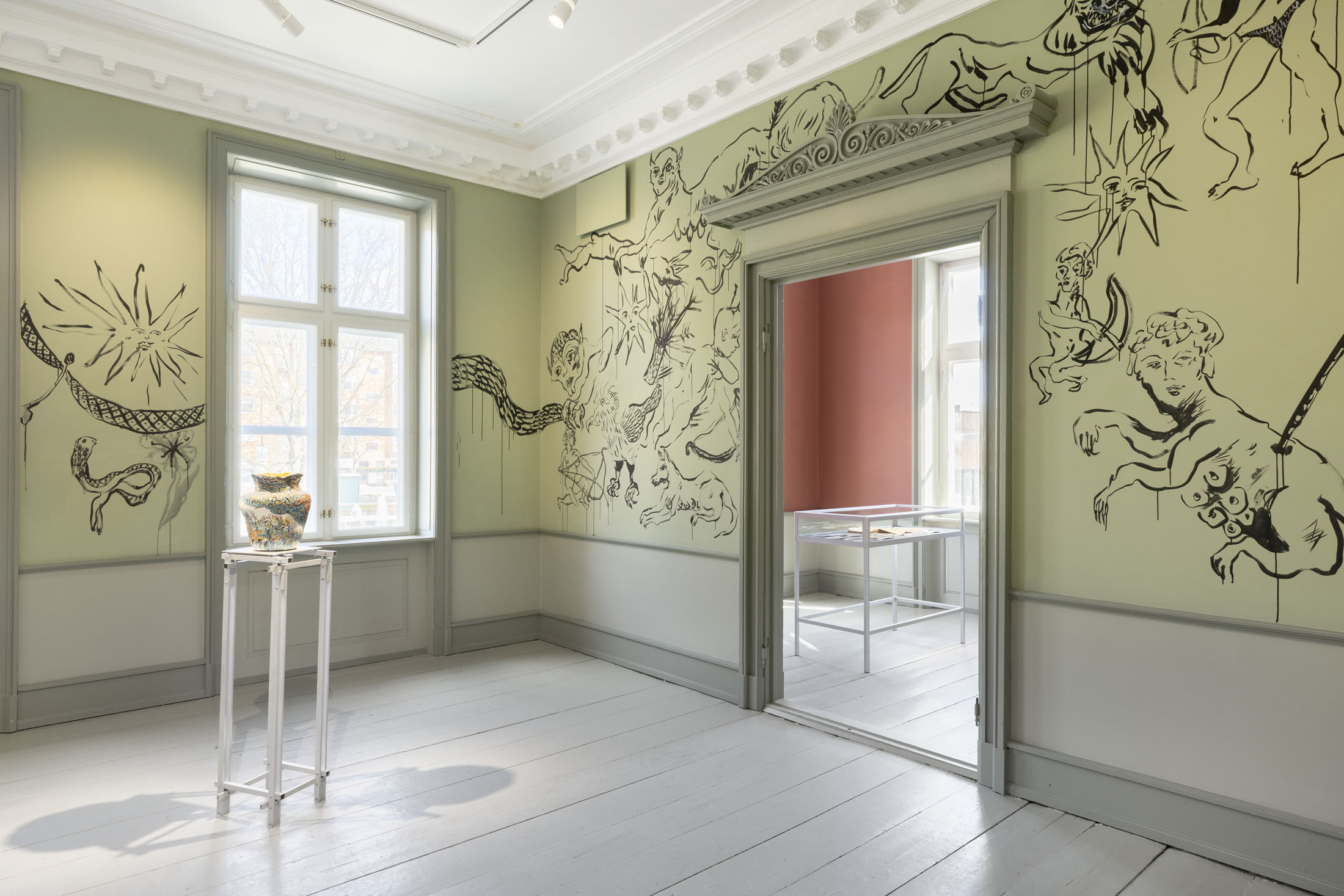 In Boumjimar’s works–here comprised of wall paintings, sculpture, ceramics, and silver casts of bodily fluids–the human being is not at the centre, but one organism among many, shaped, worn down, and decomposed by the same forces that are changing the ecosystems around it. Thus, the exhibition evokes an understanding of the body in which the boundary between the human and the nonhuman is porous and negotiable.