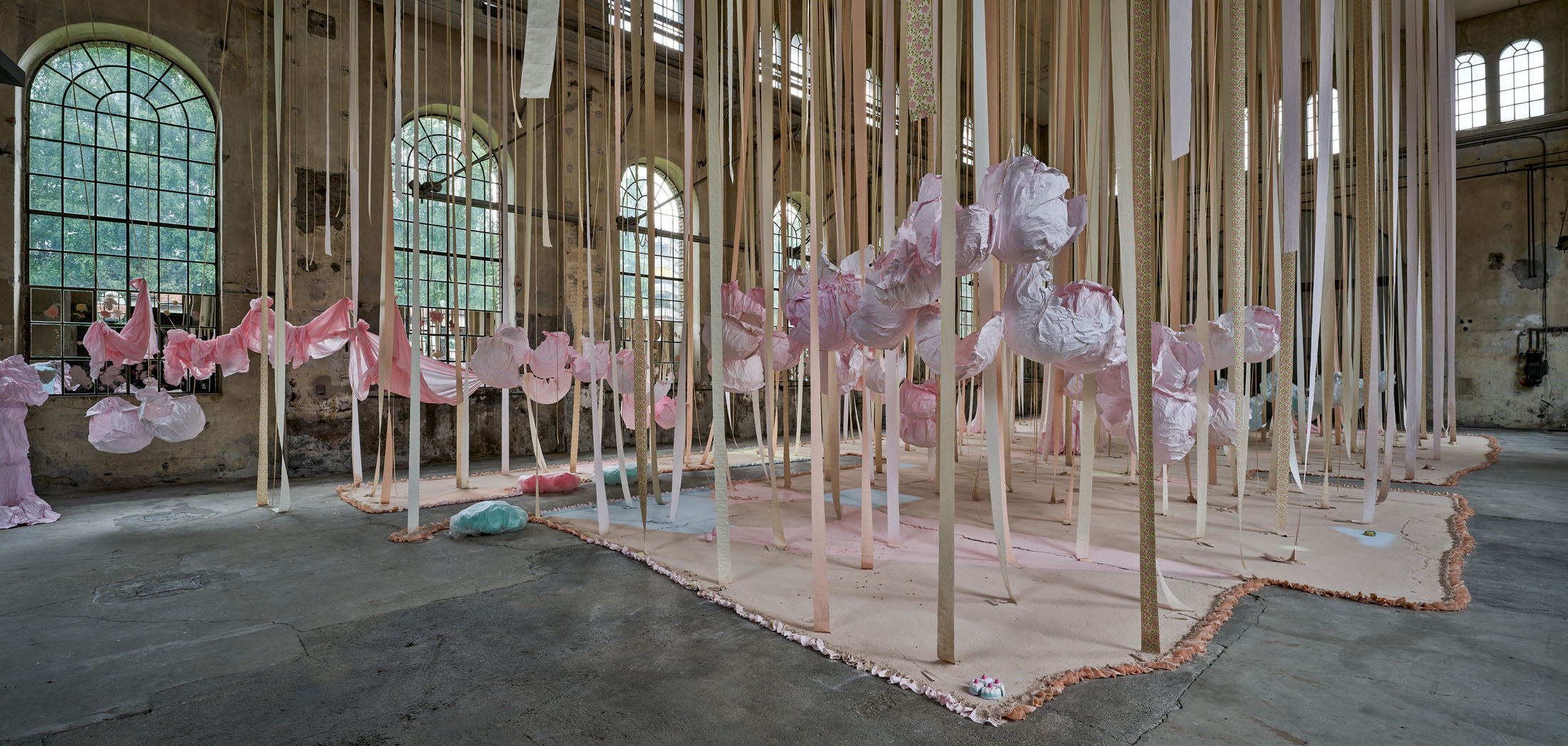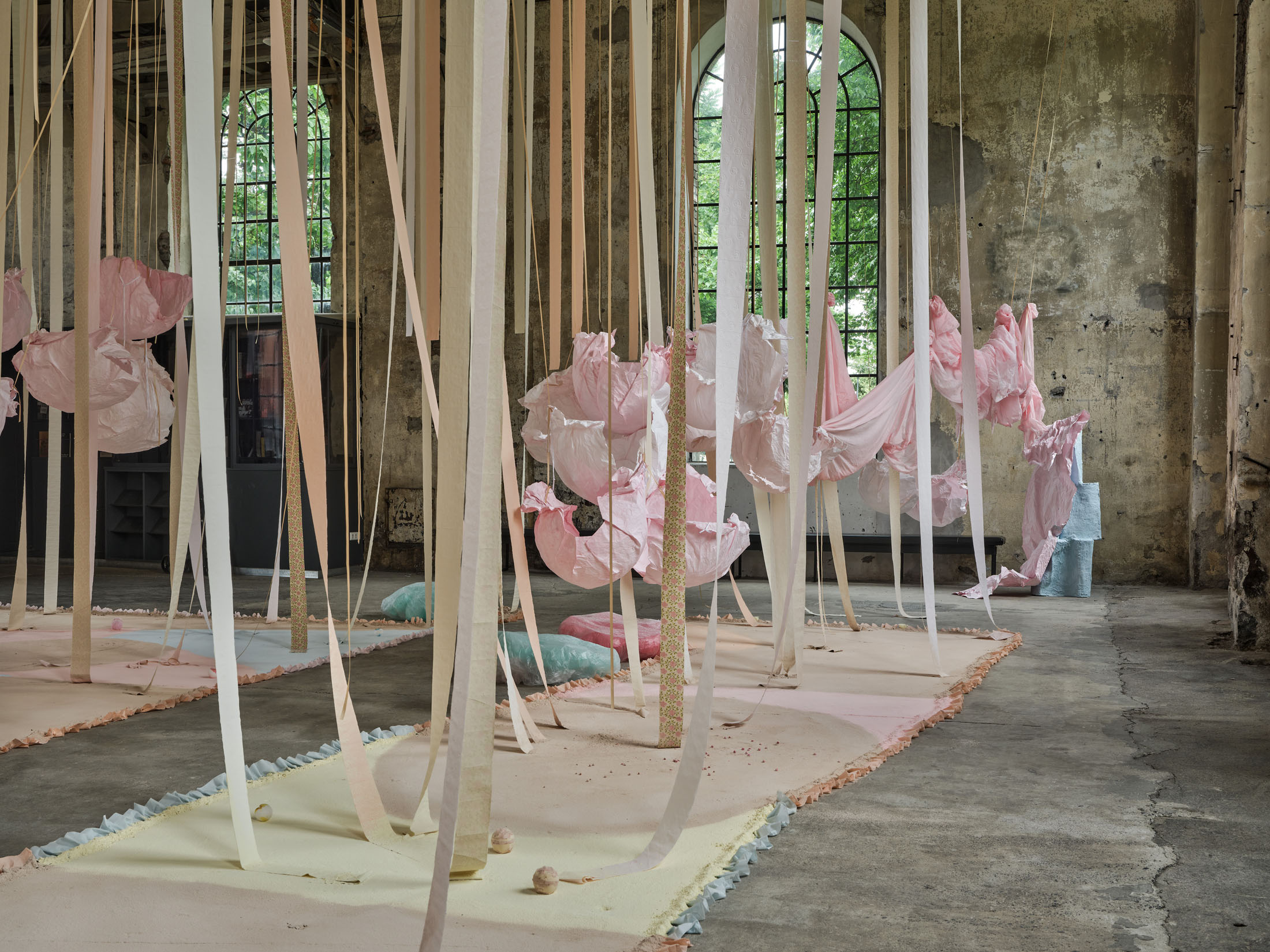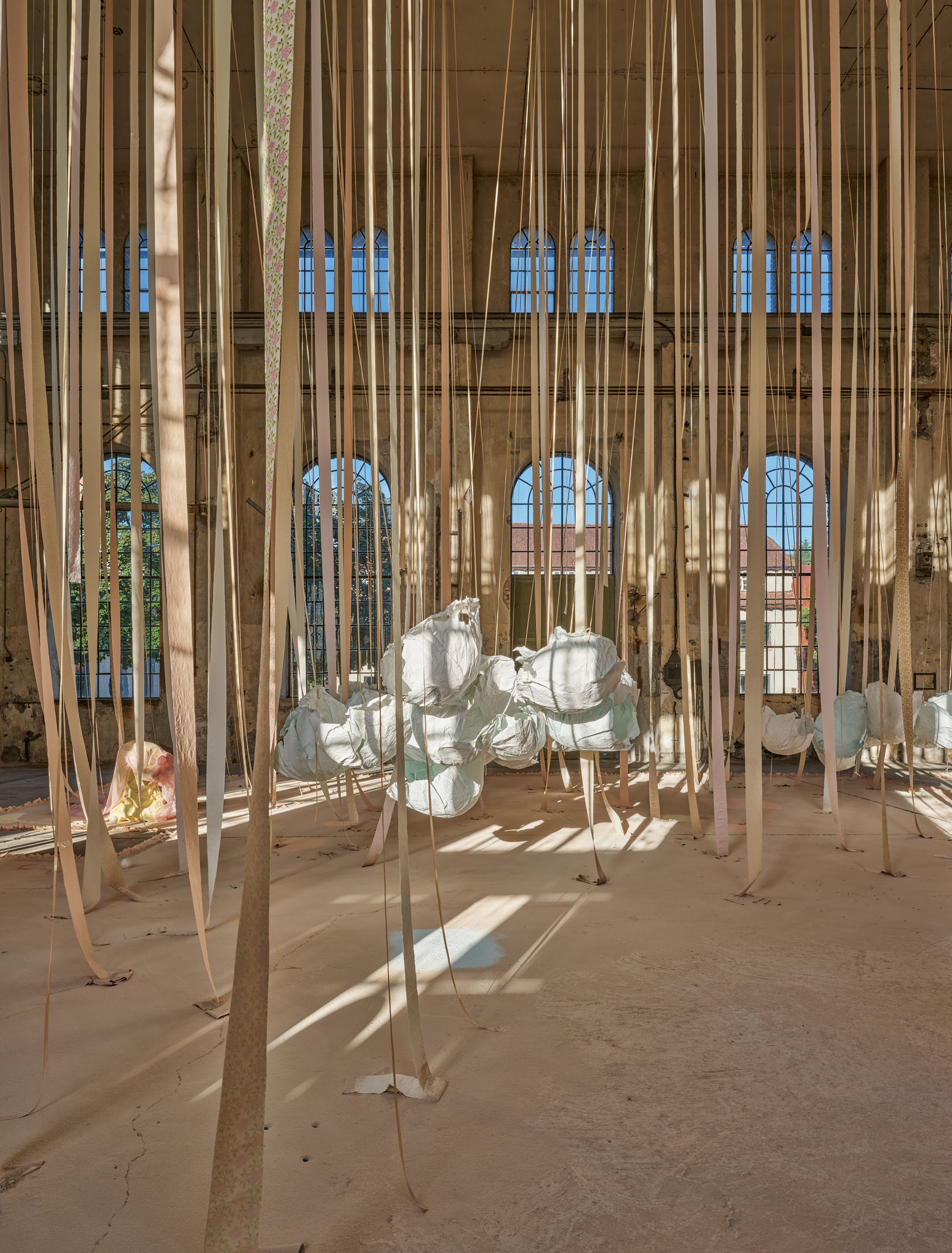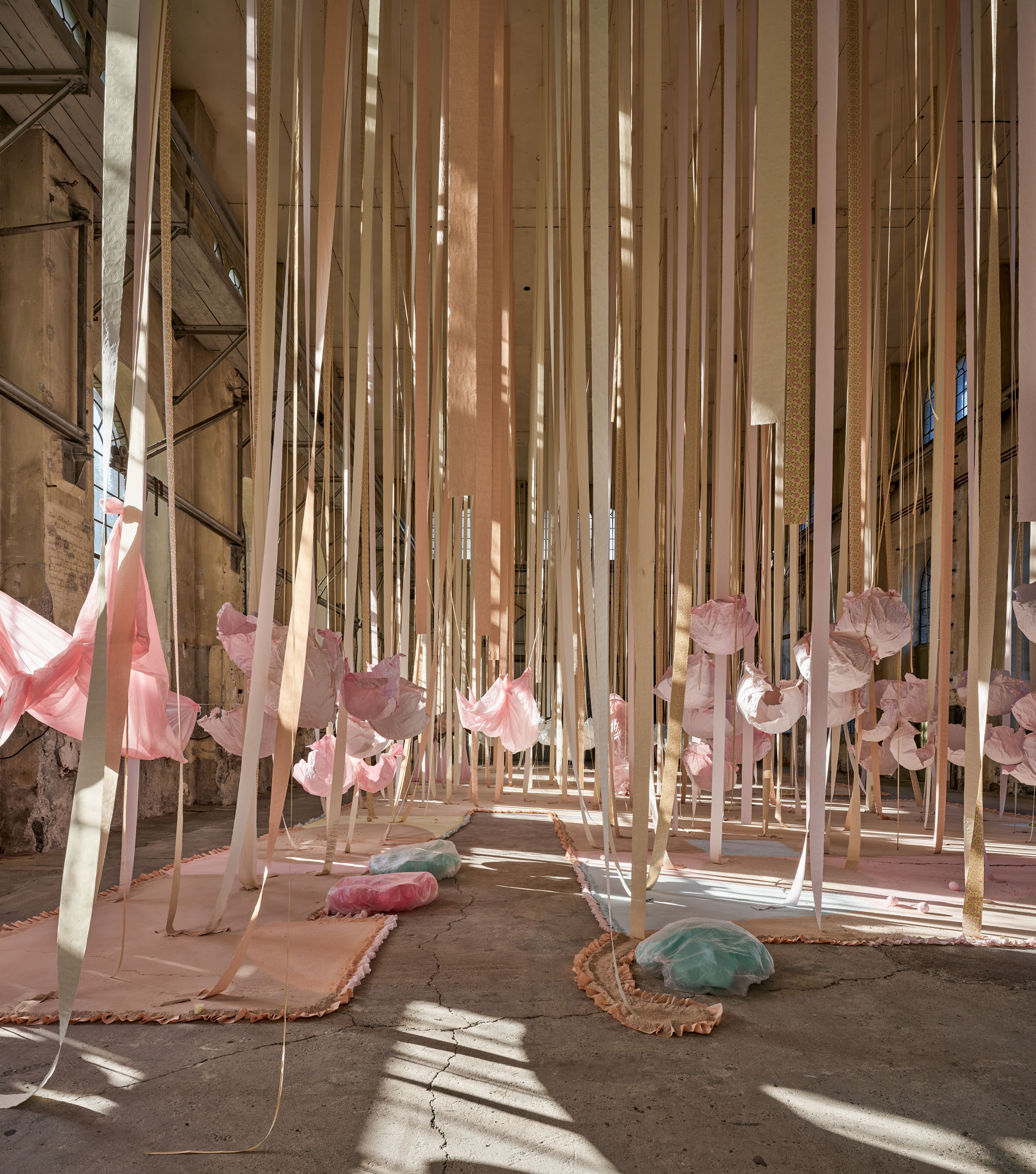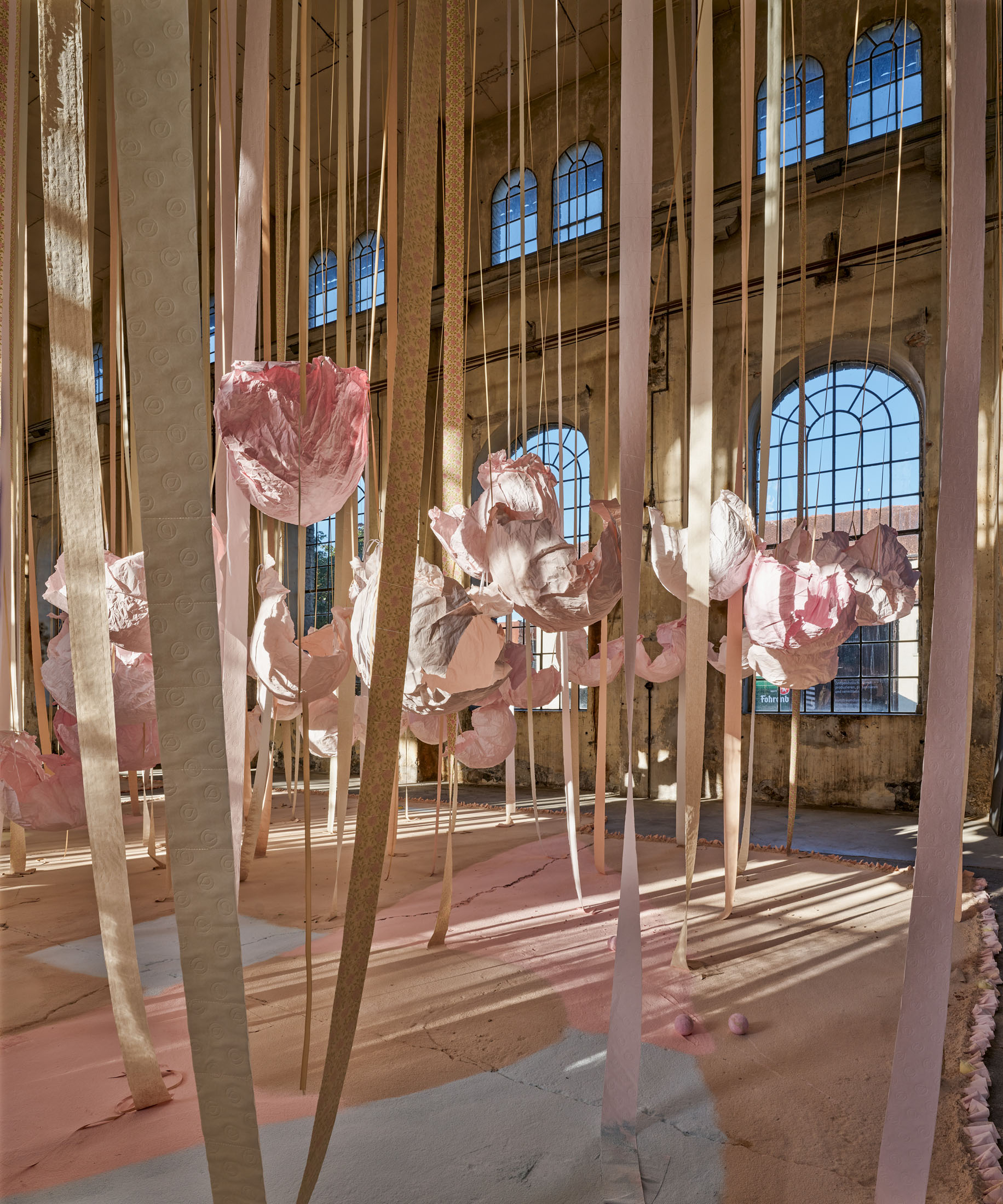 From the 11-metre-high ceiling hang countless strips of lightly coloured toilet paper throughout the room. Between them are strings from which hang silhouettes of hemispheres moulded in paper or translucent coloured foils, tied together to form wondrous, graceful shapes. The dangling and floating spheres are visually offset by the standing and reclining forms: in the clearings between the toilet paper and the strings, sculptures are placed that poetically combine standing paper and holding plaster moulds. The toilet paper ends on the floor, on surfaces made of sieved gypsum and pigment powder. The strips run out in these areas, the last, recumbent leaves covered by powder. The edges of the differently coloured areas are framed by crinkled toilet paper. Bath bombs in the form of cake pieces or in a floral design as well as make-up beads are scattered over the coloured ground. These floor works, covering the entire surface, create paths on which we can enter the fantastic landscape entitled “Safety As A Stance”. They also give the room a harmonious pastel palette of colours ranging from pink to peach to beige and yellow. When daylight or sunlight strikes the materials, they glow in their pastel hues and colour the entire ambience. This considerably intensifies the holistic experience of material and colour.
