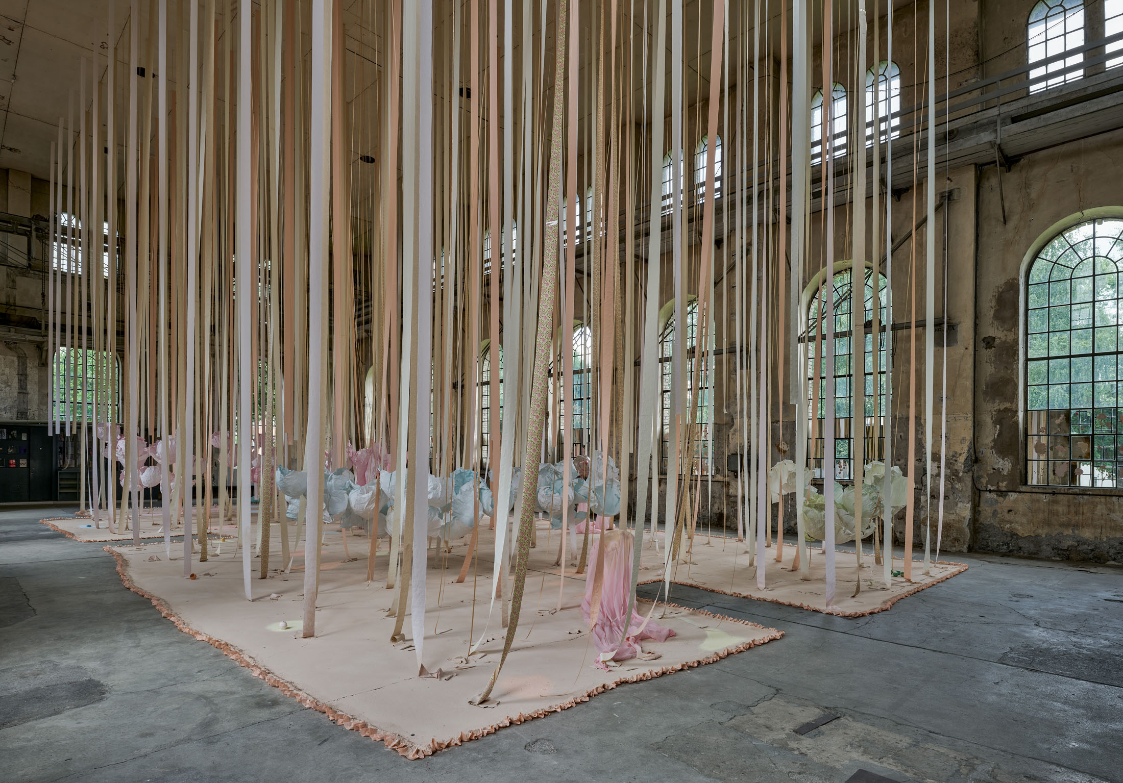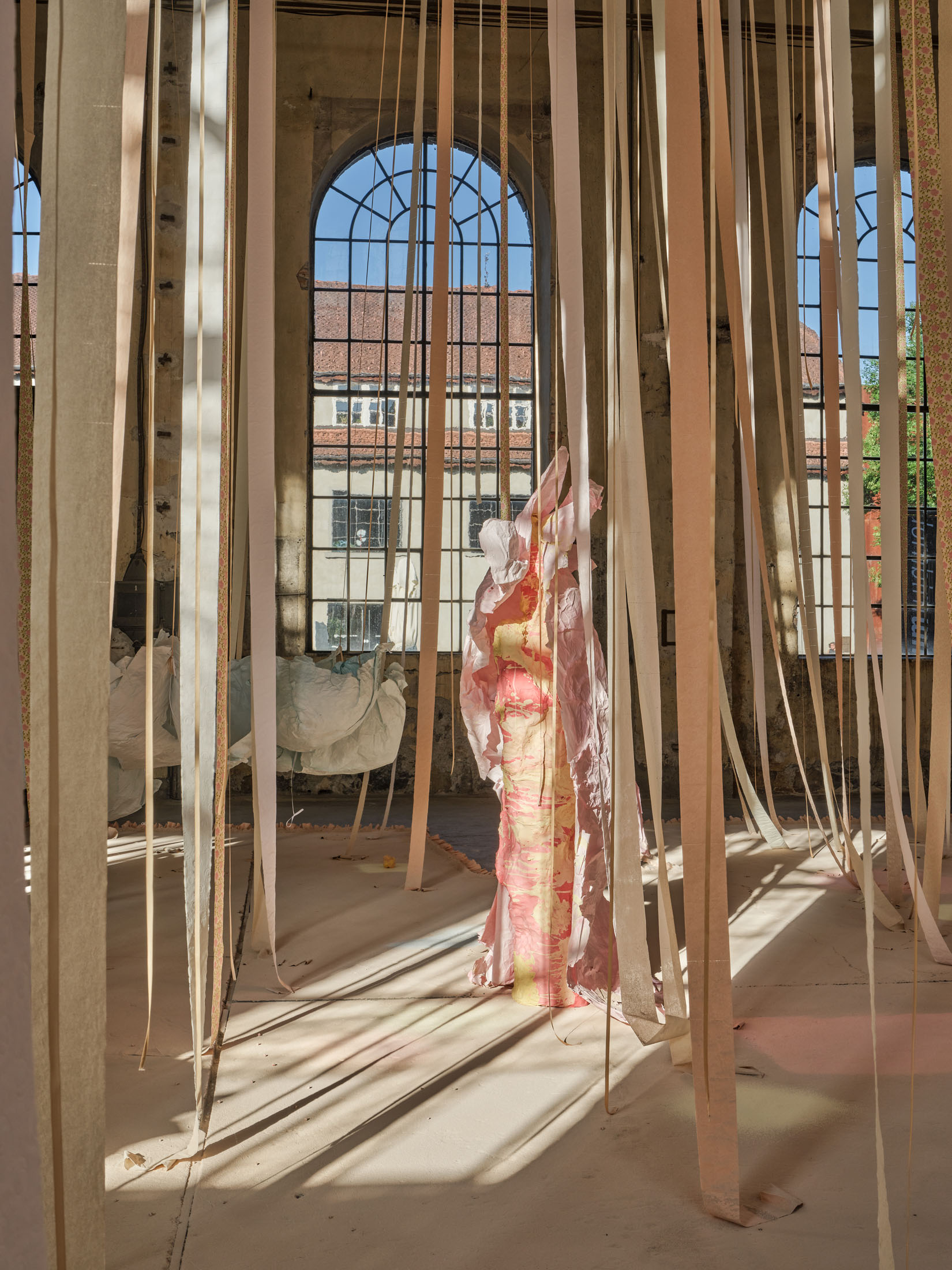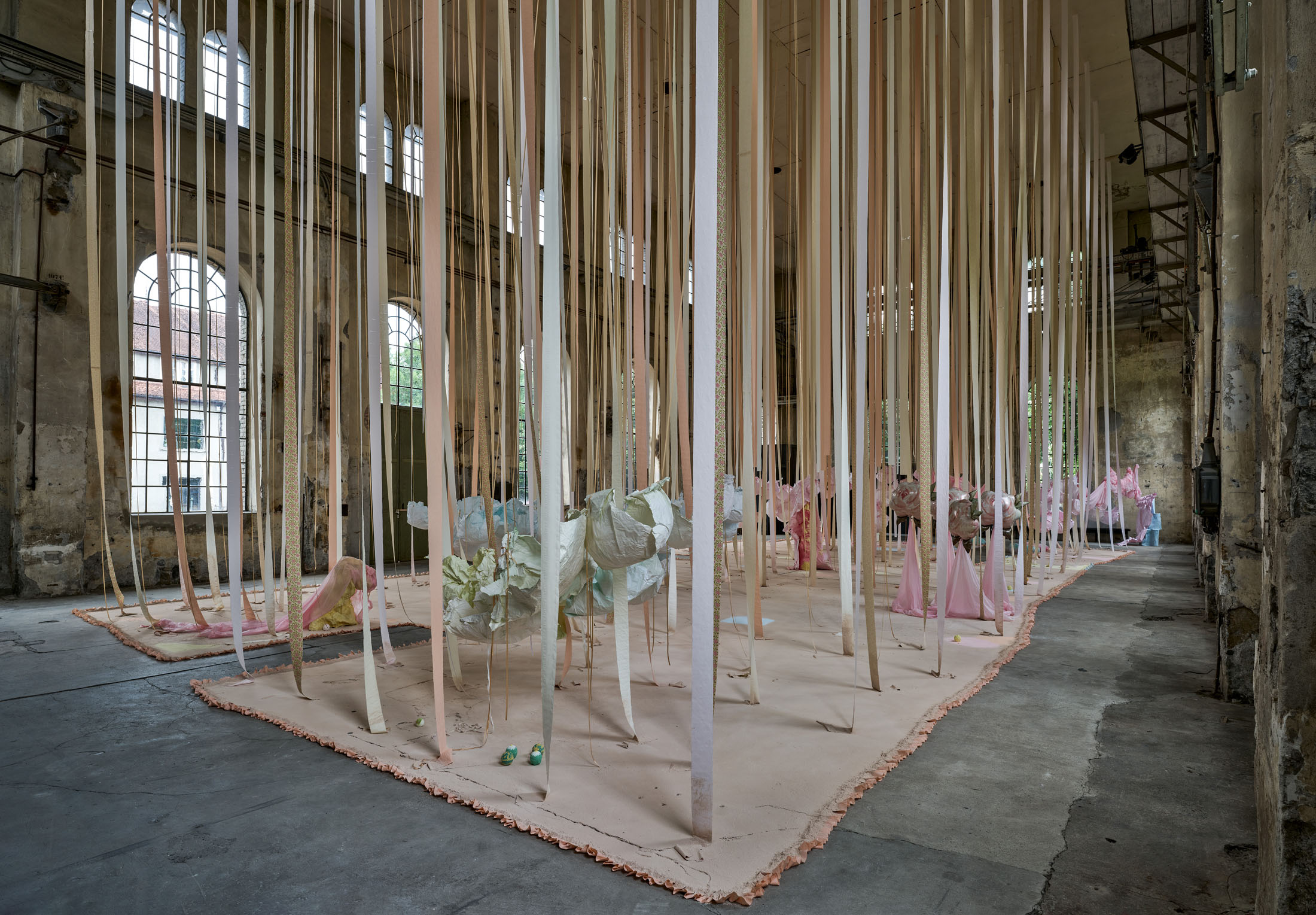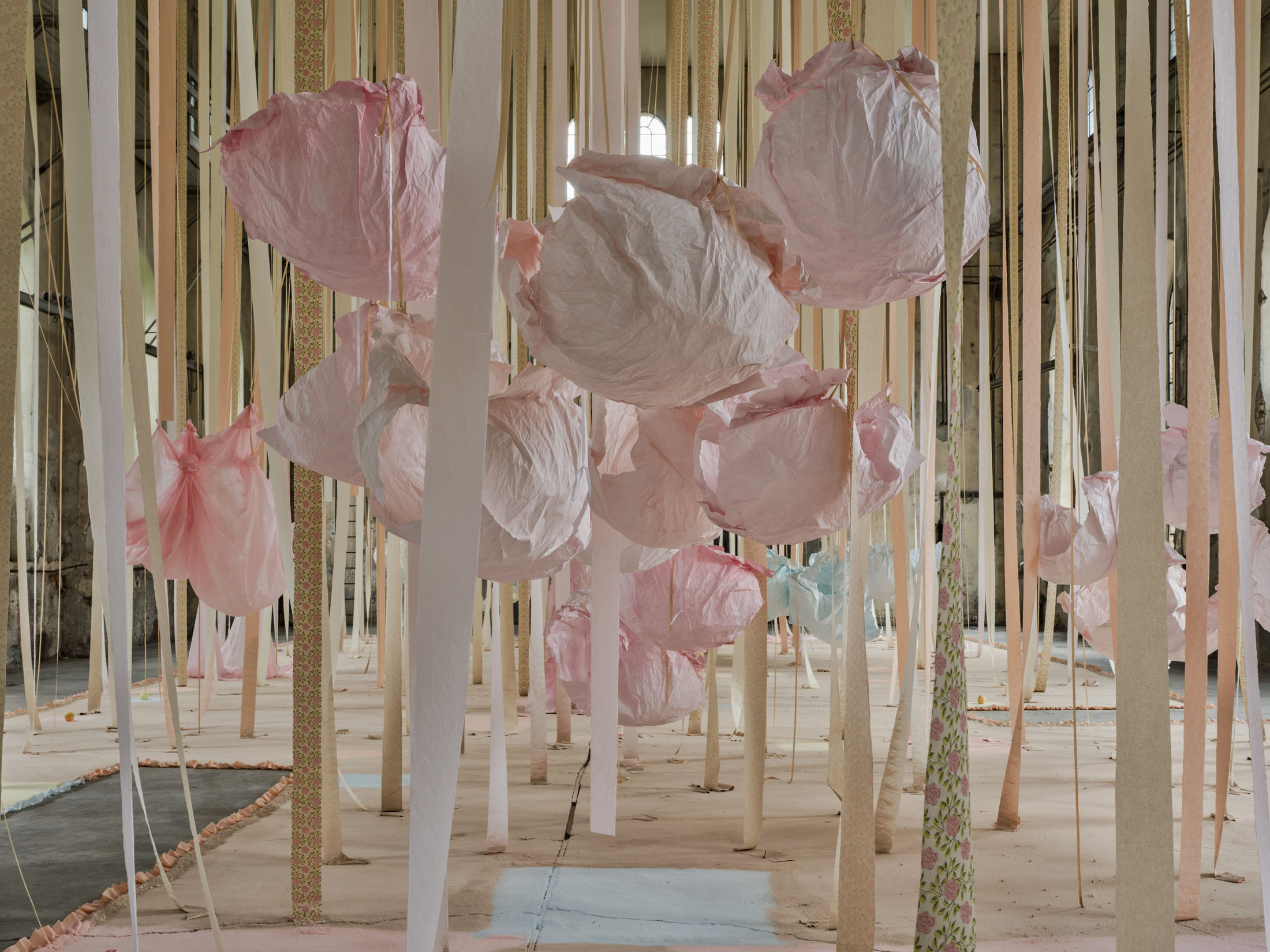 From the 11-metre-high ceiling hang countless strips of lightly coloured toilet paper throughout the room. Between them are strings from which hang silhouettes of hemispheres moulded in paper or translucent coloured foils, tied together to form wondrous, graceful shapes. The dangling and floating spheres are visually offset by the standing and reclining forms: in the clearings between the toilet paper and the strings, sculptures are placed that poetically combine standing paper and holding plaster moulds. The toilet paper ends on the floor, on surfaces made of sieved gypsum and pigment powder. The strips run out in these areas, the last, recumbent leaves covered by powder. The edges of the differently coloured areas are framed by crinkled toilet paper. Bath bombs in the form of cake pieces or in a floral design as well as make-up beads are scattered over the coloured ground. These floor works, covering the entire surface, create paths on which we can enter the fantastic landscape entitled “Safety As A Stance”. They also give the room a harmonious pastel palette of colours ranging from pink to peach to beige and yellow. When daylight or sunlight strikes the materials, they glow in their pastel hues and colour the entire ambience. This considerably intensifies the holistic experience of material and colour.