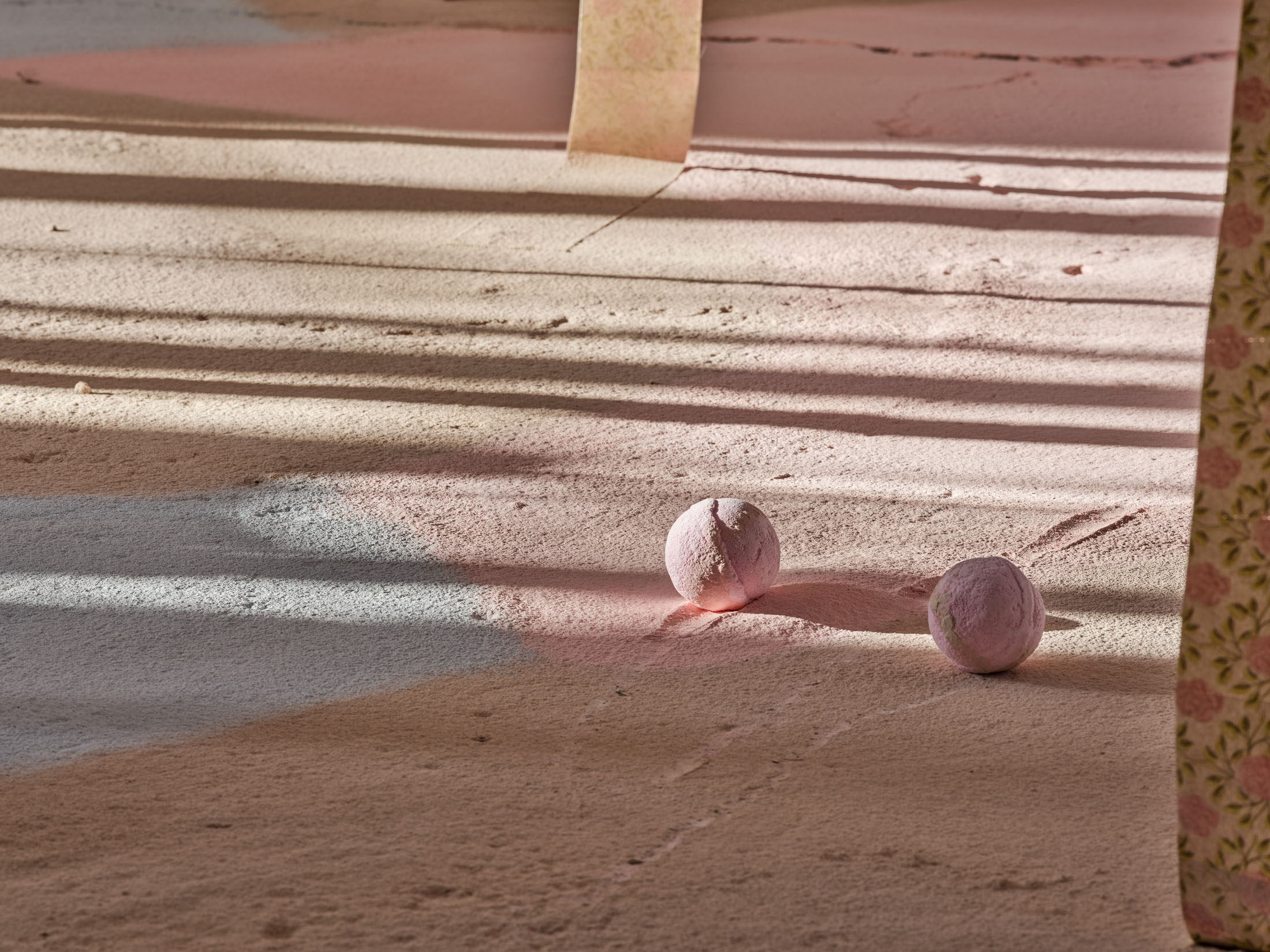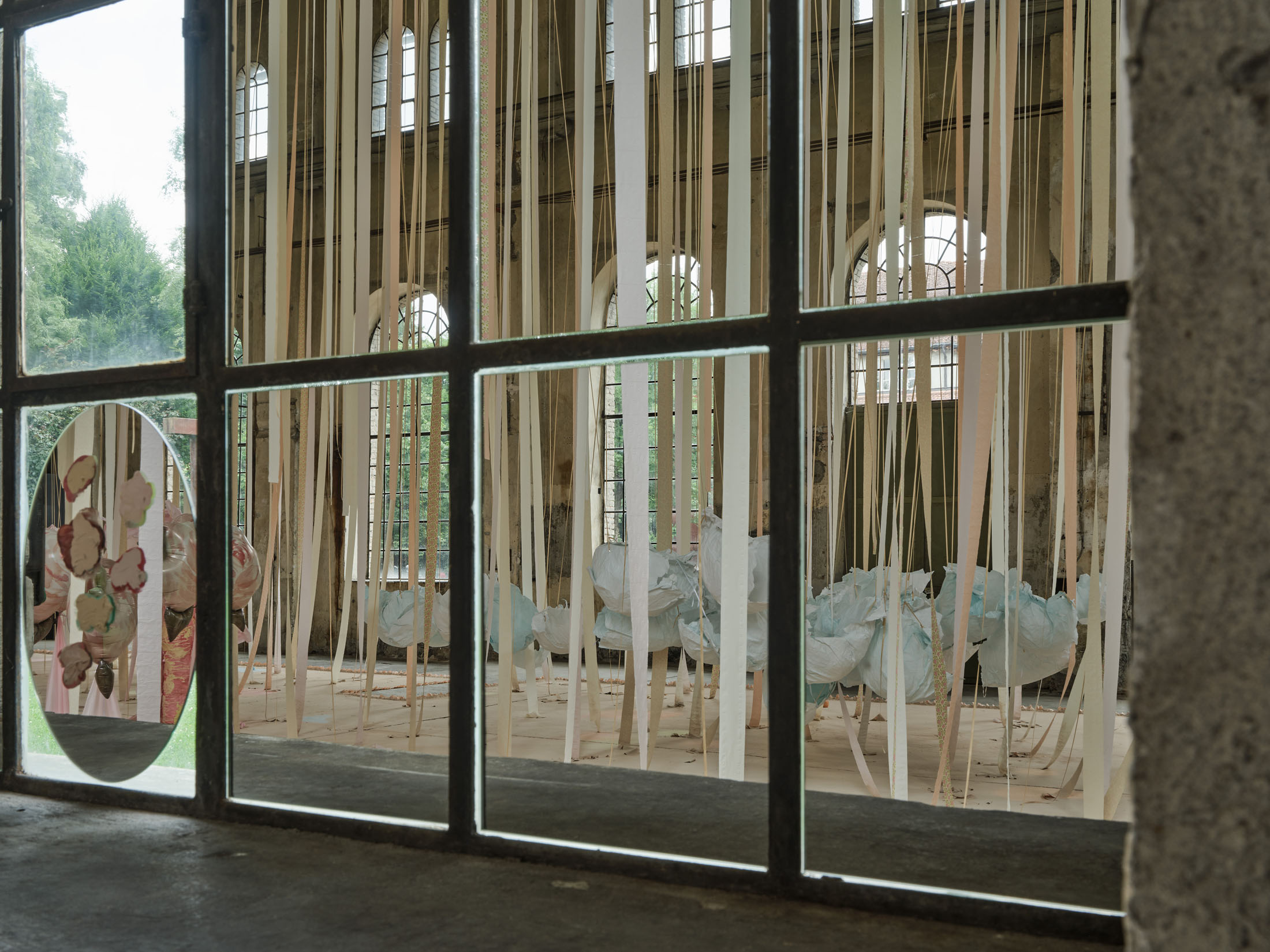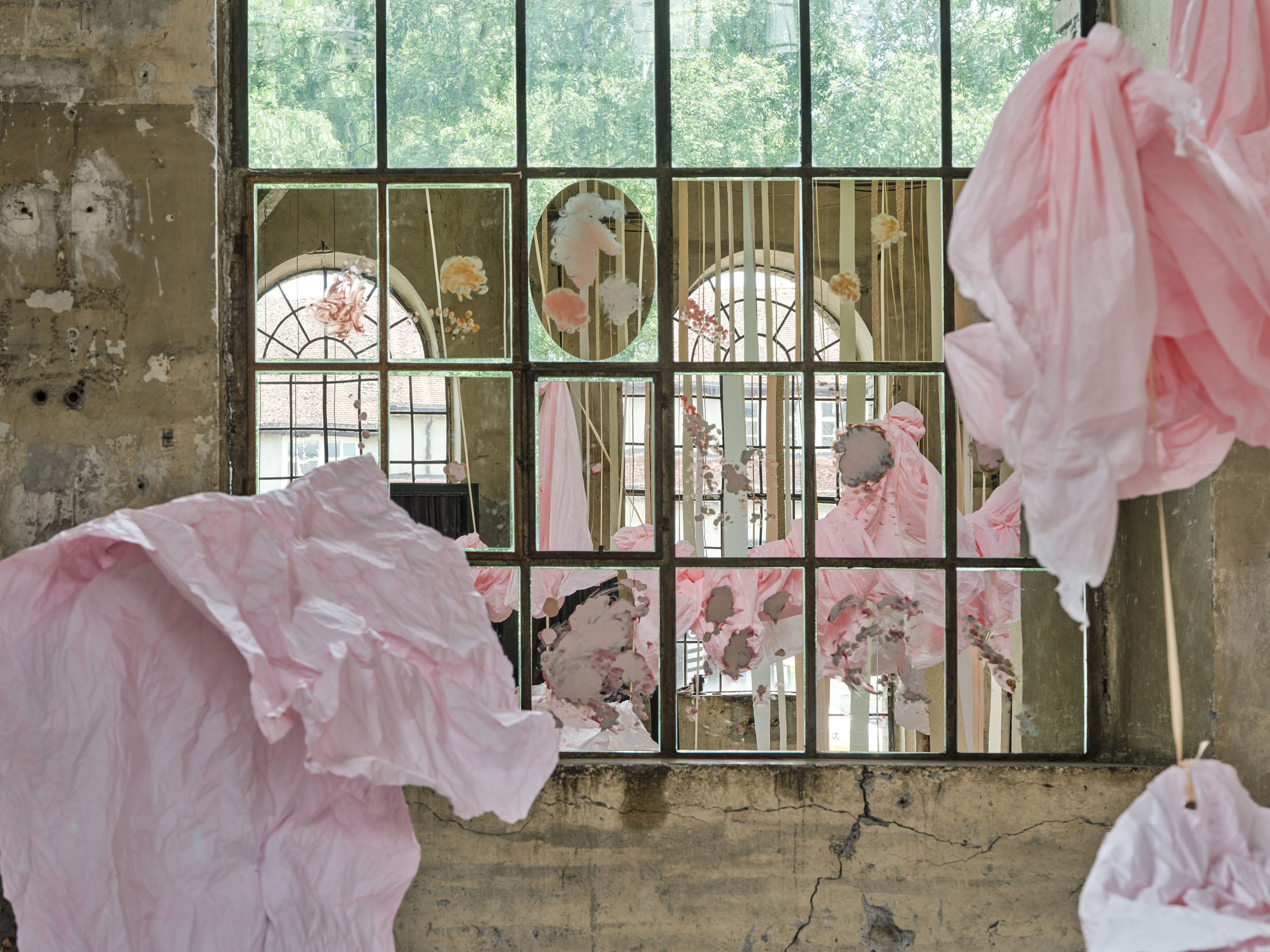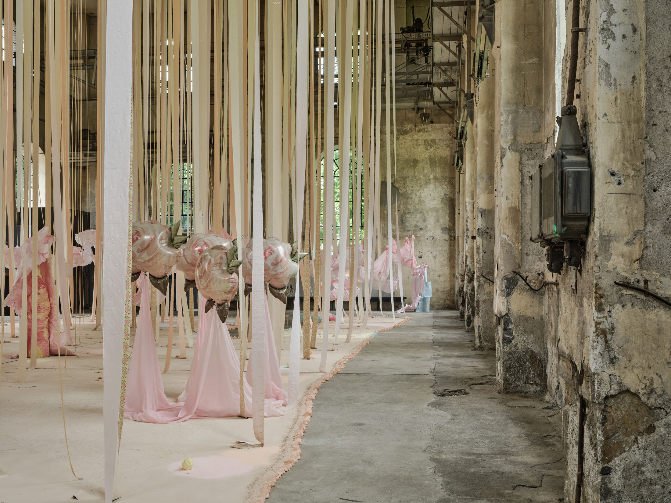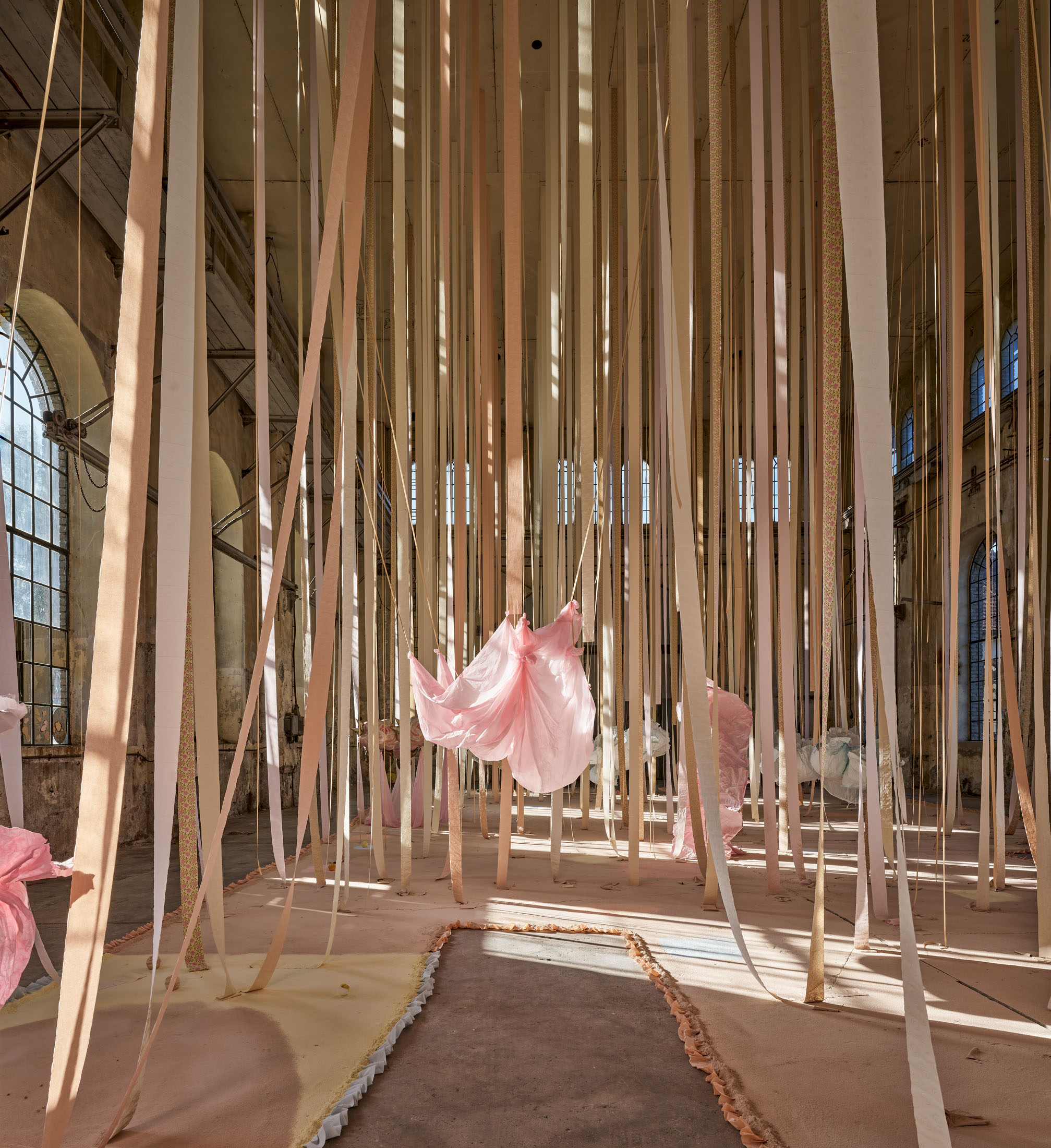 From the 11-metre-high ceiling hang countless strips of lightly coloured toilet paper throughout the room. Between them are strings from which hang silhouettes of hemispheres moulded in paper or translucent coloured foils, tied together to form wondrous, graceful shapes. The dangling and floating spheres are visually offset by the standing and reclining forms: in the clearings between the toilet paper and the strings, sculptures are placed that poetically combine standing paper and holding plaster moulds. The toilet paper ends on the floor, on surfaces made of sieved gypsum and pigment powder. The strips run out in these areas, the last, recumbent leaves covered by powder. The edges of the differently coloured areas are framed by crinkled toilet paper. Bath bombs in the form of cake pieces or in a floral design as well as make-up beads are scattered over the coloured ground. These floor works, covering the entire surface, create paths on which we can enter the fantastic landscape entitled “Safety As A Stance”. They also give the room a harmonious pastel palette of colours ranging from pink to peach to beige and yellow. When daylight or sunlight strikes the materials, they glow in their pastel hues and colour the entire ambience. This considerably intensifies the holistic experience of material and colour.
