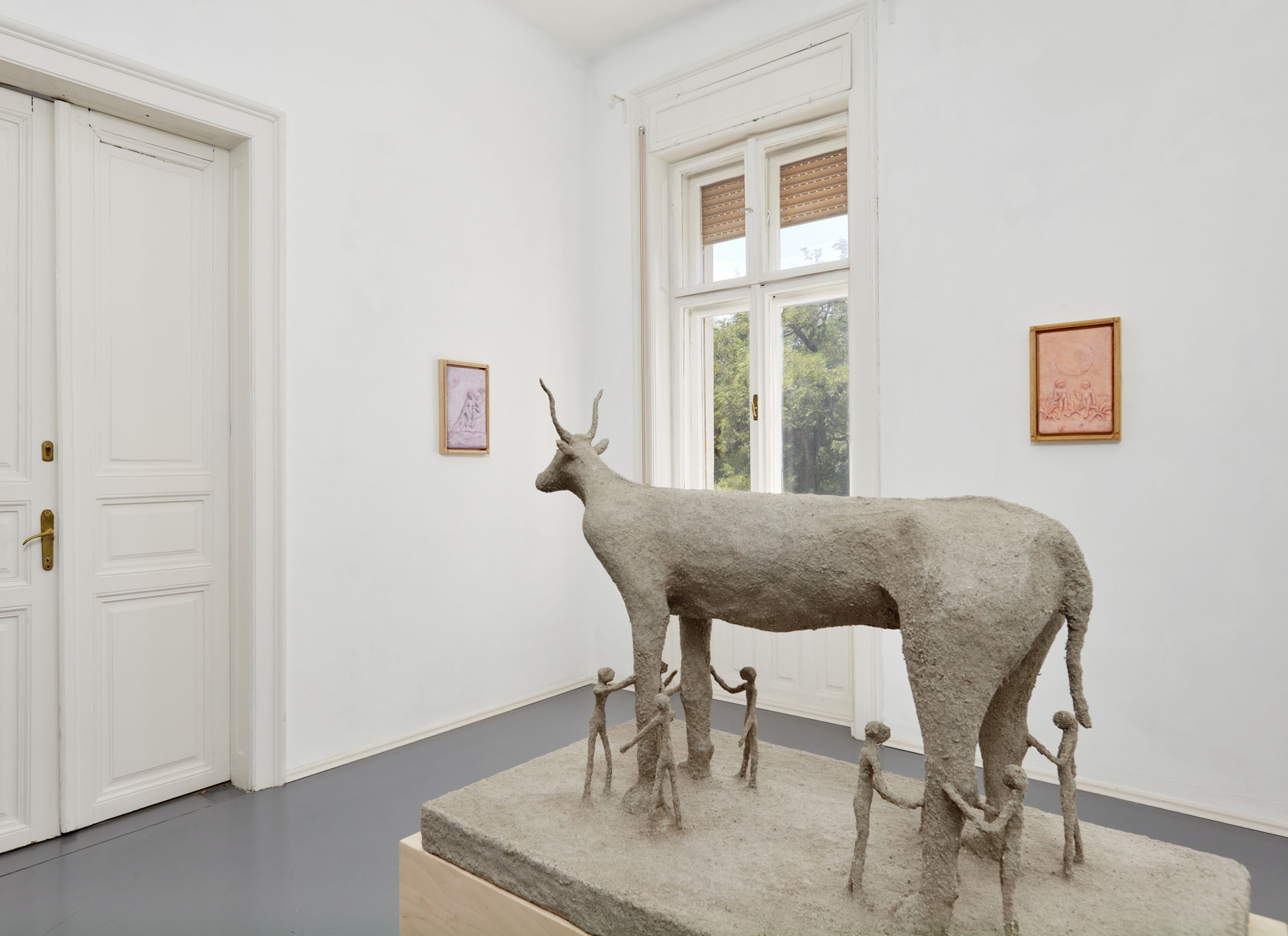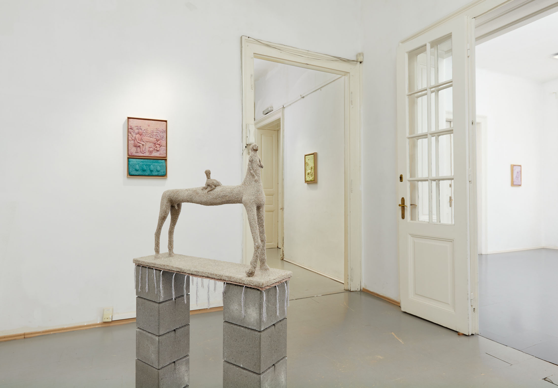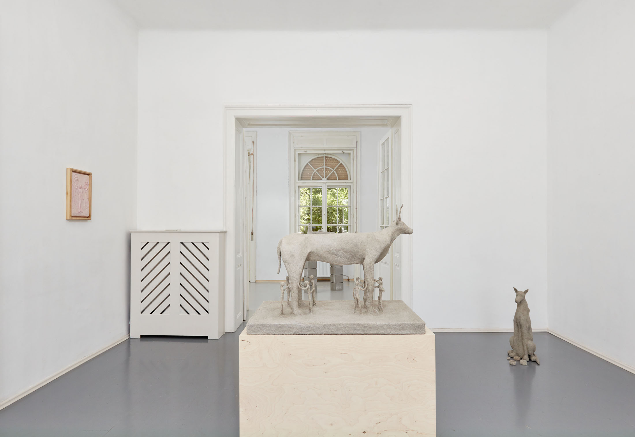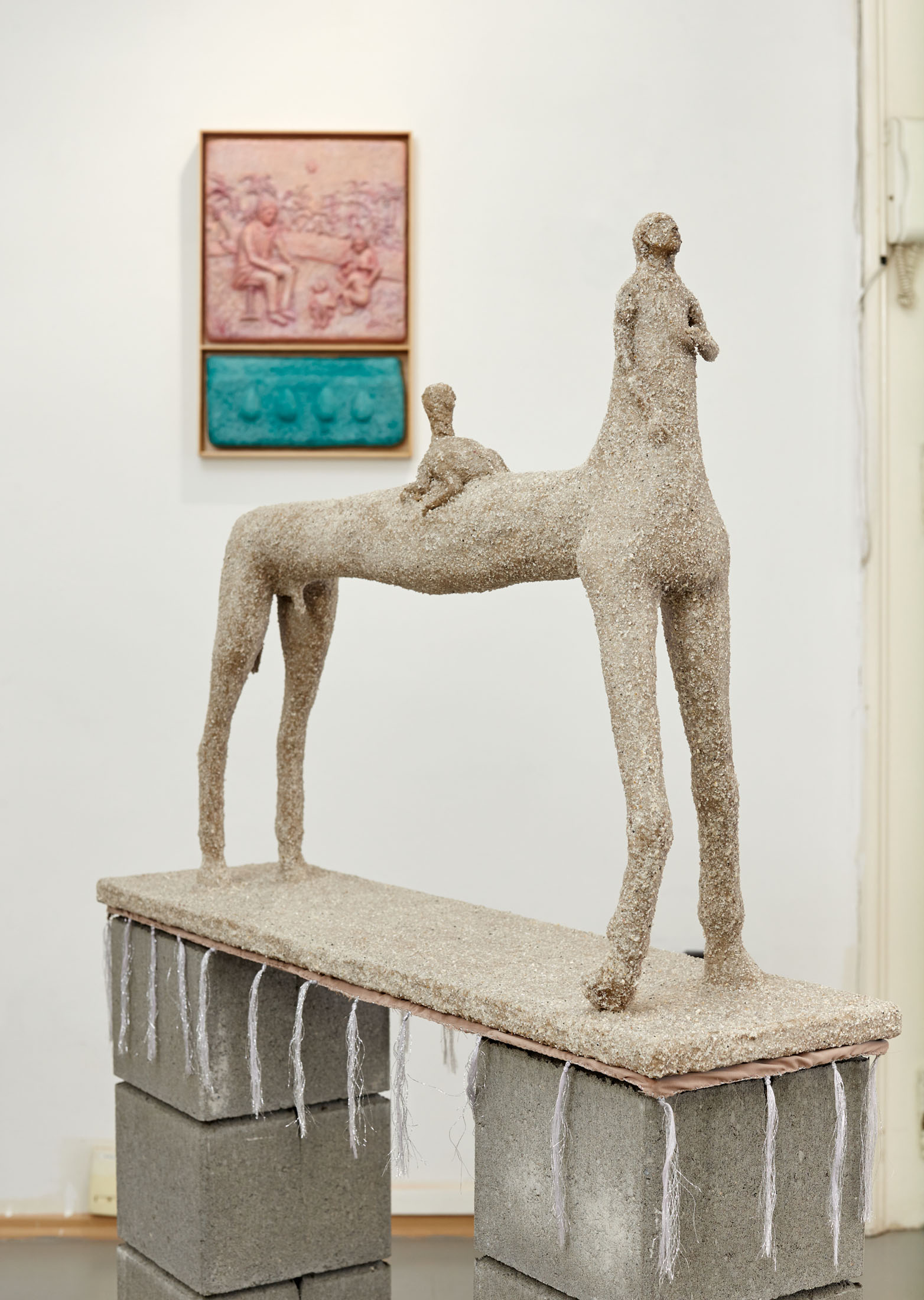 Tranker Kata’s first solo exhibition at Longtermhandstand unfolds through a series of new sculptures and hand-formed reliefs that draw on mythology, embodiment, and personal transformation. In Book of the Heavenly Cow, a timeless female figure takes shape, moving through layers of narrative and material, past and present. The exhibition is inspired by the Egyptian myth of the Book of the Heavenly Cow, in which the goddess Nut raises the sky above the earth to restore cosmic order after humanity’s rebellion. Tranker does not retell this story directly. Instead, she channels its atmosphere into tactile forms shaped by gesture, intuition, and memory. Her sculptures evoke a quiet aftermath—where the body holds the traces of both violence and healing. A series of wall reliefs follows the path of a primordial mother figure. Through bodily transformation, she becomes a vessel for the beginning of the world. These works explore the physical and symbolic layers of femininity, memory, and creation, combining lyrical detail with an elemental rawness. Tranker’s practice is rooted in process and repetition. Her works speak with a voice that is both intimate and ancient. Alongside this exhibition, she is currently featured in Habitat at the Hungarian National Gallery and was recently awarded the main prize at the Lokart Biennale in Pécs. Book of the Heavenly Cow invites viewers into a space where myth and matter meet, and where sculpture becomes a quiet, insistent act of world-making.
