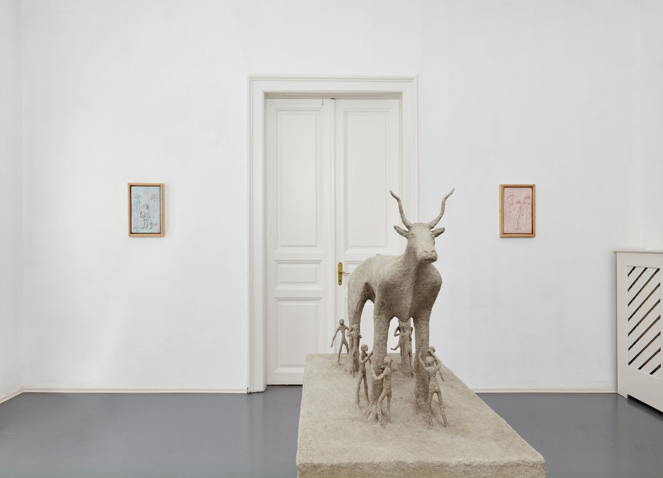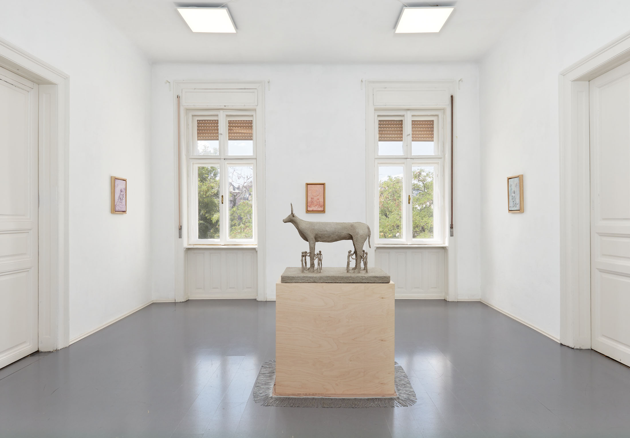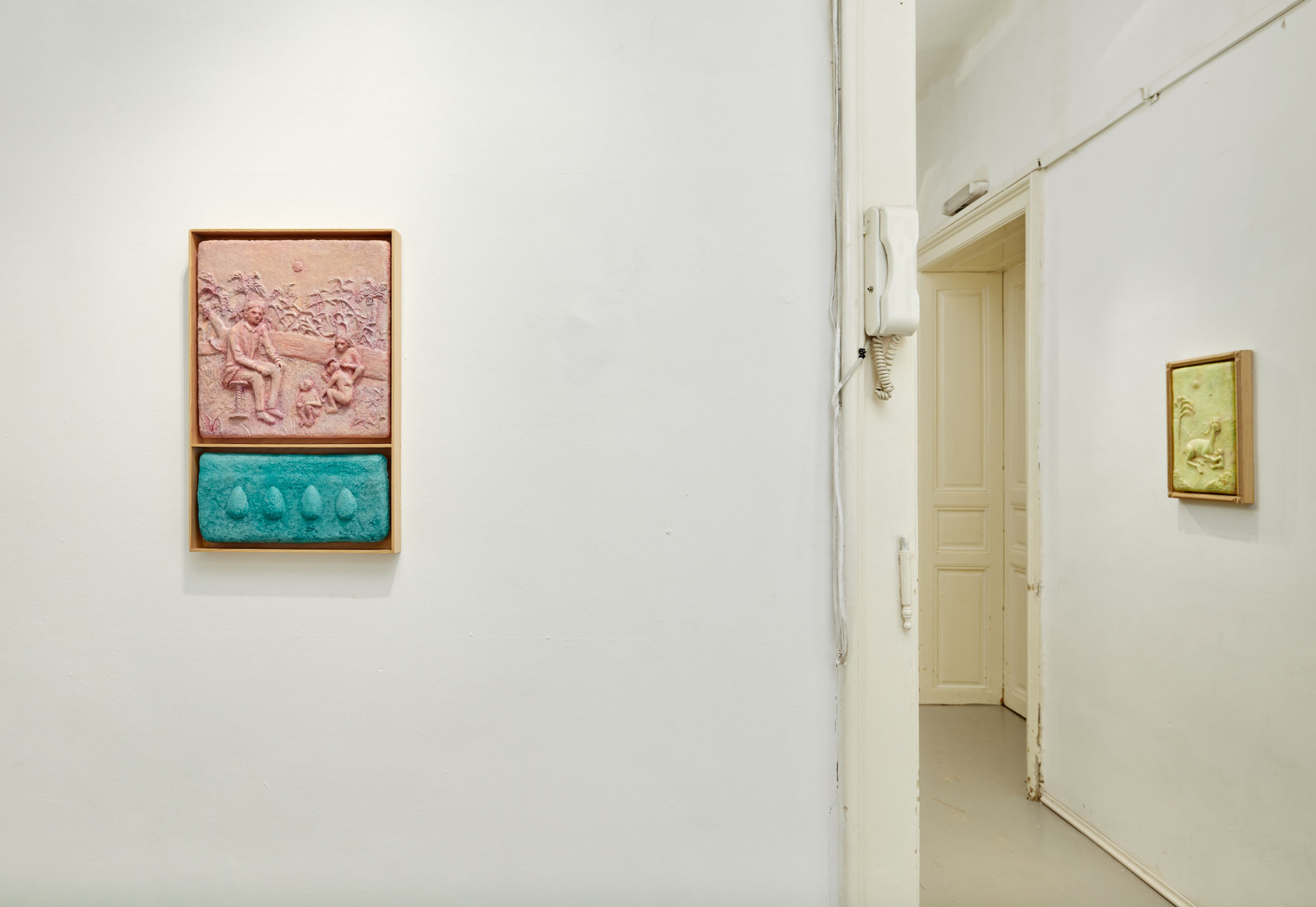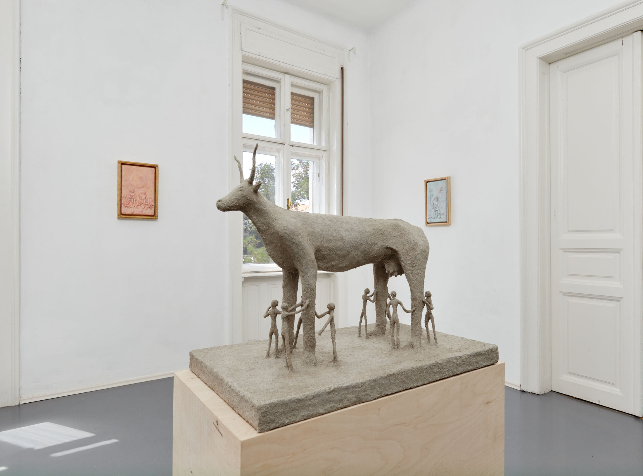 Tranker Kata’s first solo exhibition at Longtermhandstand unfolds through a series of new sculptures and hand-formed reliefs that draw on mythology, embodiment, and personal transformation. In Book of the Heavenly Cow, a timeless female figure takes shape, moving through layers of narrative and material, past and present. The exhibition is inspired by the Egyptian myth of the Book of the Heavenly Cow, in which the goddess Nut raises the sky above the earth to restore cosmic order after humanity’s rebellion. Tranker does not retell this story directly. Instead, she channels its atmosphere into tactile forms shaped by gesture, intuition, and memory. Her sculptures evoke a quiet aftermath—where the body holds the traces of both violence and healing. A series of wall reliefs follows the path of a primordial mother figure. Through bodily transformation, she becomes a vessel for the beginning of the world. These works explore the physical and symbolic layers of femininity, memory, and creation, combining lyrical detail with an elemental rawness. Tranker’s practice is rooted in process and repetition. Her works speak with a voice that is both intimate and ancient. Alongside this exhibition, she is currently featured in Habitat at the Hungarian National Gallery and was recently awarded the main prize at the Lokart Biennale in Pécs. Book of the Heavenly Cow invites viewers into a space where myth and matter meet, and where sculpture becomes a quiet, insistent act of world-making.
