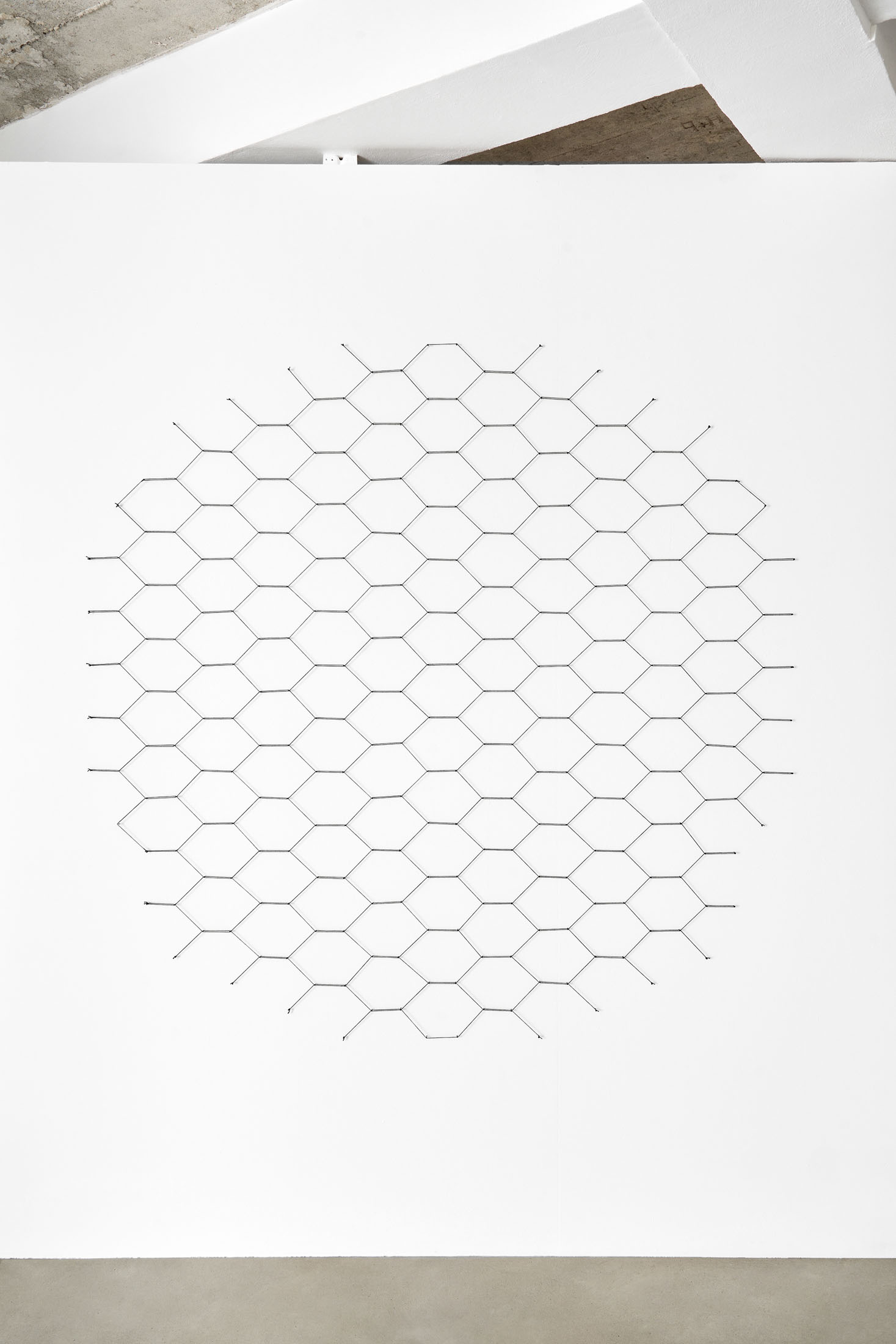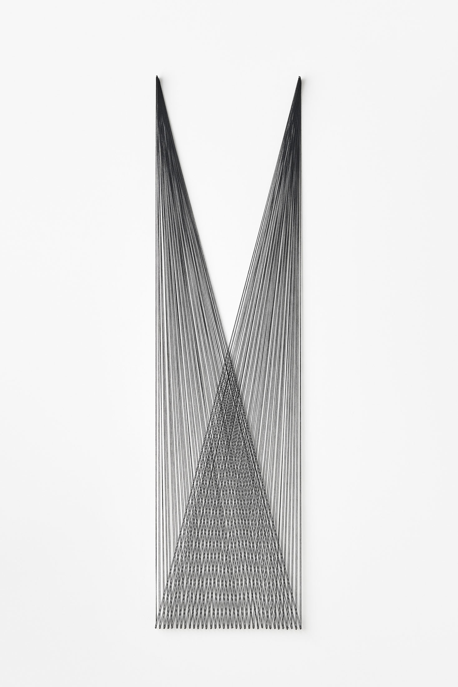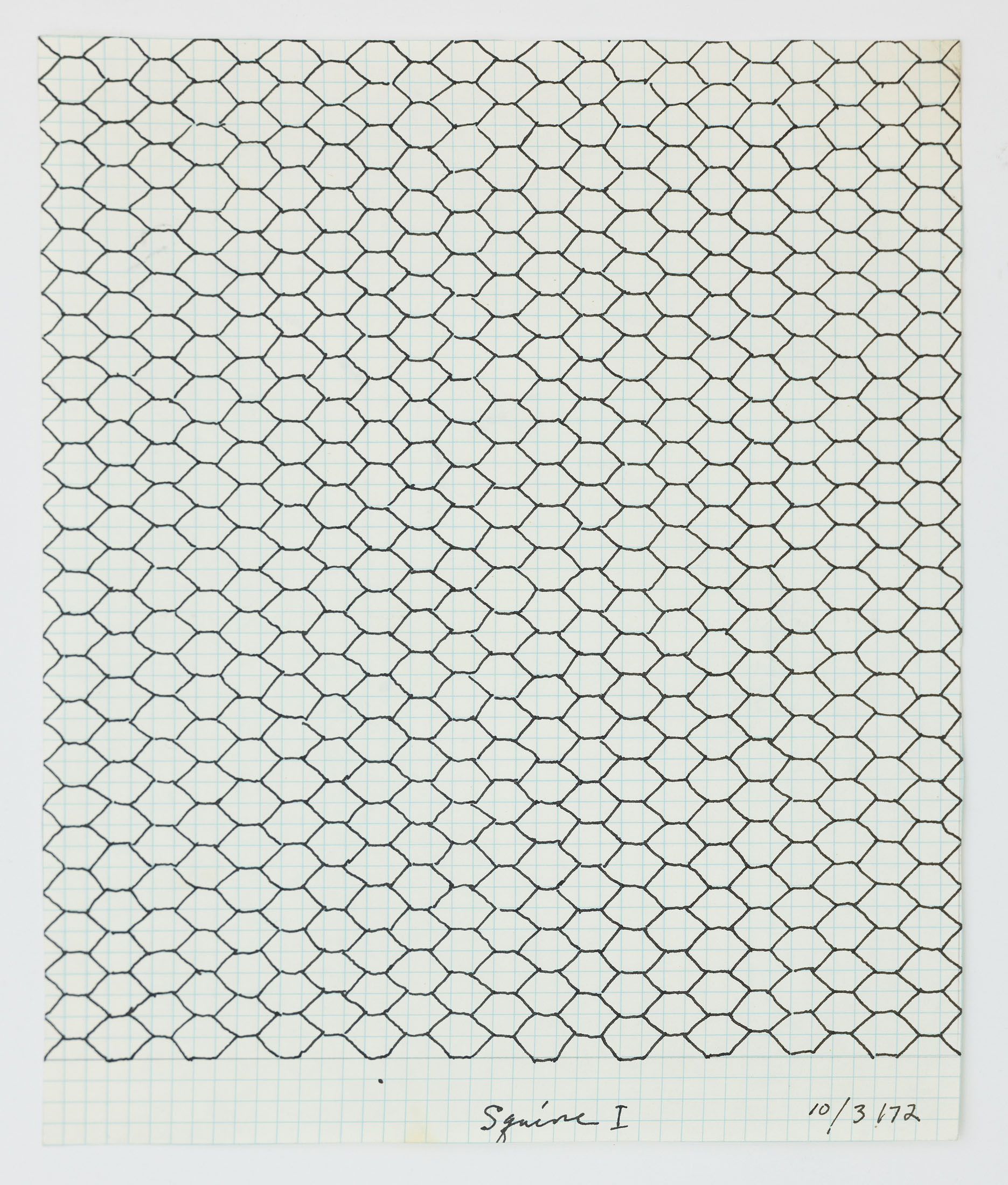 Dated October 3, 1972, the drawing Squire I shows Miyamoto combining vertical and 45-degree angled lines, reminiscent of a hexagonal honeycomb or cell-like structure. This geometric motif is then transferred to the second string construction on display, also entitled Untitled (1972). Here the strings double within the horizontal parts of each cell. The parallelism of the two horizontal strings accentuates the appearance of different line thicknesses. Once again, Miyamoto leaves the geometry of the work open-ended, with the hexagons remaining incomplete at the edges of the pattern, as if in anticipation of viral expansion. In both Untitled pieces, Miyamoto creates open and expansive patterns that suggest rhythm or progression, rather than finite shapes.