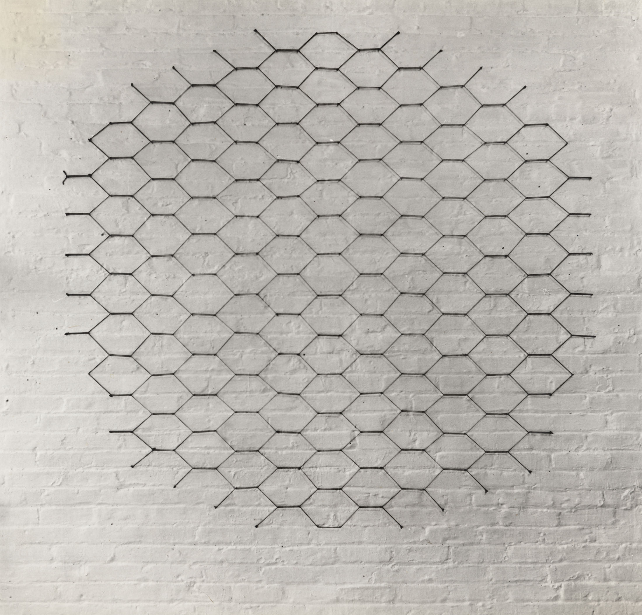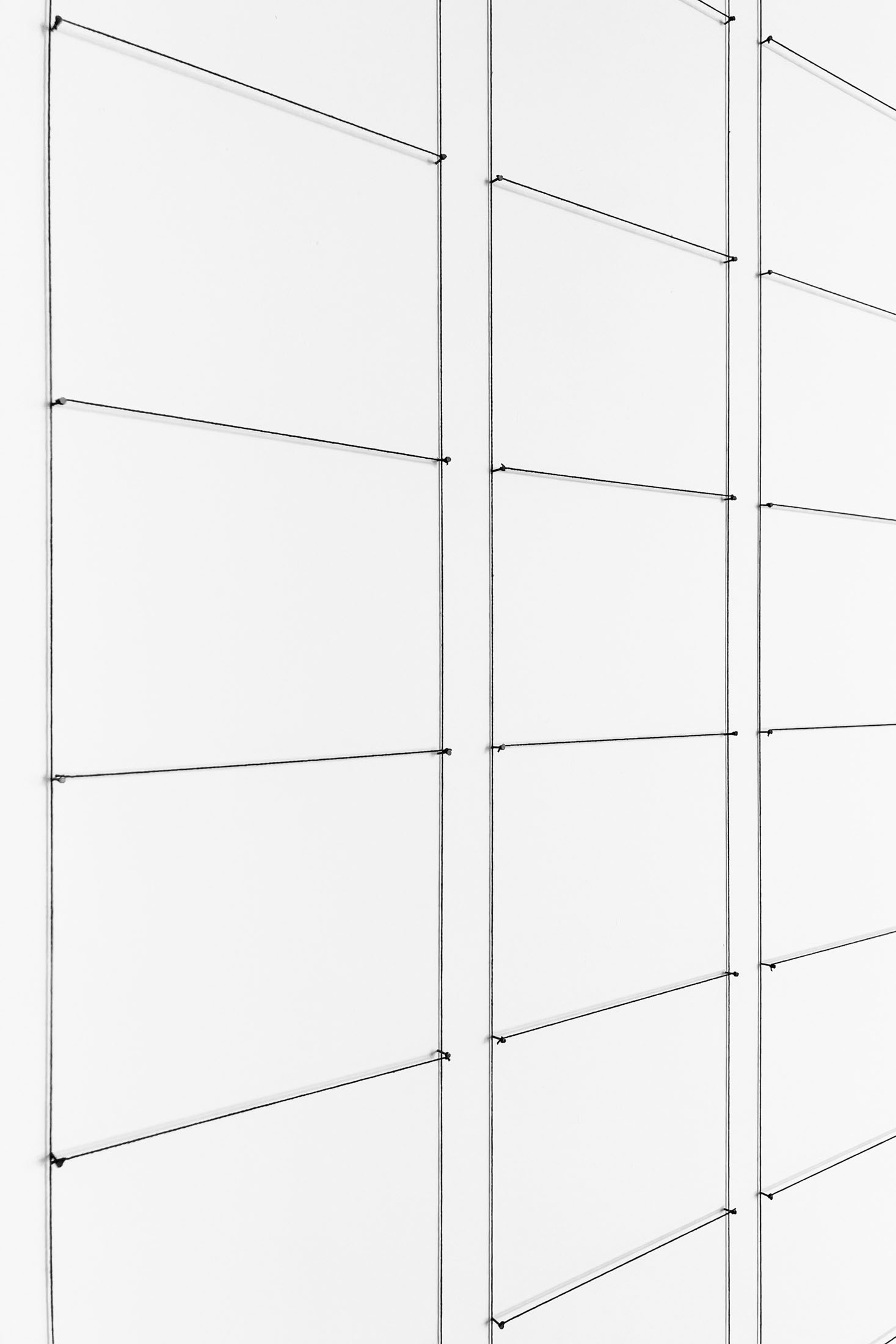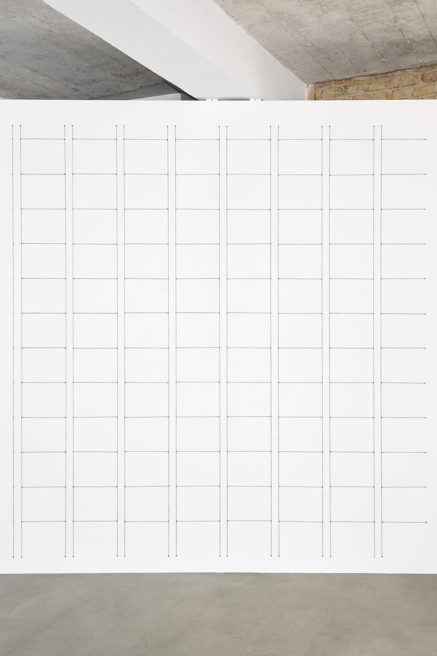 Consequently, the three string constructions on display stem from the work String along mortar Line (1972) and showcase three geometric motifs that were potentially explored consecutively. Untitled (1972) rotates the horizontal lines of String along mortar Line (1972) by 90 degrees, connecting the top and bottom mortar lines of the studio wall with vertical strings with their distance to each other referring to the horizontal dimension of the bricks. A grid of nails connected with shorter horizontal strings sits in-between these vertical lines, adding a second layer and spatial dimension to the work. The horizontal and vertical layers are independent of one another, with no nail being used twice. Furthermore, the vertical strings are positioned at the bottom of the nail and recede from the horizontal lines that are positioned at the top of a nail. Collectively, the vertical and horizontal lines form spatial squares that appear to be floating on top of the wall itself. When viewing this string construction from a distance, it becomes evident that the first vertical line is doubled – or the final vertical line is missing leaving the final squares unclosed. The result is an open system with an almost filmic appearance of pattern running endlessly across a plane. This infinite quality is also evident in the second piece on display, which is also from 1972.