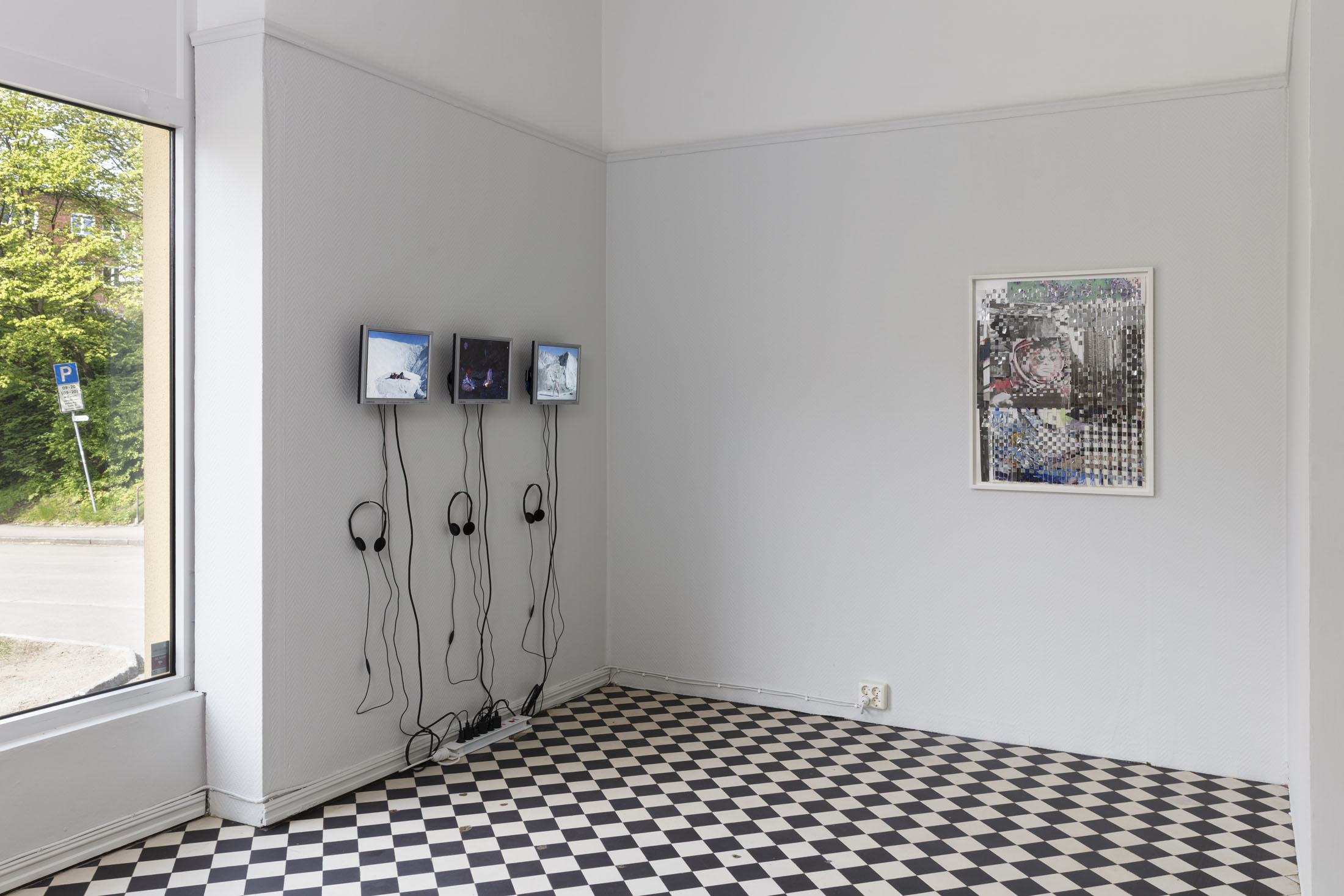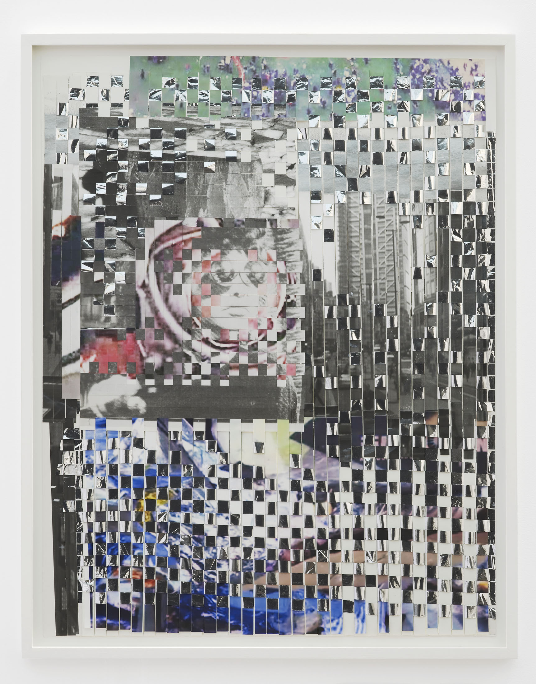 The exhibition springs from Eline McGeorge’s Cosmo Deren Weave (A World of Our Own), a shimmering tapestry she created in 2012. The piece interweaves a portrait of the Ukrainian-born American avant-garde filmmaker Maya Deren into the helmet of Russian cosmonaut Valentina Tereshkova, the first woman in space. Cosmo Deren is set within a landscape composed of imagery from the “No Cuts” protests and the Occupy movement in London in 2011, and strips of emergency blankets, a material invented for space travel and associated with protest, crisis and displacement.