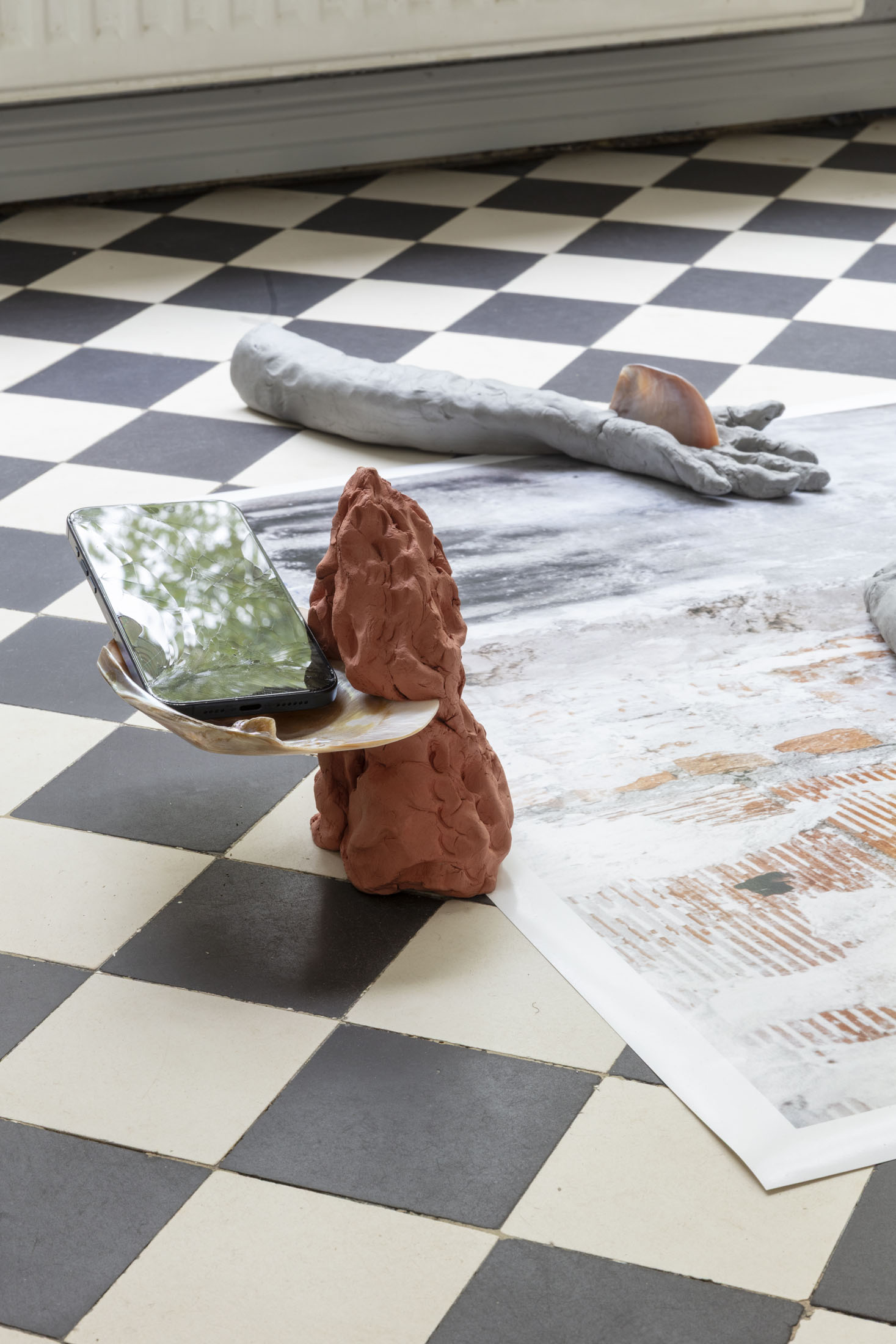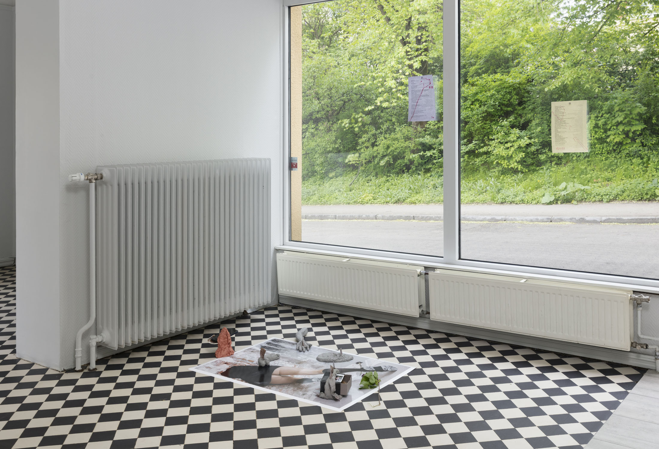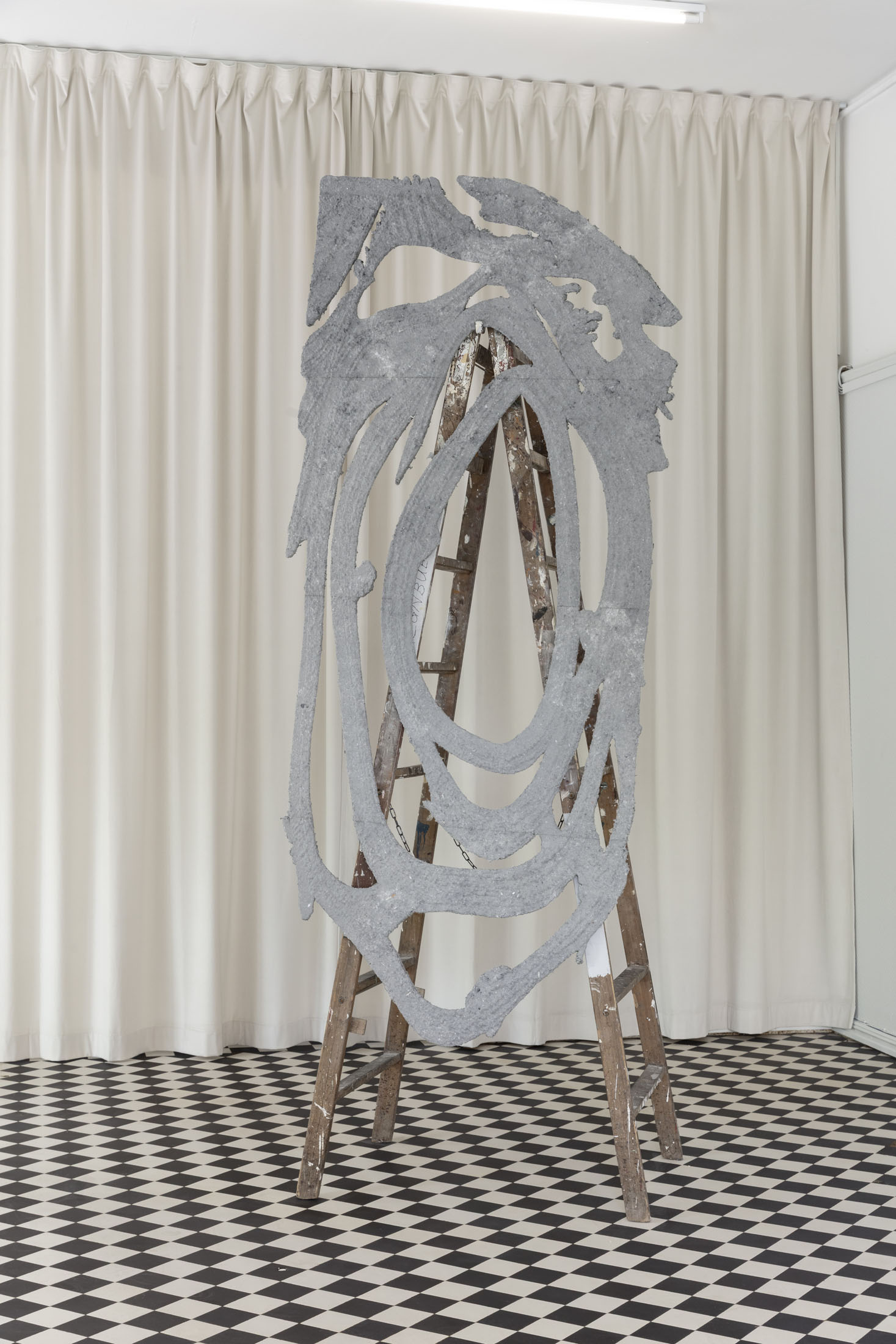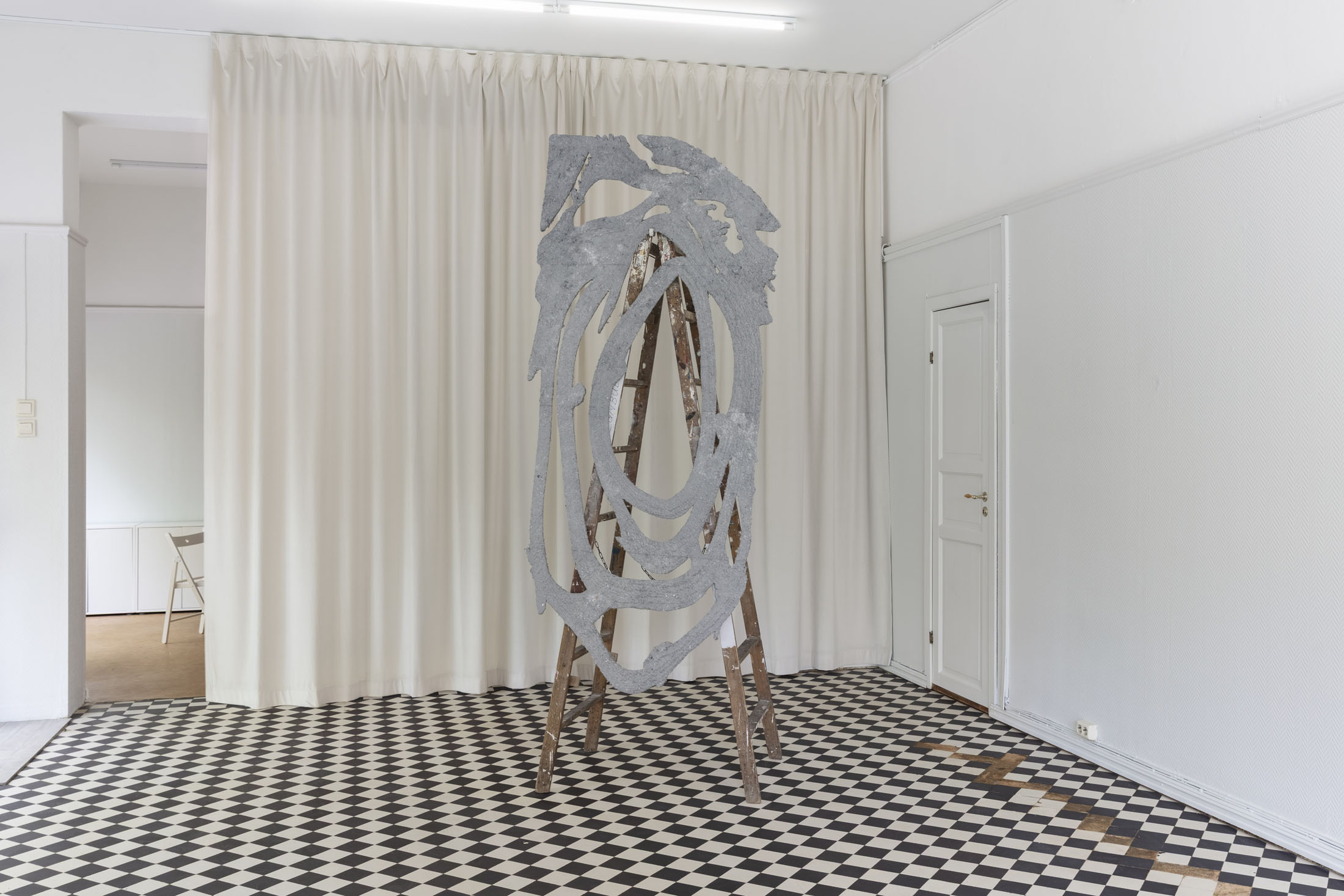 Damla Kilickiran’s Dark Entries takes form from the artist’s own visual archive, sourced from public spaces in Oslo. It consists of ornaments and shapes that bear the traces of having been forgotten, like remnants of a bygone era. Rather than relying on familiar representations, Kilickiran gravitates toward the strange and estranged, favouring these over images that depict a world perceived as diluted. Cast into a door-like form cut from XPS boards—a construction material commonly used for façade insulation—the concrete-grey drawing in papier-mâché has loosened from its mold, undulating between image and sign, the private and the public, the inner and the outer.