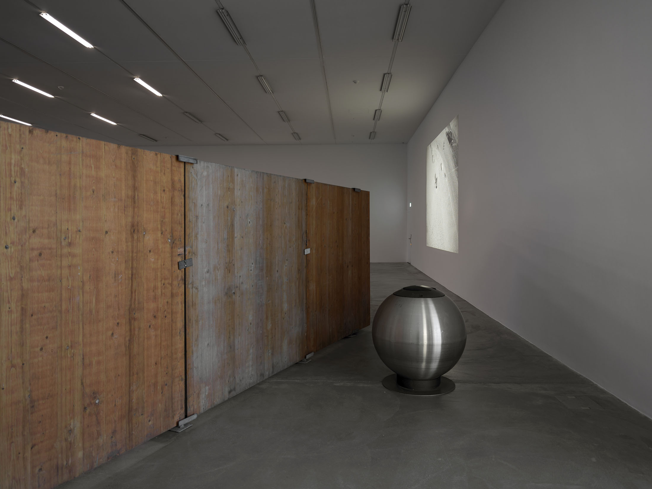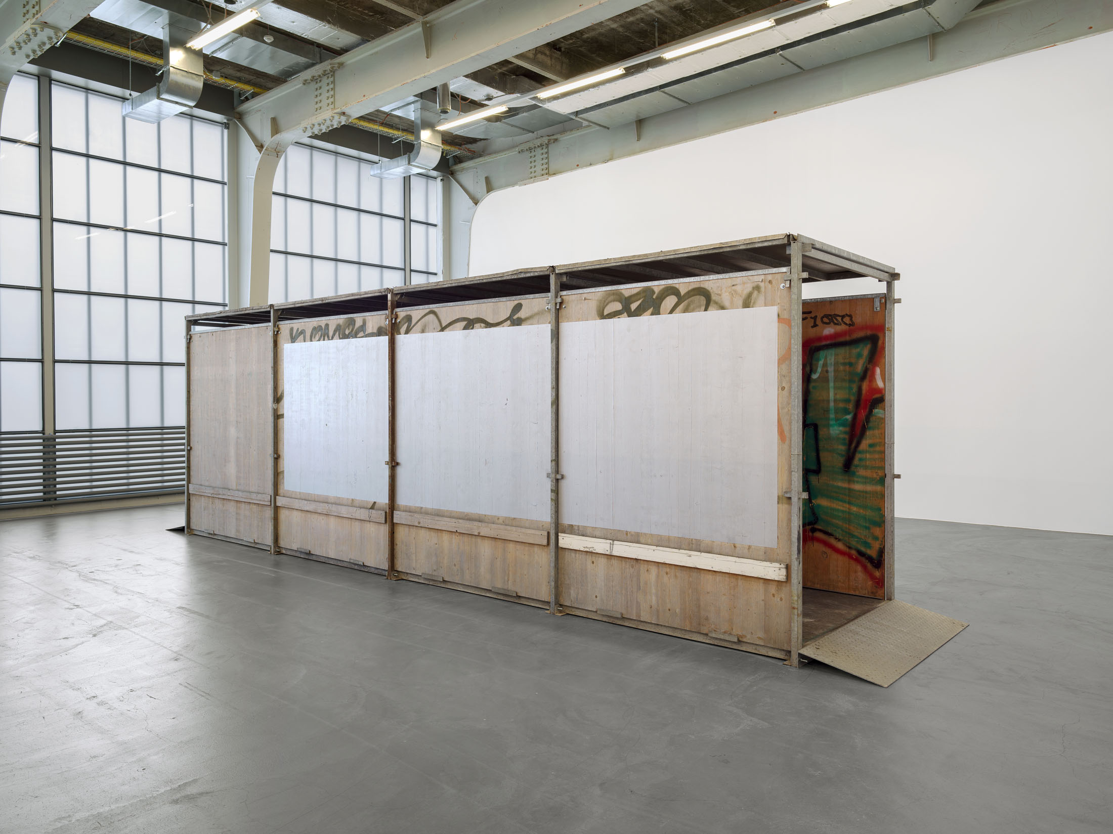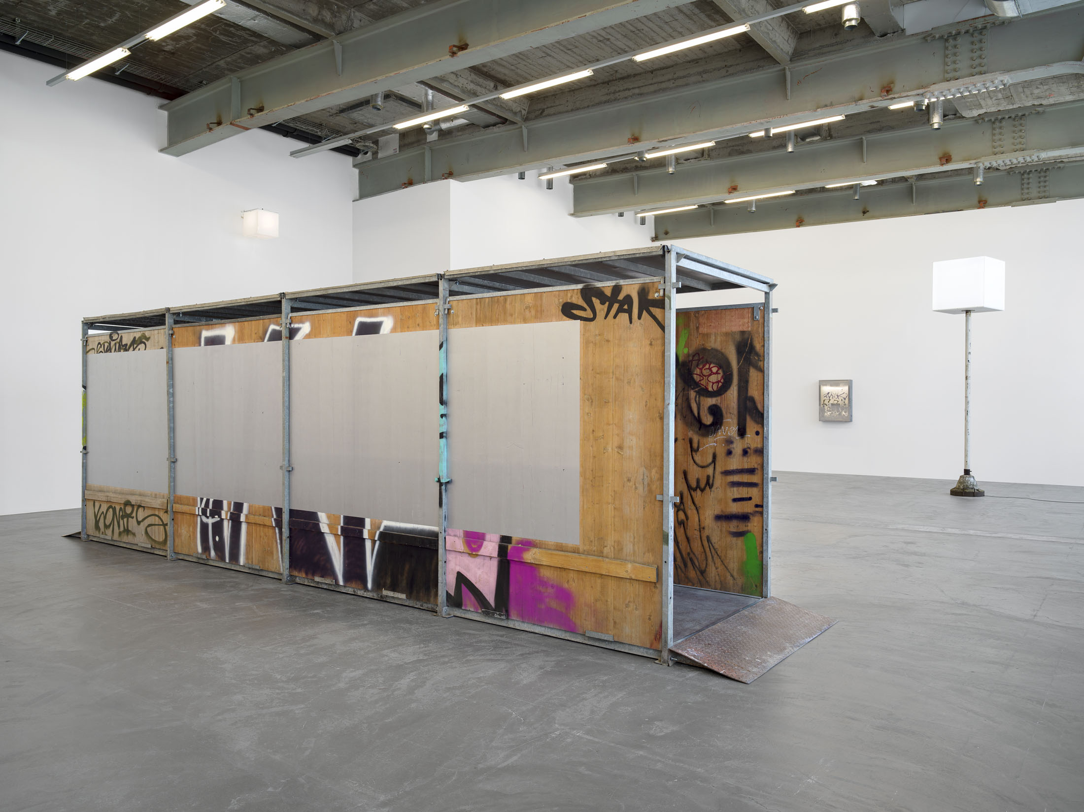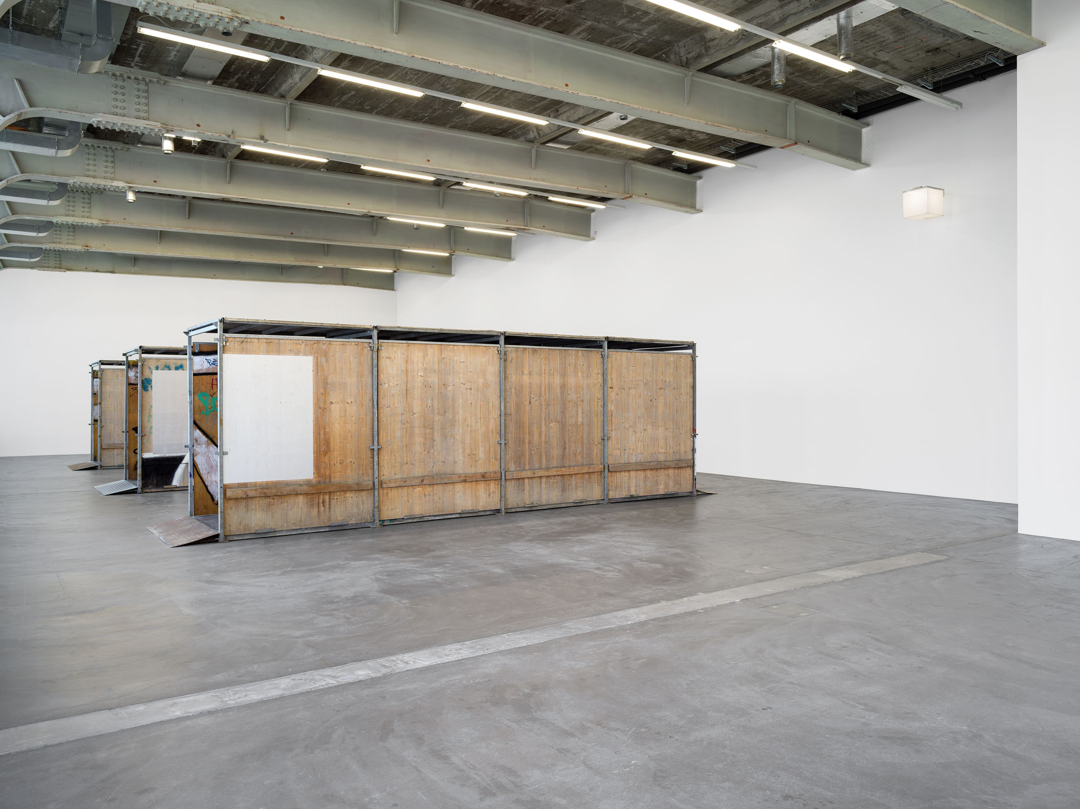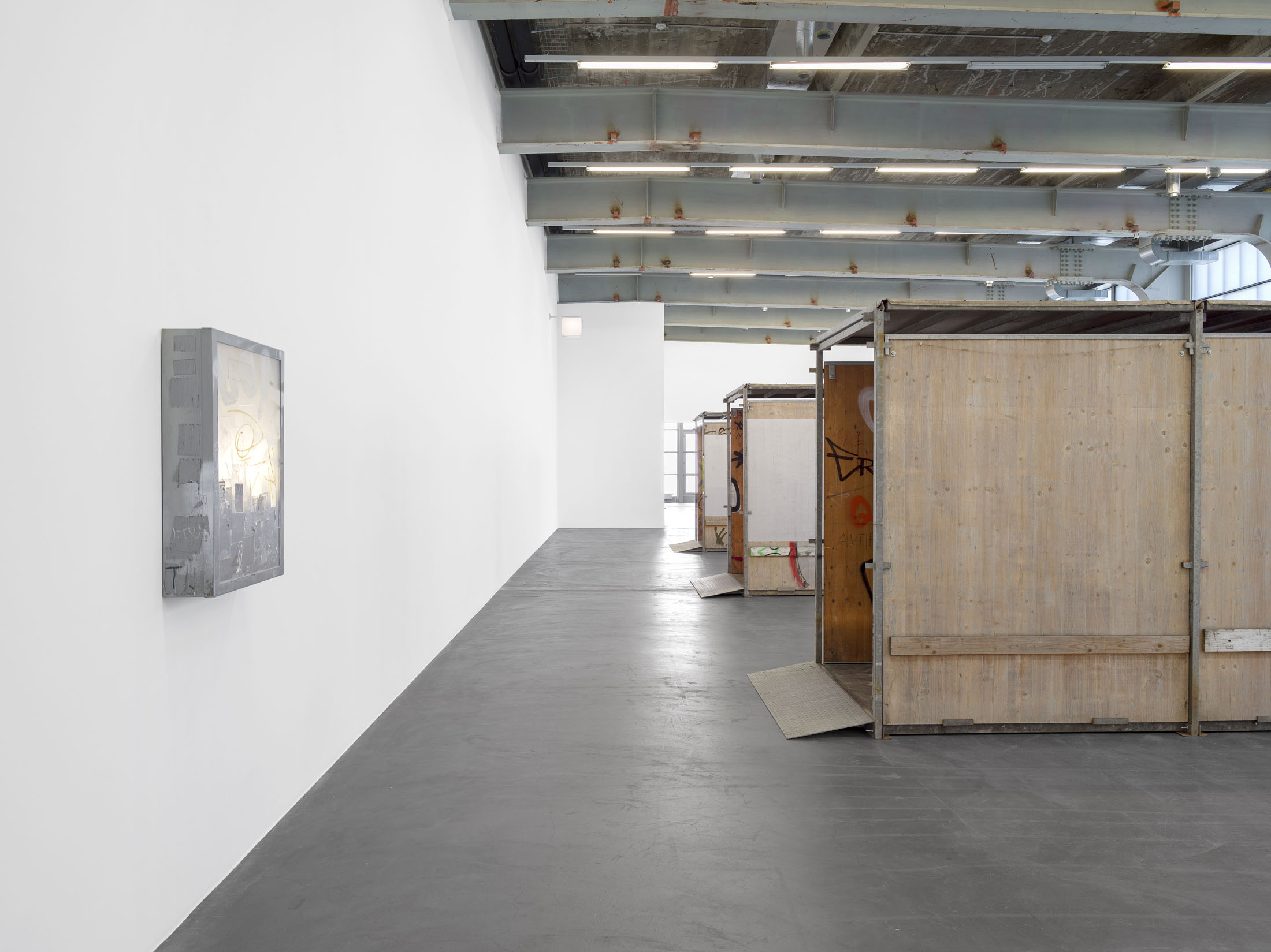 The fact that public space is not only materially coded, but also inherently performative, is made evident in Lidén’s work Gang Gang Gang, 2025. The modular sculpture consists of temporary passageways, as used to protect pedestrians near building sites. Layers of graffiti, dirt and other signs of use are visible on the wooden panels, sections of which the artist has treated with reflective paint. This found architecture invites visitors to move through and around the elements and notice not only their otherwise unremarkable or obvious features, but also to consider how they are deployed everyday as a tool in the urban realm.