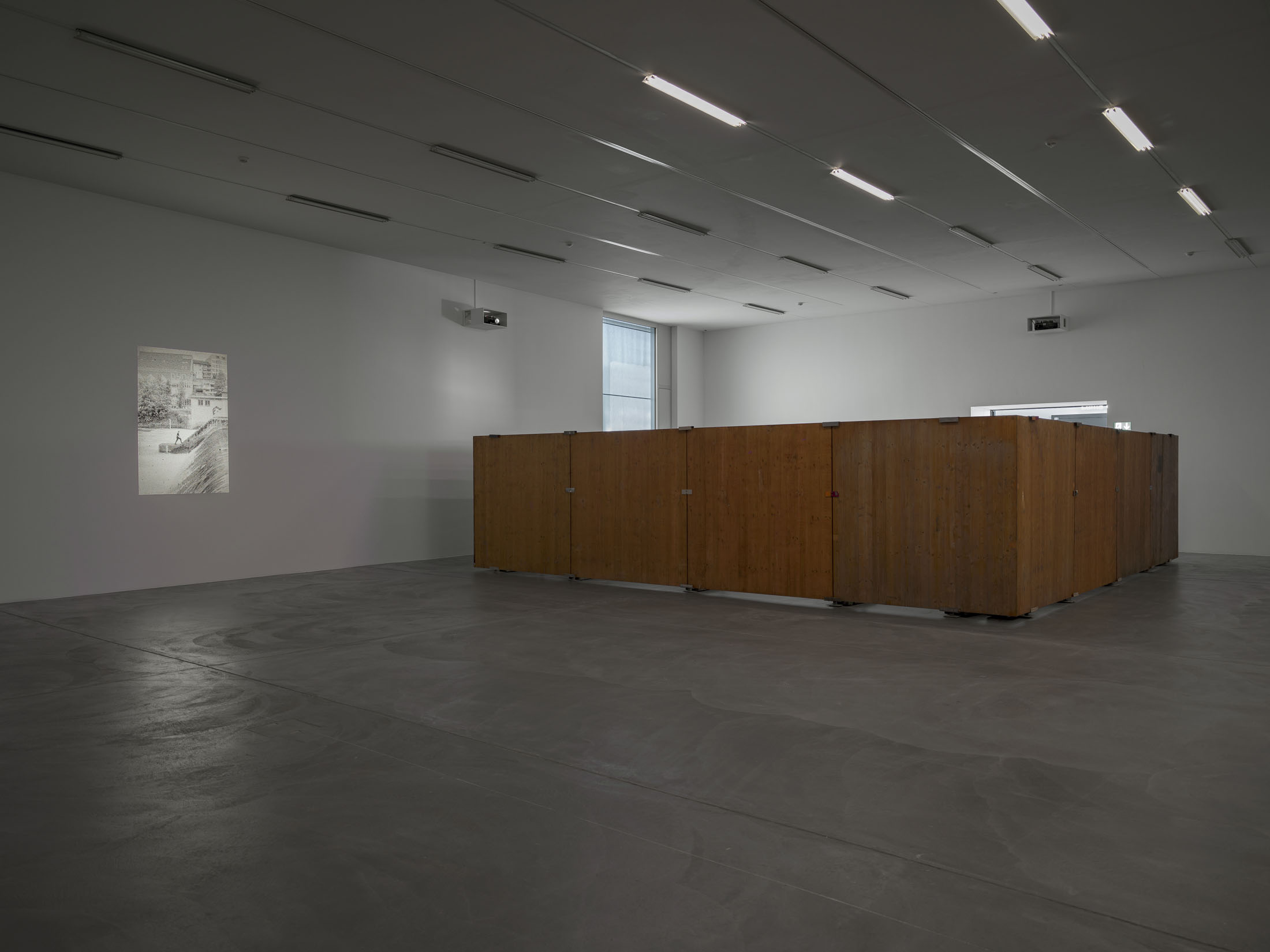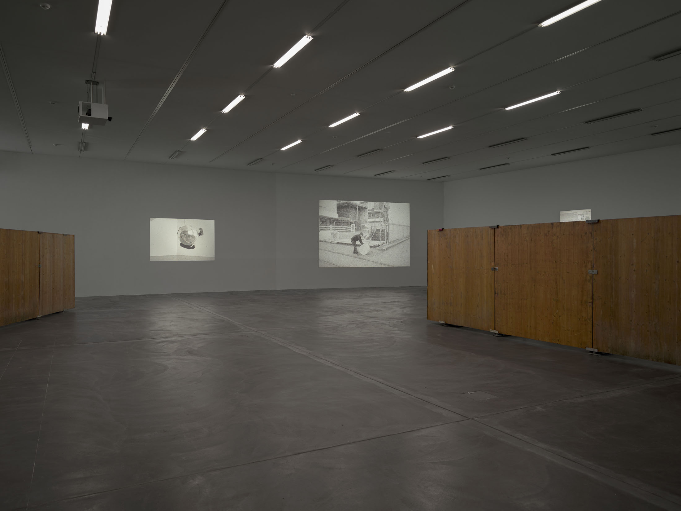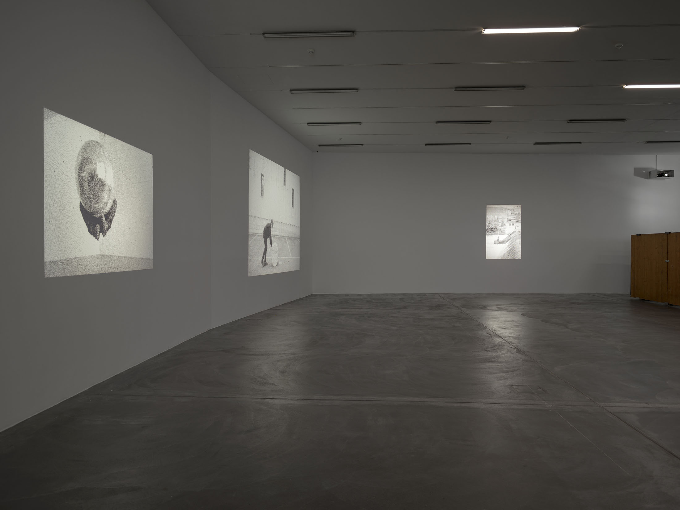 Finally, the artist’s own physical presence takes centre stage in large-format slide projections. The handmade slides – inkjet-printed video stills transferred to clear acetate, cut by hand and mounted – which are projected onto the walls in various sizes, show Lidén enacting new performative actions realised for this exhibition. The coarse-grained black-and-white images document the artist’s slapstick-like attempts to break free from social rules and conventions. Whether walking across a Zürich weir, repairing her bicycle in Berlin or transporting her works through the streets – “the question of re-appropriating privatised, urban space always somehow begins with the body, its ways of moving and the temporalities it engages,” says Lidén.