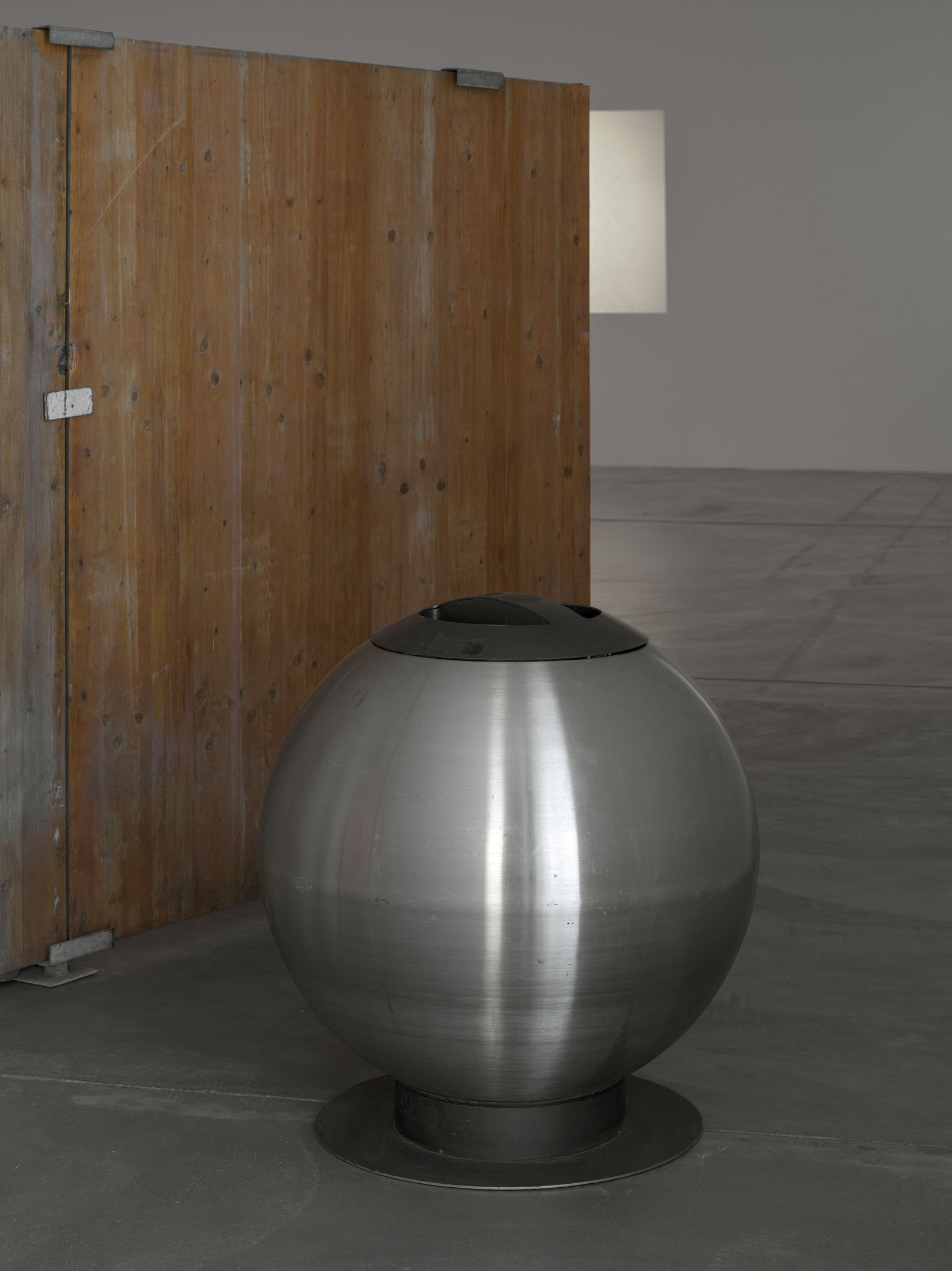 On the upper floor, the body as both the medium with agency to explore and the subject of spatial governance is also highlighted by the monolithic presence of the two closed cuboids Ring (Nuts) and Ring (Zomb), 2025. Made from building site fences the large-scale sculptures are reminiscent of the reduced vocabulary of minimal art. Their placement at the entrance to the exhibition and in front of the room’s two windows confronts visitors with questions of accessibility and exclusion, while creating hidden spaces – niches and corridors – for other works. Her ongoing series Untitled (Trashcan) is a collection of waste bins from various cities. While stripped of their original function, they still serve as portraits of their respective places of origin.
