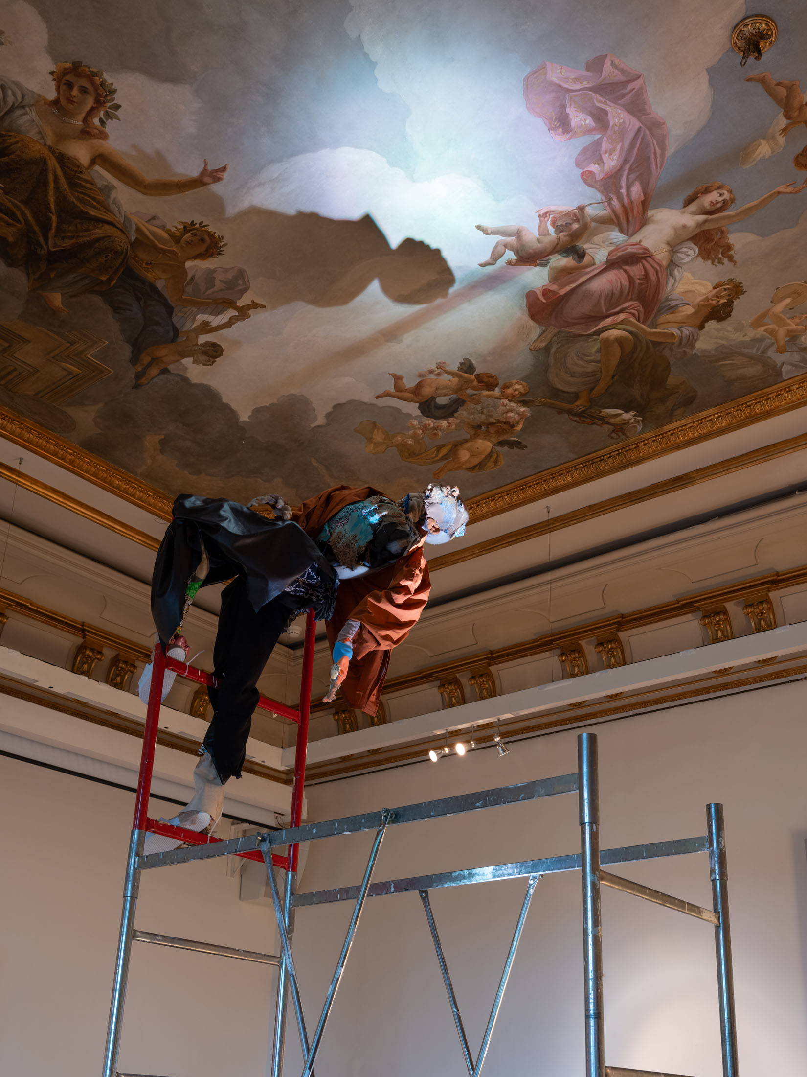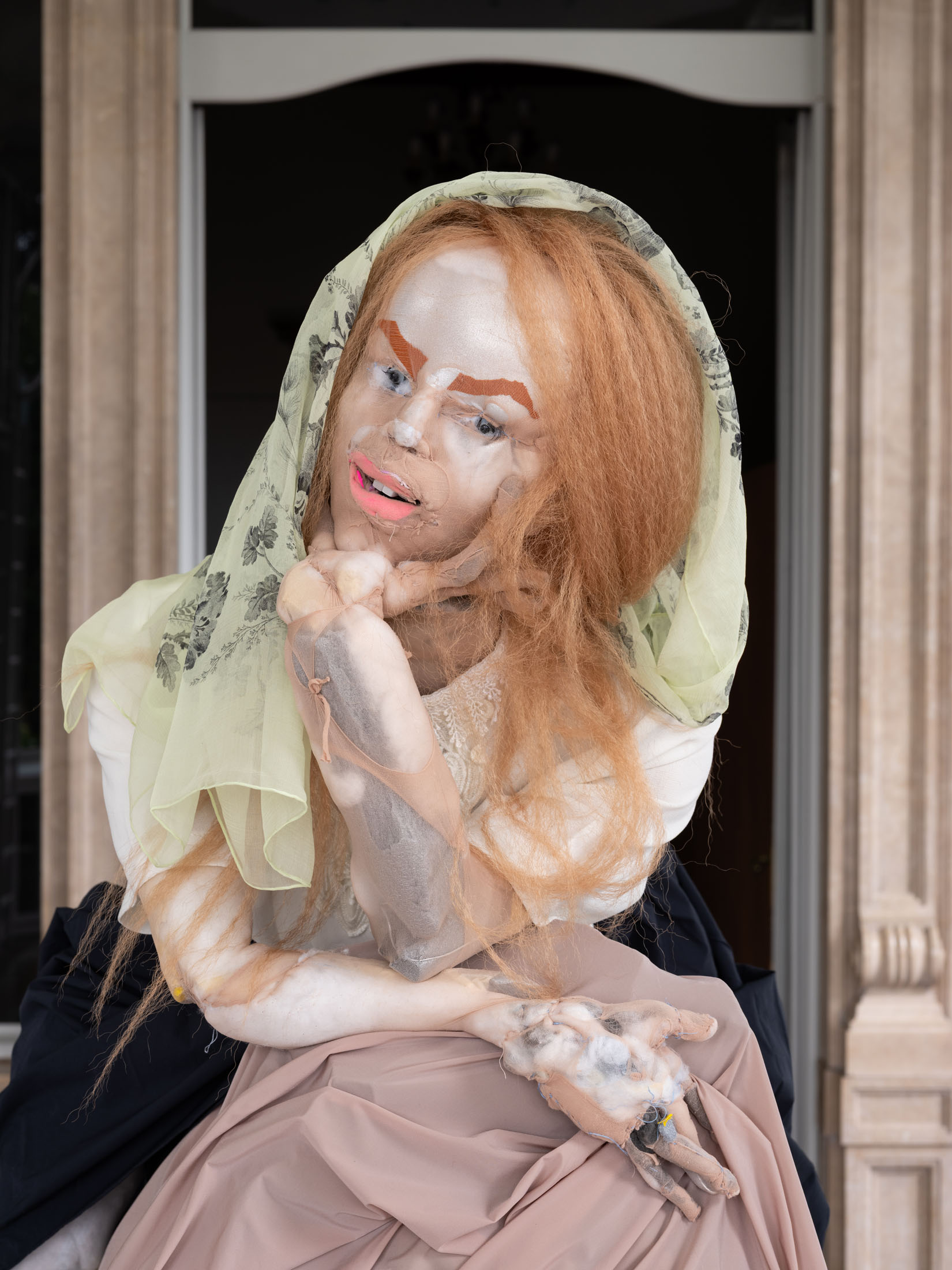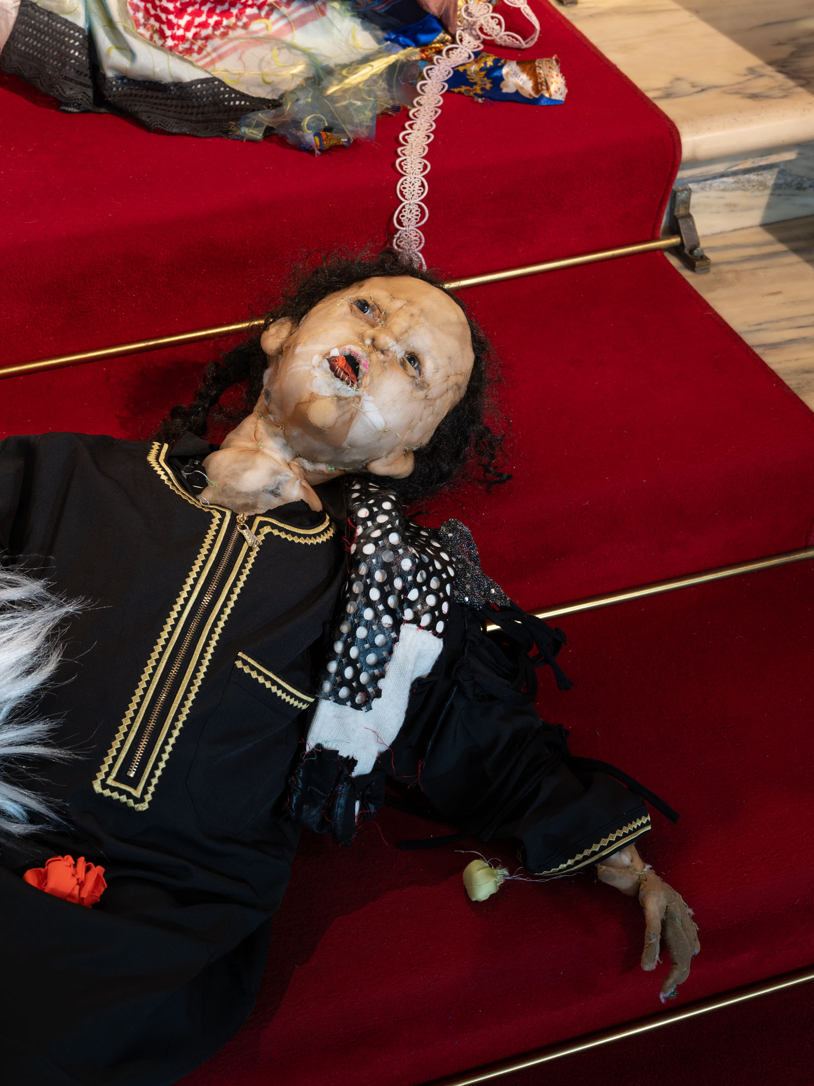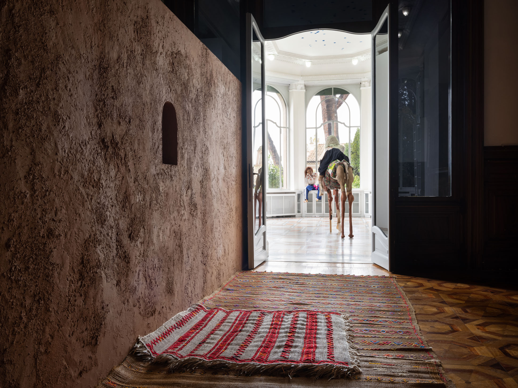 Central to the exhibitionare Wiersch’sprotagonists,doll-likefigureswho embodyhybrid,unstable identities.Neitherfully animate nor inanimate,these characters bear the marks of migration,trauma and conflict.Placed withinconstructedsets, they oscillatebetweenhistoricalfigures,hired actors, and exhibitionvisitors: as you walk throughthe villa’s rooms you may come across Kahina, the legendary Amazigh queen, or a workerrepaintingthe villa’s frescoes,or Gertrude Bell with her camel loosely resembling Nicole Kidman in QueenoftheDesert. Confrontingthe viewer’s gaze, the characters reflect back inherited narratives of powerand otherness,revealing how identities are continuouslyproduced through repetition,performance, and institutional frameworks.