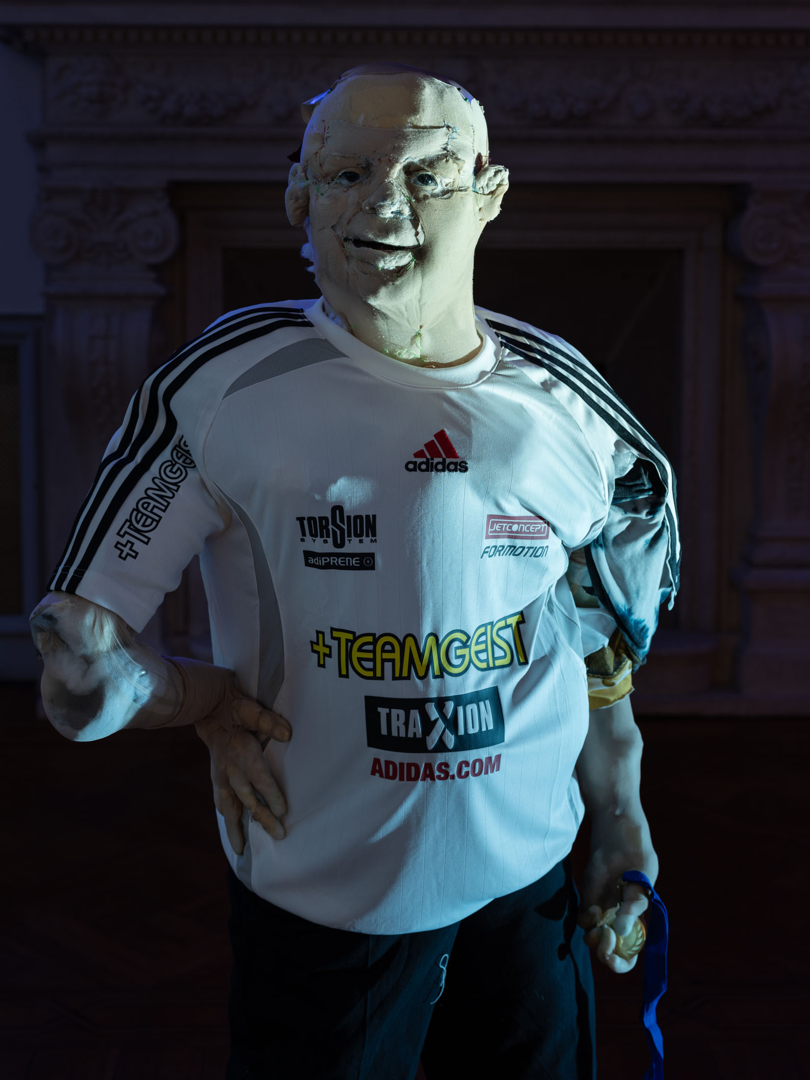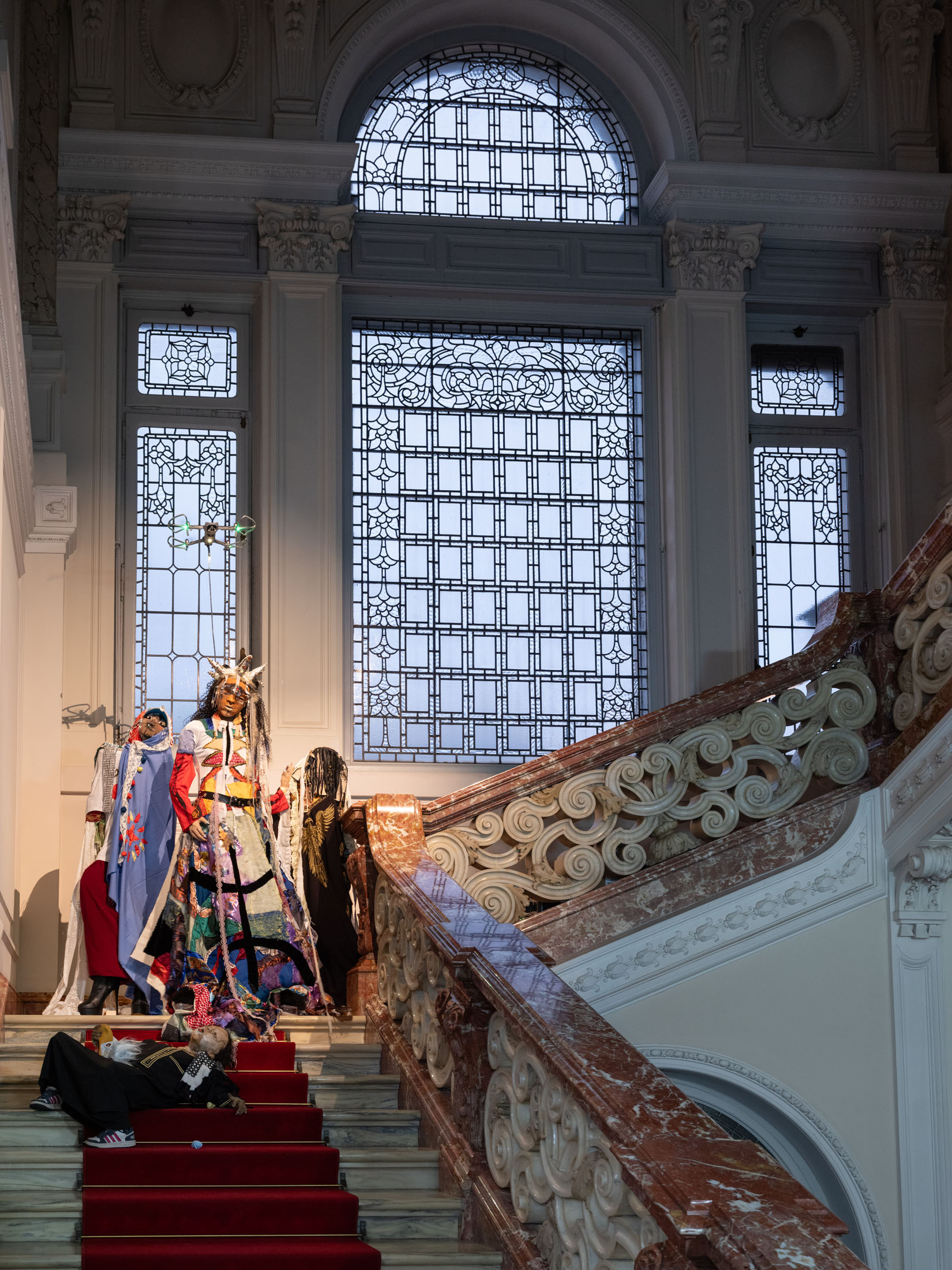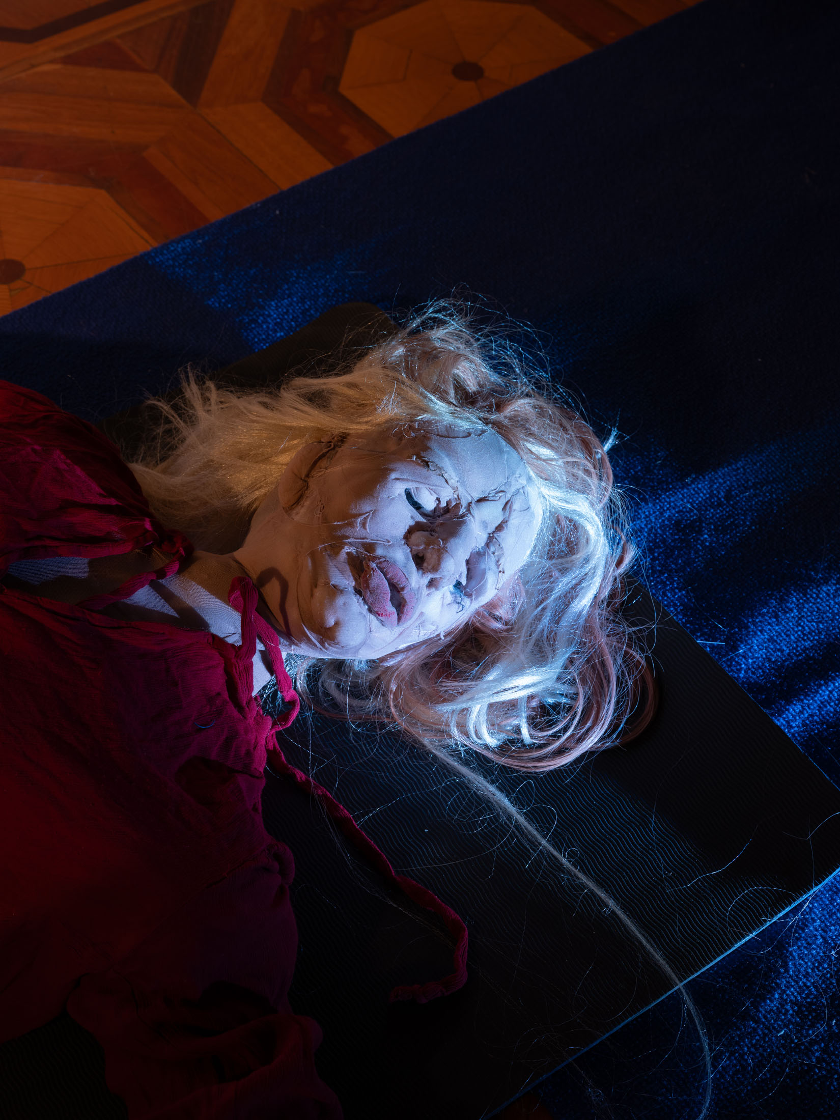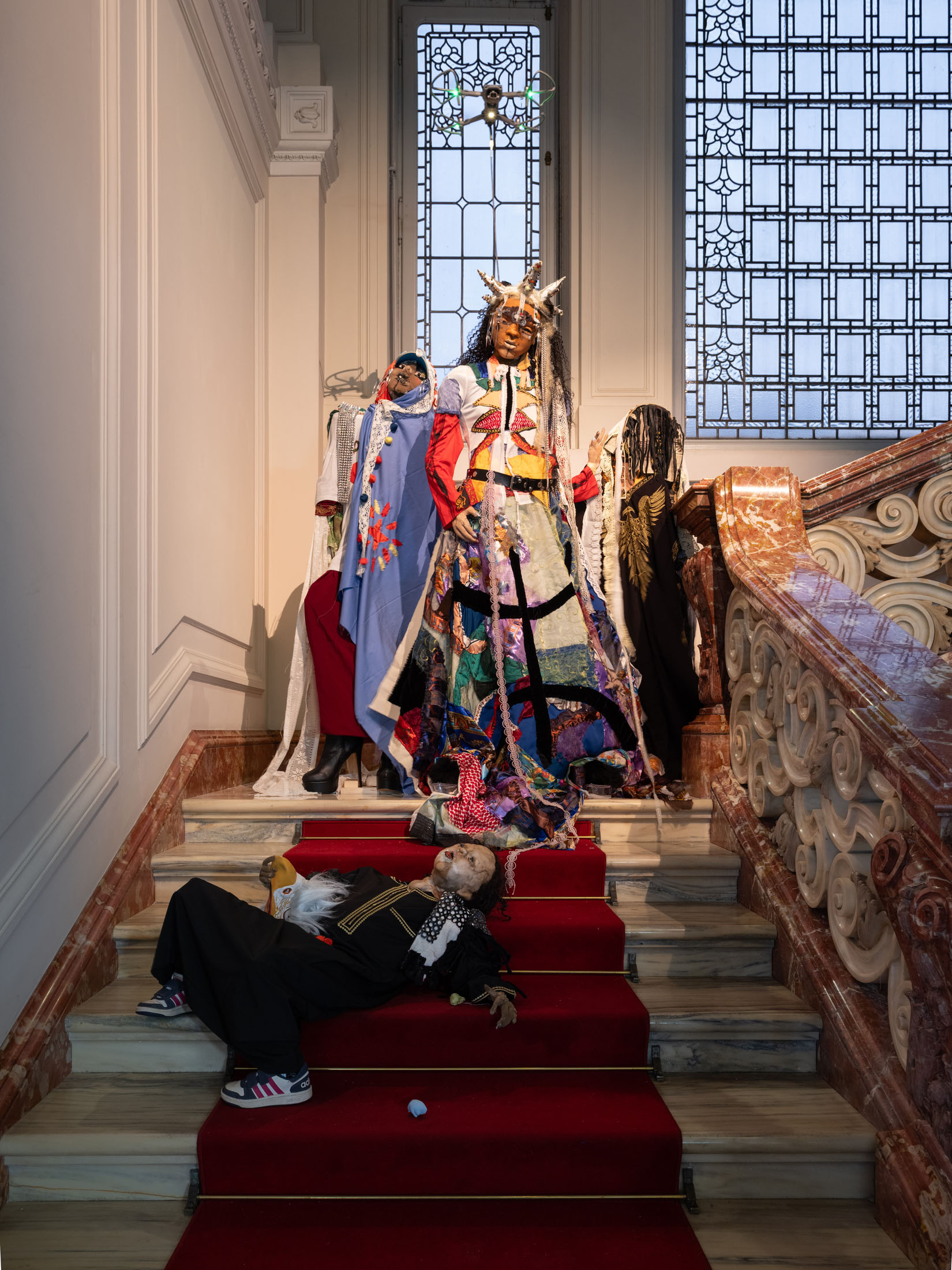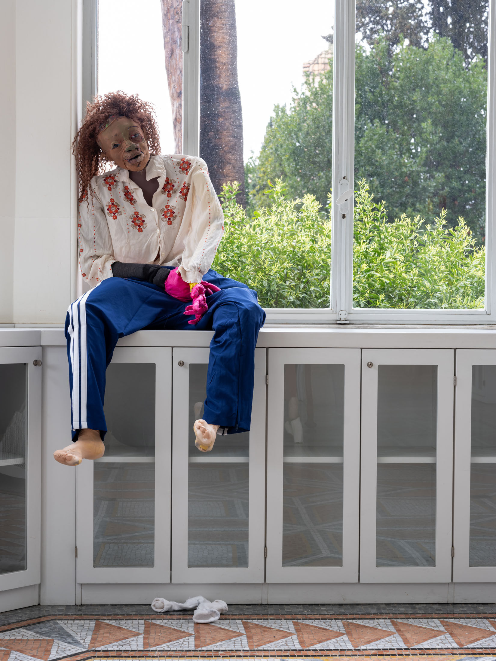 Central to the exhibitionare Wiersch’sprotagonists,doll-likefigureswho embodyhybrid,unstable identities.Neitherfully animate nor inanimate,these characters bear the marks of migration,trauma and conflict.Placed withinconstructedsets, they oscillatebetweenhistoricalfigures,hired actors, and exhibitionvisitors: as you walk throughthe villa’s rooms you may come across Kahina, the legendary Amazigh queen, or a workerrepaintingthe villa’s frescoes,or Gertrude Bell with her camel loosely resembling Nicole Kidman in QueenoftheDesert. Confrontingthe viewer’s gaze, the characters reflect back inherited narratives of powerand otherness,revealing how identities are continuouslyproduced through repetition,performance, and institutional frameworks.