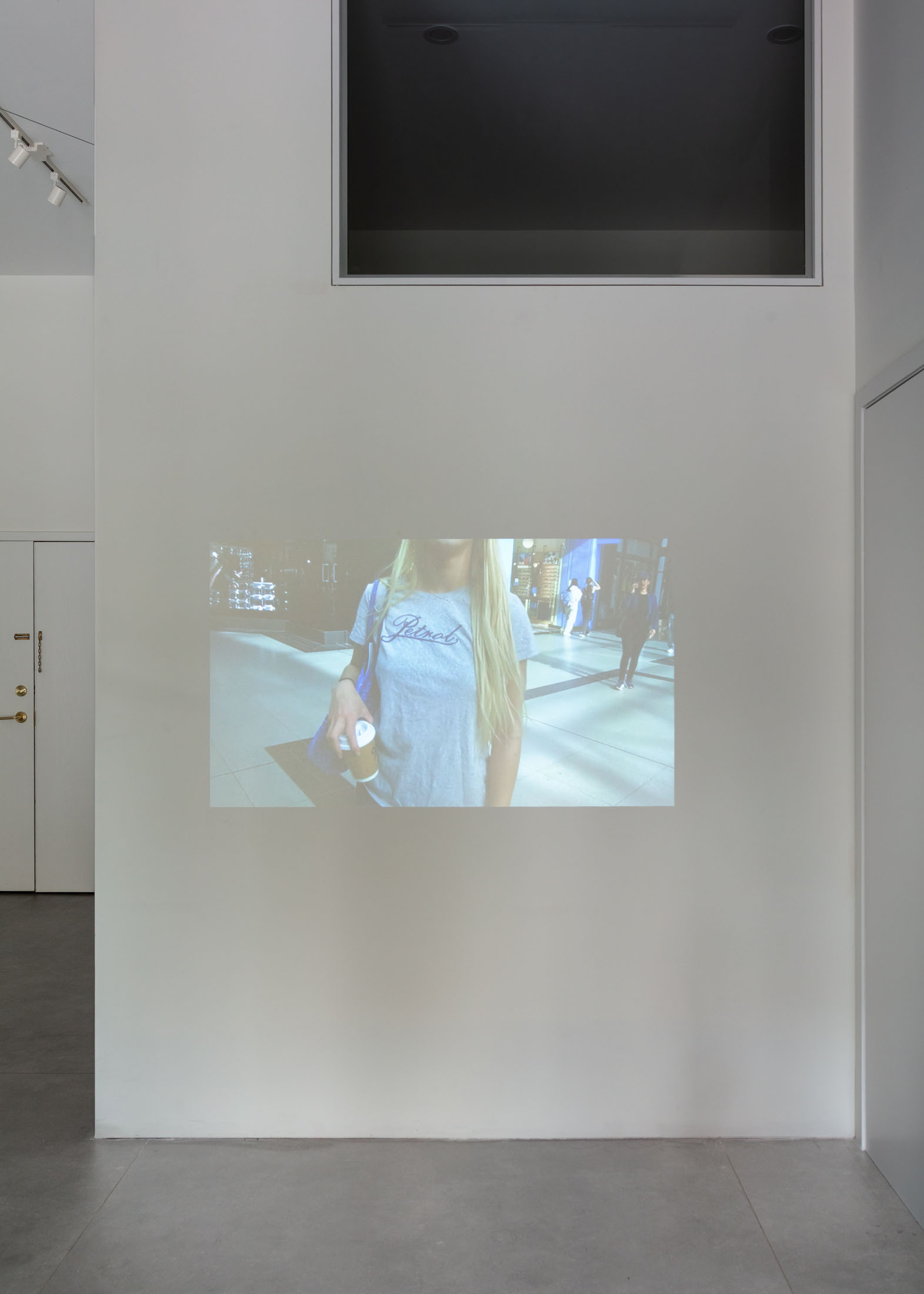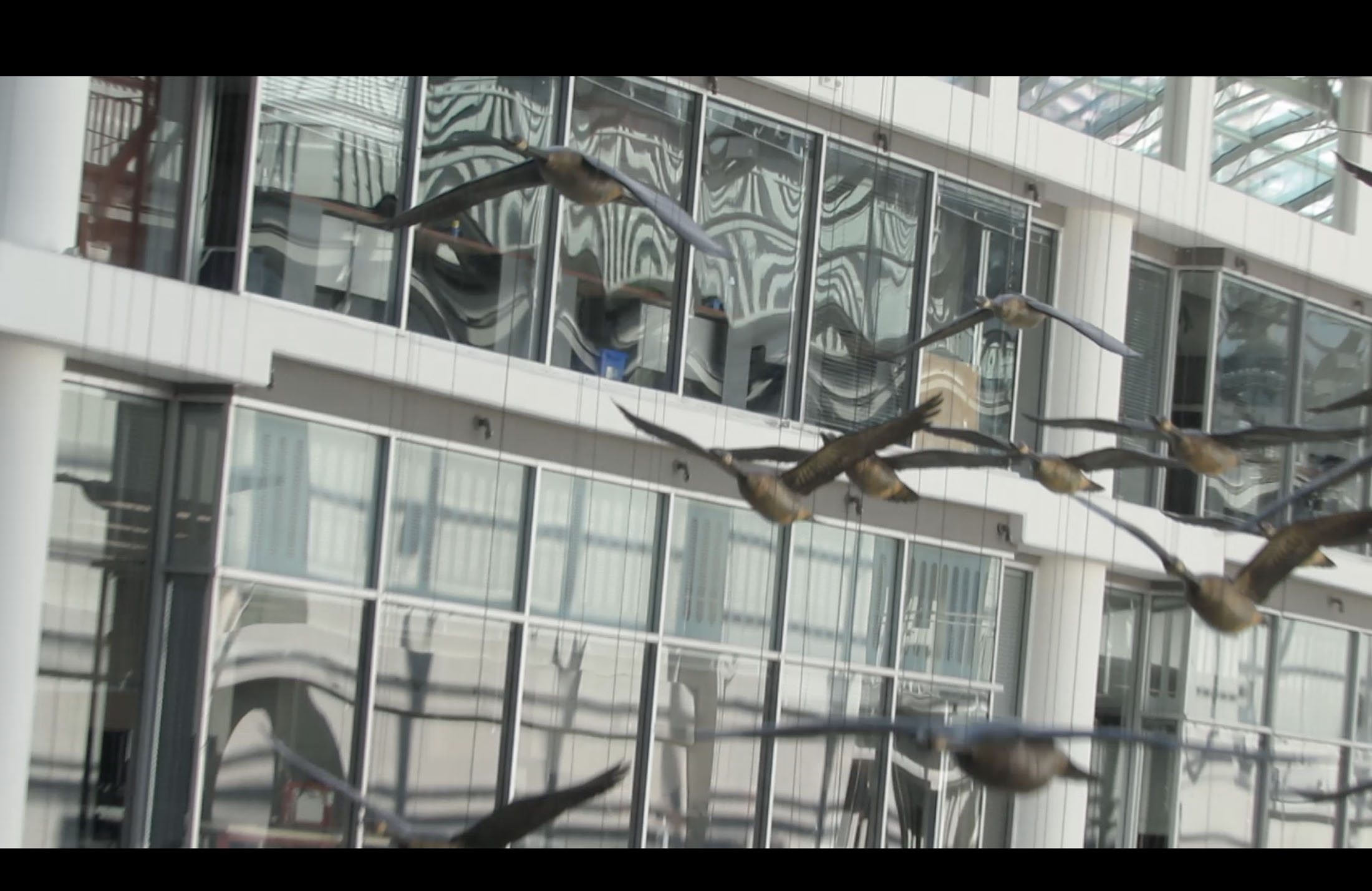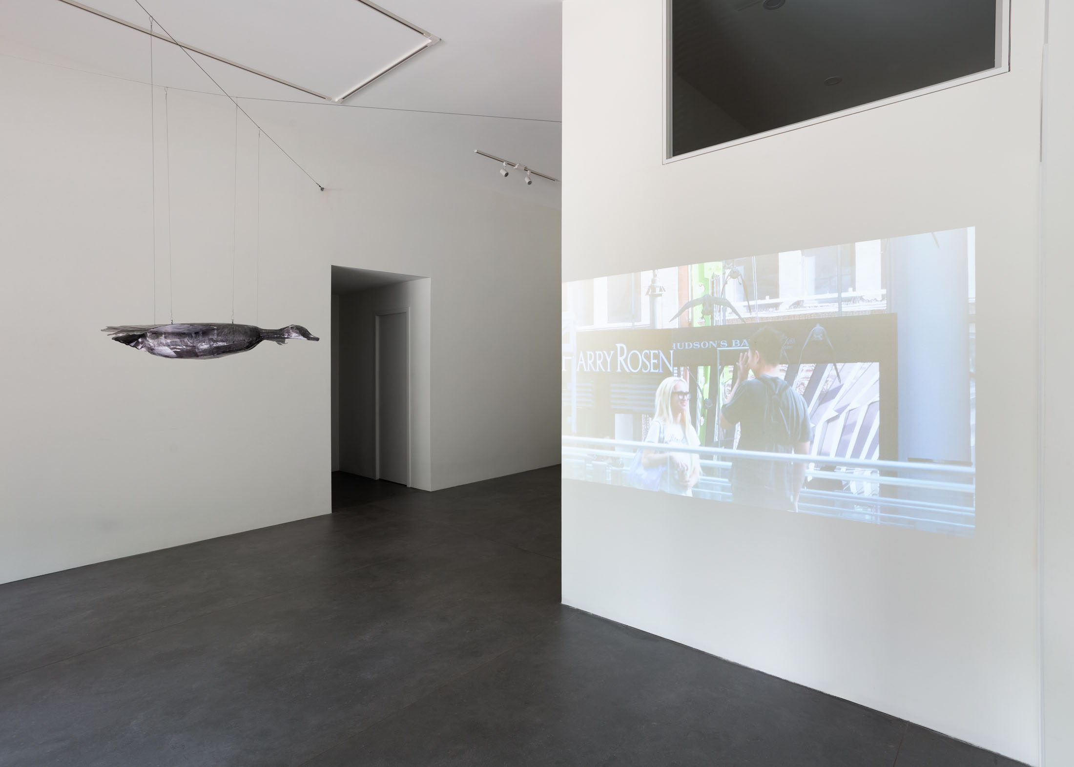The restaged interaction between Bri and Jacob was filmed on-site in the Eaton Centre, including around Michael Snow’s Flight Stop. Bri and Jacob, of Bonny Poon Conditions Artist Liaison, and Operations Officer, respectively practiced with a transcript of PickUpAlpha’s video. Jacob wears a chest-mounted body cam throughout, visible when he appears on screen. In the original video, the camera is concealed but referenced: