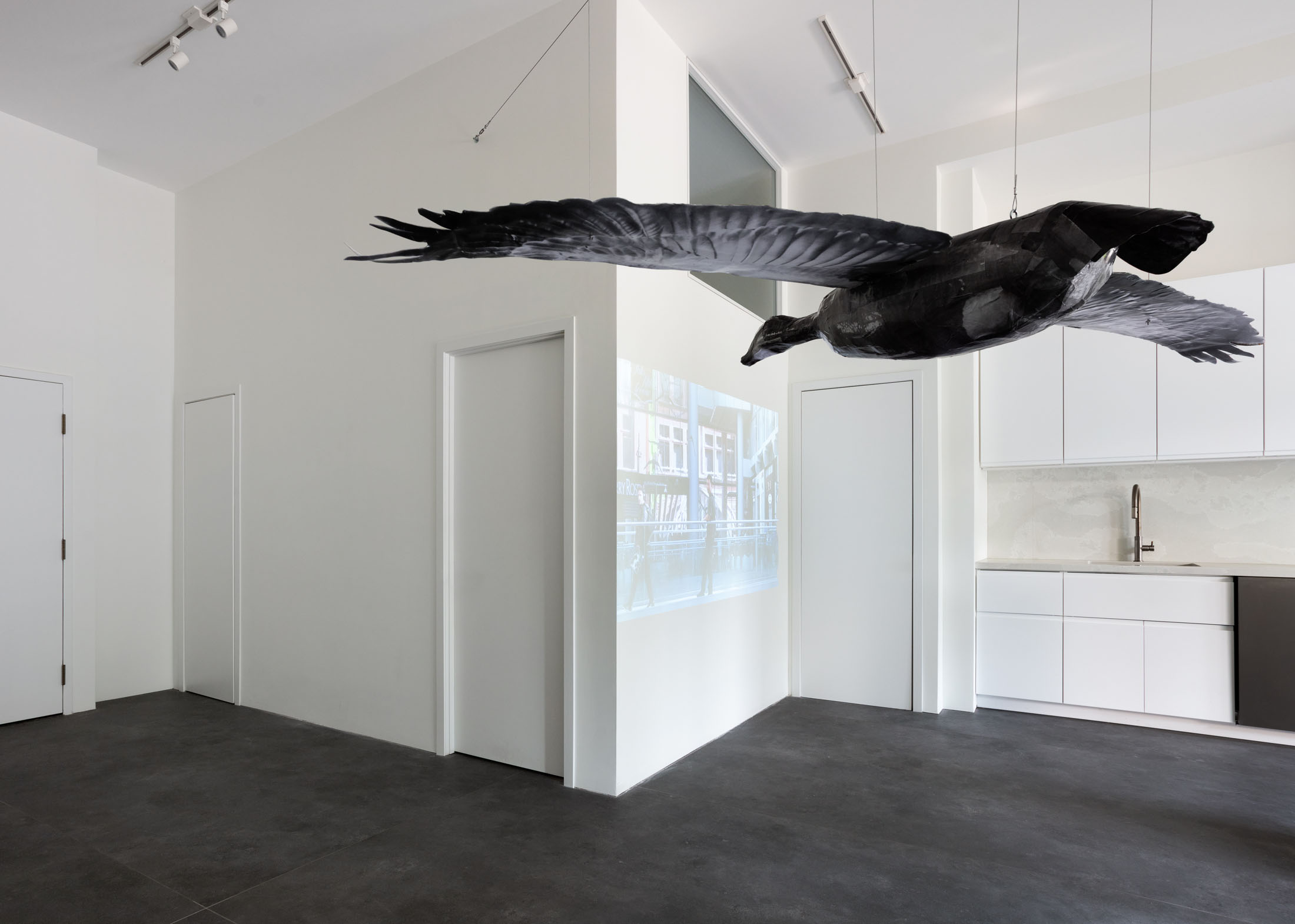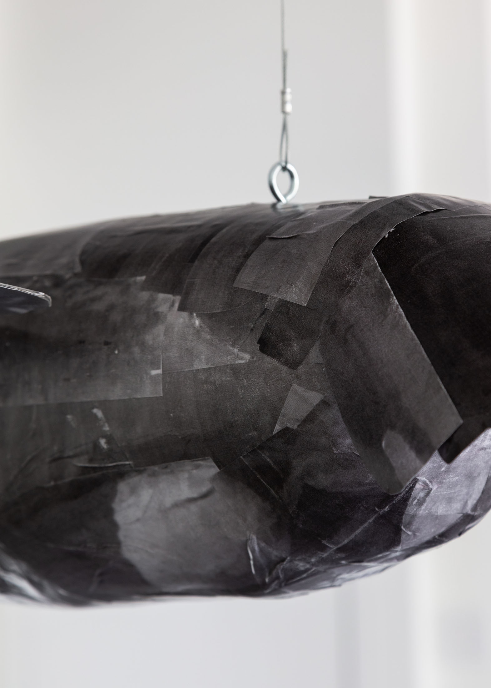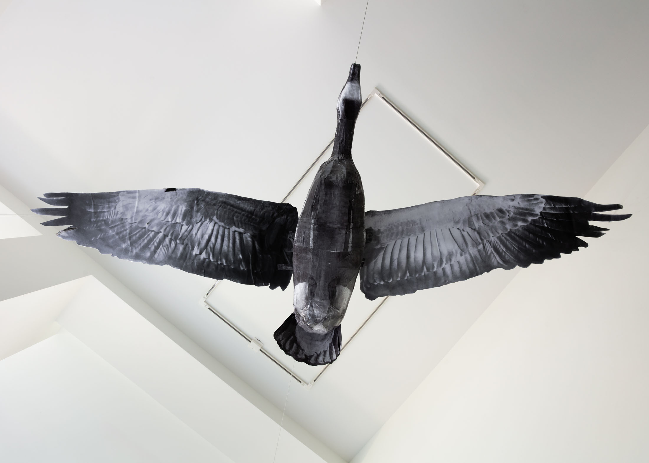Centre of Pressure is a sculpture based on Michael Snow’s Flight Stop which synthesized two-and three-dimensional proportions from all 60 geese in the original installation into a single, abstract, imprecise, composite. This project is grounded in my long-term proximity to the geese by virtue of being at the mall a lot as both a passive cohabitant/shopper/loiterer and as an active observer/researcher/admirer. Frozen in flight in the glass atrium, theFlight Stop geese are always lit by a combination of natural and artificial light-seen often contre-jour and literally suspended within the visual noise of the mall: signage, flashing digital billboards, passersby, exposed elevator shafts. They aren’t especially detailed up close, but they register as real (istic).