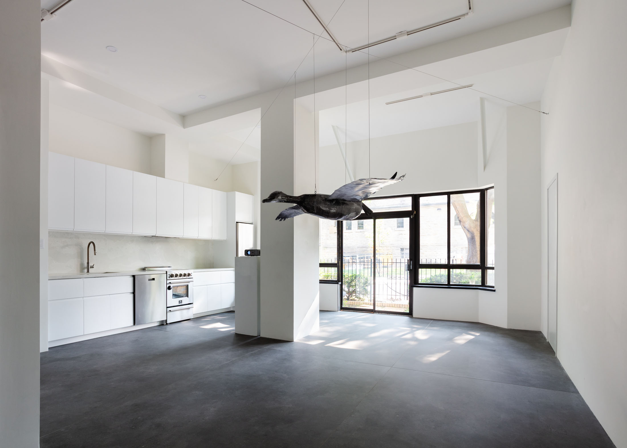 The EPS was salvaged from a shipping depot at Toronto Pearson International Airport. Malls and airports: circulation of people and stuff. Eaton Centre is connected to the subway too. The goose is suspended from a horizontal cross-formation of aircraft cable, modeled onFlight Stop’s rigging system, with vertical aircraft cables connected to the body and wings that allow for little shifts in position. It flies south, catching up to Snow’s geese who are about one mile south east of the gallery and oriented toward the southern border—the U.S.—where the “snow bird” is under threat. Since the “51st state” and tariff fiasco began, our shared border, which typically represented geographic and commercial camaraderie, free trade, and open tourism, now evokes toxic nationalism, destabilized economic interdependence, invasion anxiety, and geopolitical clusterfuckery.