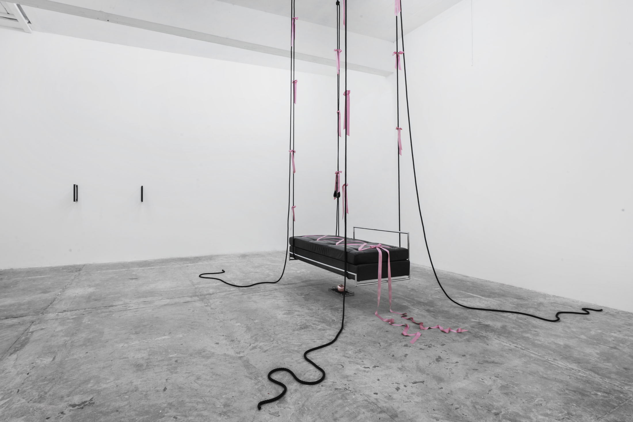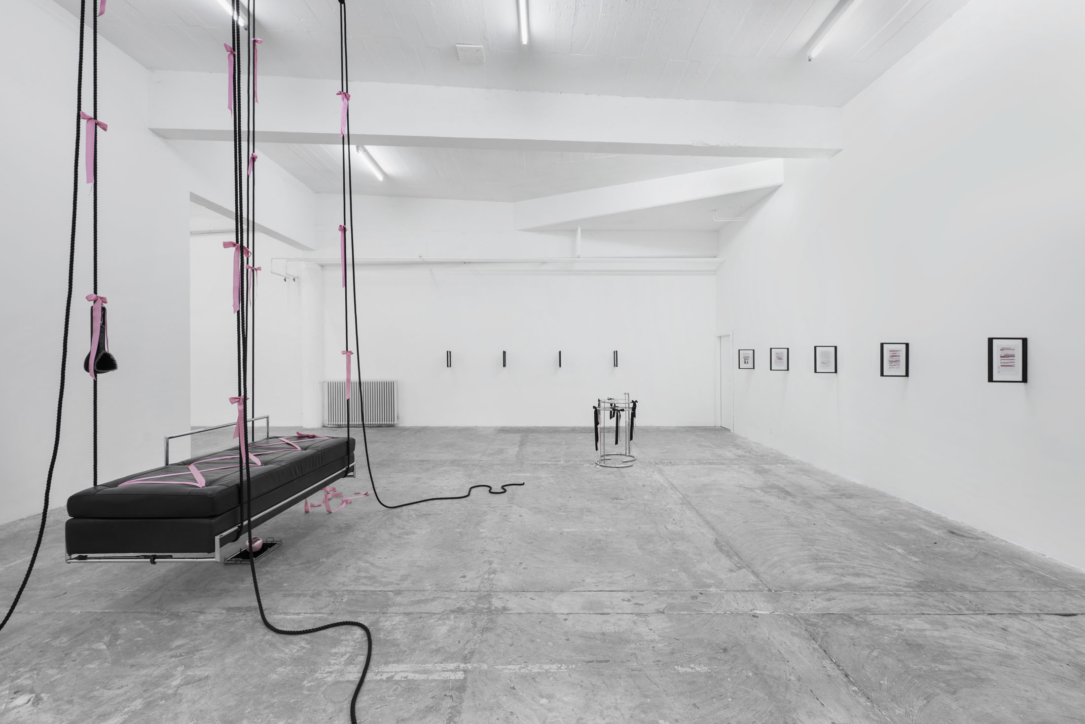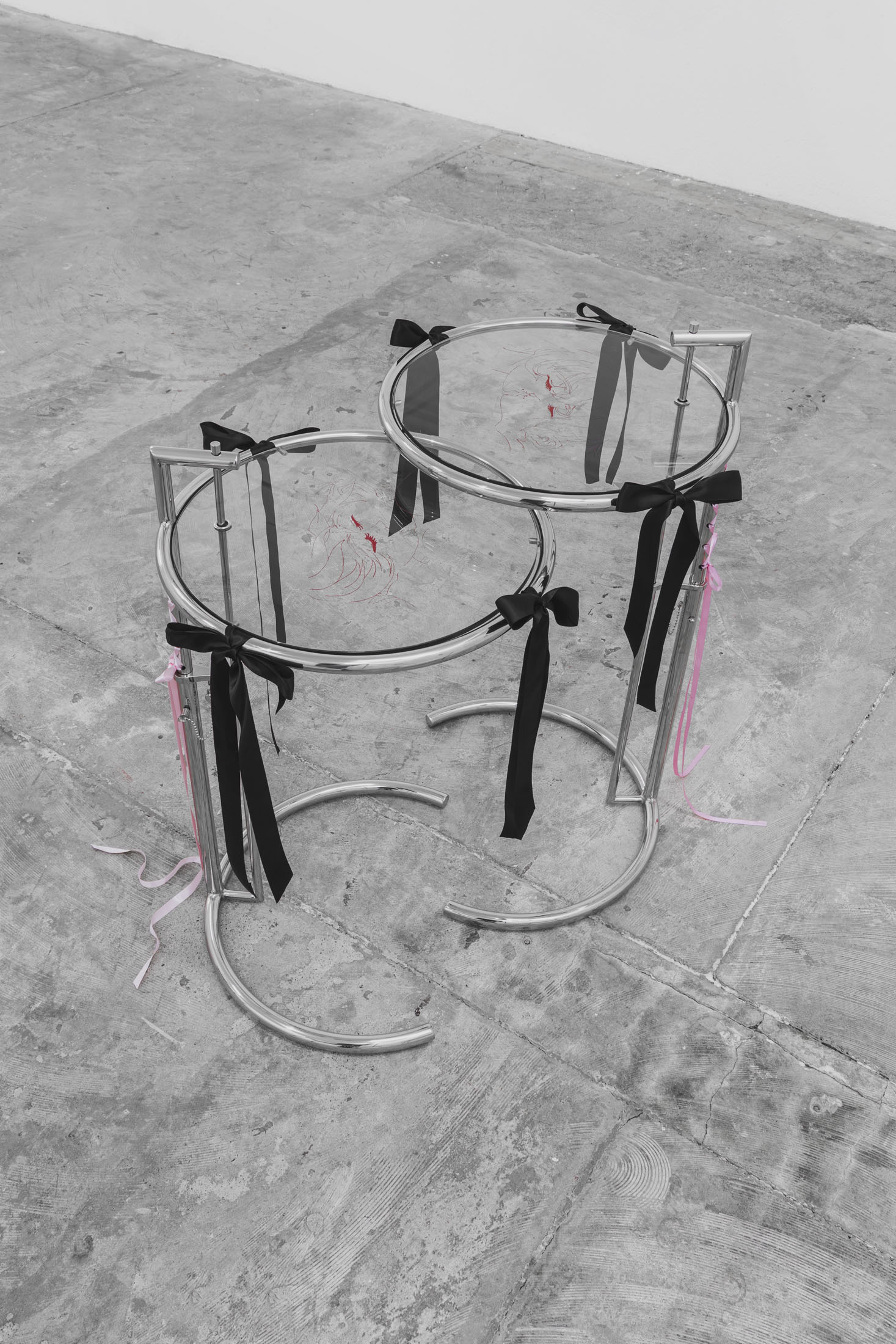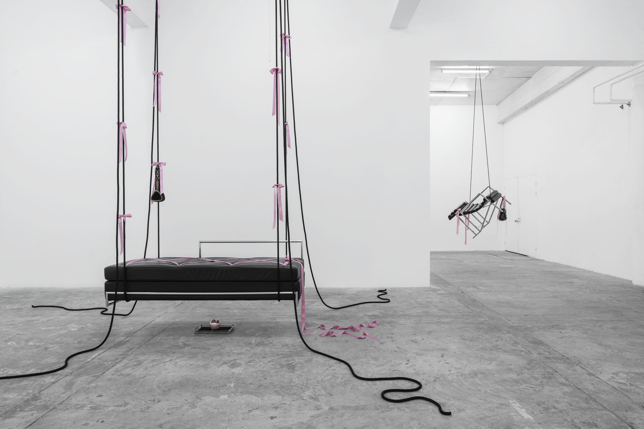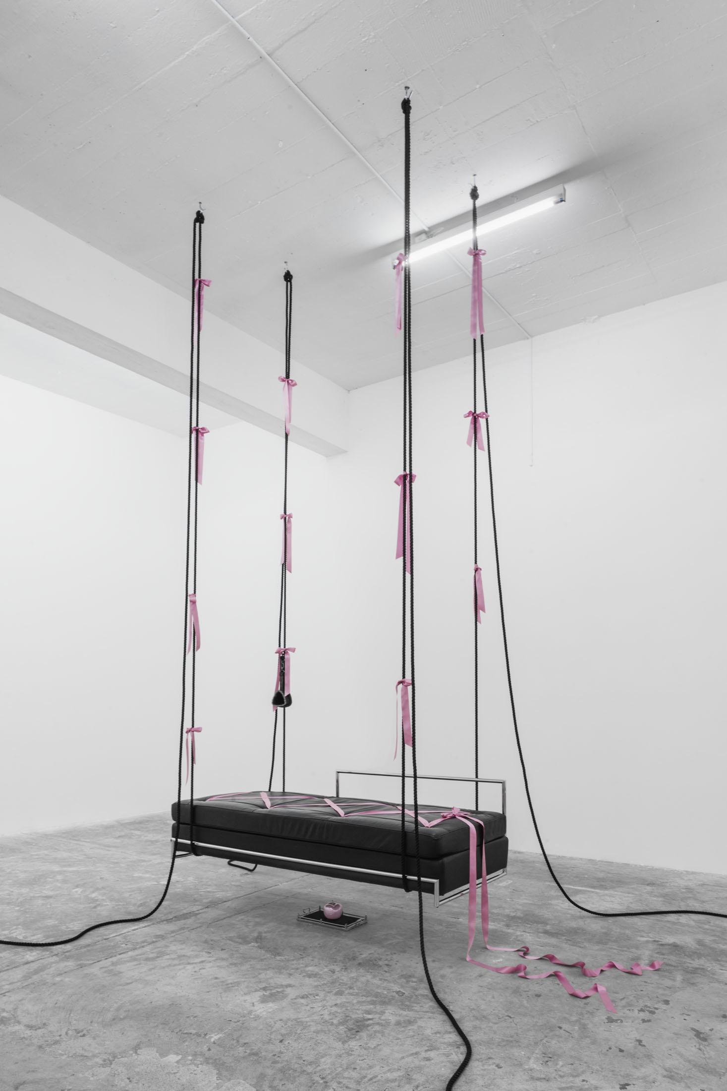 Lauryn Youden, Would you die tonight for love?, 2025, Bibendum Chair (1926), pink plaid skirt, black ribbons, black mooring line, heart locket necklace with red hair, 3x handforged nails, 77 × 93 × 77 cm, 370 × 93 × 77 cm (suspended)Lauryn Youden, Would you die tonight for love?, 2025, Bibendum Chair (1926), pink plaid skirt, black ribbons, black mooring line, heart locket necklace with red hair, 3x handforged nails, 77 × 93 × 77 cm, 370 × 93 × 77 cm (suspended)Lauryn Youden, I wanna hold the hand inside you, 2025, exhibition view, CIRCUIT Centre d’art contemporain, LausanneLauryn Youden, Of the love-moved wind; The exalting secrecies, 2025, Transat Chair (1927) with black faux crocodile skin, rose ribbons, black faux crocodile skin handbag (Claire’s), pink pepper spray holder, black Kubotan, pink pom pom keychain, black rape whistle keychain, Eiffel Tower keychain, book: NANA Manga by Ai Yazawa Volume (6), black mooring line, 71 × 55 × 106 cm, 390 × 55 × 106 cm (suspended)Lauryn Youden, Of the love-moved wind; The exalting secrecies, 2025, Transat Chair (1927) with black faux crocodile skin, rose ribbons, black faux crocodile skin handbag (Claire’s), pink pepper spray holder, black Kubotan, pink pom pom keychain, black rape whistle keychain, Eiffel Tower keychain, book: NANA Manga by Ai Yazawa Volume (6), black mooring line, 71 × 55 × 106 cm, 390 × 55 × 106 cm (suspended)Lauryn Youden, I wanna hold the hand inside you, 2025, exhibition view, CIRCUIT Centre d’art contemporain, LausanneLauryn Youden, I wanna hold the hand inside you, 2025, exhibition view, CIRCUIT Centre d’art contemporain, LausanneLauryn Youden, I wanna hold the hand inside you, 2025, exhibition view, CIRCUIT Centre d’art contemporain, LausanneLauryn Youden, I wanna hold the hand inside you, 2025, exhibition view, CIRCUIT Centre d’art contemporain, LausanneLauryn Youden, I wanna hold the hand inside you, 2025, exhibition view, CIRCUIT Centre d’art contemporain, LausanneLauryn Youden, siège d’amour (Edward VII), 2025, Day Bed (c. 1925), pink porcelain apple, velvet tray, rose ribbons, black mooring line, book: Bob Flanagan’s The Pain Journal, vintage lesbian BDSM photograph, horse hair brush, butterfly riding crop, 60 × 192 × 85 cm, 450 × 192 × 85 cm (suspended)Lauryn Youden, siège d’amour (Edward VII), 2025, Day Bed (c. 1925), pink porcelain apple, velvet tray, rose ribbons, black mooring line, book: Bob Flanagan’s The Pain Journal, vintage lesbian BDSM photograph, horse hair brush, butterfly riding crop, 60 × 192 × 85 cm, 450 × 192 × 85 cm (suspended)Lauryn Youden, siège d’amour (Edward VII), 2025, Day Bed (c. 1925), pink porcelain apple, velvet tray, rose ribbons, black mooring line, book: Bob Flanagan’s The Pain Journal, vintage lesbian BDSM photograph, horse hair brush, butterfly riding crop, 60 × 192 × 85 cm, 450 × 192 × 85 cm (suspended)Lauryn Youden, I wanna hold the hand inside you, 2025, exhibition view, CIRCUIT Centre d’art contemporain, LausanneLauryn Youden, I wanna hold the hand inside you, 2025, exhibition view, CIRCUIT Centre d’art contemporain, LausanneLauryn Youden, Hey Nana, if you and I were lovers, would we have been able to fill the emptiness by holding each other?, 2025, 2x E-1027 Adjustable Tables (1927), black ribbons, pink ribbons, glass engravings of Utena Revolutionary Girl kiss, red oil paint, 96.5 × 95 × 56 cmLauryn Youden, Hey Nana, if you and I were lovers, would we have been able to fill the emptiness by holding each other?, 2025, 2x E-1027 Adjustable Tables (1927), black ribbons, pink ribbons, glass engravings of Utena Revolutionary Girl kiss, red oil paint, 96.5 × 95 × 56 cmLauryn Youden, Hey Nana, if you and I were lovers, would we have been able to fill the emptiness by holding each other?, 2025, 2x E-1027 Adjustable Tables (1927), black ribbons, pink ribbons, glass engravings of Utena Revolutionary Girl kiss, red oil paint, 96.5 × 95 × 56 cmLauryn Youden, à lire avec les trois cigarettes oubliées, 2025, series of 12 pages from Peter Adam’s Eileen Gray: Her Life and Work, red ink, charcoal stained frames, 35 × 27.5 × 3 cm (each), dimensions variable (all 12x)Lauryn Youden, à lire avec les trois cigarettes oubliées, 2025, series of 12 pages from Peter Adam’s Eileen Gray: Her Life and Work, red ink, charcoal stained frames, 35 × 27.5 × 3 cm (each), dimensions variable (all 12x)Lauryn Youden, à lire avec les trois cigarettes oubliées, 2025, series of 12 pages from Peter Adam’s Eileen Gray: Her Life and Work, red ink, charcoal stained frames, 35 × 27.5 × 3 cm (each), dimensions variable (all 12x)Lauryn Youden, à lire avec les trois cigarettes oubliées, 2025, series of 12 pages from Peter Adam’s Eileen Gray: Her Life and Work, red ink, charcoal stained frames, 35 × 27.5 × 3 cm (each), dimensions variable (all 12x)Lauryn Youden, à lire avec les trois cigarettes oubliées, 2025, series of 12 pages from Peter Adam’s Eileen Gray: Her Life and Work, red ink, charcoal stained frames, 35 × 27.5 × 3 cm (each), dimensions variable (all 12x)Lauryn Youden, à lire avec les trois cigarettes oubliées, 2025, series of 12 pages from Peter Adam’s Eileen Gray: Her Life and Work, red ink, charcoal stained frames, 35 × 27.5 × 3 cm (each), dimensions variable (all 12x)Lauryn Youden, I wanna hold the hand inside you, 2025, exhibition view, CIRCUIT Centre d’art contemporain, LausanneLauryn Youden, à lire avec les trois cigarettes oubliées (p. 183) (detail: The E.1027 table as a bedside table with adjustable height), 2025, exhibition poster F4 Éditions Circuit, 2025