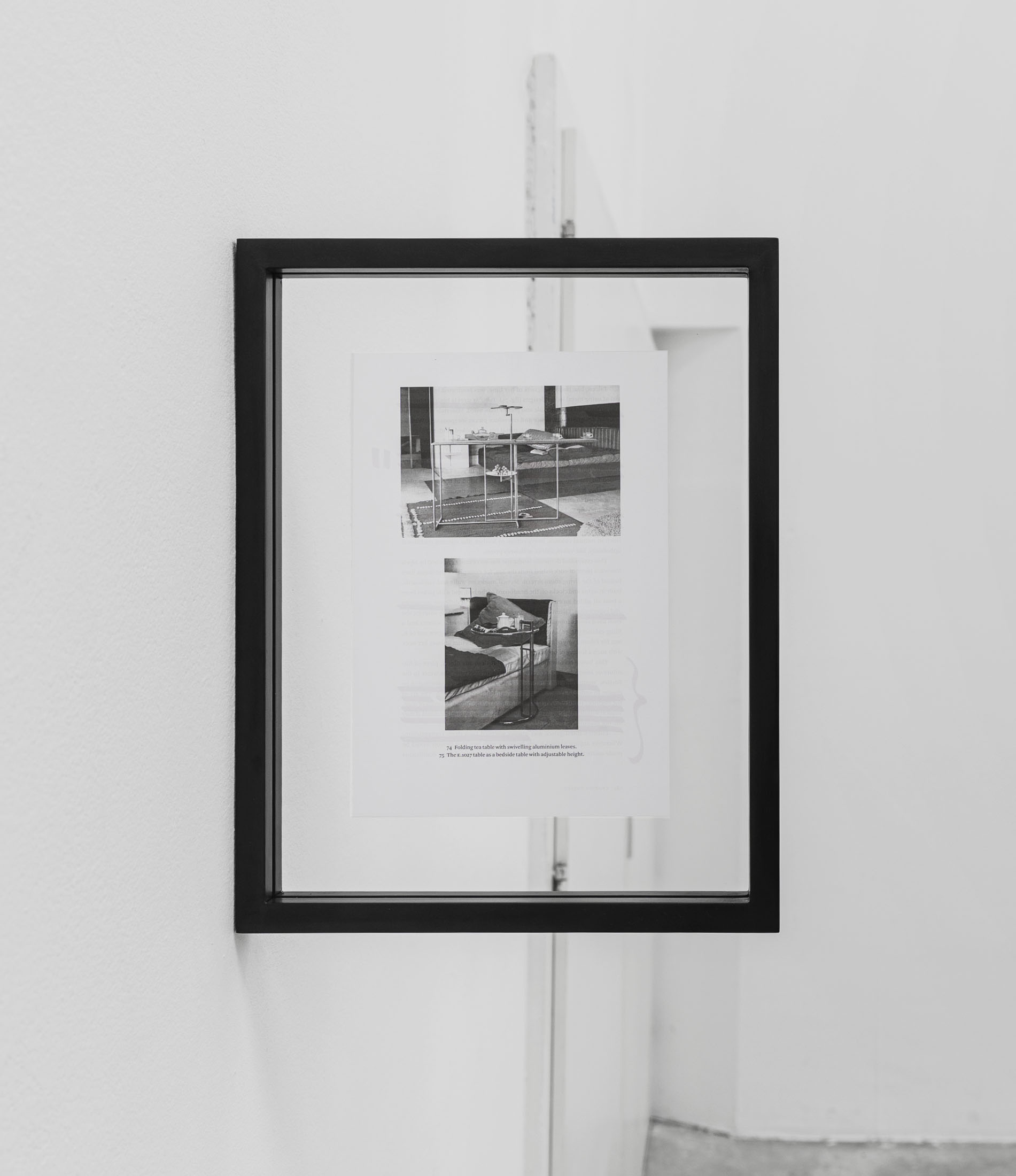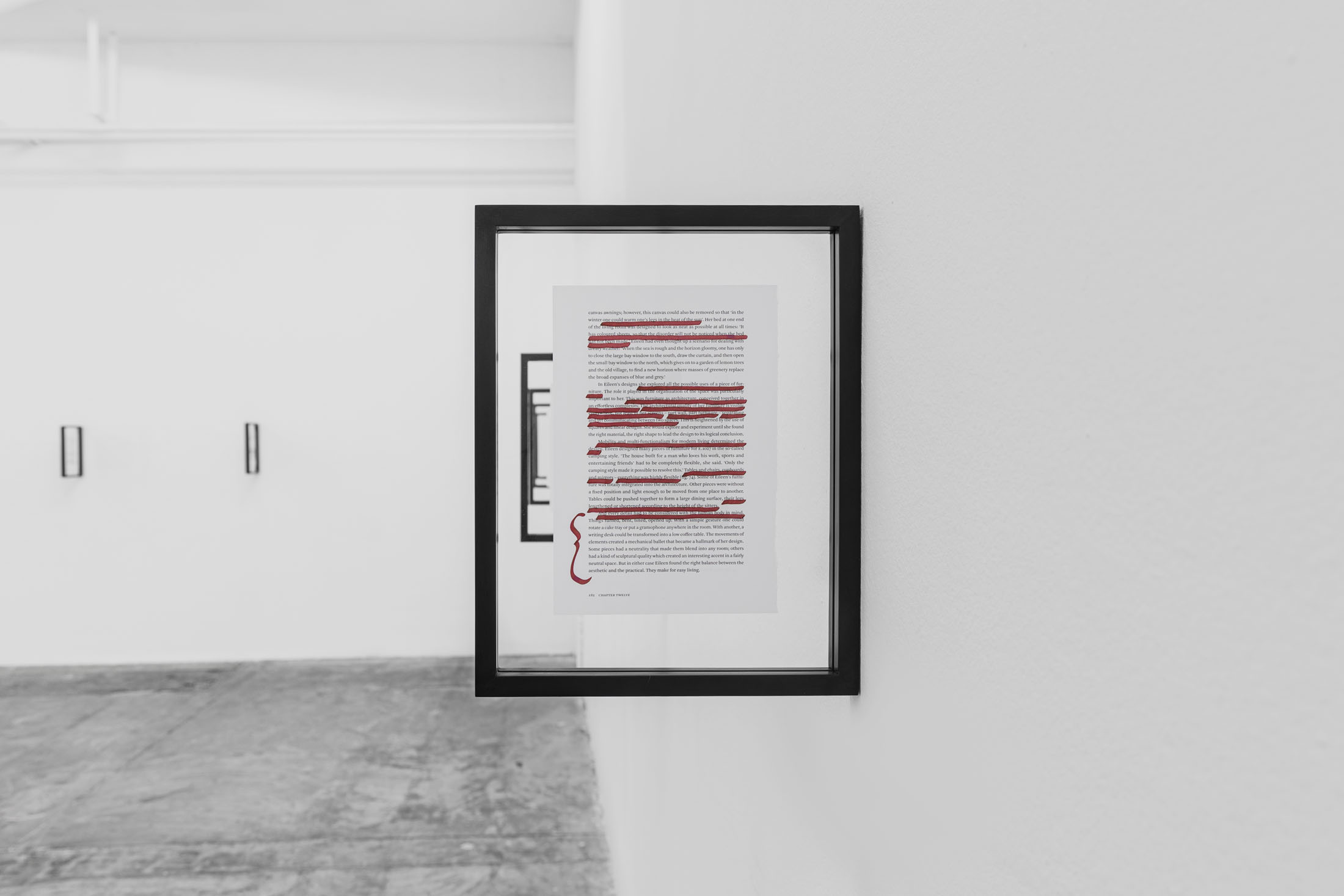 Alongside these interventions, Youden presents twelve framed pages from Peter Adam’s biography of Gray, marked in red by her hand. The excerpts highlight Gray not only as a pioneering architect and designer but also as a queer creator whose life and work were shaped by intimacy, desire, and relationality. Her approach to making, her lovers, her tactile attention, and her position as a wealthy heiress are emphasized through these annotations. The frames, glazed on both sides and mounted from their edges, project into CIRCUIT’s exhibition space so that the text can be read from either side. In this configuration, the work functions both as an archive of queer history and as a spatial intervention, producing text that can be navigated, inhabited, and experienced bodily.