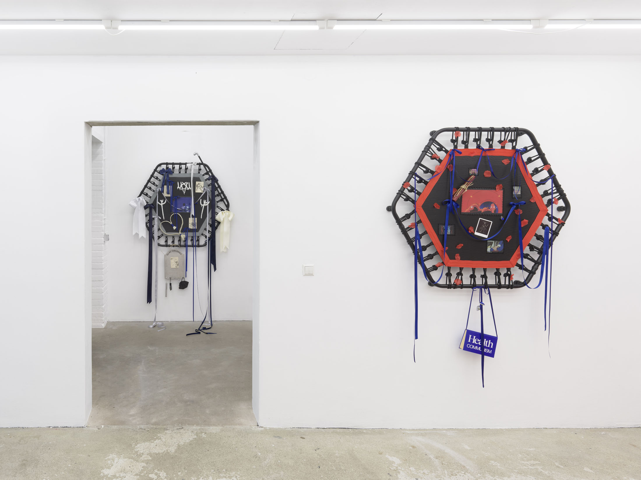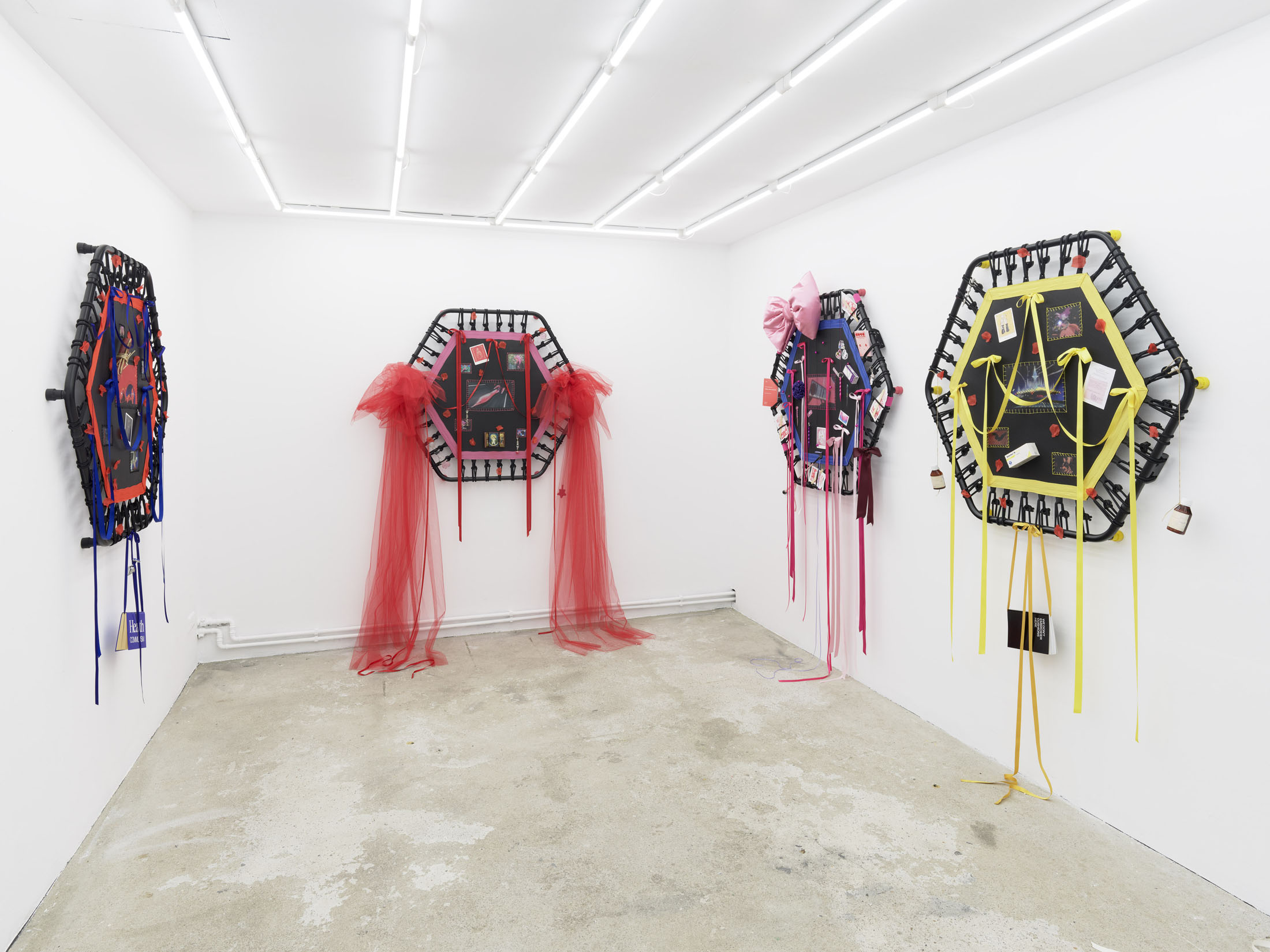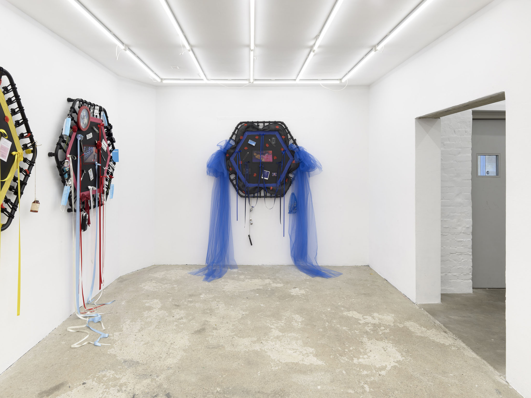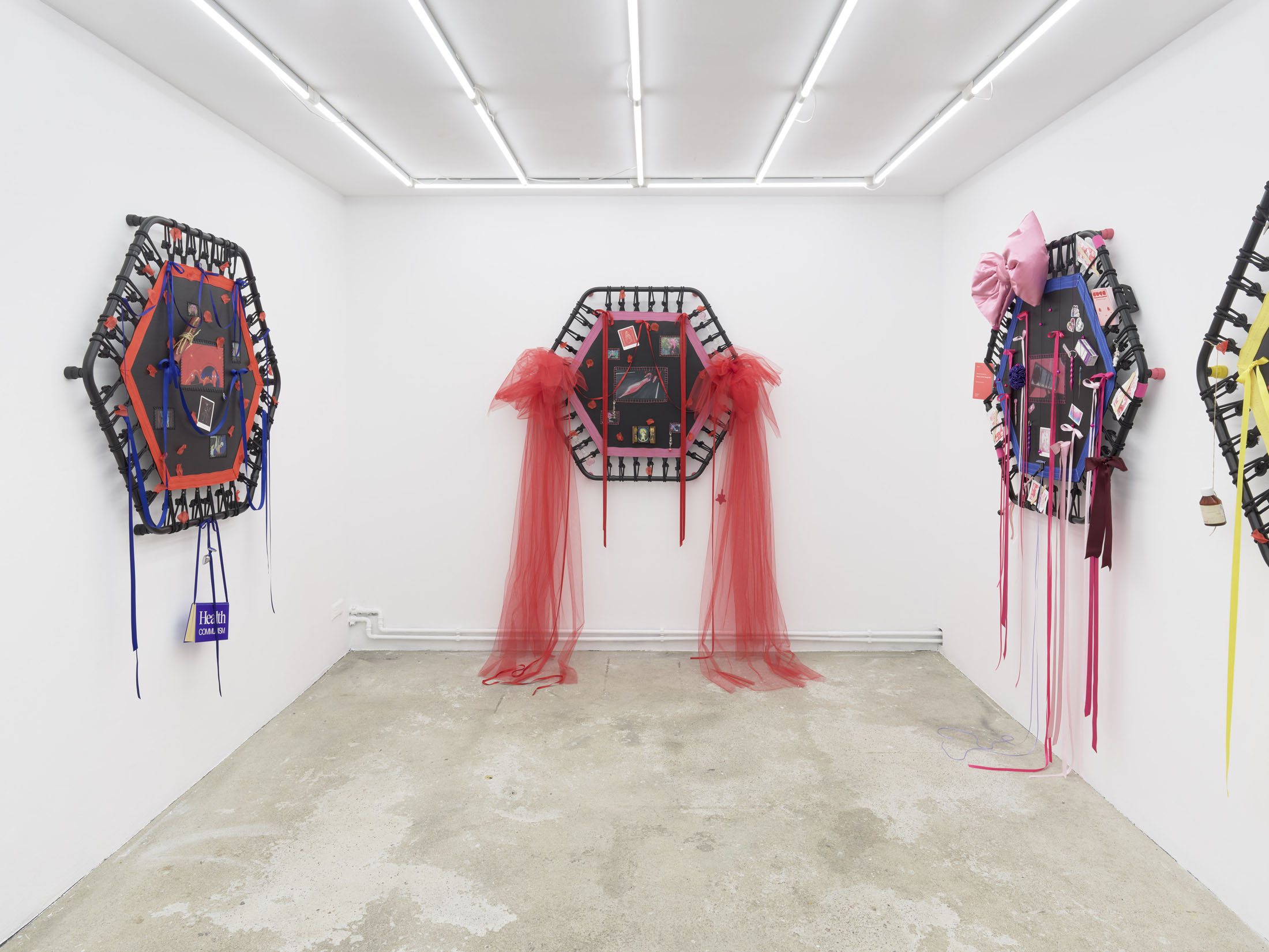 Even A Worm Will Turn, Lauryn Youden’s solo exhibition at Number 1 Main Road, Berlin navigates the sterile surfaces of the medical-industrial complex and modernist architecture, exposing the latent violence they inflict on chronically ill and disabled lives. The show centers around a series of ornate wall sculptures reminiscent of oversized prize ribbons, made from trampolines—the same kind once prescribed to Youden as a “misguided” cure for chronic pain. Emblematic of bodily capitalist regimes, these trampolines inherit Le Corbusier’s vision of the home as a machine for living: a paradigm that reduces domestic space to a site of regulation and exclusion, where sick and disabled bodies are unwelcome. Even the mundane is complicit; its supposed neutrality conceals architectures of control and erasure. Youden renders the trampolines inoperable: their legs truncated, stripped of function, with surfaces adorned by bows, fabric patches, and intimate detritus. They become portals into queer Crip time, shaped by the irregular rhythms of disability and chronic illness, rejecting linear progress for something softer, stranger, and more alive (undead).