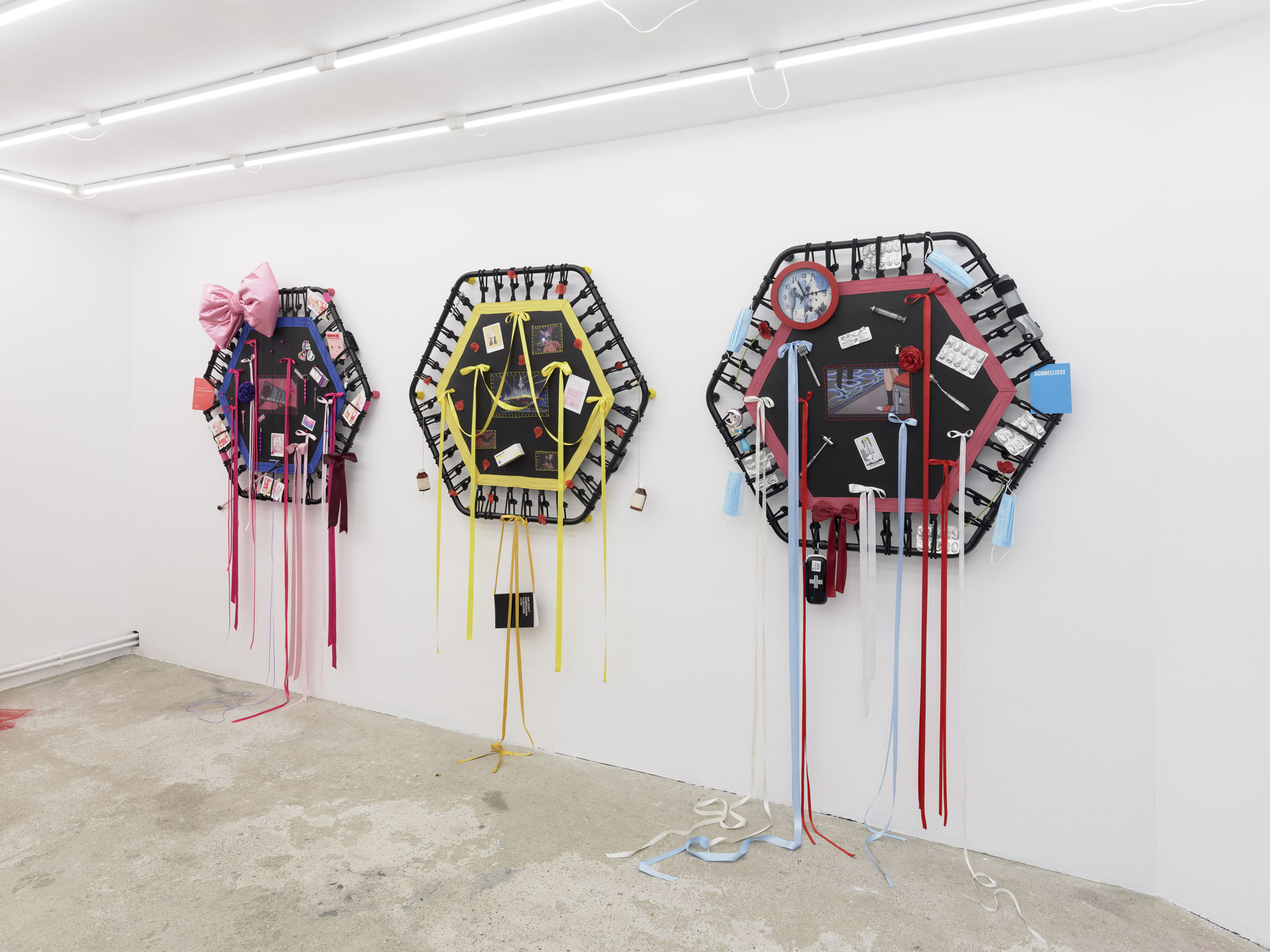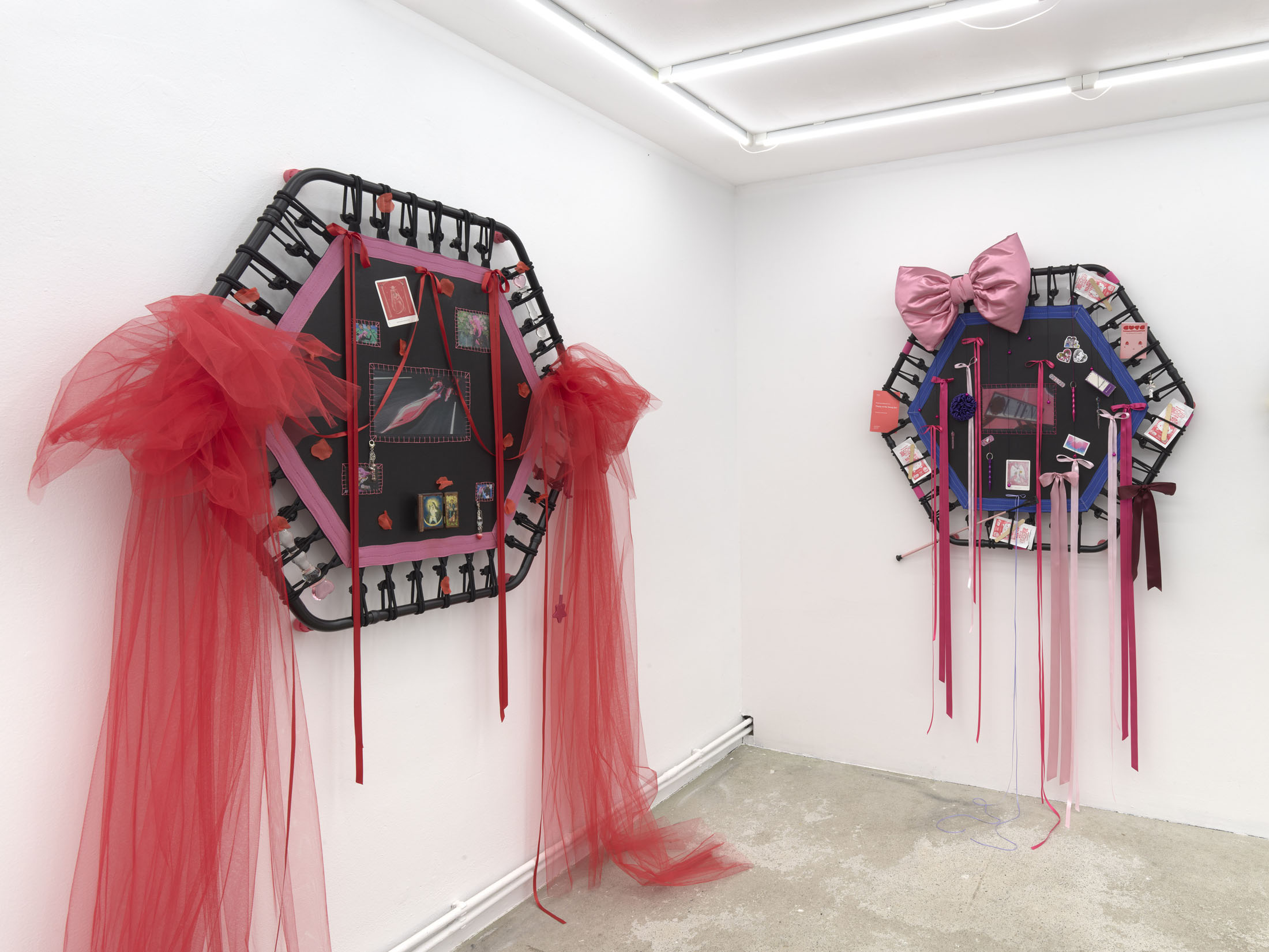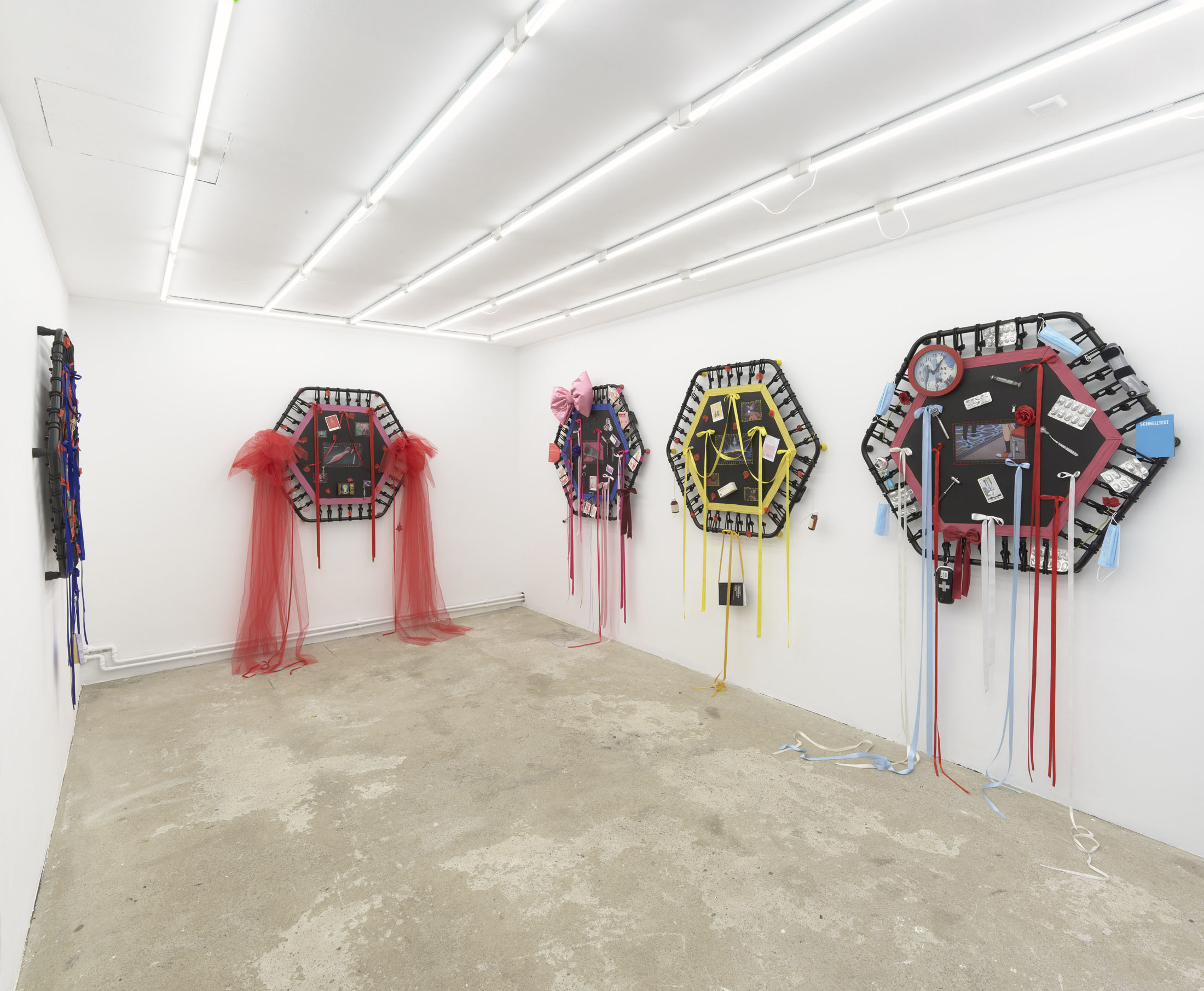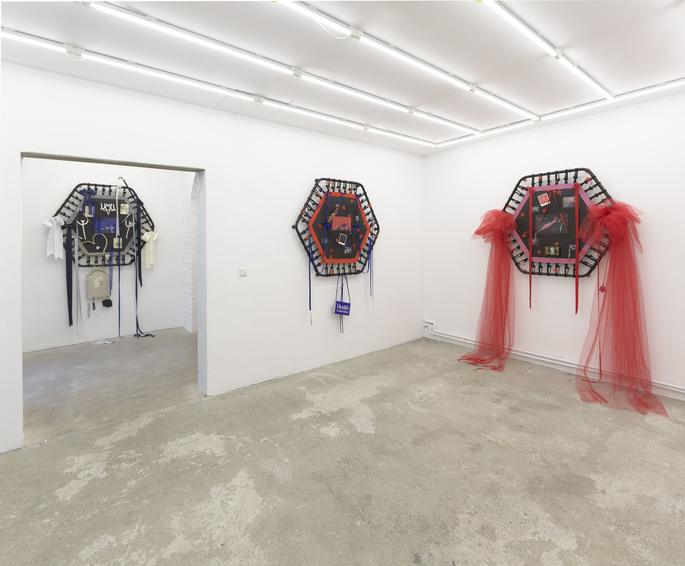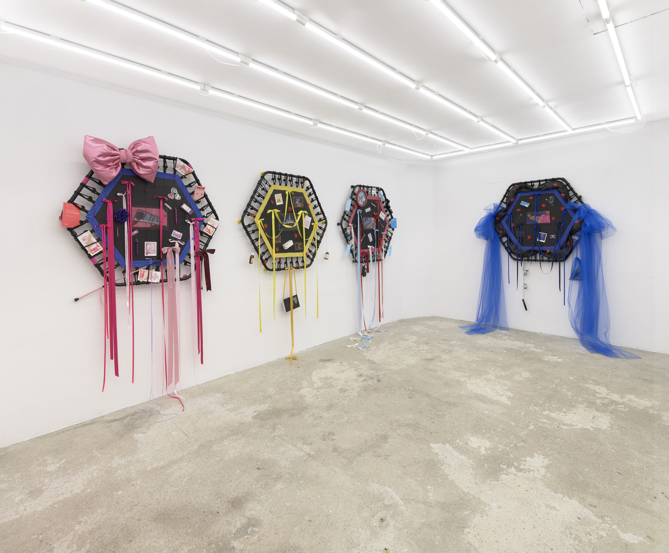 Even A Worm Will Turn, Lauryn Youden’s solo exhibition at Number 1 Main Road, Berlin navigates the sterile surfaces of the medical-industrial complex and modernist architecture, exposing the latent violence they inflict on chronically ill and disabled lives. The show centers around a series of ornate wall sculptures reminiscent of oversized prize ribbons, made from trampolines—the same kind once prescribed to Youden as a “misguided” cure for chronic pain. Emblematic of bodily capitalist regimes, these trampolines inherit Le Corbusier’s vision of the home as a machine for living: a paradigm that reduces domestic space to a site of regulation and exclusion, where sick and disabled bodies are unwelcome. Even the mundane is complicit; its supposed neutrality conceals architectures of control and erasure. Youden renders the trampolines inoperable: their legs truncated, stripped of function, with surfaces adorned by bows, fabric patches, and intimate detritus. They become portals into queer Crip time, shaped by the irregular rhythms of disability and chronic illness, rejecting linear progress for something softer, stranger, and more alive (undead).