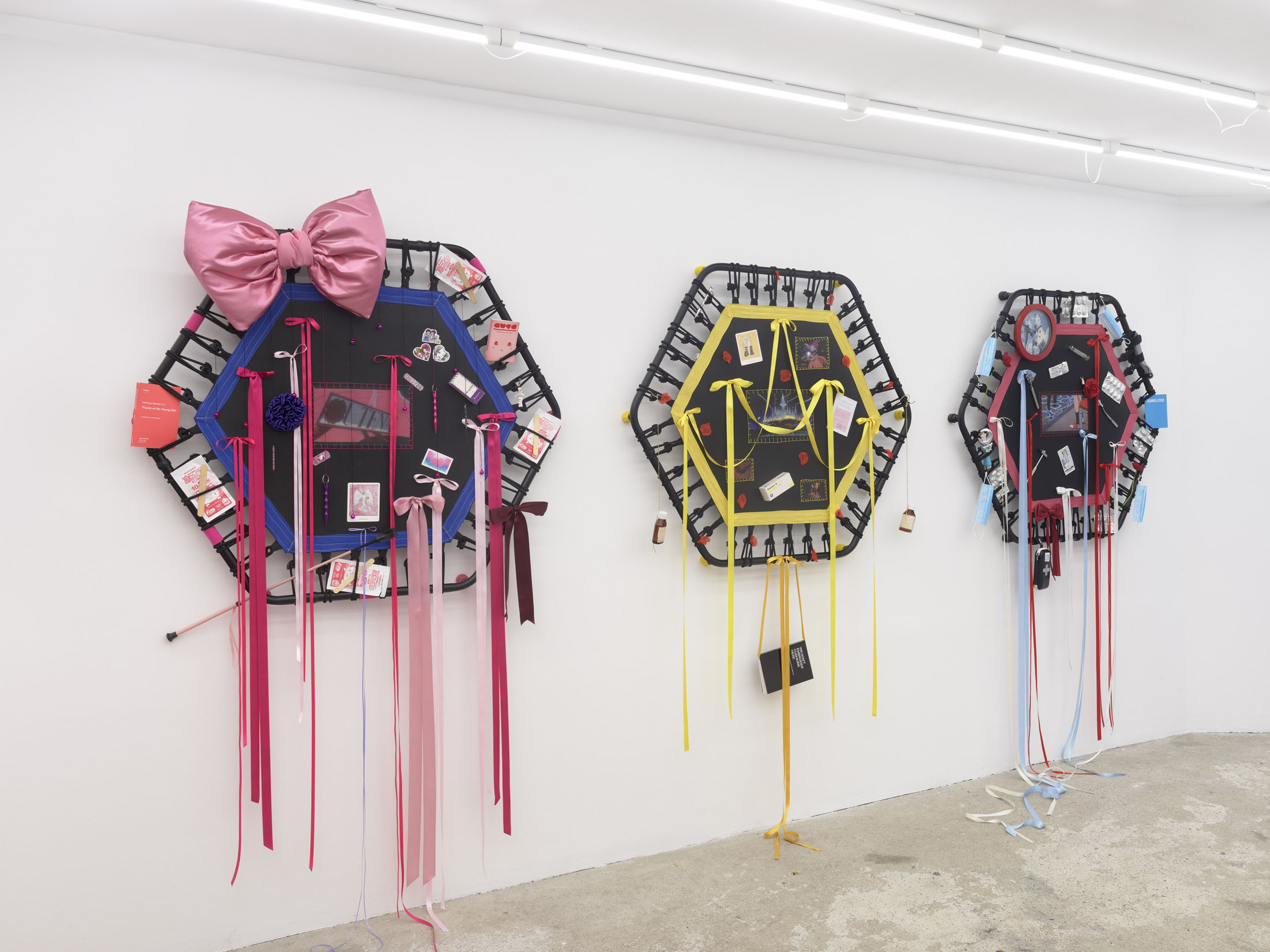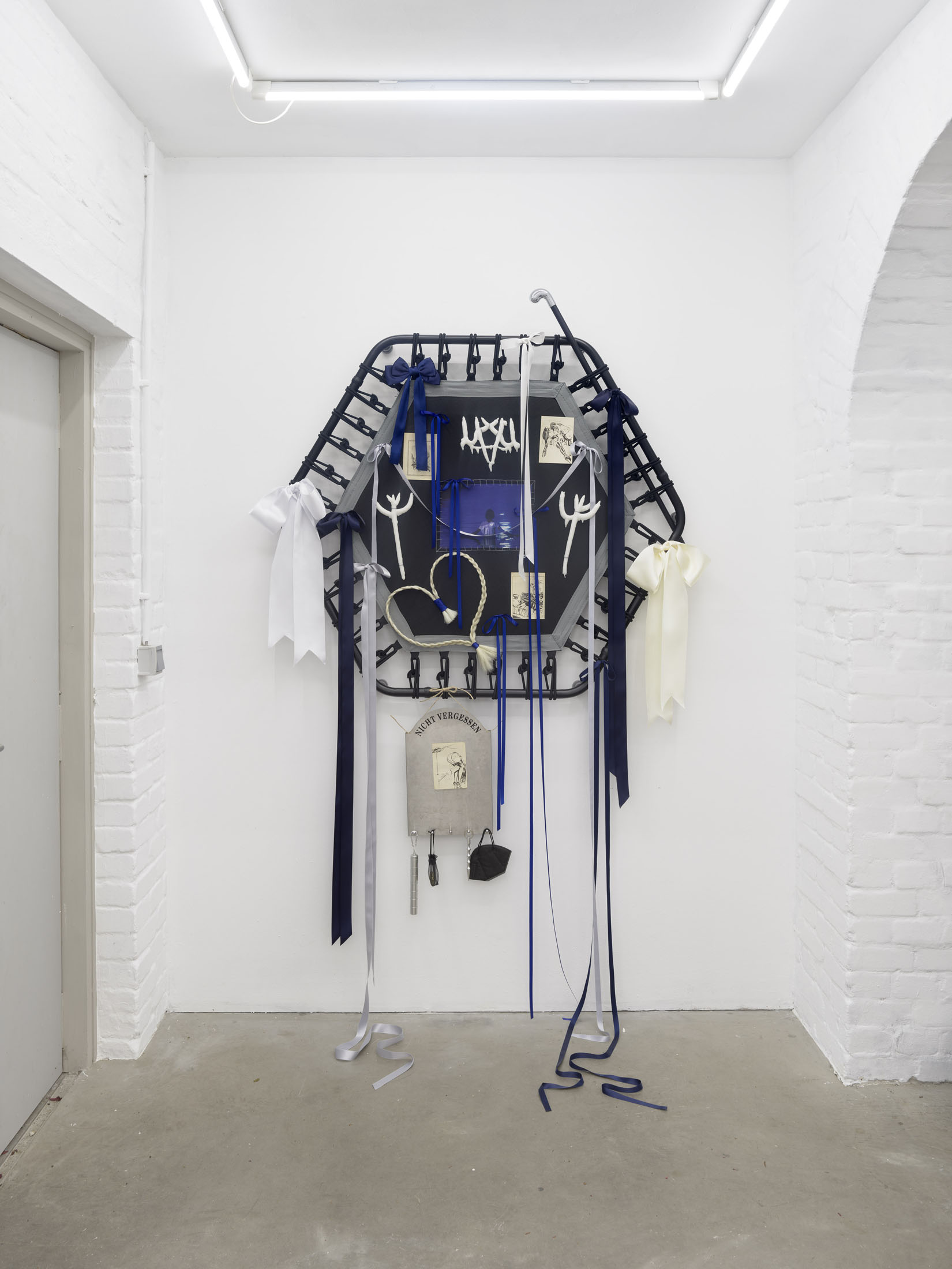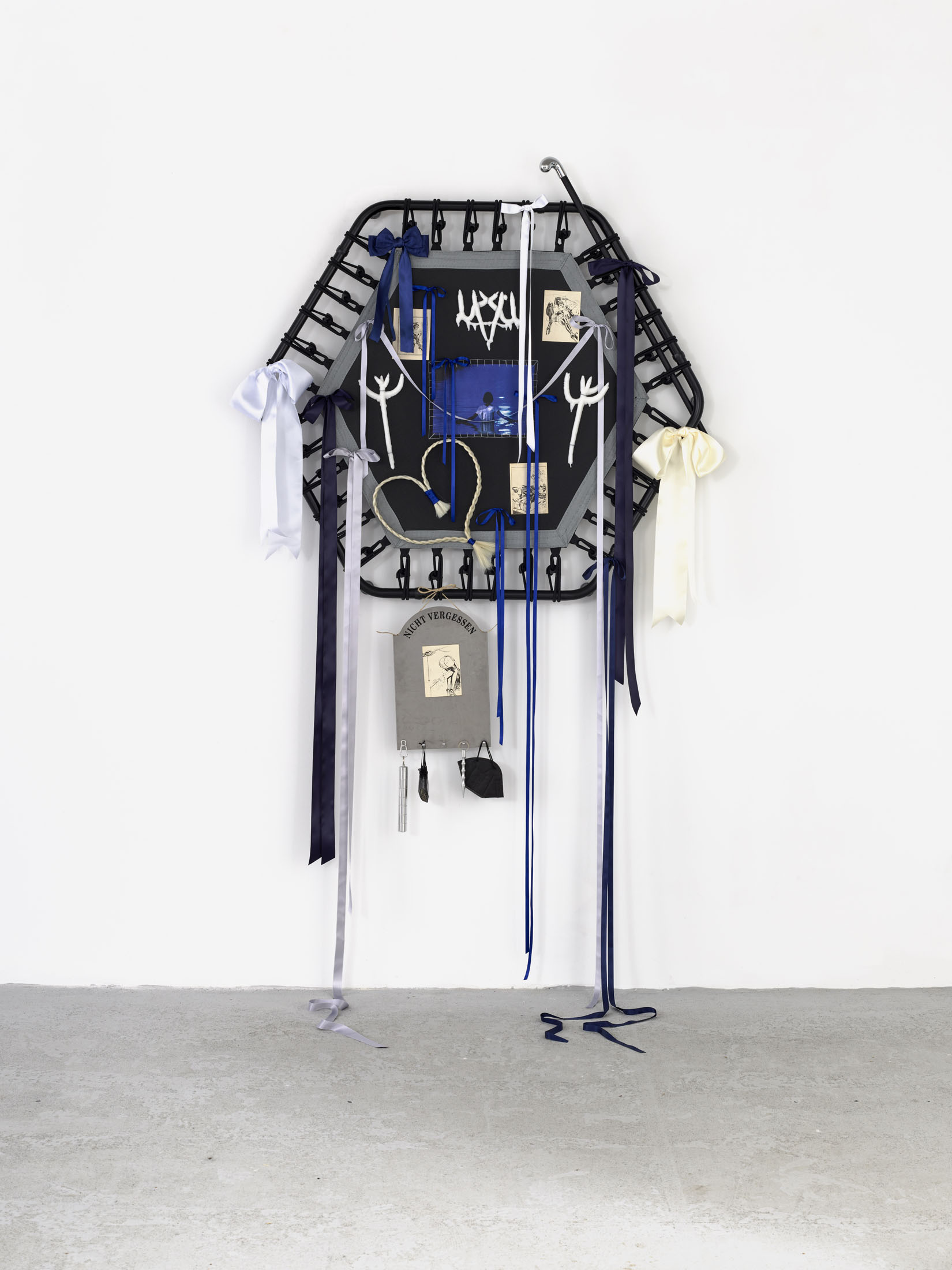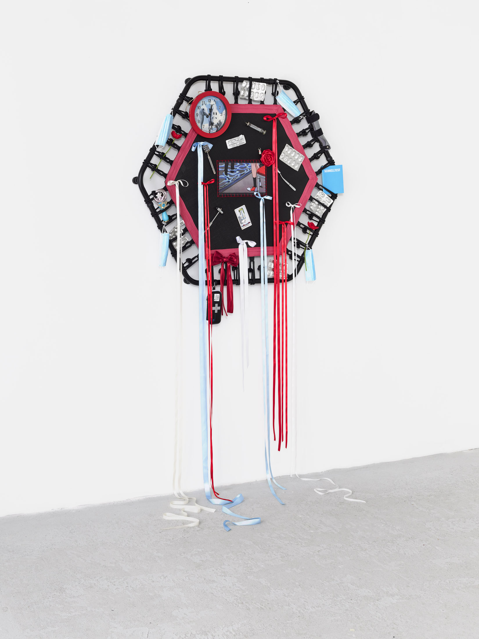 Even A Worm Will Turn, Lauryn Youden’s solo exhibition at Number 1 Main Road, Berlin navigates the sterile surfaces of the medical-industrial complex and modernist architecture, exposing the latent violence they inflict on chronically ill and disabled lives. The show centers around a series of ornate wall sculptures reminiscent of oversized prize ribbons, made from trampolines—the same kind once prescribed to Youden as a “misguided” cure for chronic pain. Emblematic of bodily capitalist regimes, these trampolines inherit Le Corbusier’s vision of the home as a machine for living: a paradigm that reduces domestic space to a site of regulation and exclusion, where sick and disabled bodies are unwelcome. Even the mundane is complicit; its supposed neutrality conceals architectures of control and erasure. Youden renders the trampolines inoperable: their legs truncated, stripped of function, with surfaces adorned by bows, fabric patches, and intimate detritus. They become portals into queer Crip time, shaped by the irregular rhythms of disability and chronic illness, rejecting linear progress for something softer, stranger, and more alive (undead).