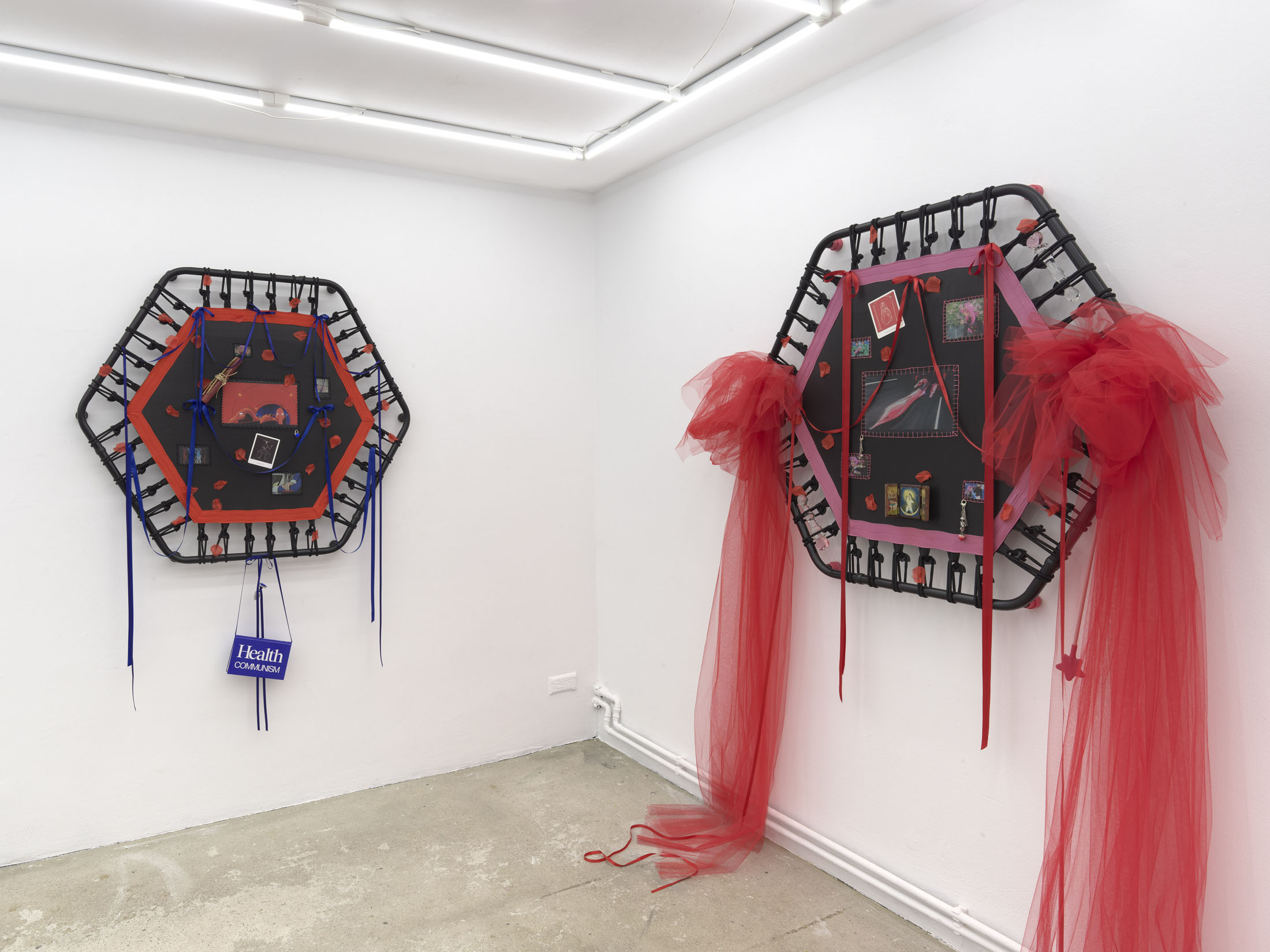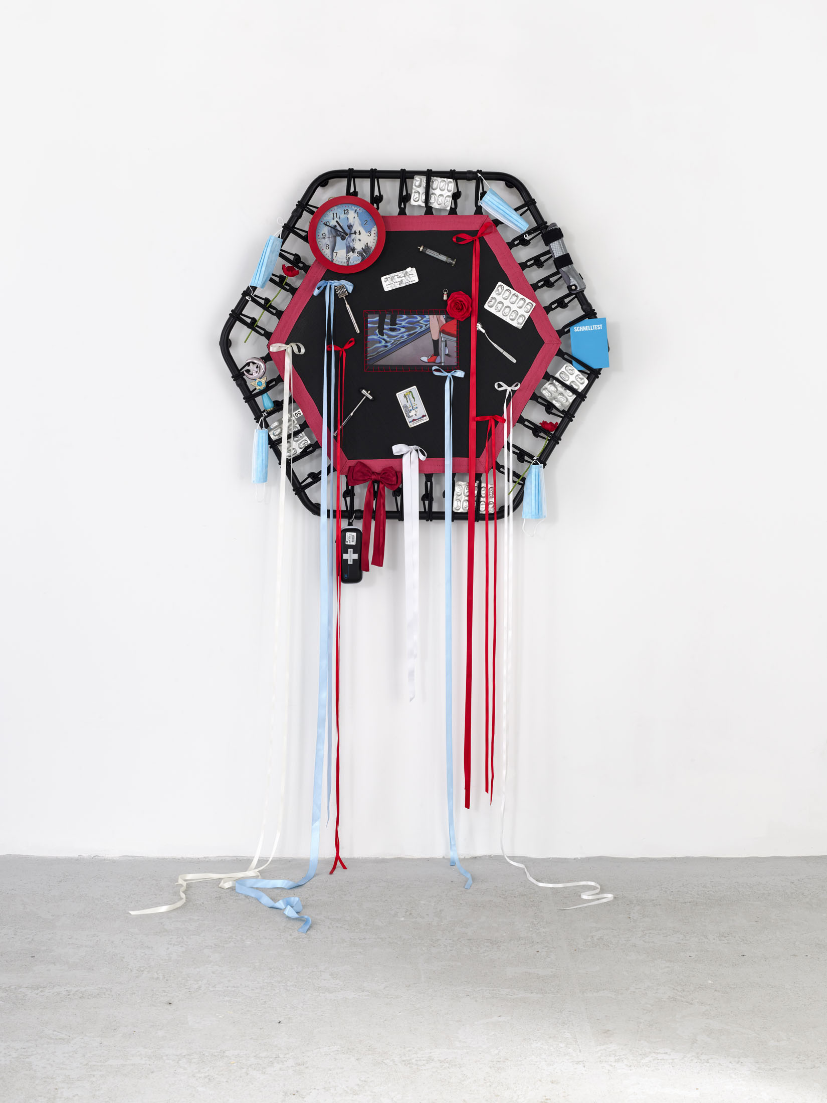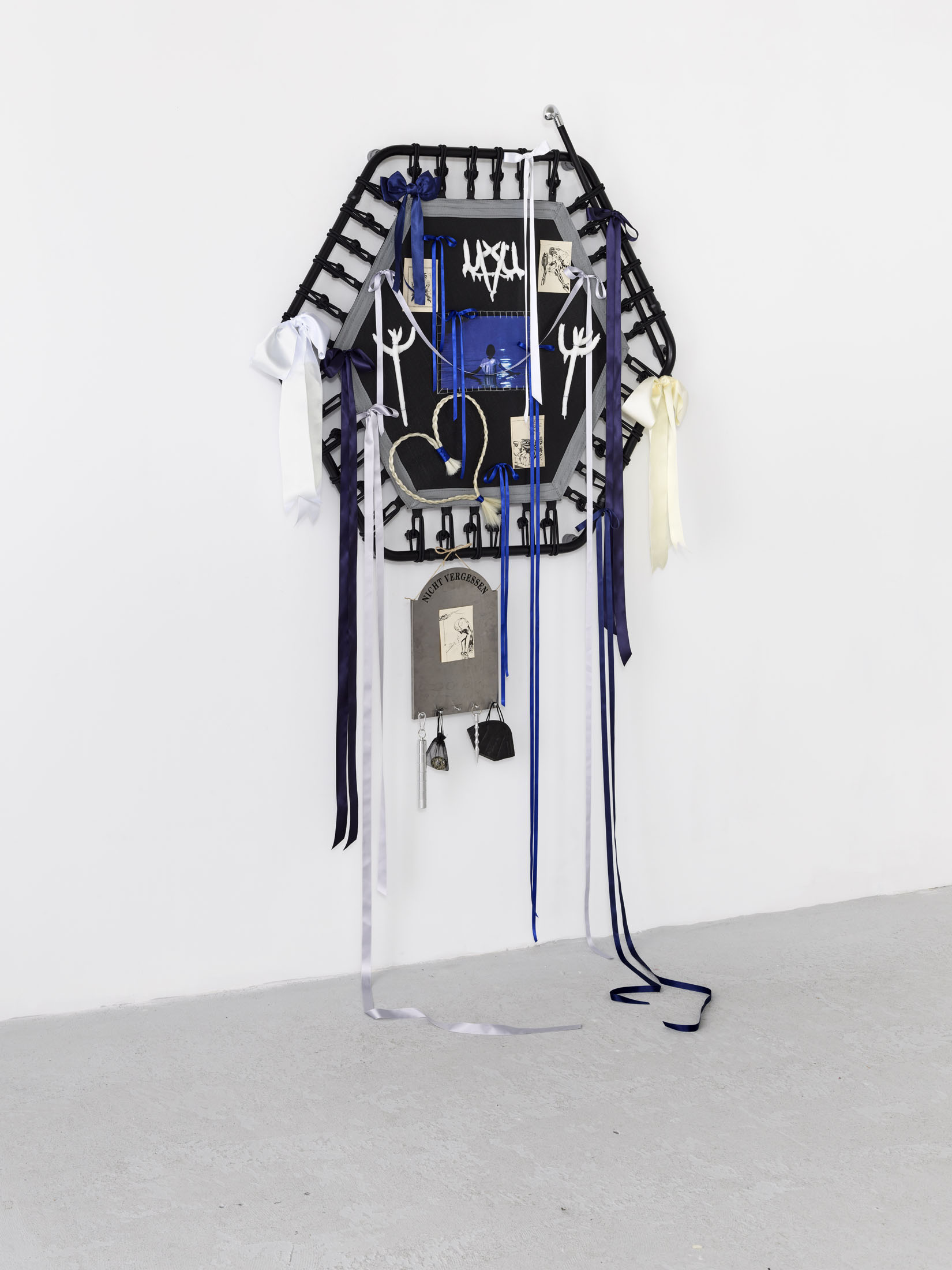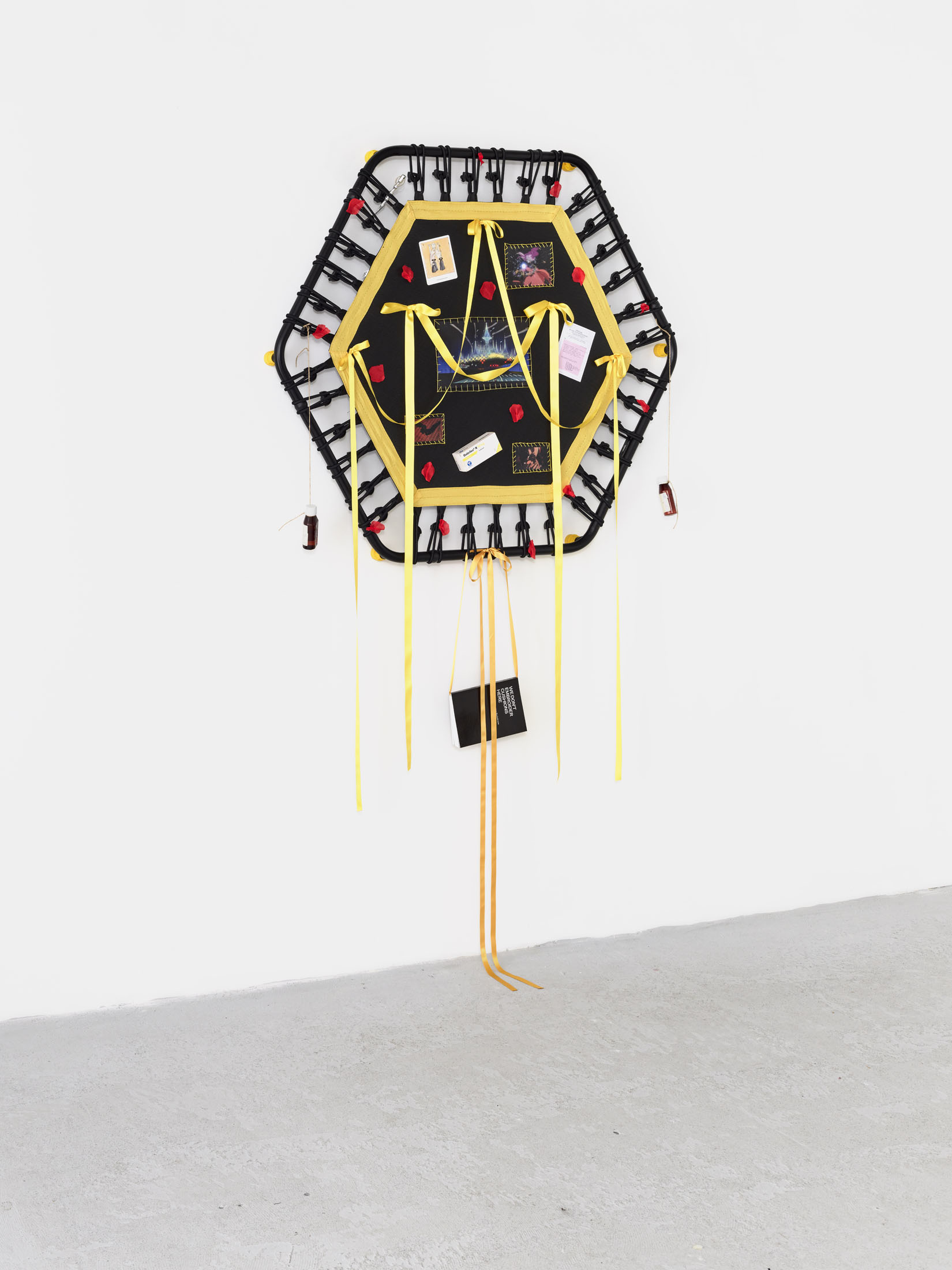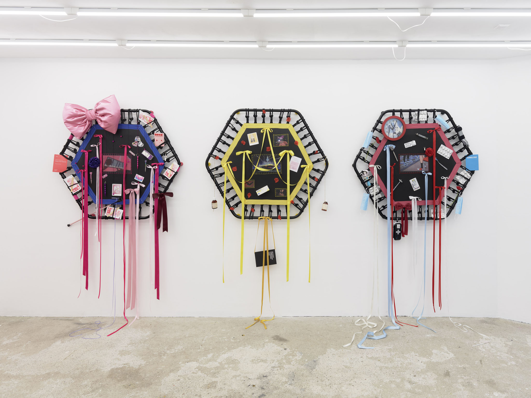 Even A Worm Will Turn, Lauryn Youden’s solo exhibition at Number 1 Main Road, Berlin navigates the sterile surfaces of the medical-industrial complex and modernist architecture, exposing the latent violence they inflict on chronically ill and disabled lives. The show centers around a series of ornate wall sculptures reminiscent of oversized prize ribbons, made from trampolines—the same kind once prescribed to Youden as a “misguided” cure for chronic pain. Emblematic of bodily capitalist regimes, these trampolines inherit Le Corbusier’s vision of the home as a machine for living: a paradigm that reduces domestic space to a site of regulation and exclusion, where sick and disabled bodies are unwelcome. Even the mundane is complicit; its supposed neutrality conceals architectures of control and erasure. Youden renders the trampolines inoperable: their legs truncated, stripped of function, with surfaces adorned by bows, fabric patches, and intimate detritus. They become portals into queer Crip time, shaped by the irregular rhythms of disability and chronic illness, rejecting linear progress for something softer, stranger, and more alive (undead).