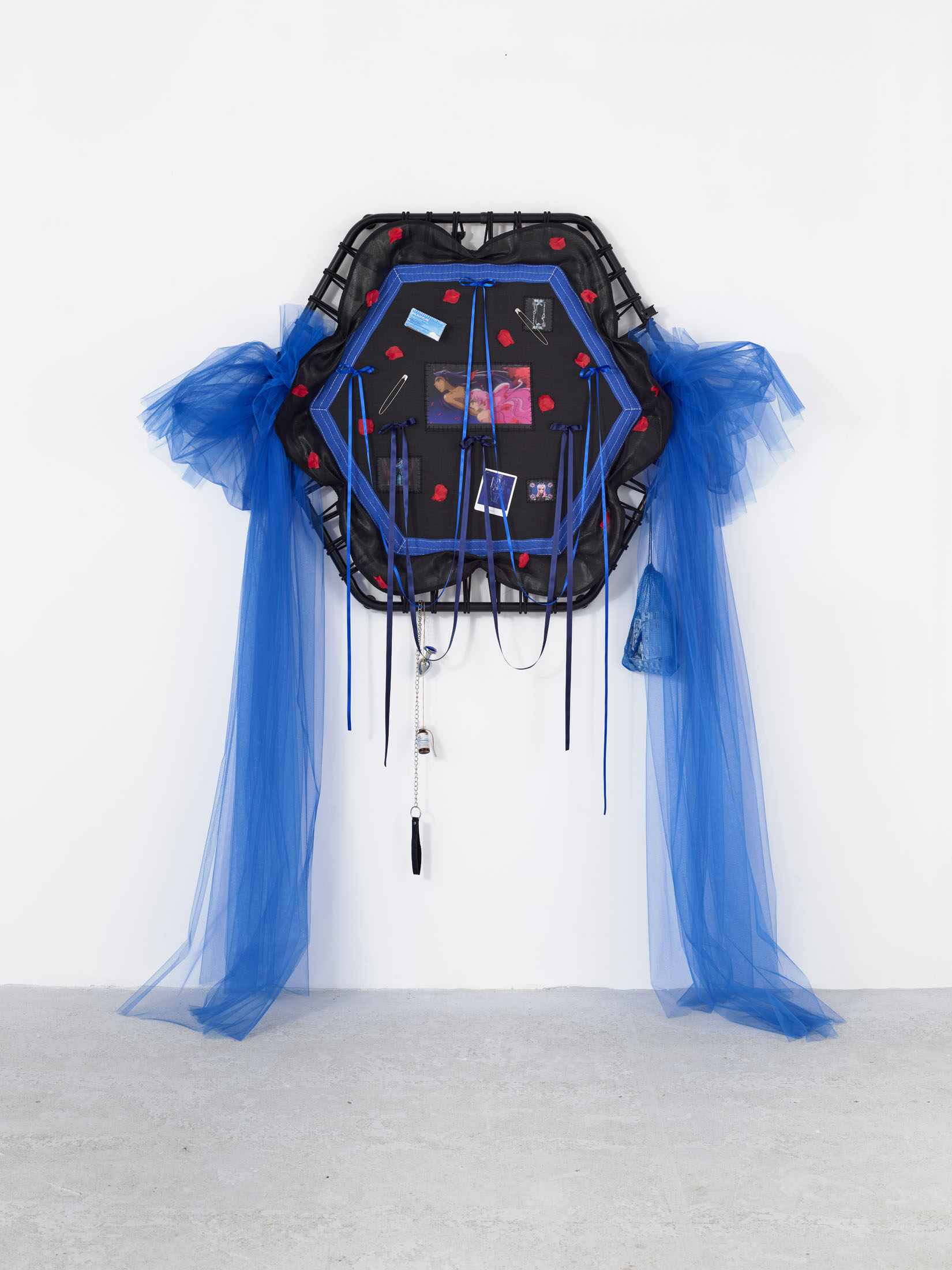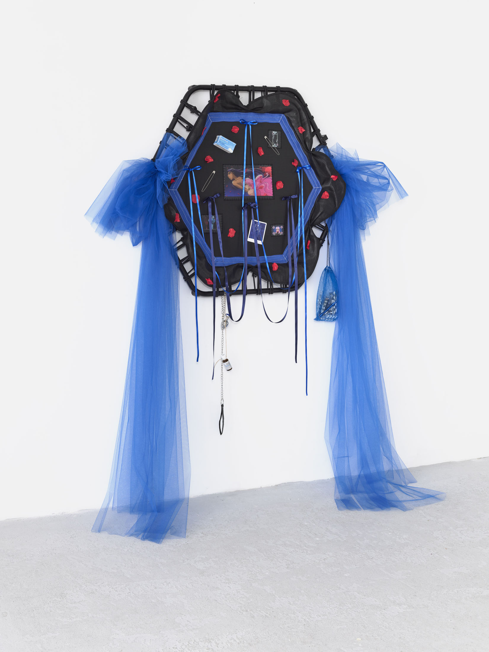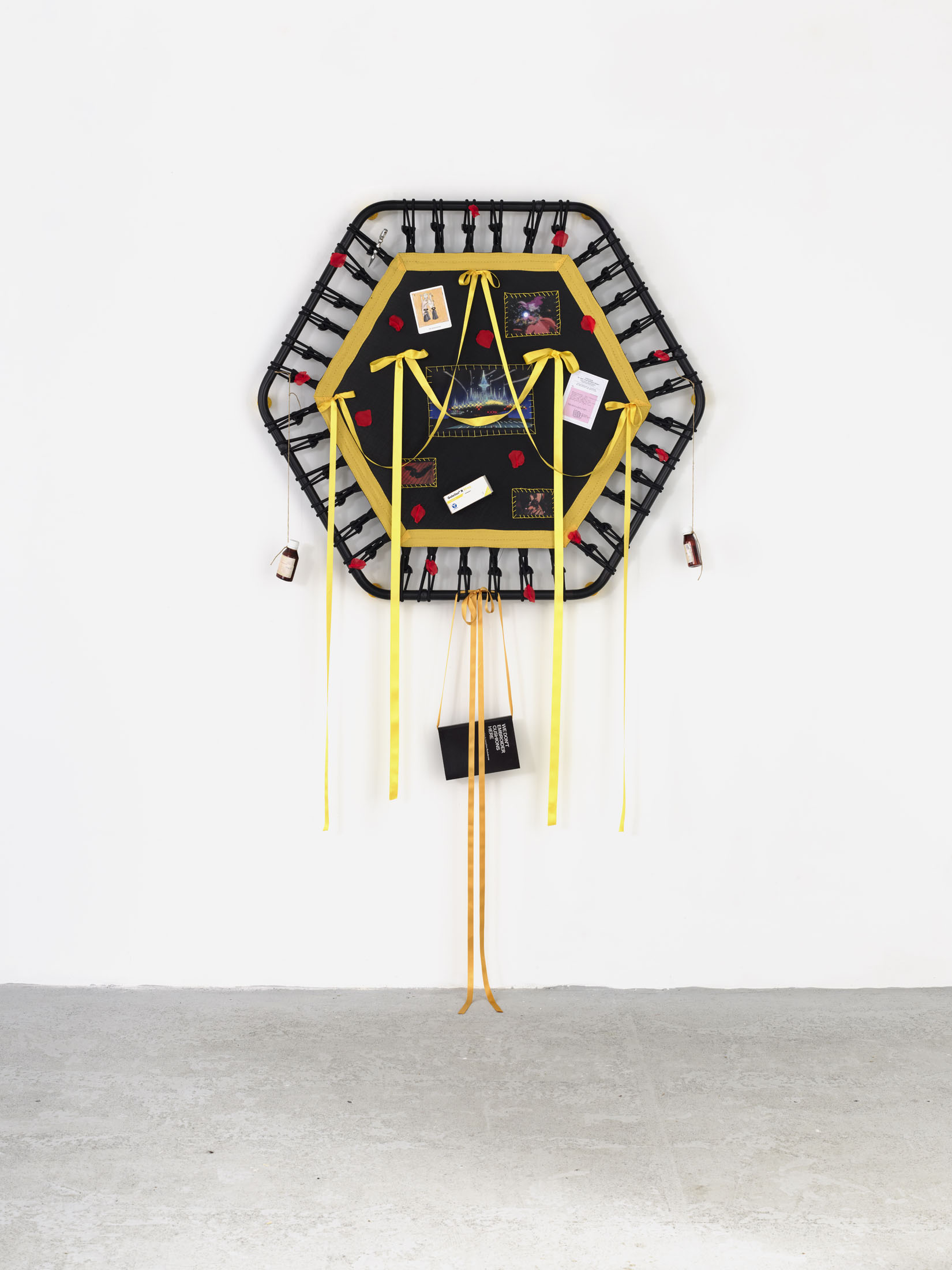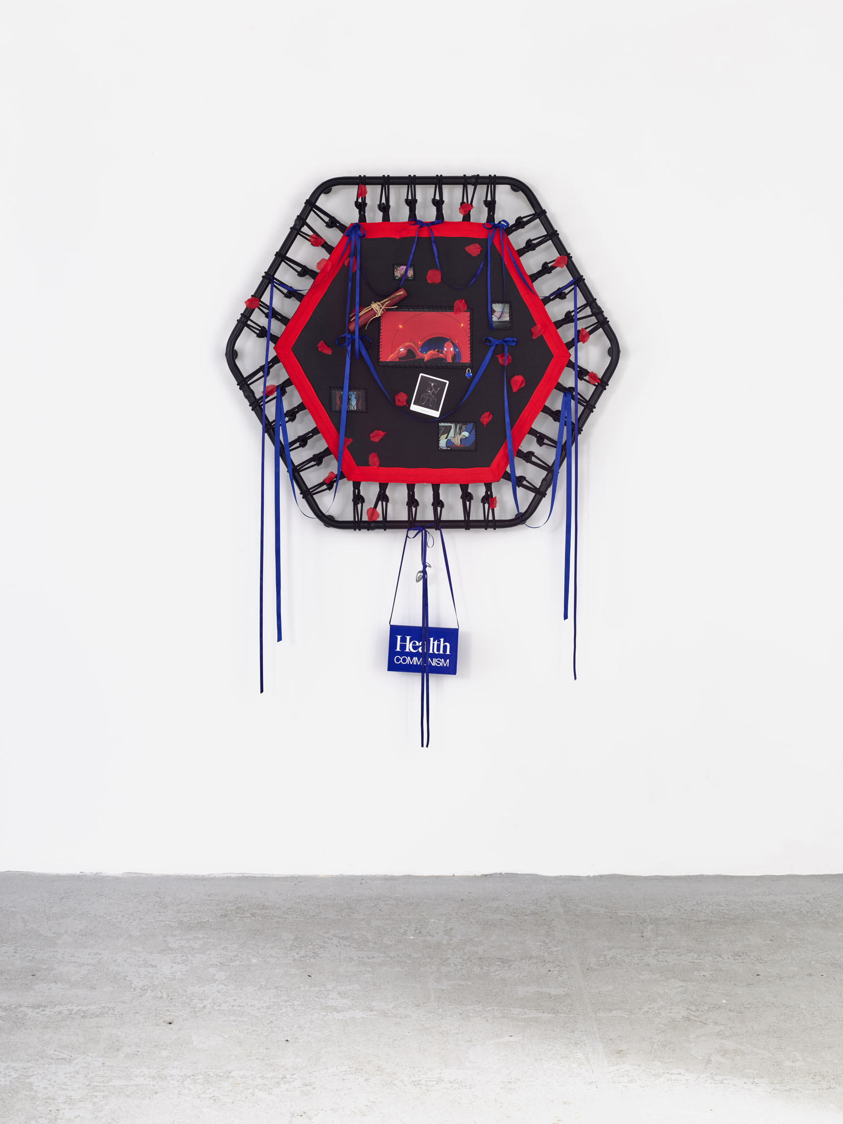 Even A Worm Will Turn, Lauryn Youden’s solo exhibition at Number 1 Main Road, Berlin navigates the sterile surfaces of the medical-industrial complex and modernist architecture, exposing the latent violence they inflict on chronically ill and disabled lives. The show centers around a series of ornate wall sculptures reminiscent of oversized prize ribbons, made from trampolines—the same kind once prescribed to Youden as a “misguided” cure for chronic pain. Emblematic of bodily capitalist regimes, these trampolines inherit Le Corbusier’s vision of the home as a machine for living: a paradigm that reduces domestic space to a site of regulation and exclusion, where sick and disabled bodies are unwelcome. Even the mundane is complicit; its supposed neutrality conceals architectures of control and erasure. Youden renders the trampolines inoperable: their legs truncated, stripped of function, with surfaces adorned by bows, fabric patches, and intimate detritus. They become portals into queer Crip time, shaped by the irregular rhythms of disability and chronic illness, rejecting linear progress for something softer, stranger, and more alive (undead).