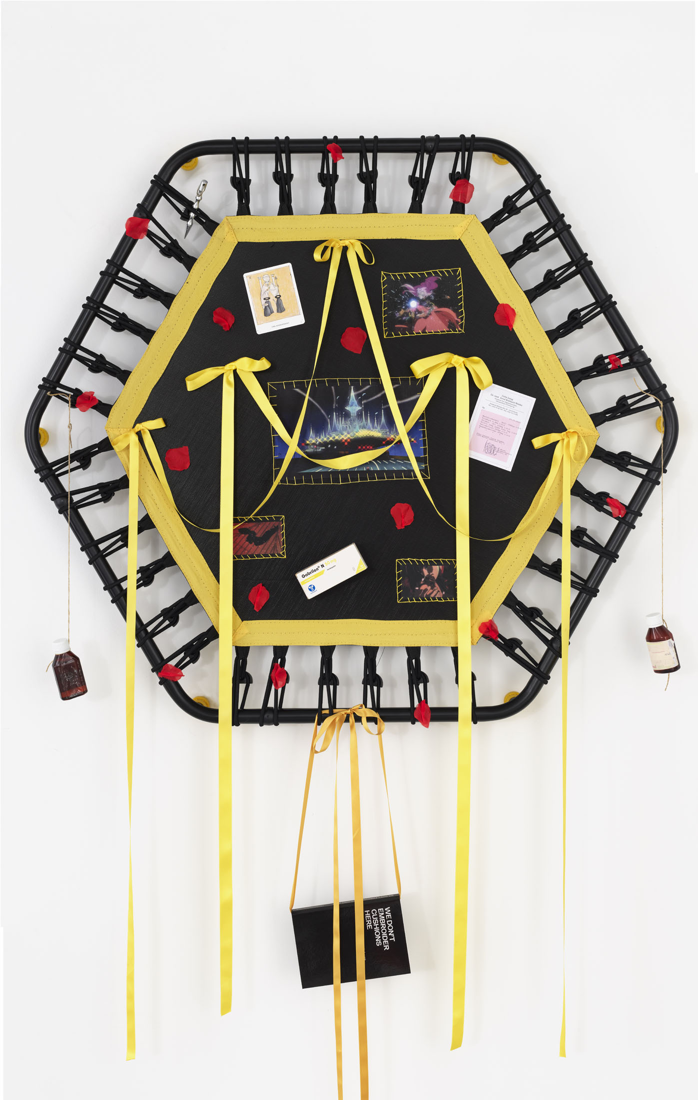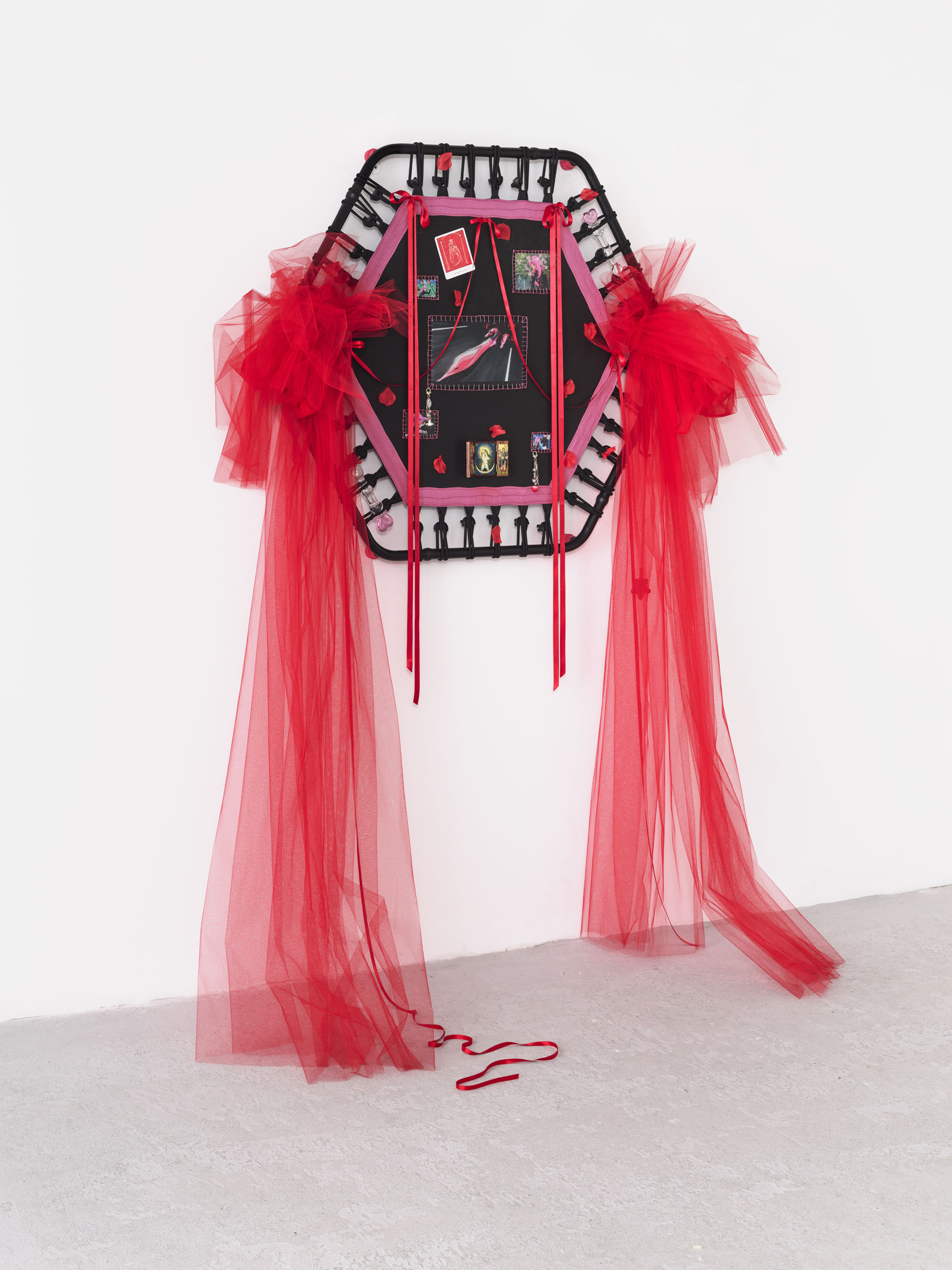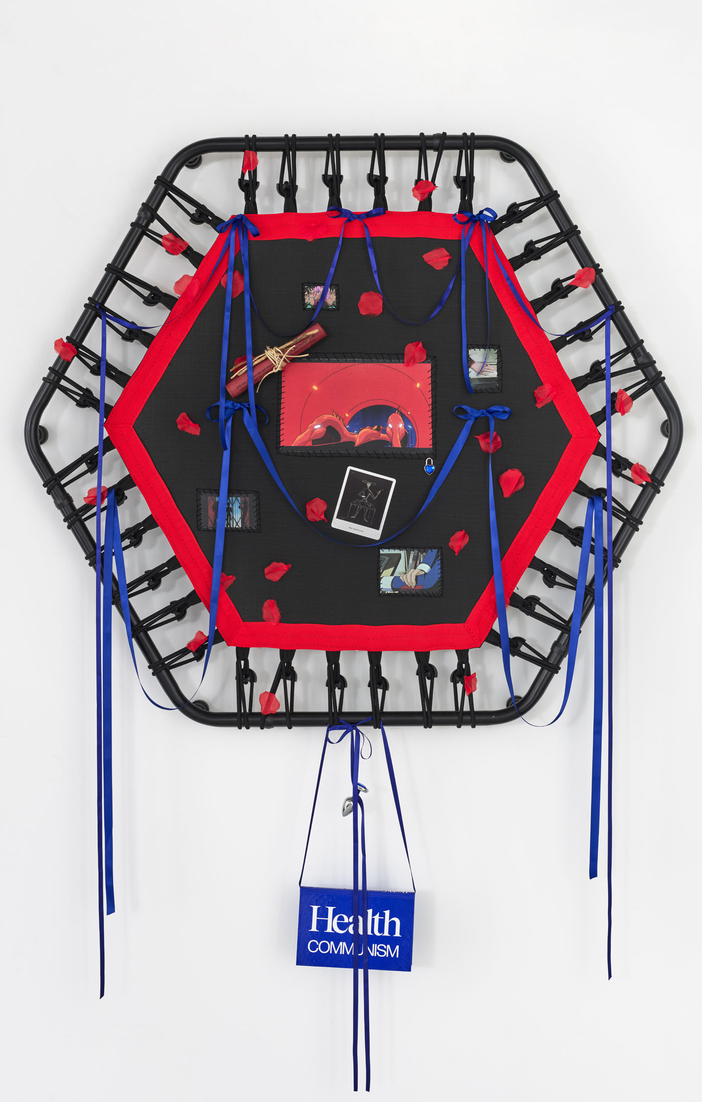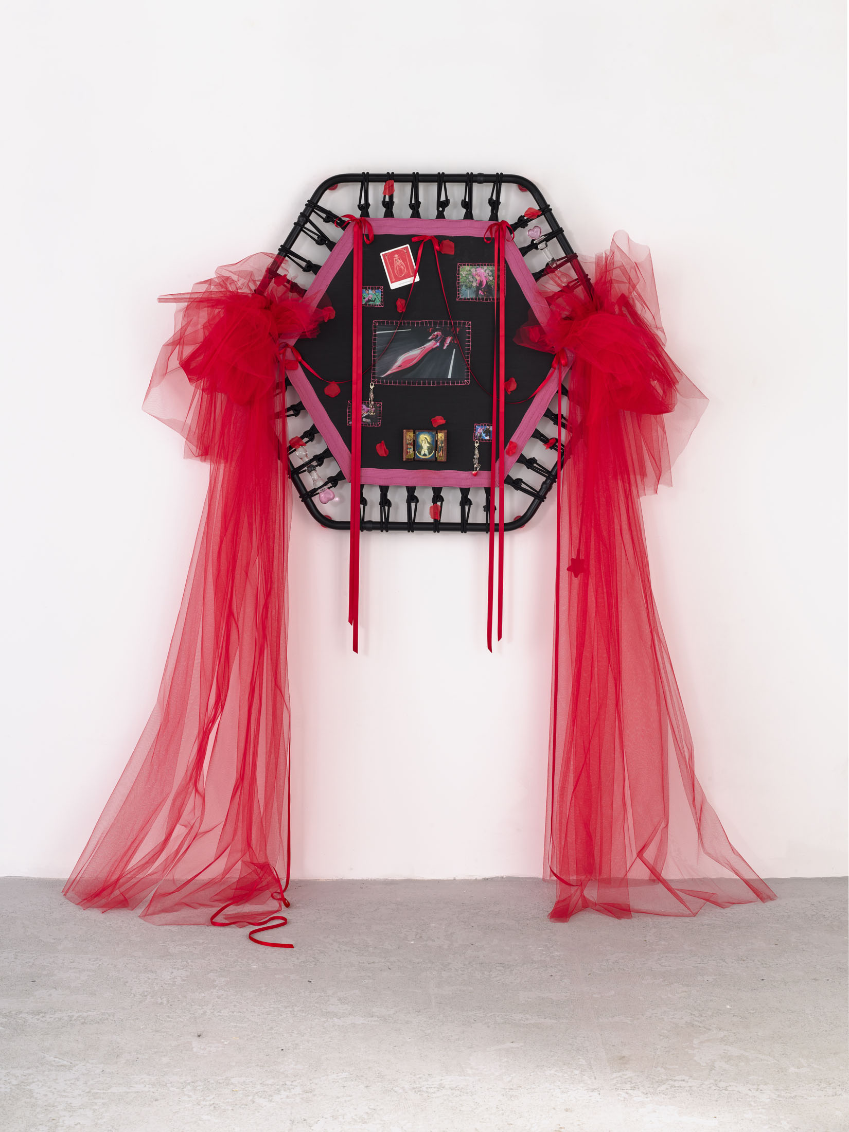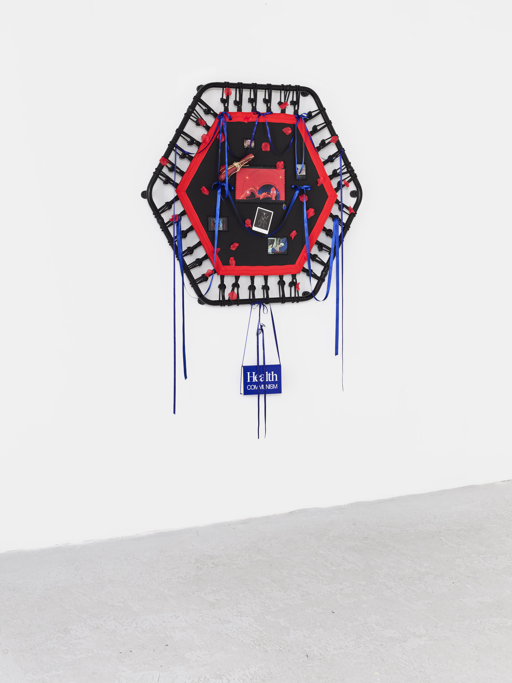 Even A Worm Will Turn, Lauryn Youden’s solo exhibition at Number 1 Main Road, Berlin navigates the sterile surfaces of the medical-industrial complex and modernist architecture, exposing the latent violence they inflict on chronically ill and disabled lives. The show centers around a series of ornate wall sculptures reminiscent of oversized prize ribbons, made from trampolines—the same kind once prescribed to Youden as a “misguided” cure for chronic pain. Emblematic of bodily capitalist regimes, these trampolines inherit Le Corbusier’s vision of the home as a machine for living: a paradigm that reduces domestic space to a site of regulation and exclusion, where sick and disabled bodies are unwelcome. Even the mundane is complicit; its supposed neutrality conceals architectures of control and erasure. Youden renders the trampolines inoperable: their legs truncated, stripped of function, with surfaces adorned by bows, fabric patches, and intimate detritus. They become portals into queer Crip time, shaped by the irregular rhythms of disability and chronic illness, rejecting linear progress for something softer, stranger, and more alive (undead).
