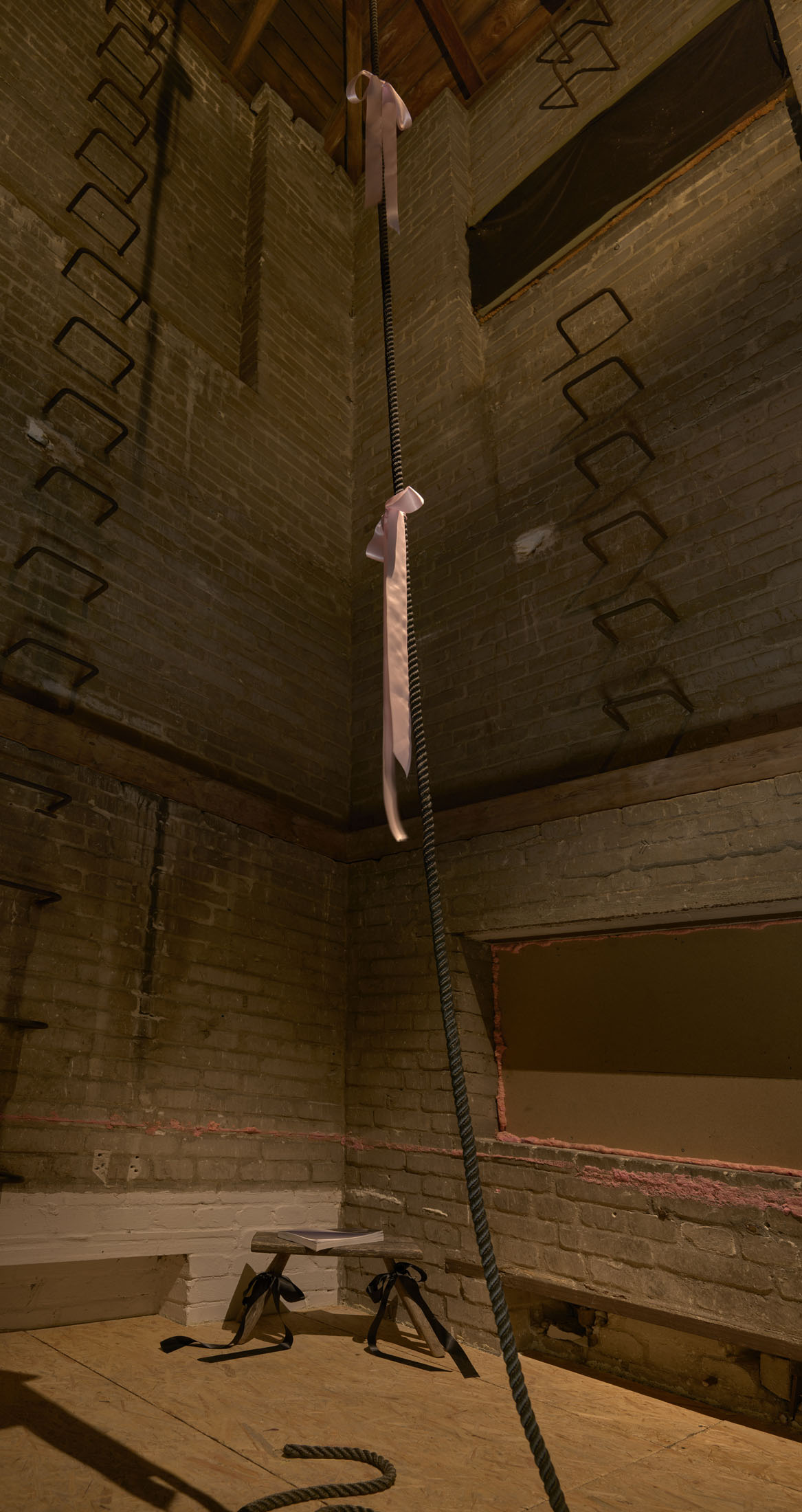 As if to challenge Utena’s suspended magical spacetime, the room is filled with the ticking of a horse girl wall clock. The relentless metronome calls to mind Alison Kafer’s notion of “Crip Time”, an alternate mode of temporality which, “rather than bend disabled bodies and minds to meet the clock, (…) bends the clock to meet disabled bodies and minds.” Adding to the soundscape is a haunting rendition of The End of the Worldemanating faintly from the tower, a part of the exhibition space with limited accessibility. The ballad makes a pivotal appearance in Girl, Interrupted, a 1999 film with a cool girl-studded cast that often finds itself awkwardly stuck between addressing and replicating clichés about female mental illness: Brittany Murphy’s character commits suicide, her lifeless body dangling from the ceiling as her record player loops Skeeter Davis’s lamenting voice over and over again. Up in the tower, the song, reworked for the exhibition by Reece Cox, is accompanied by a site-specificinstallation.